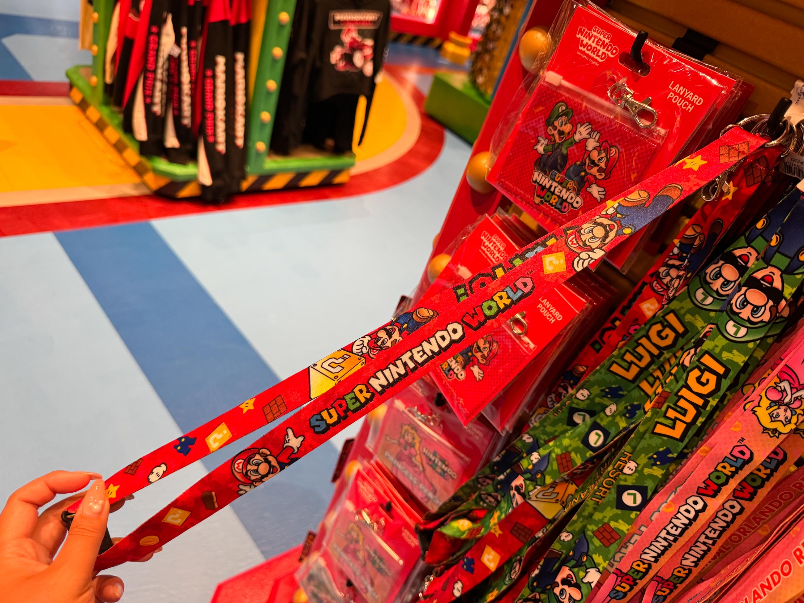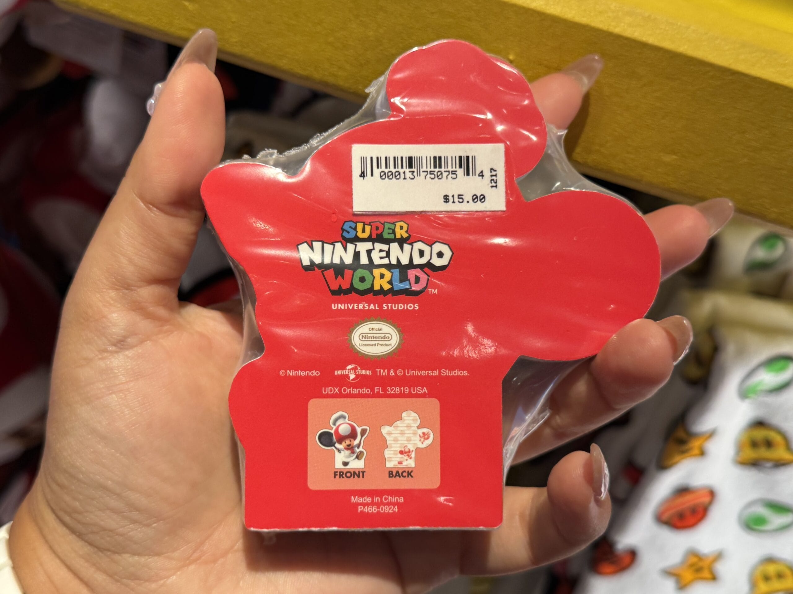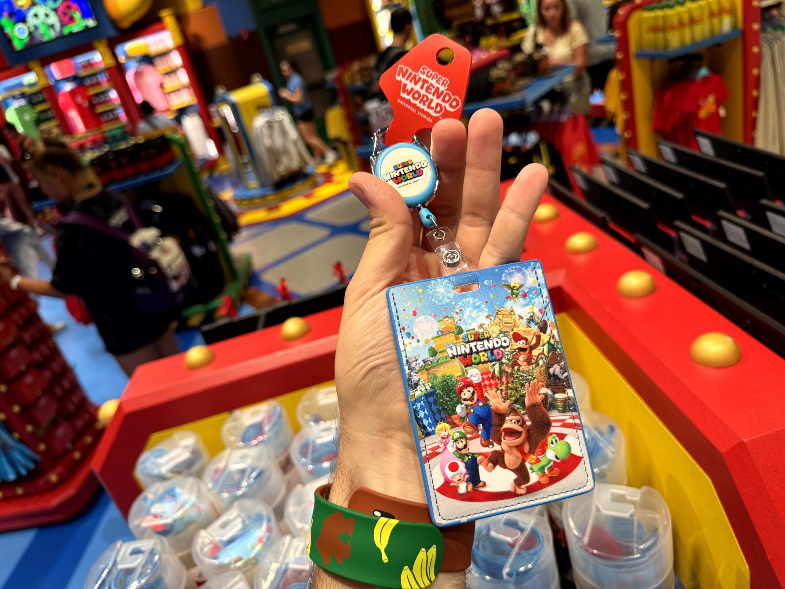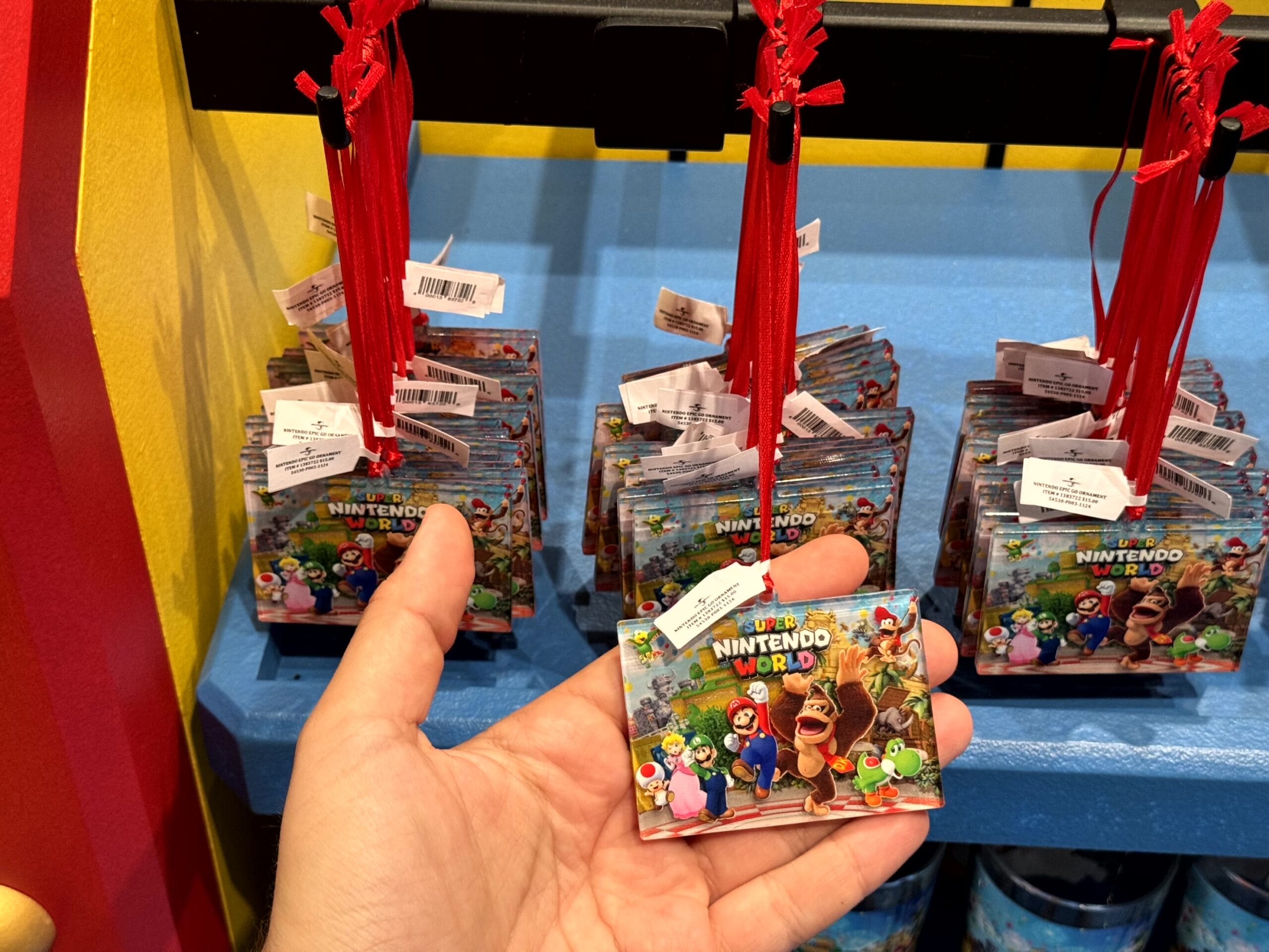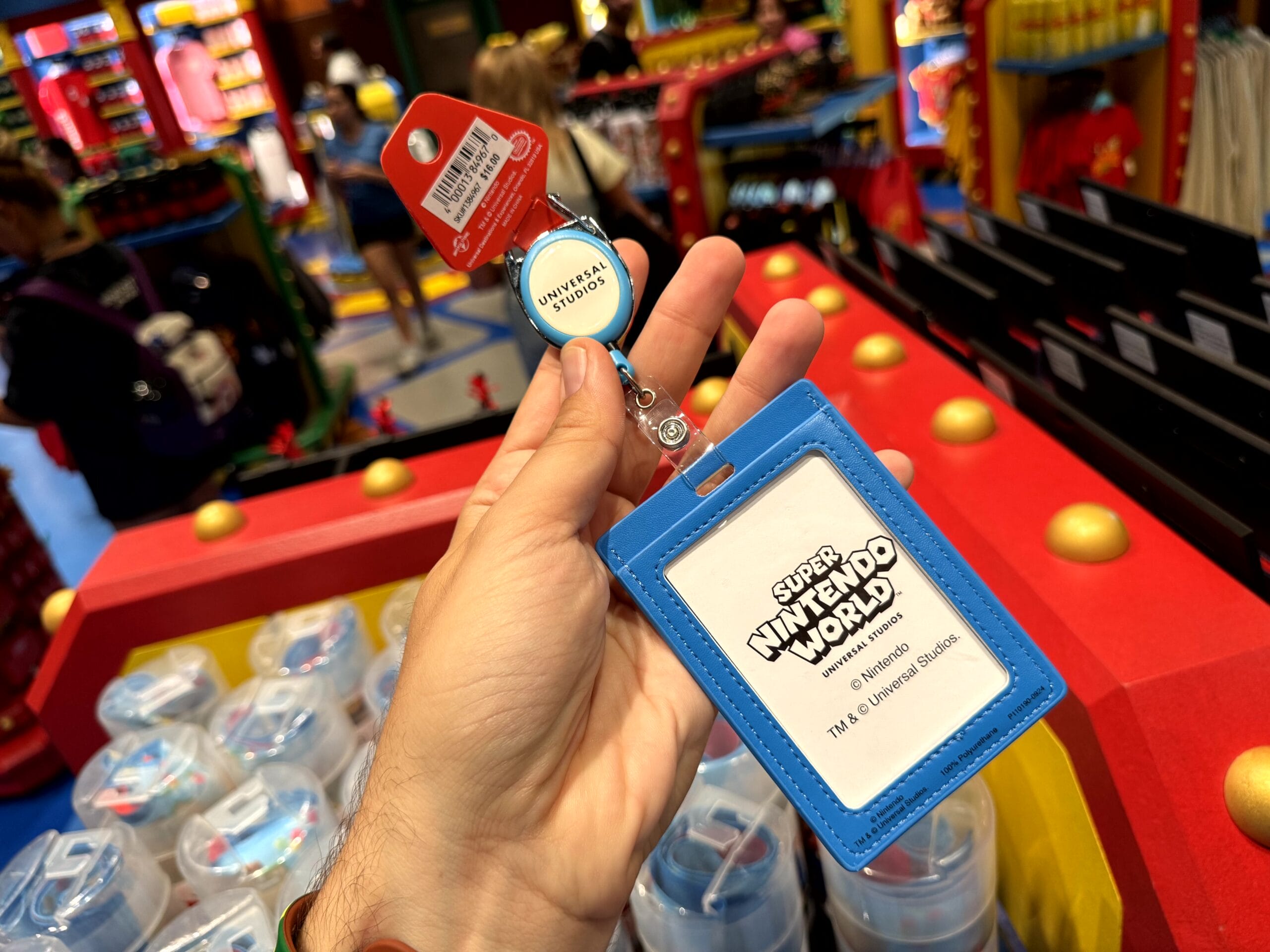 The artwork from the character ensemble t-shirts is on the front of this badge holder. On the back is a clear pocket for an ID or ticket. The Super Nintendo World logo and “Universal Studios” are on the clips, which are retractable.