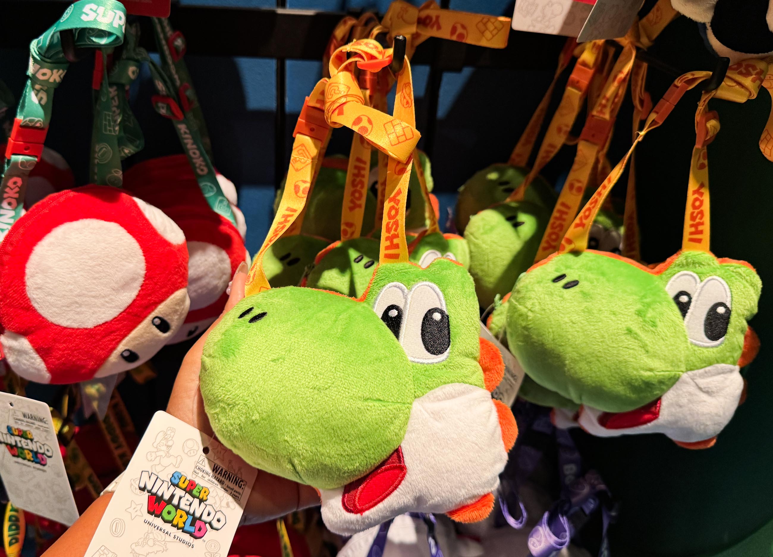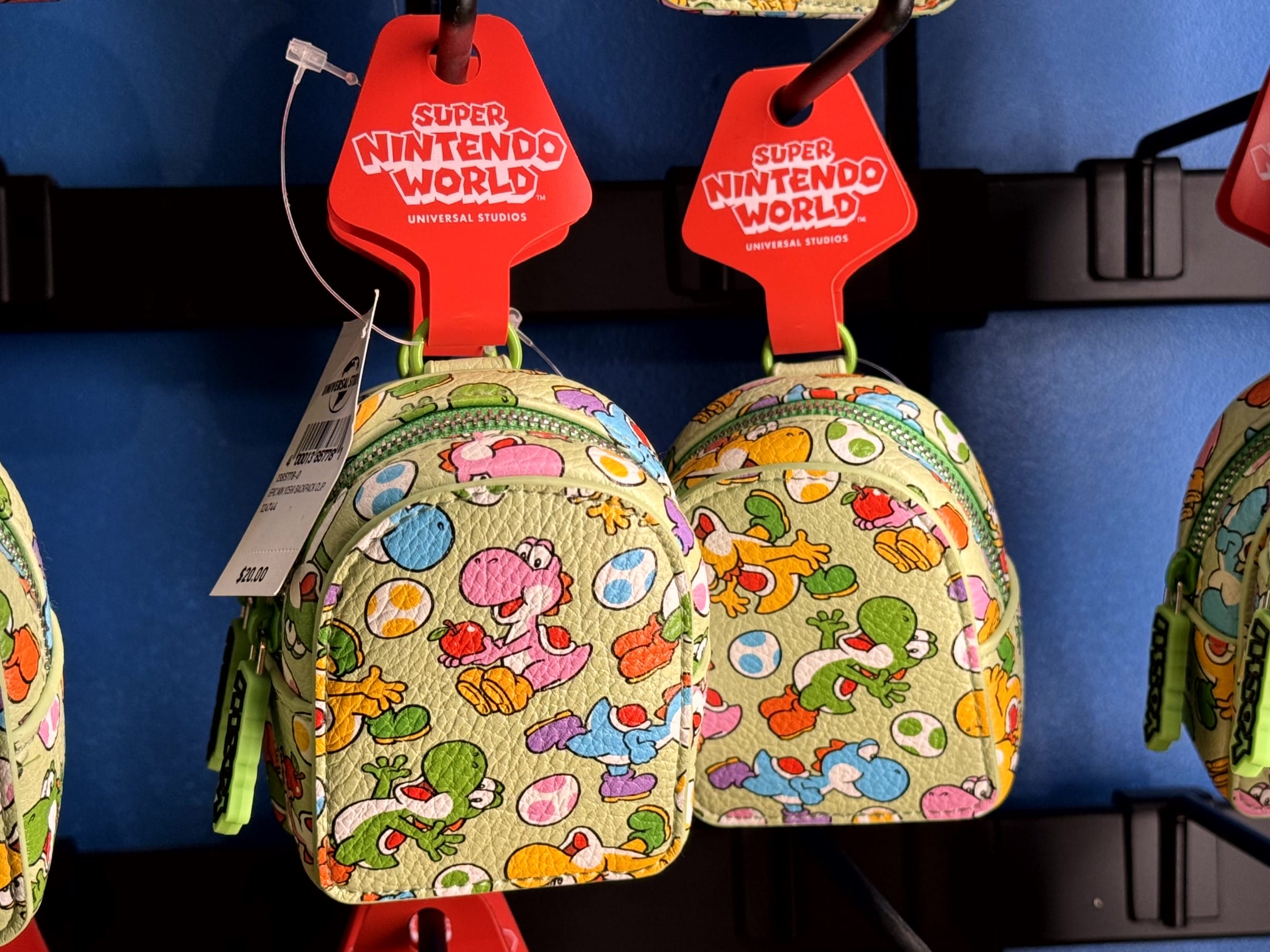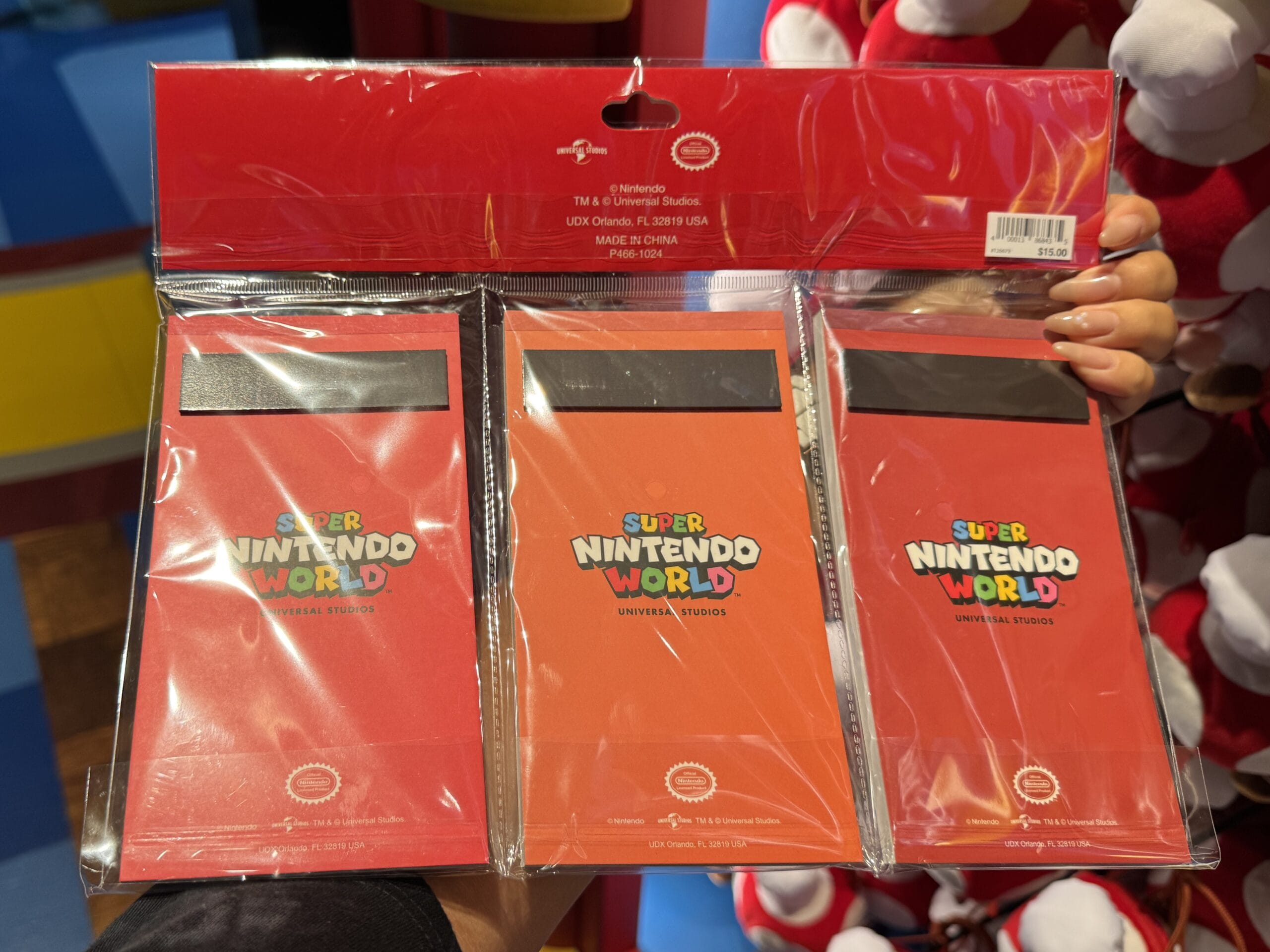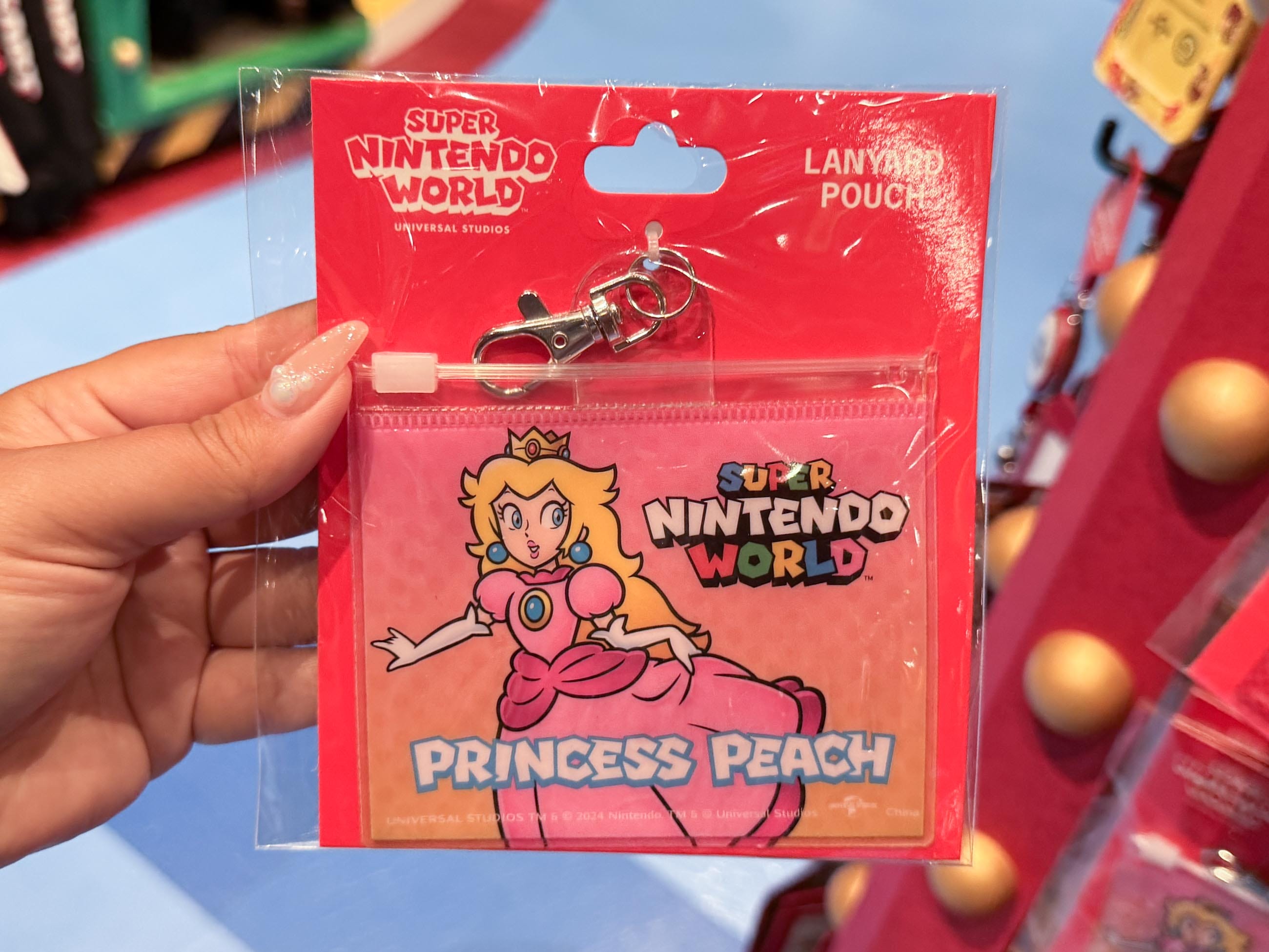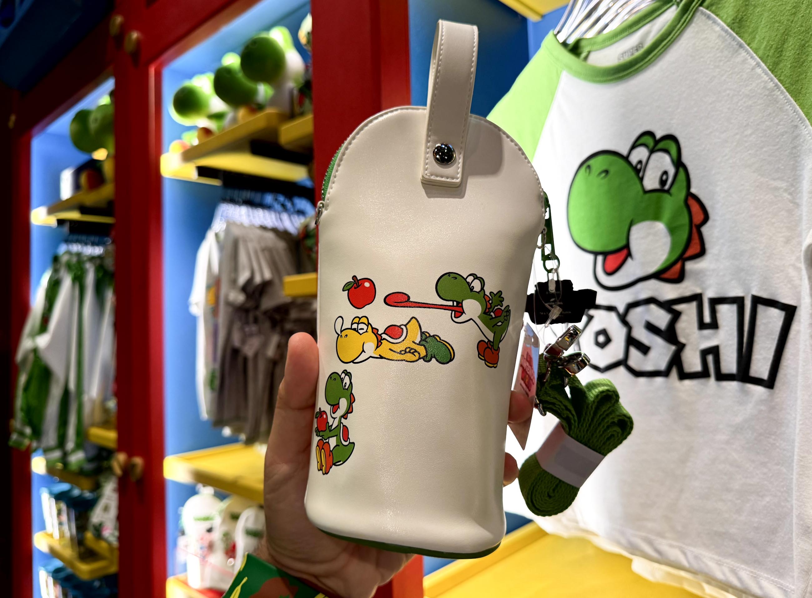 The artwork from the character ensemble t-shirts is on the front of this badge holder. On the back is a clear pocket for an ID or ticket. The Super Nintendo World logo and “Universal Studios” are on the clips, which are retractable.