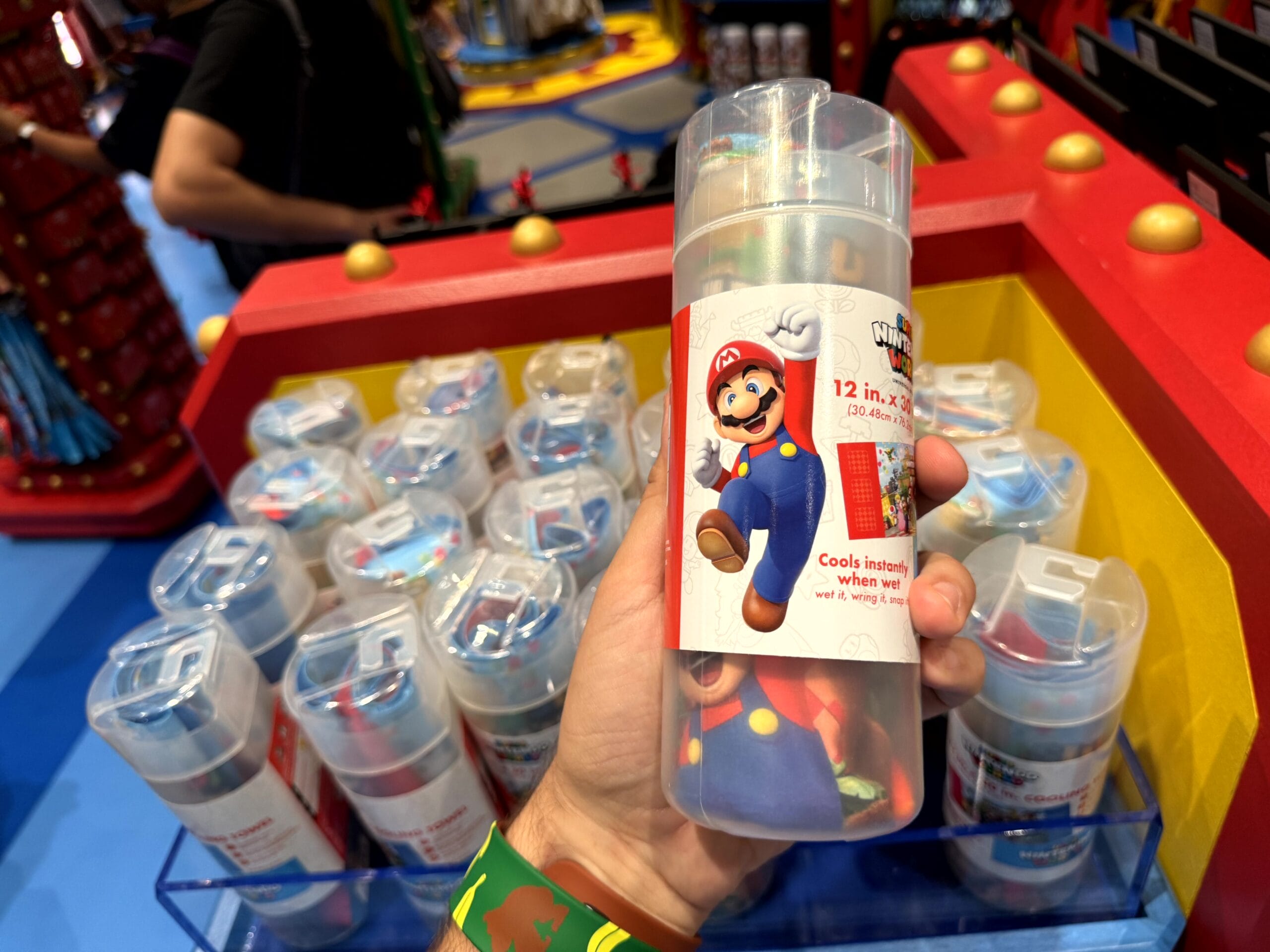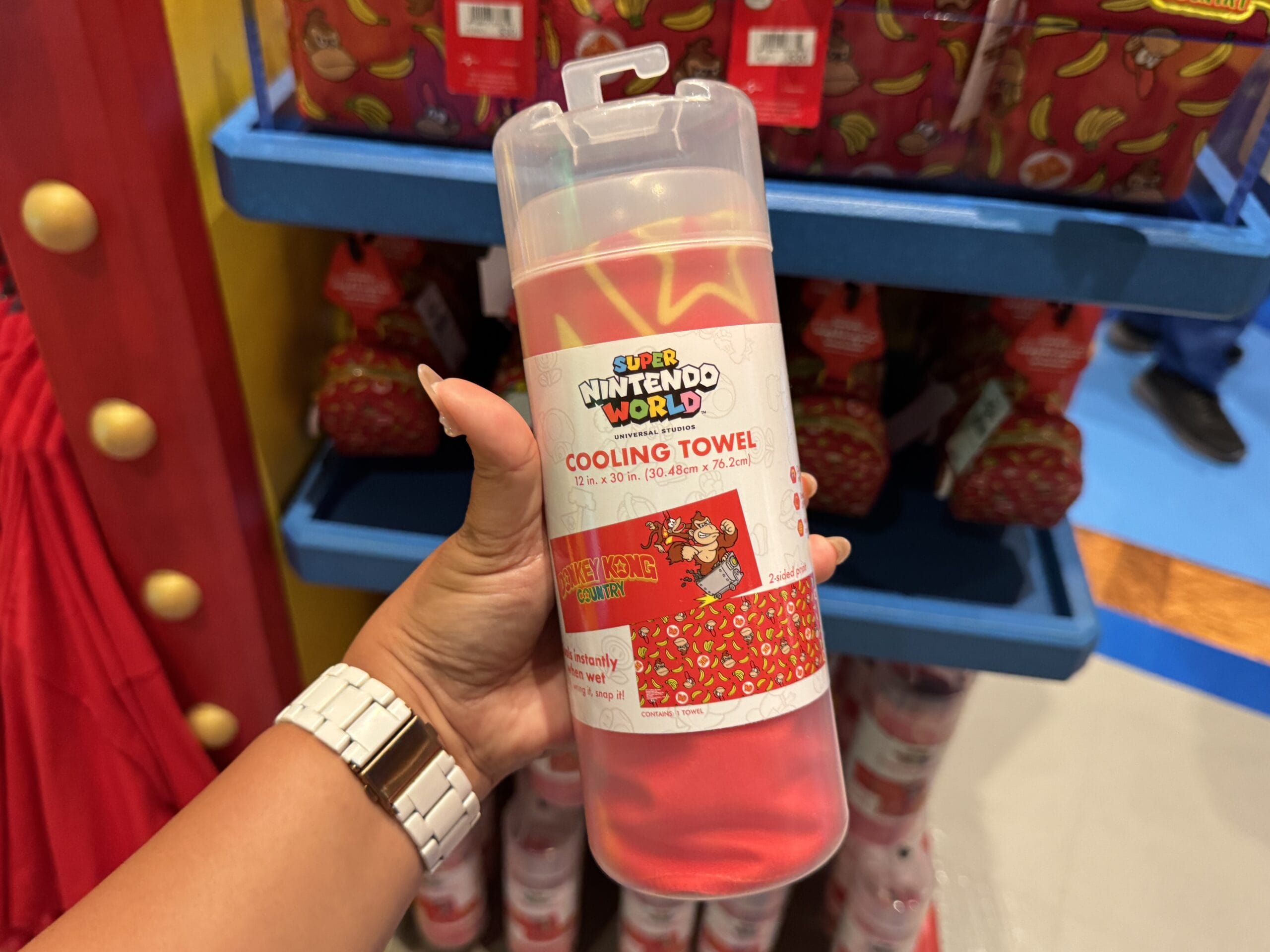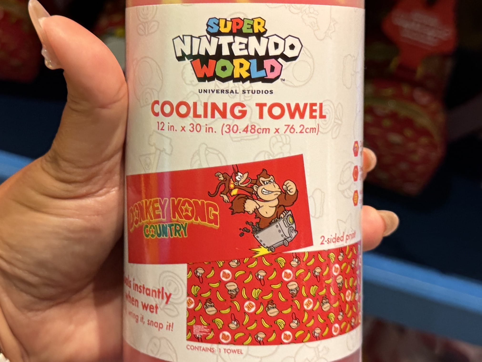 The cooling towel features the character art on one side and the Super Nintendo World logo on the other side. It’s 12 in x 30 in and comes in a plastic tube. The towel cools when wet.