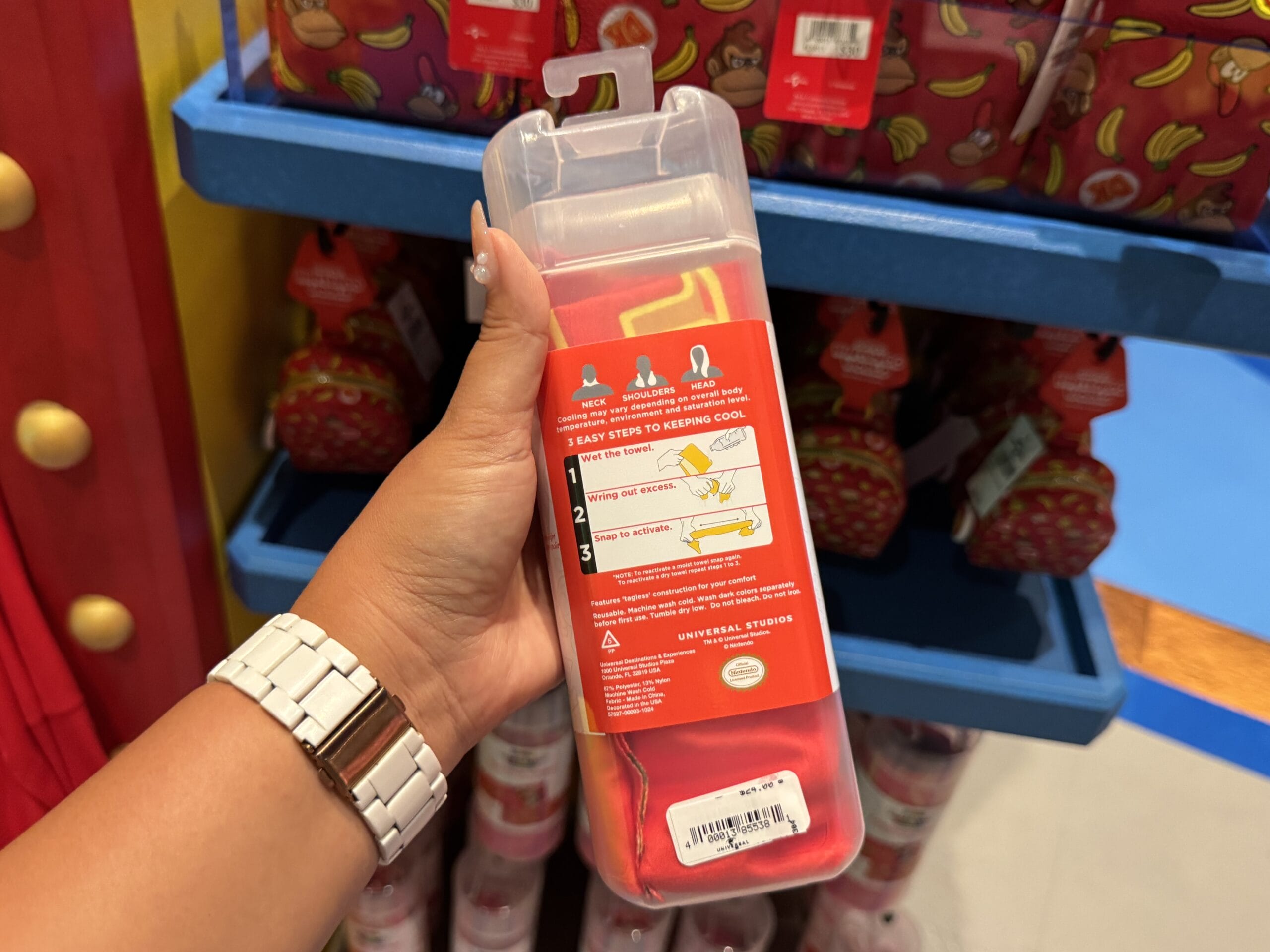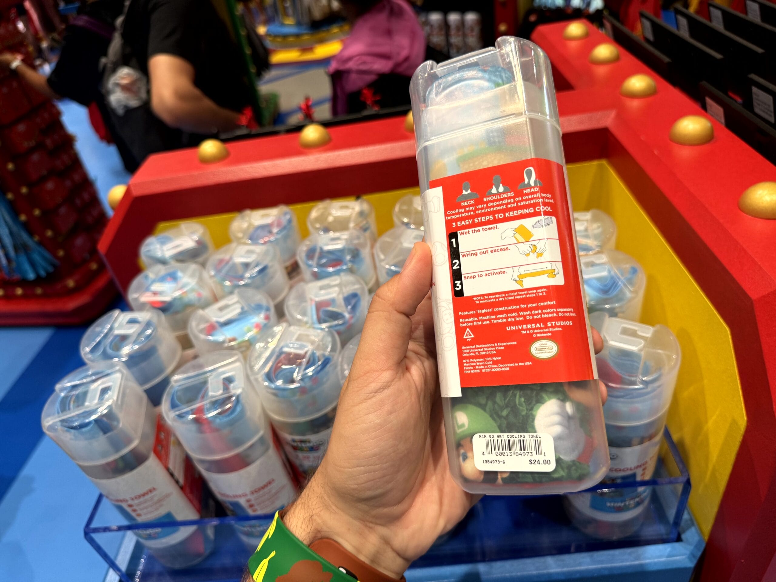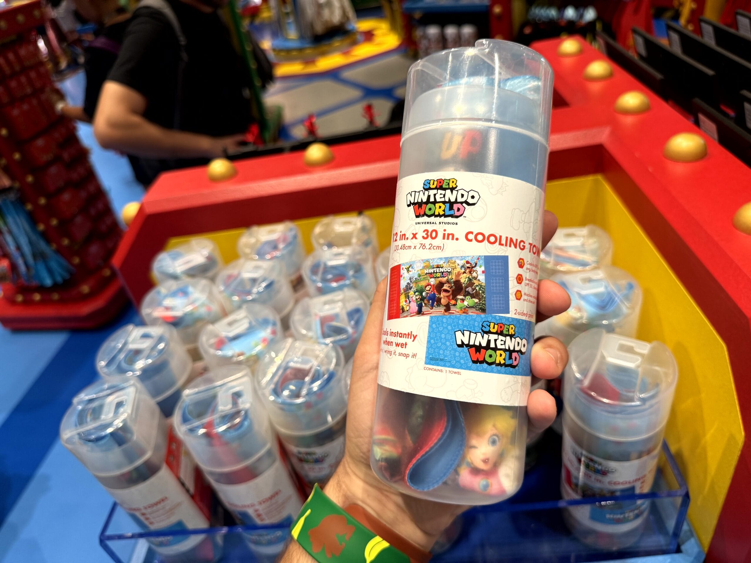 The cooling towel features the character art on one side and the Super Nintendo World logo on the other side. It’s 12 in x 30 in and comes in a plastic tube. The towel cools when wet.