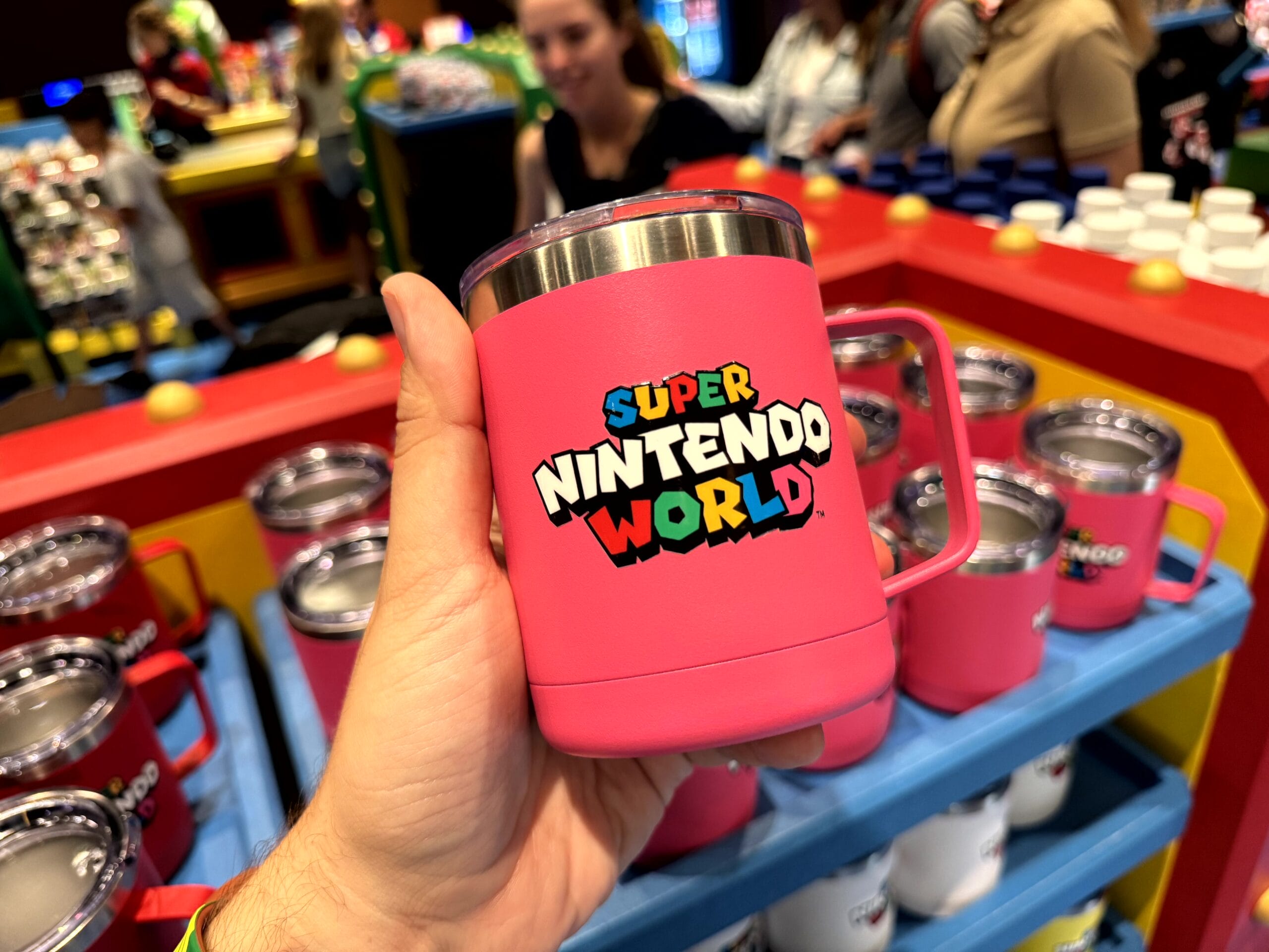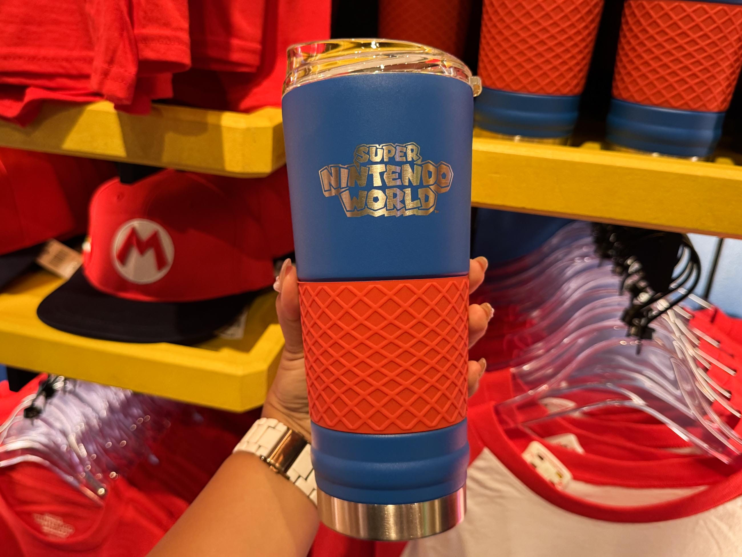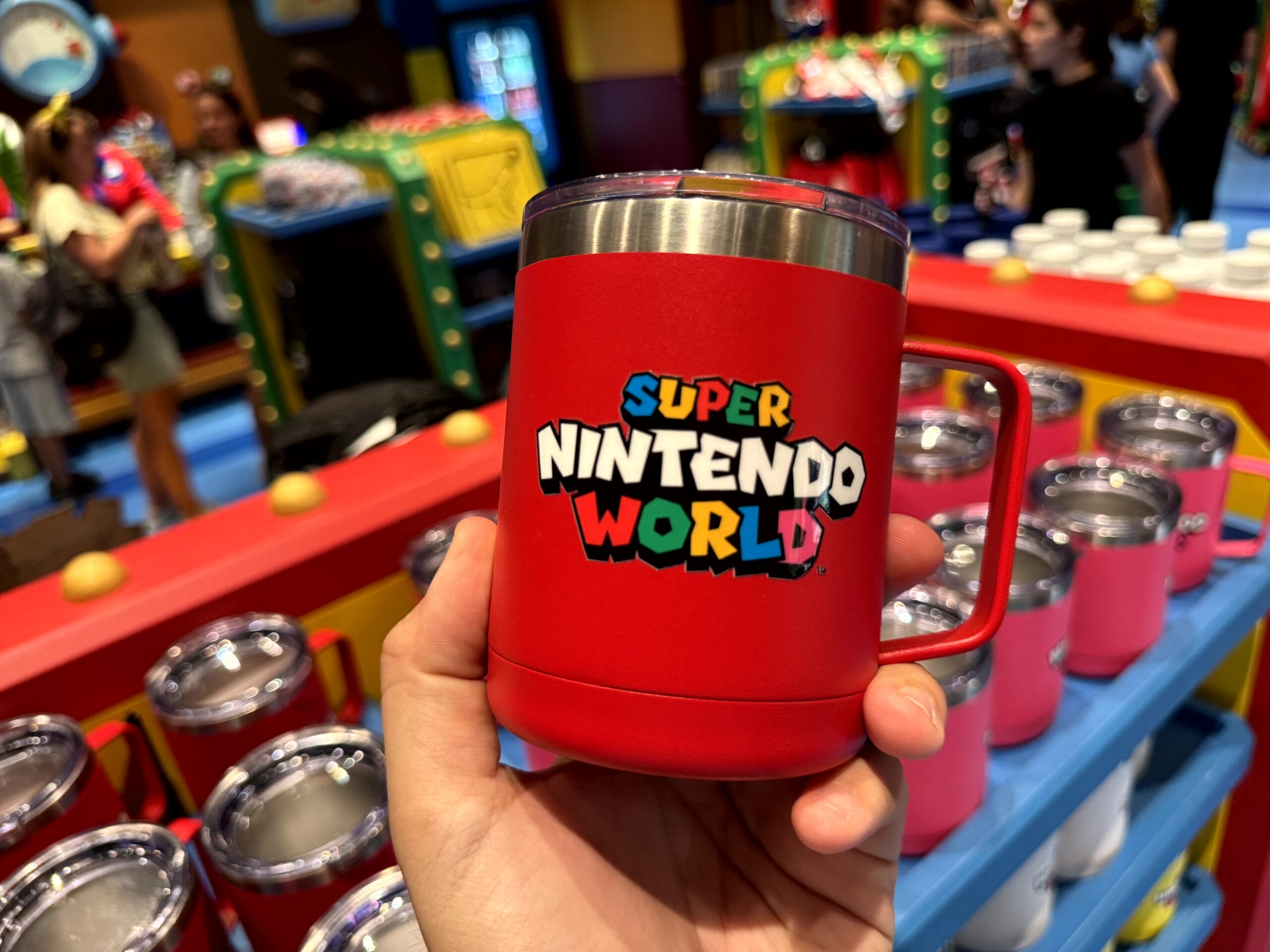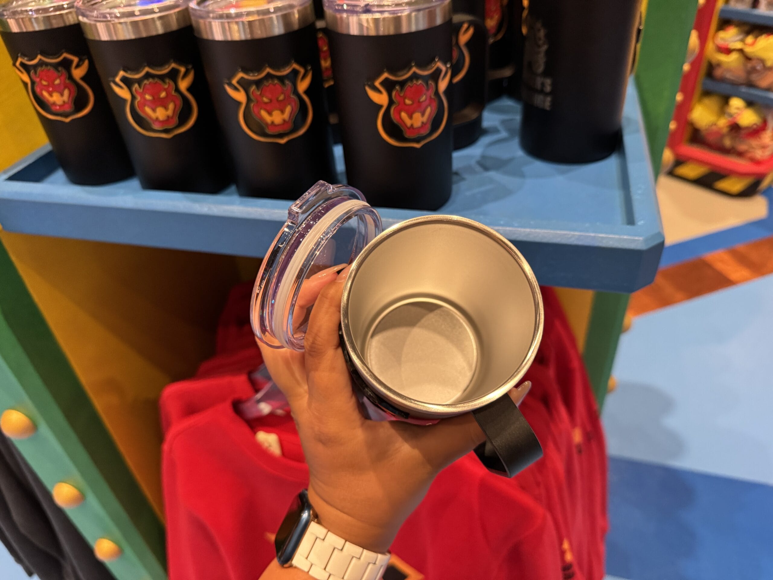 The stainless steel mugs are hand-wash only. This one has a red exterior and handle with the Super Nintendo World logo on both sides. It includes a clear lid.