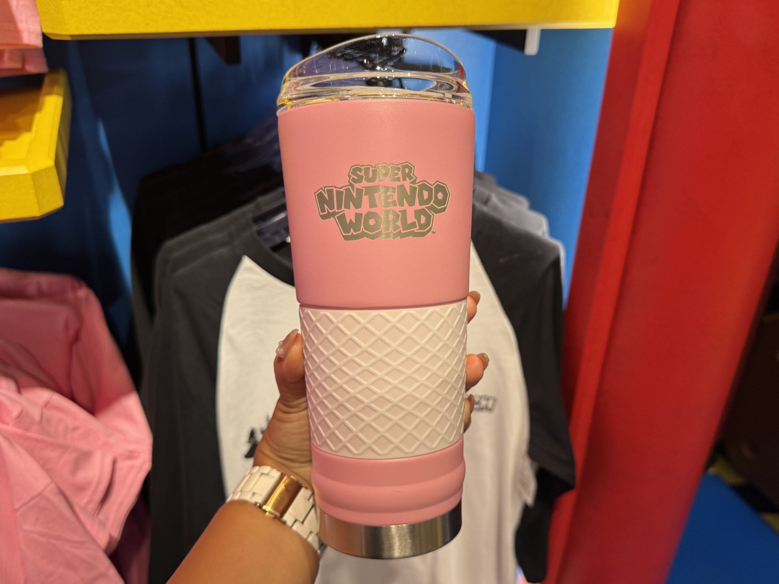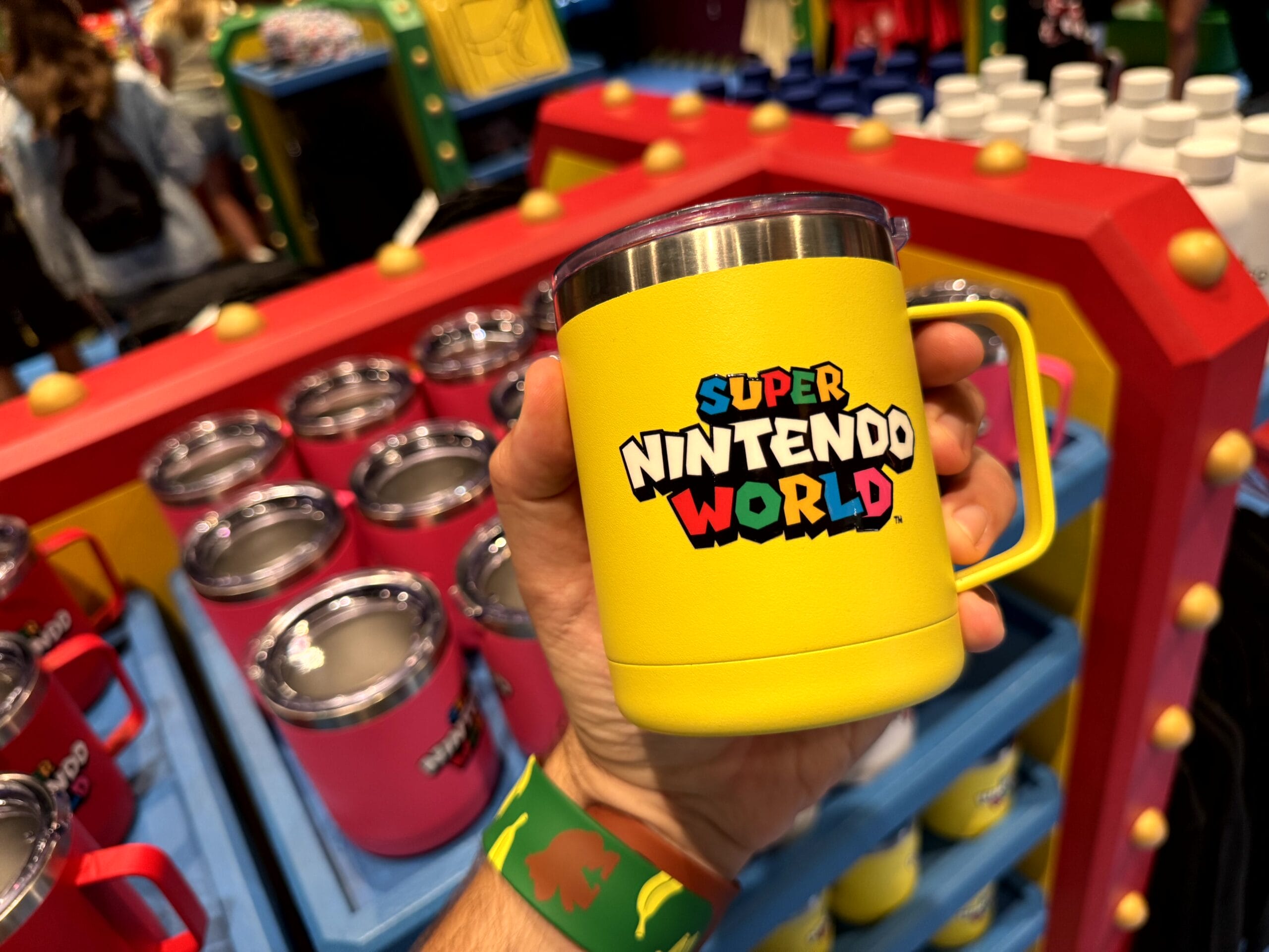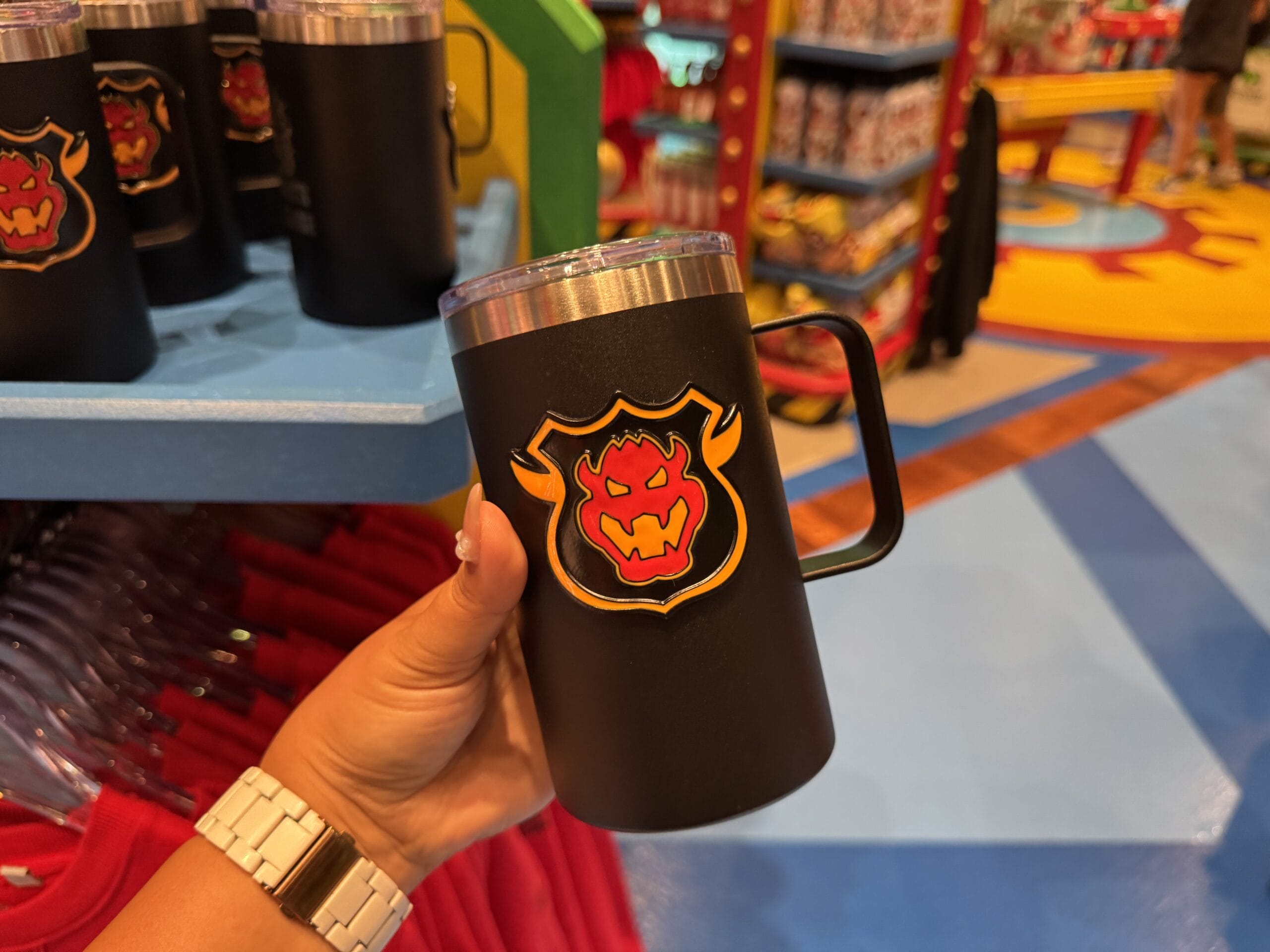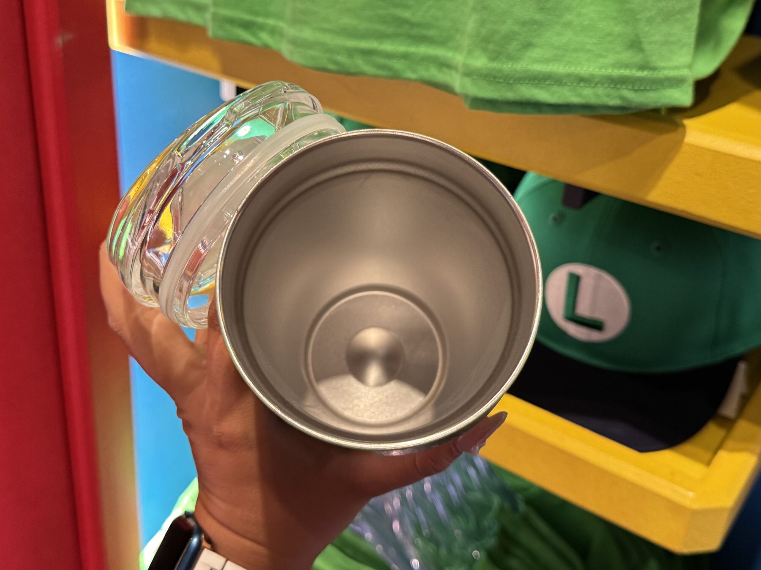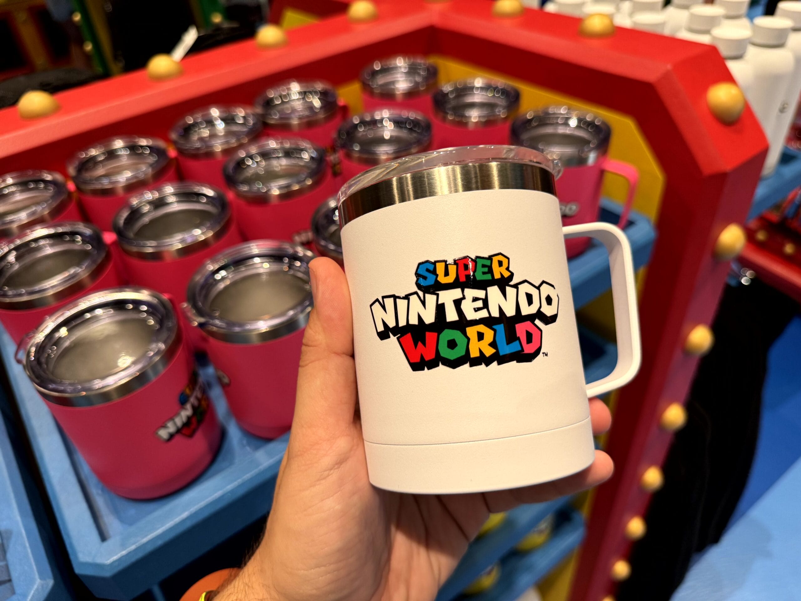 The stainless steel mugs are hand-wash only. This one has a red exterior and handle with the Super Nintendo World logo on both sides. It includes a clear lid.