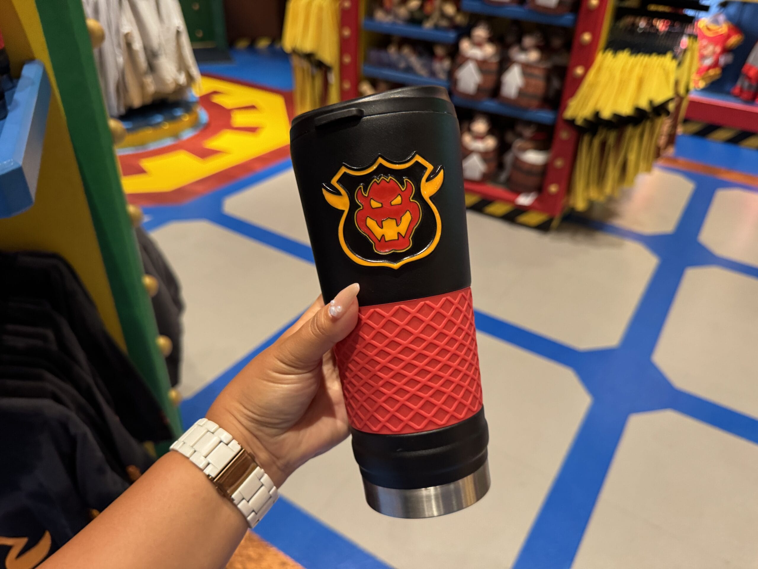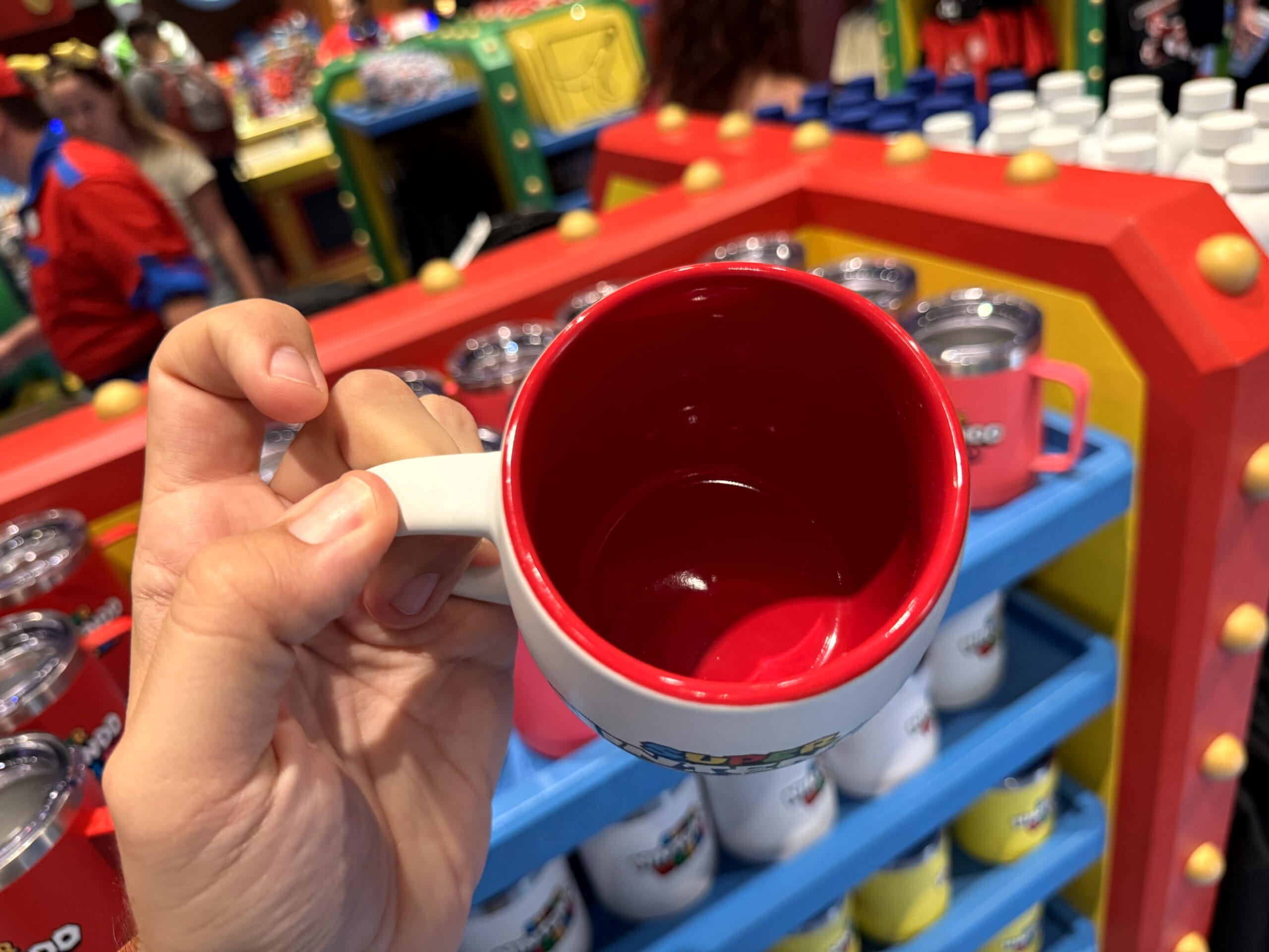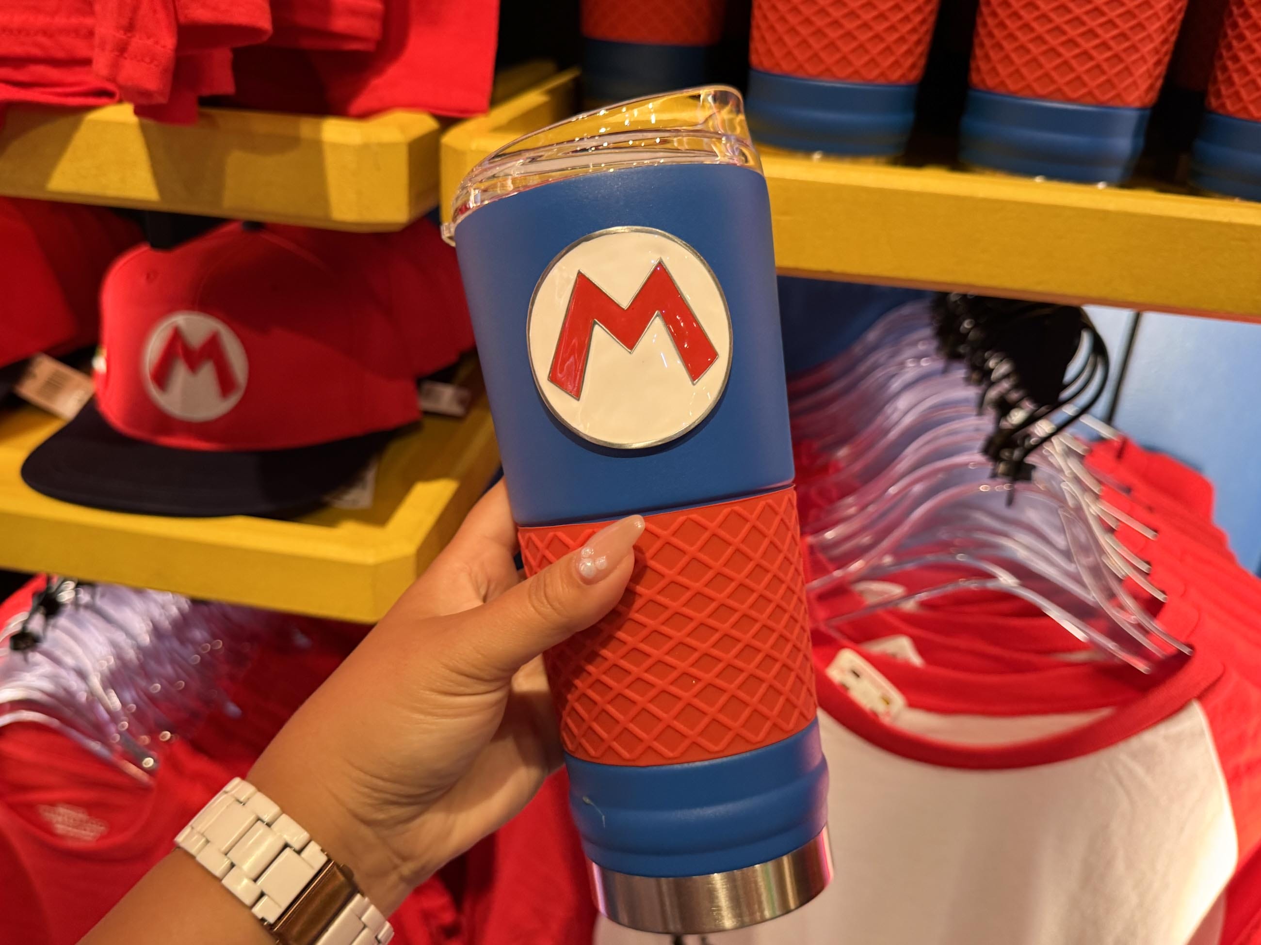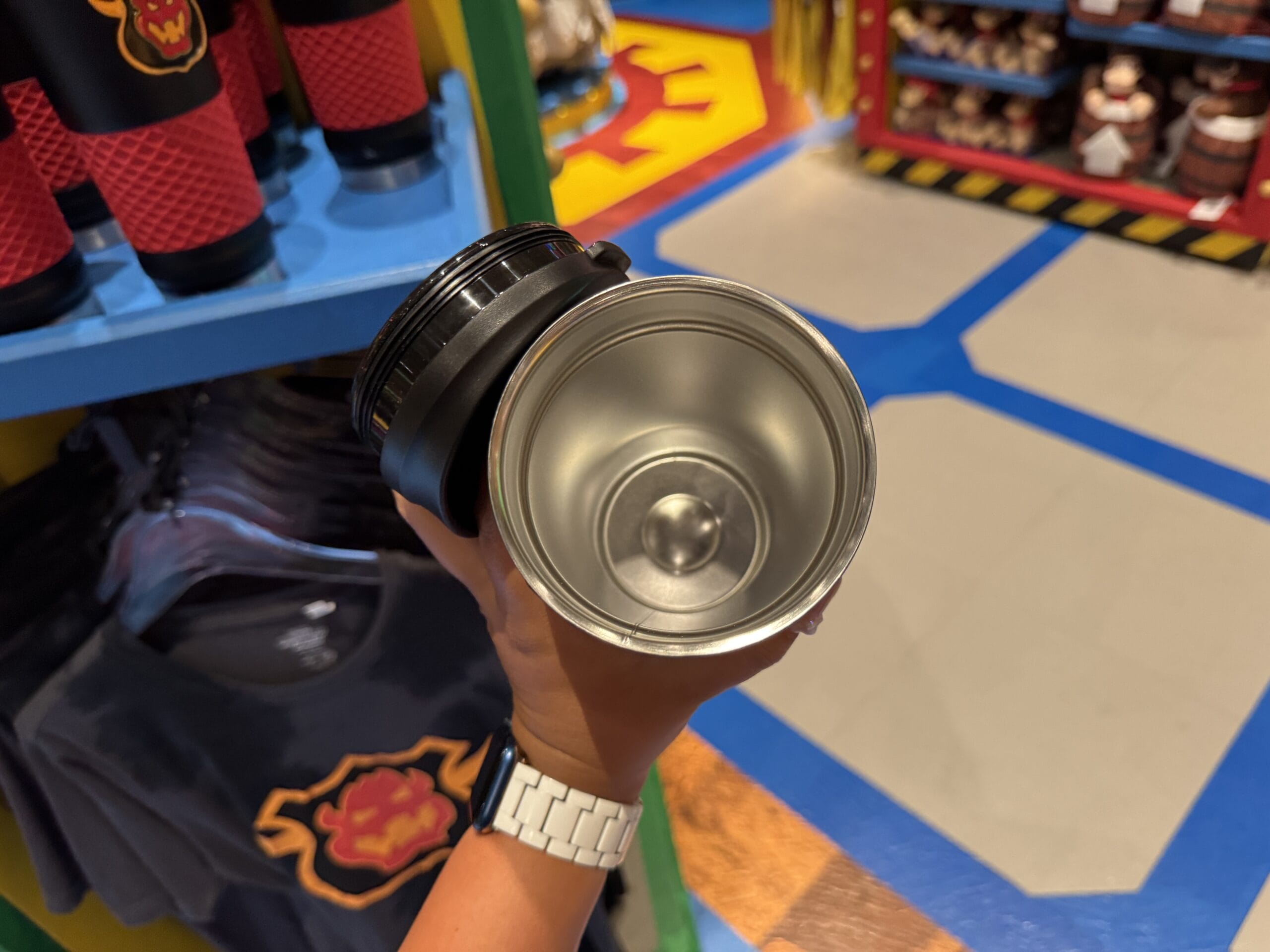 The stainless steel mugs are hand-wash only. This one has a red exterior and handle with the Super Nintendo World logo on both sides. It includes a clear lid.