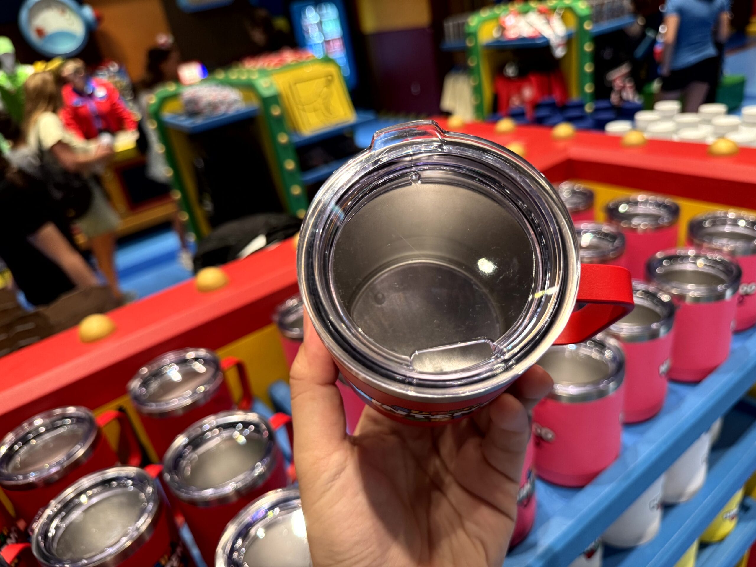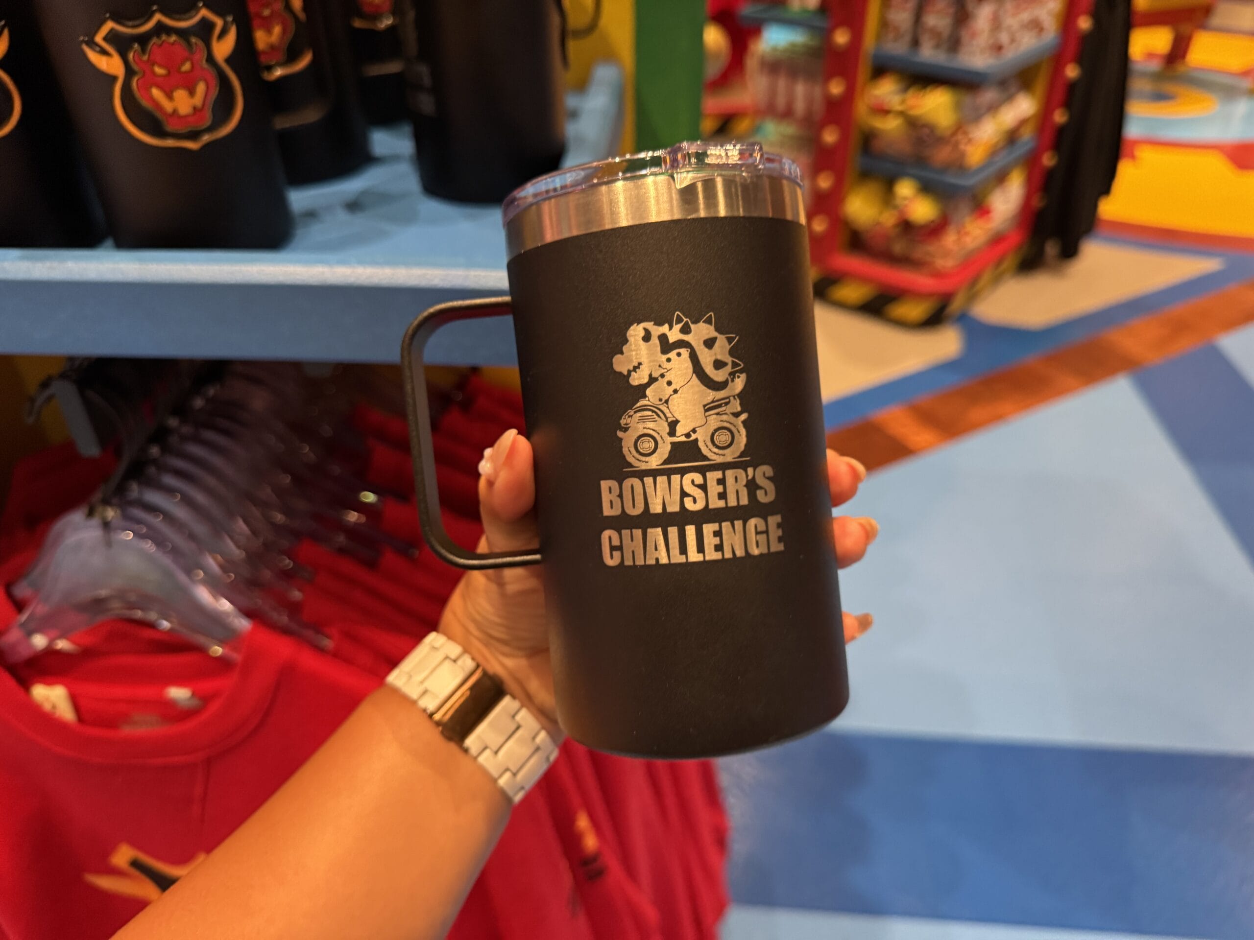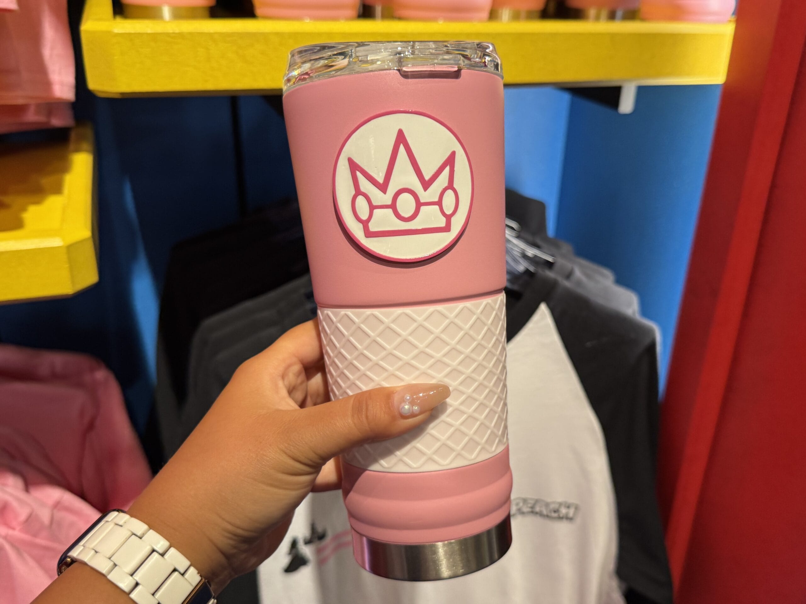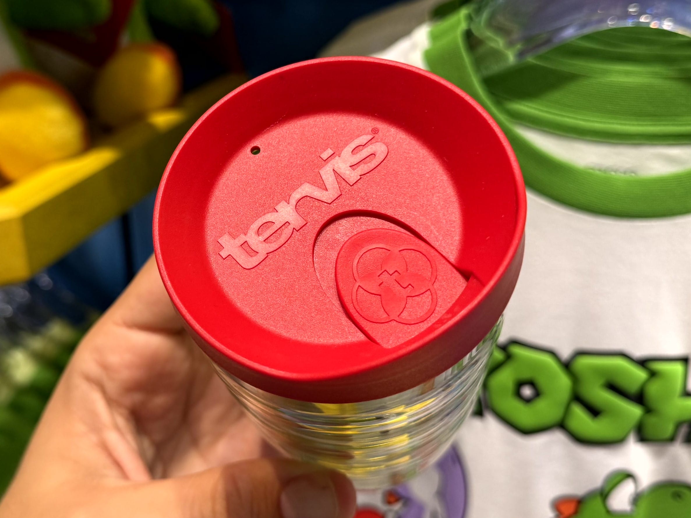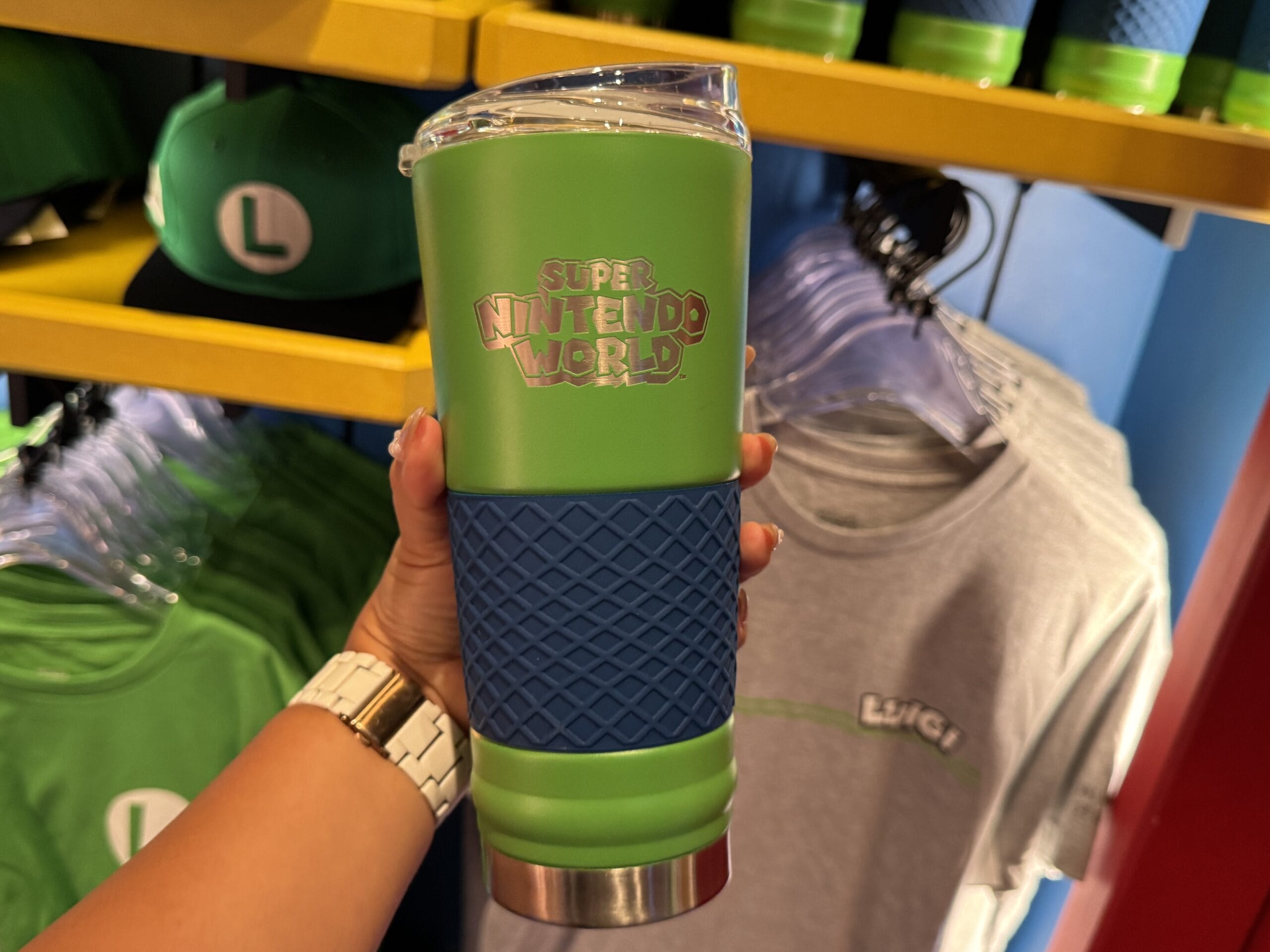 The stainless steel mugs are hand-wash only. This one has a red exterior and handle with the Super Nintendo World logo on both sides. It includes a clear lid.