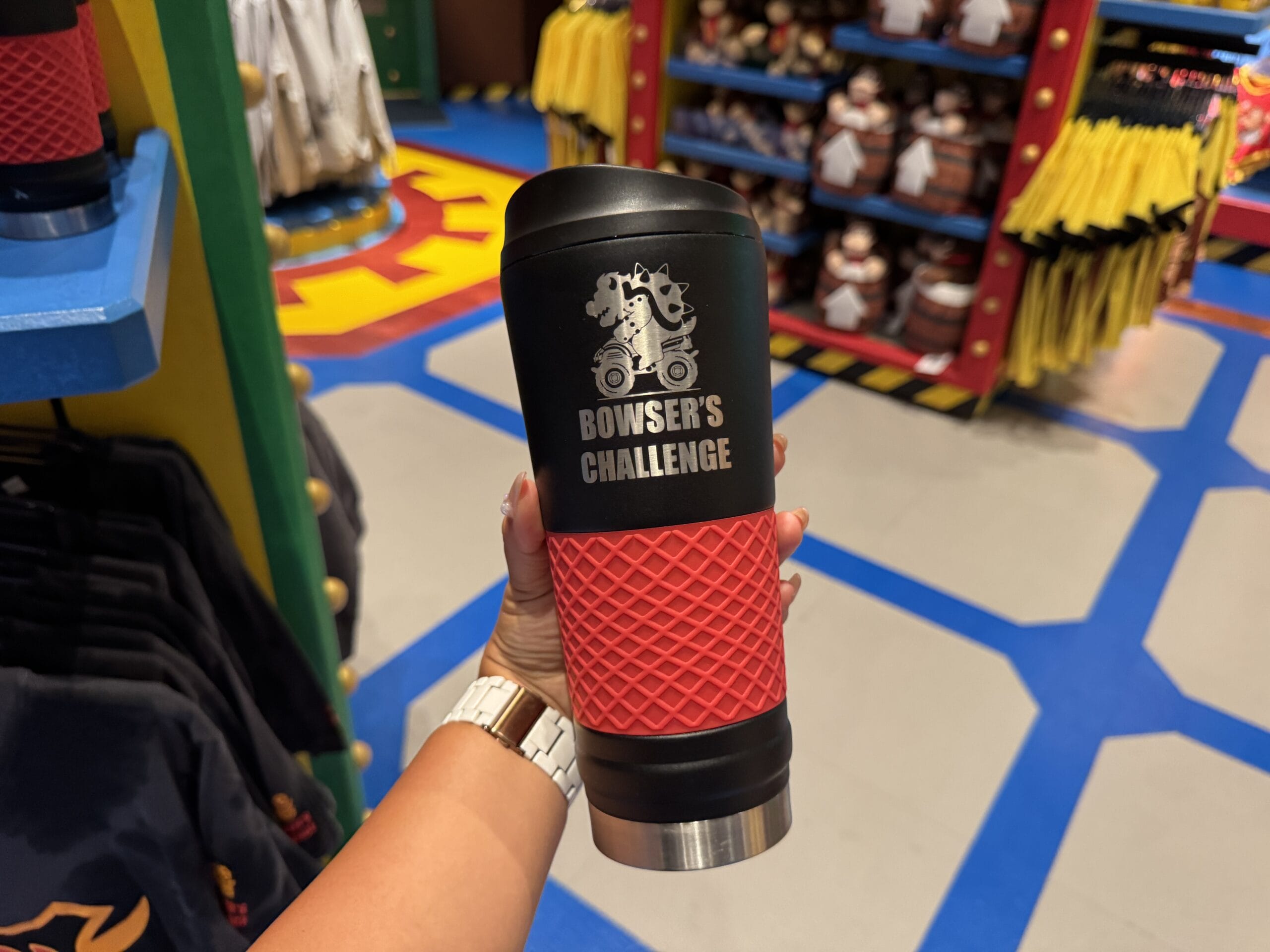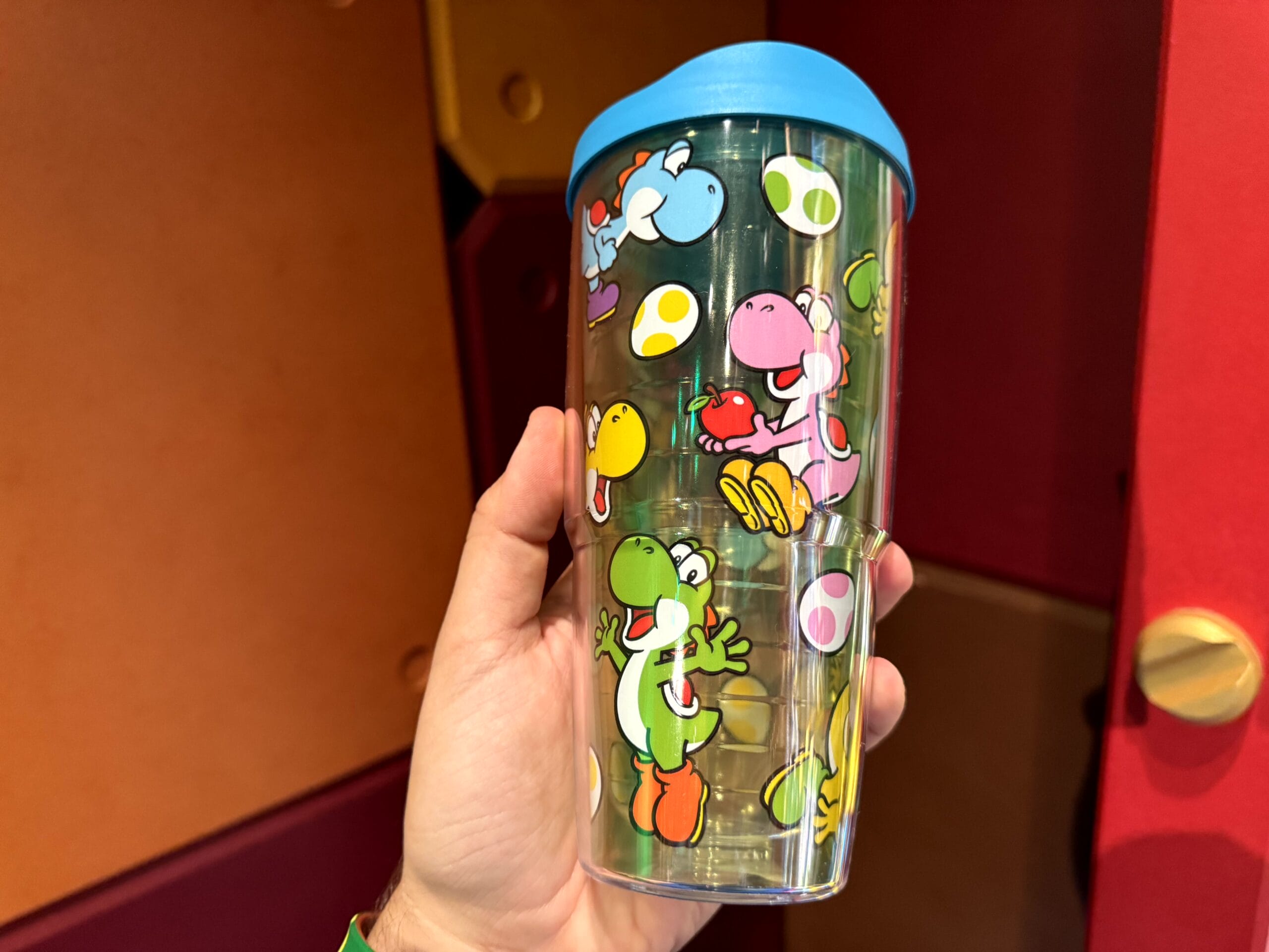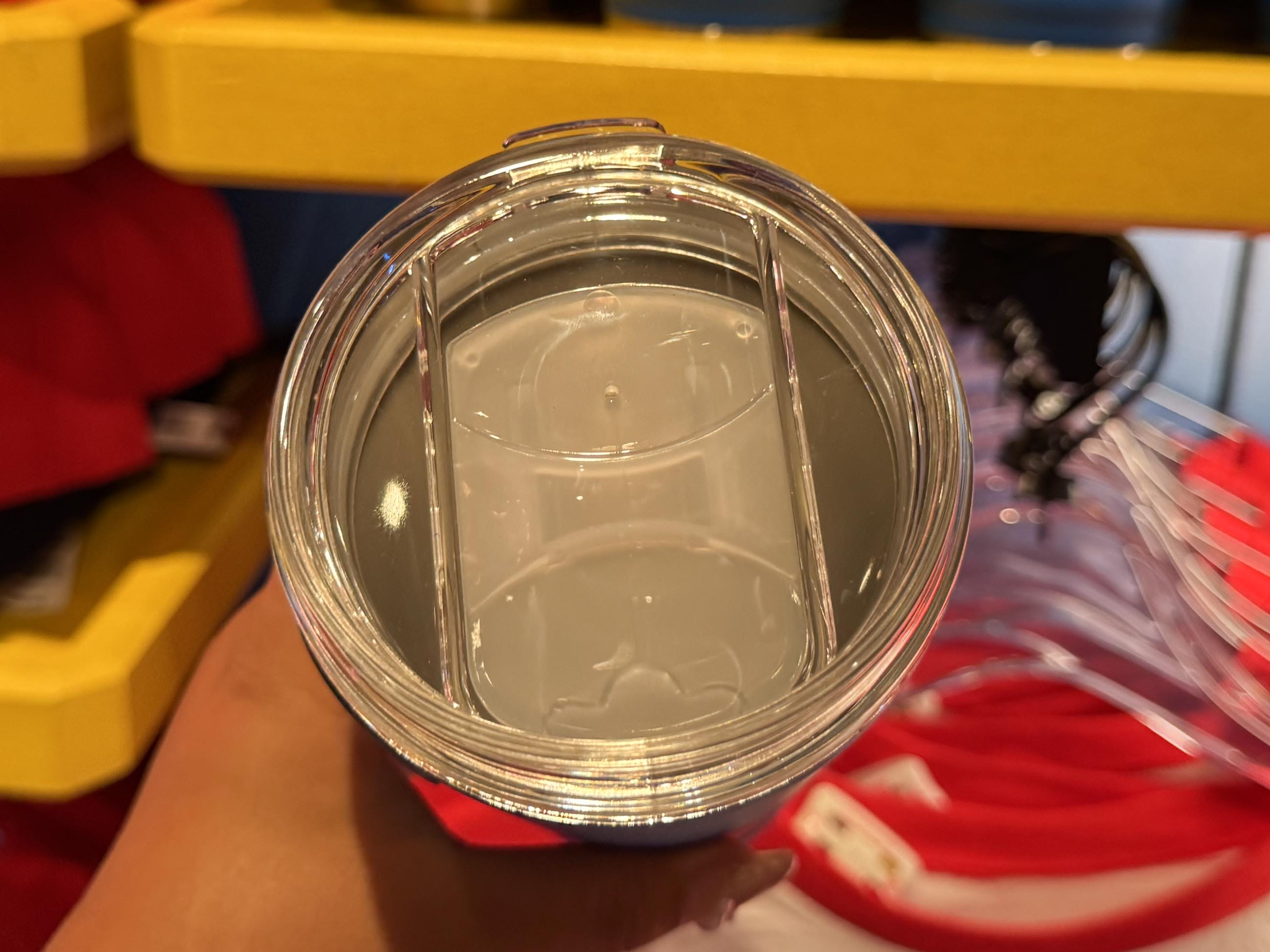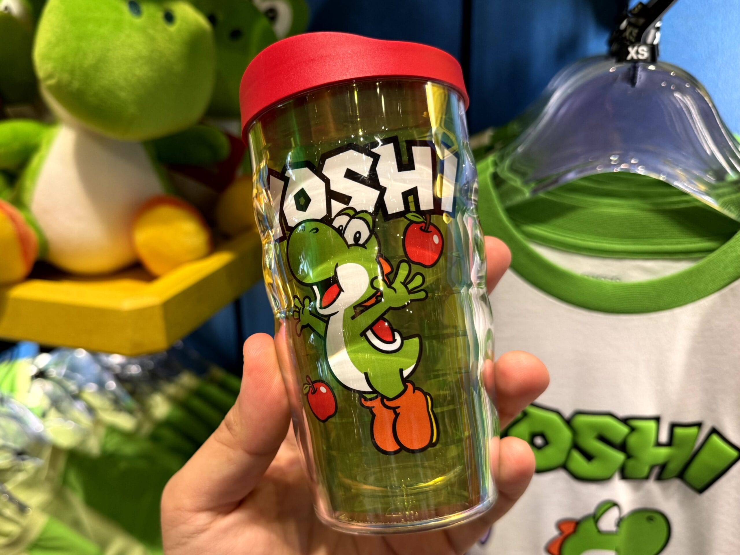The stainless steel mugs are hand-wash only. This one has a red exterior and handle with the Super Nintendo World logo on both sides. It includes a clear lid.