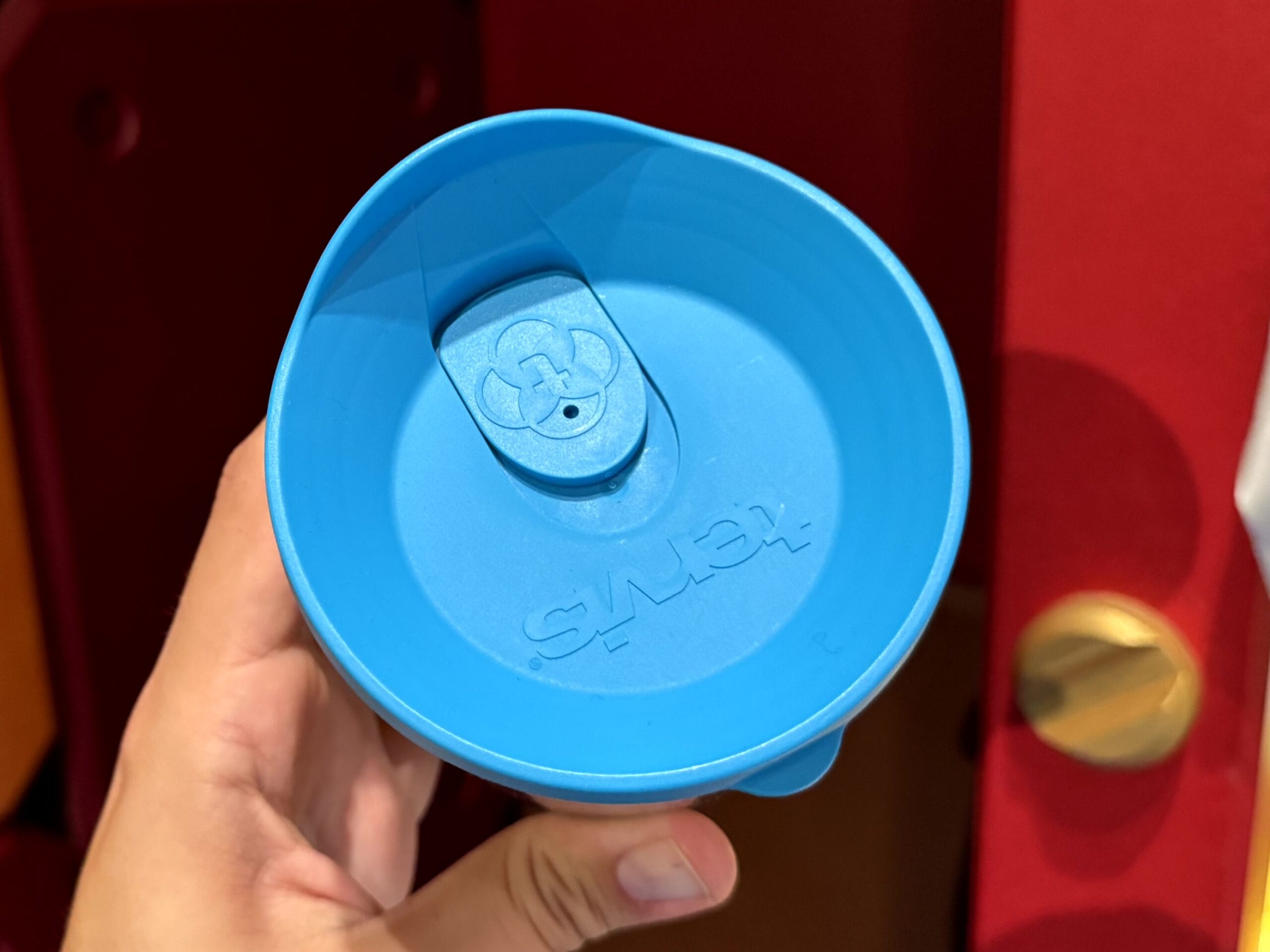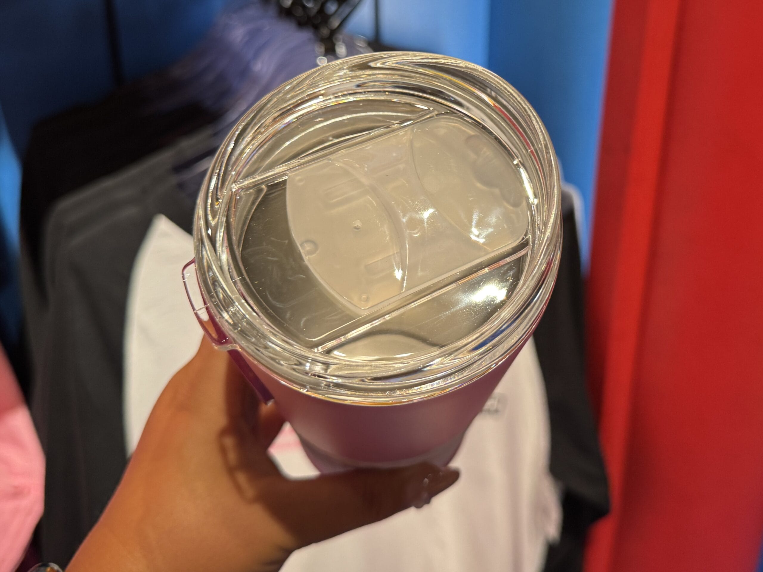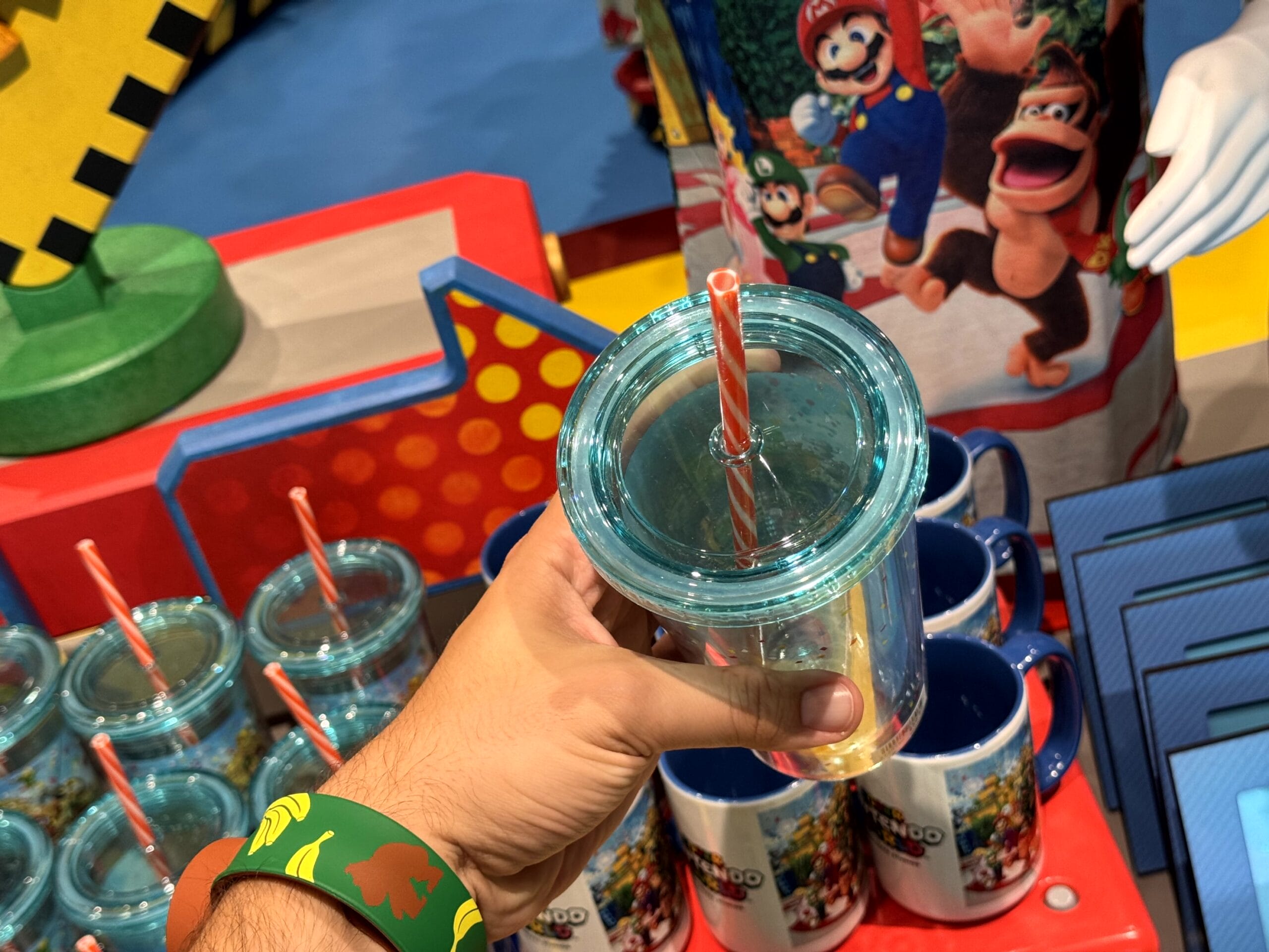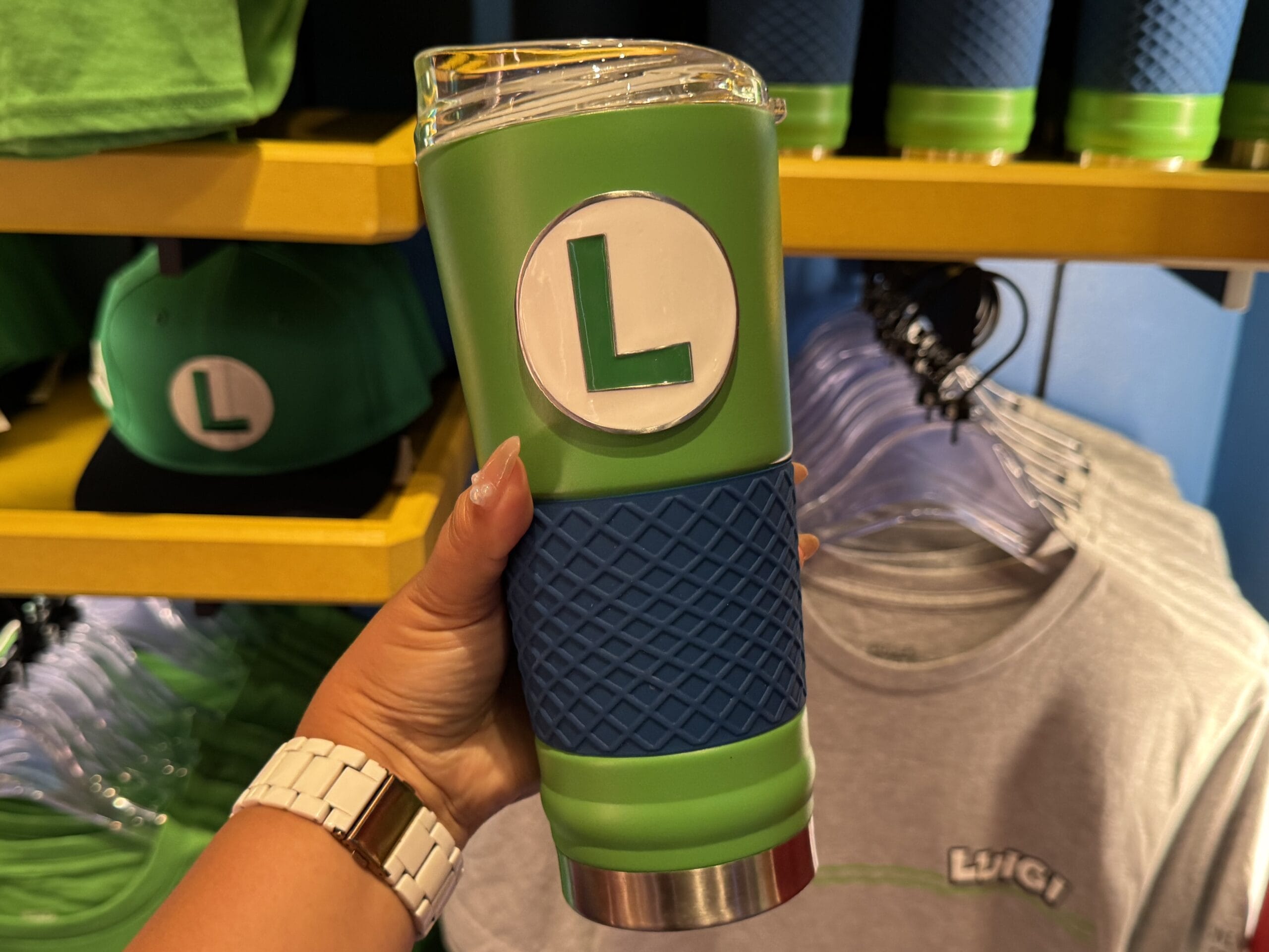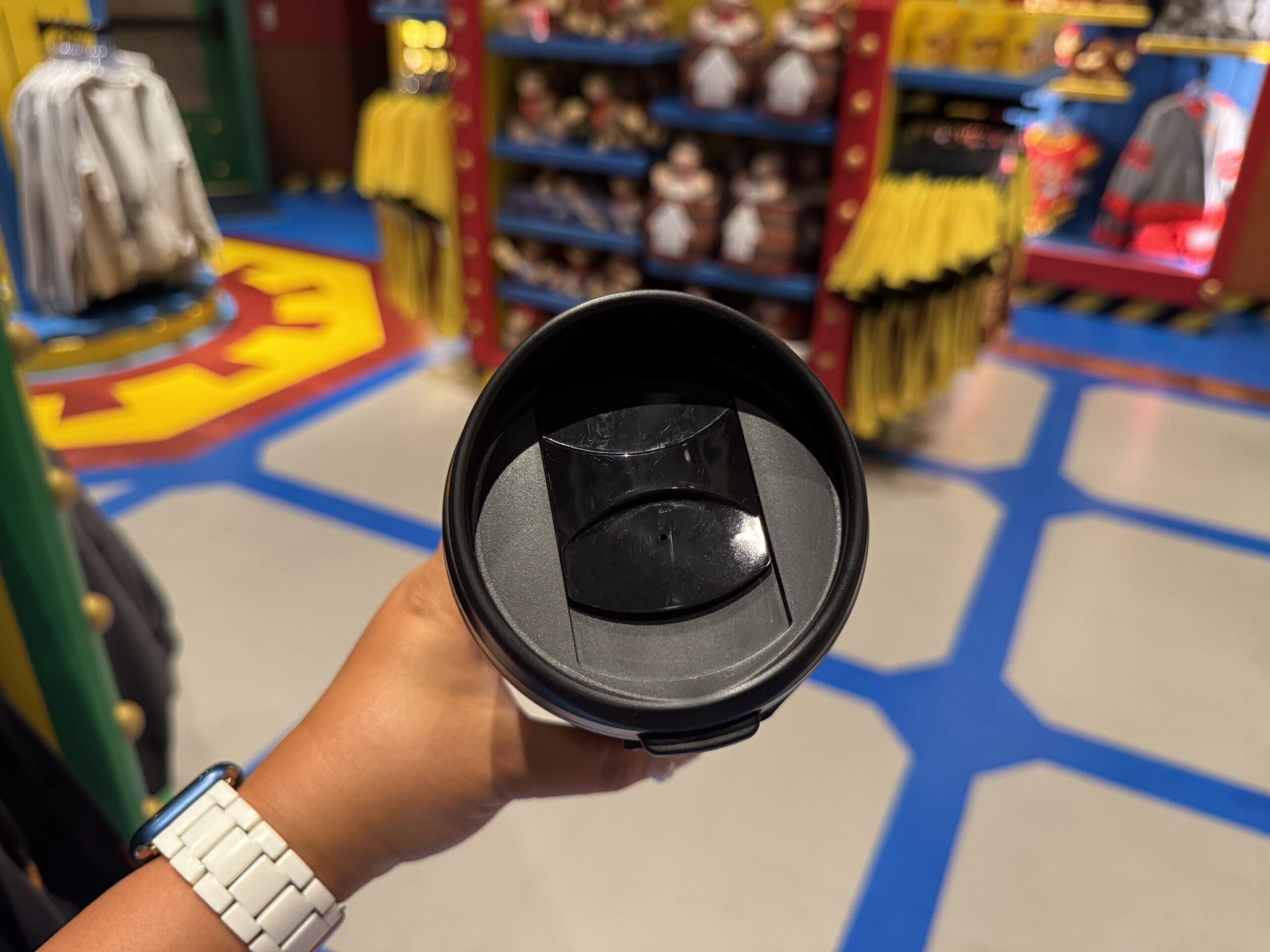 The stainless steel mugs are hand-wash only. This one has a red exterior and handle with the Super Nintendo World logo on both sides. It includes a clear lid.