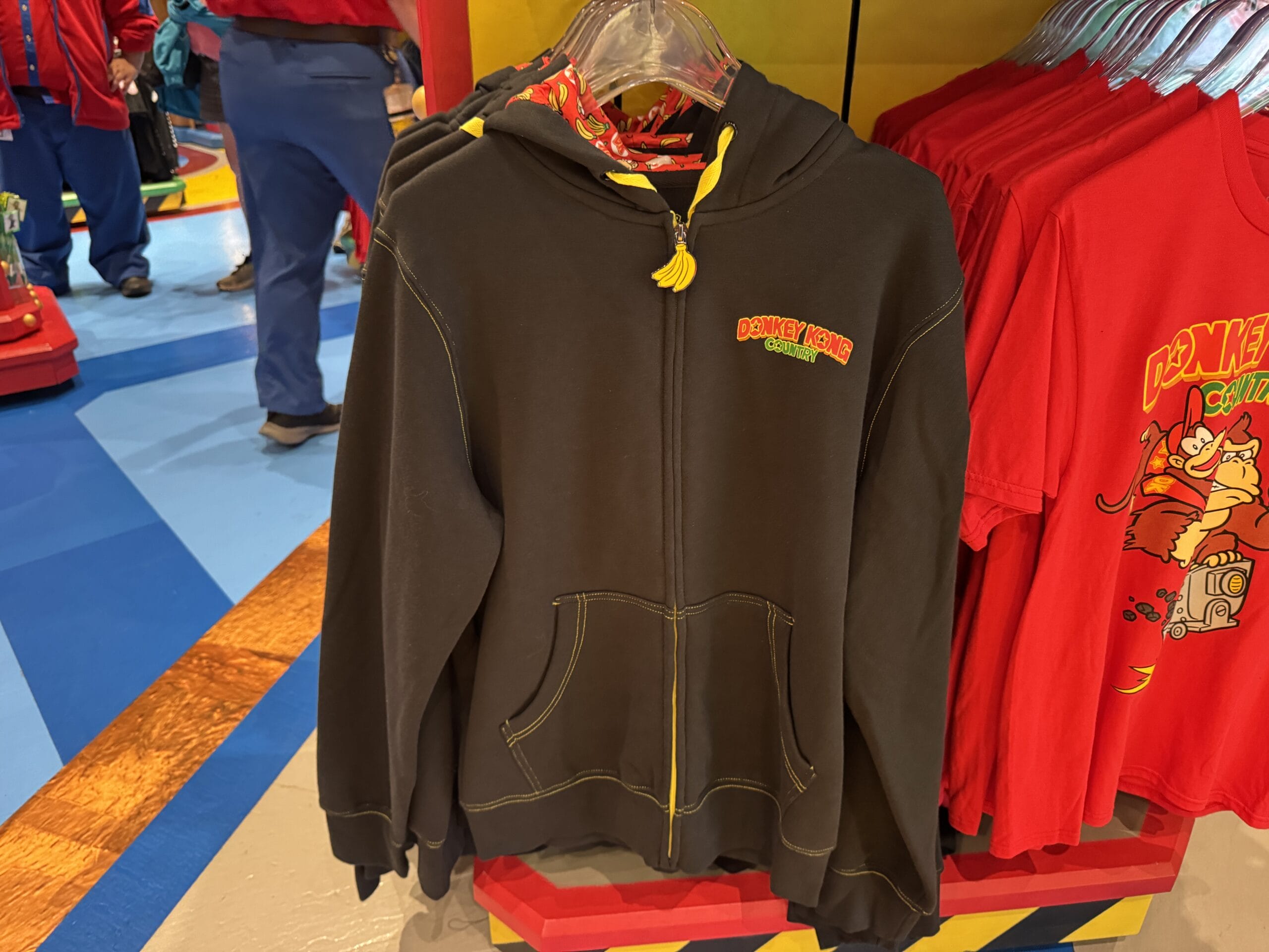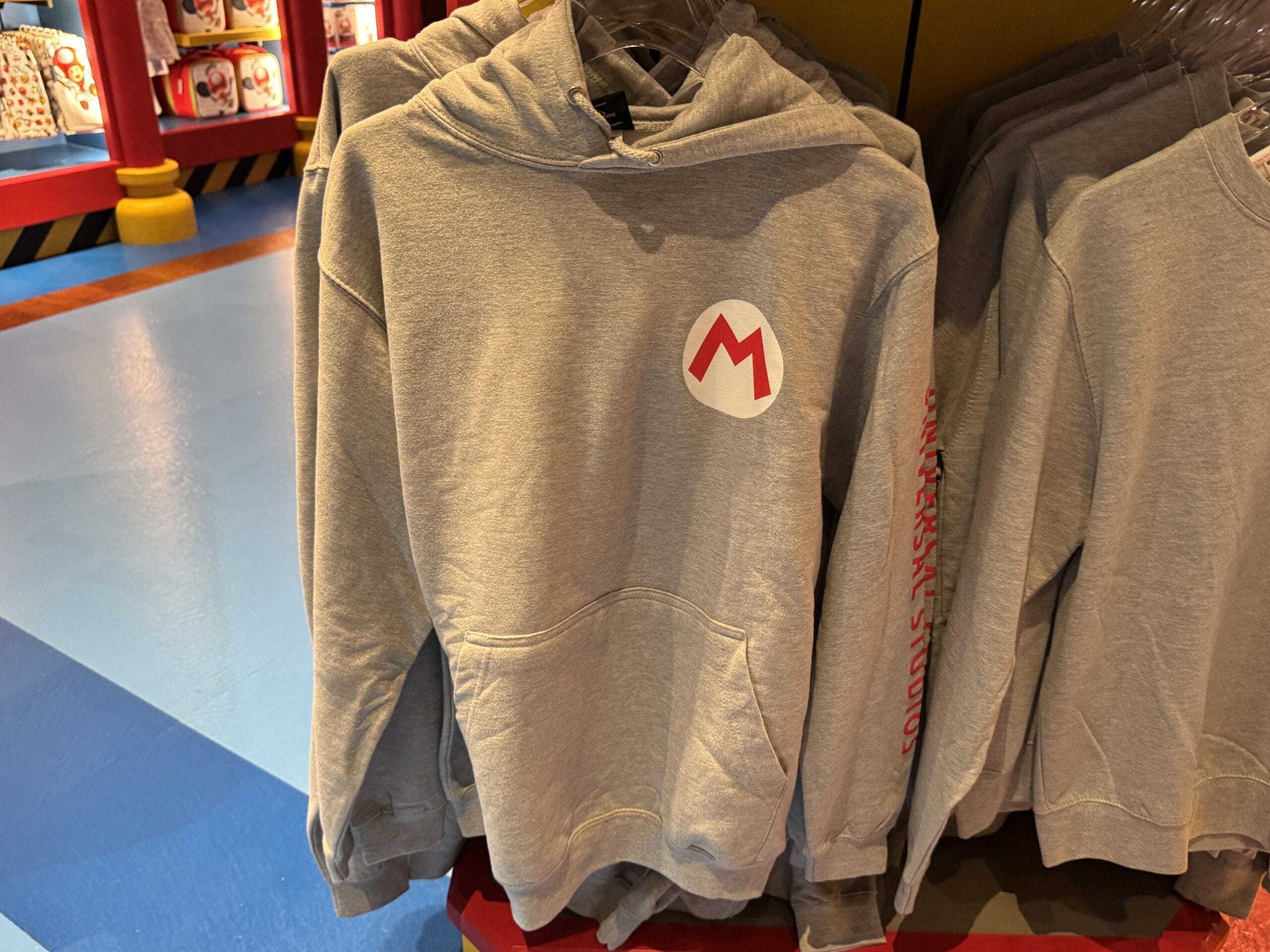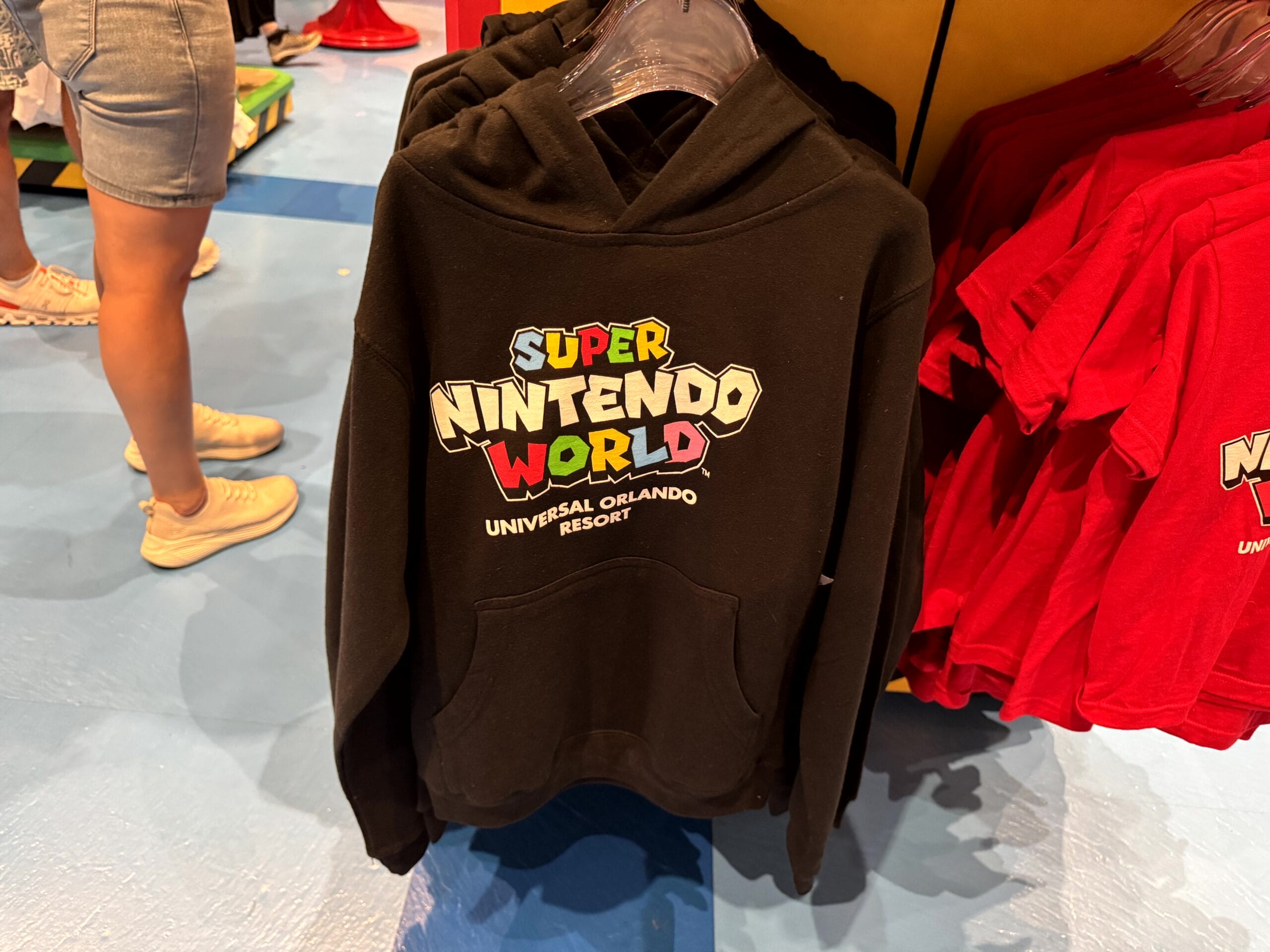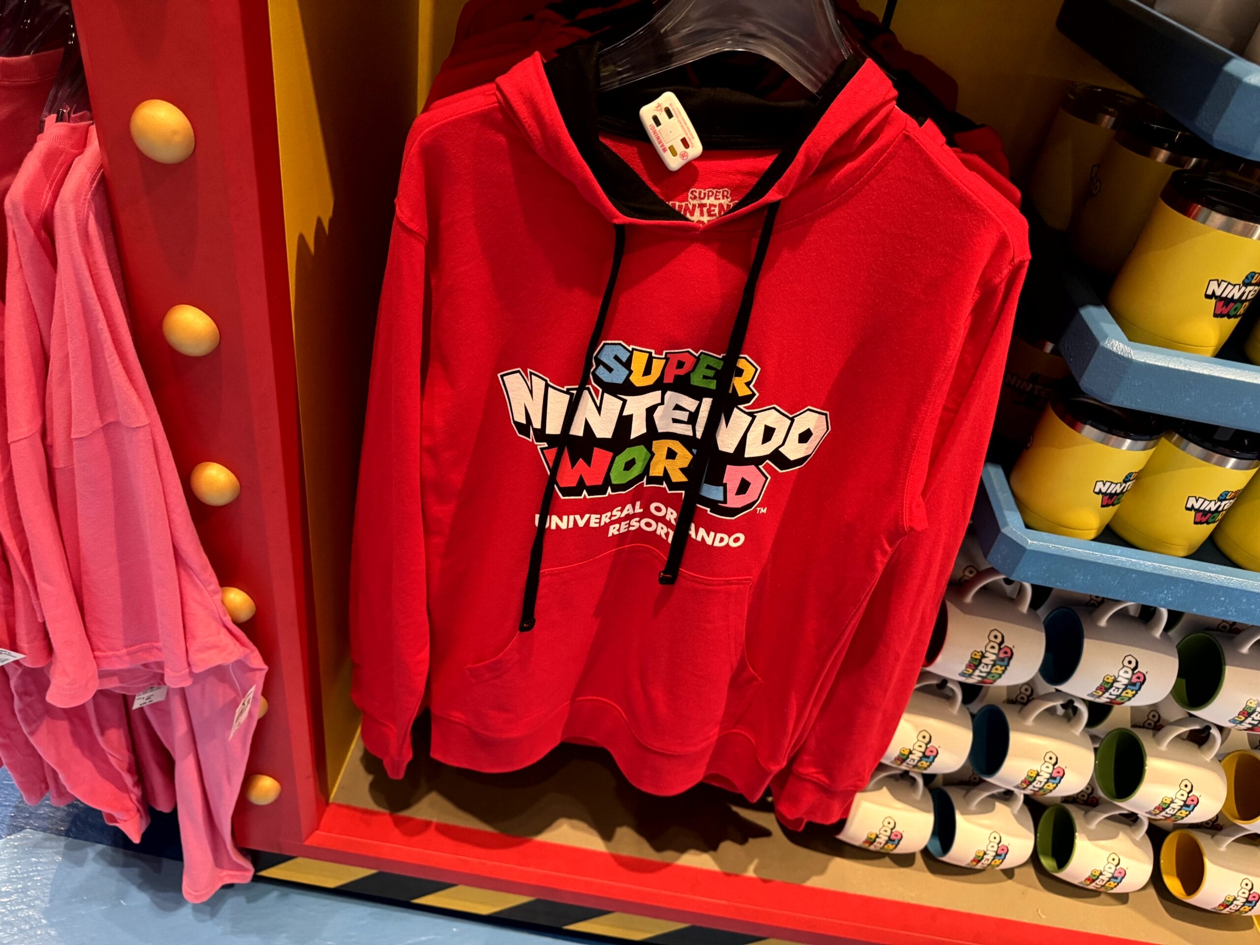 This pullover hoodie is red with black hood lining and a black drawstring. It has a kangaroo pocket below the Super Nintendo World logo and “Universal Orlando Resort.”