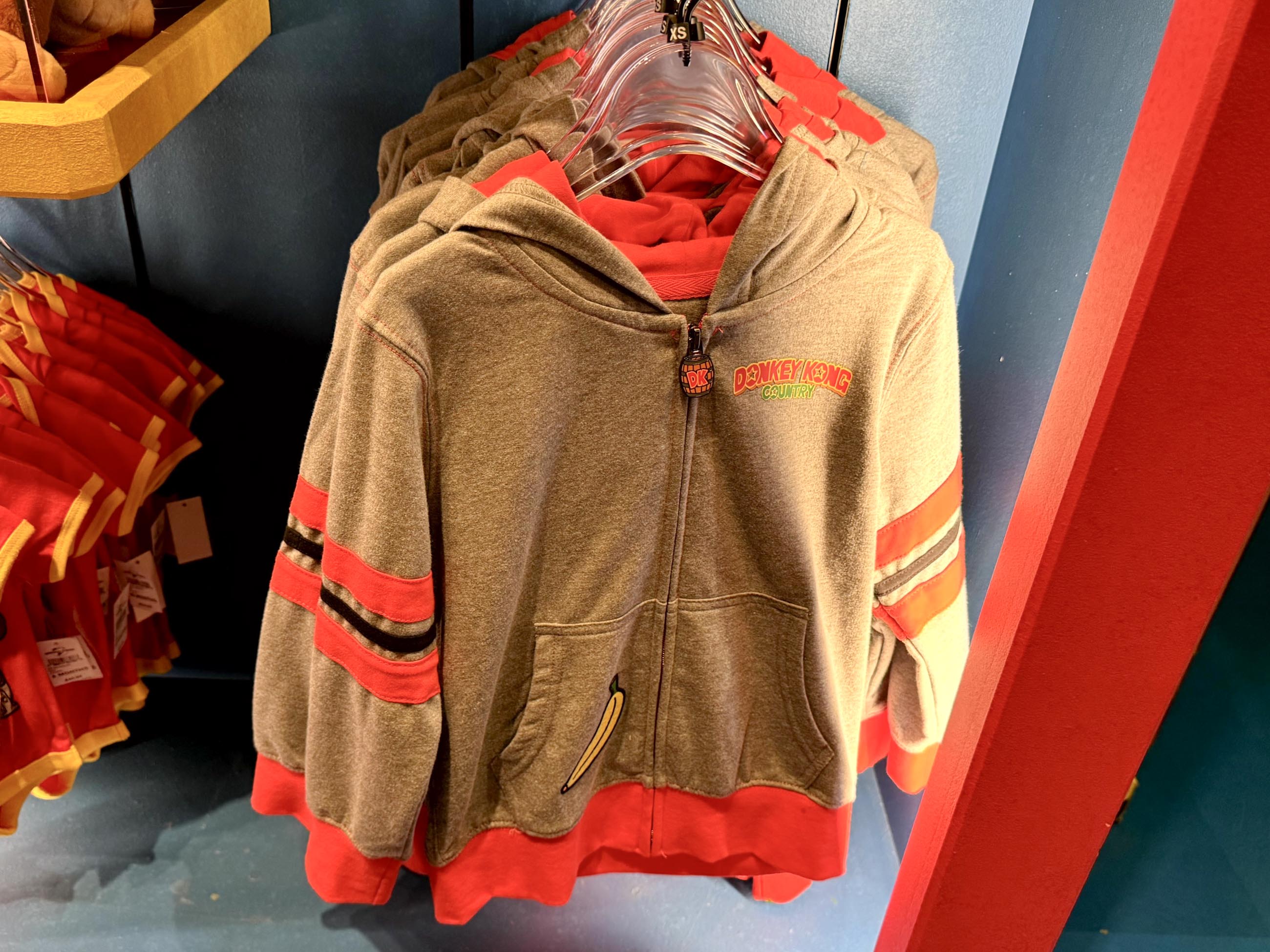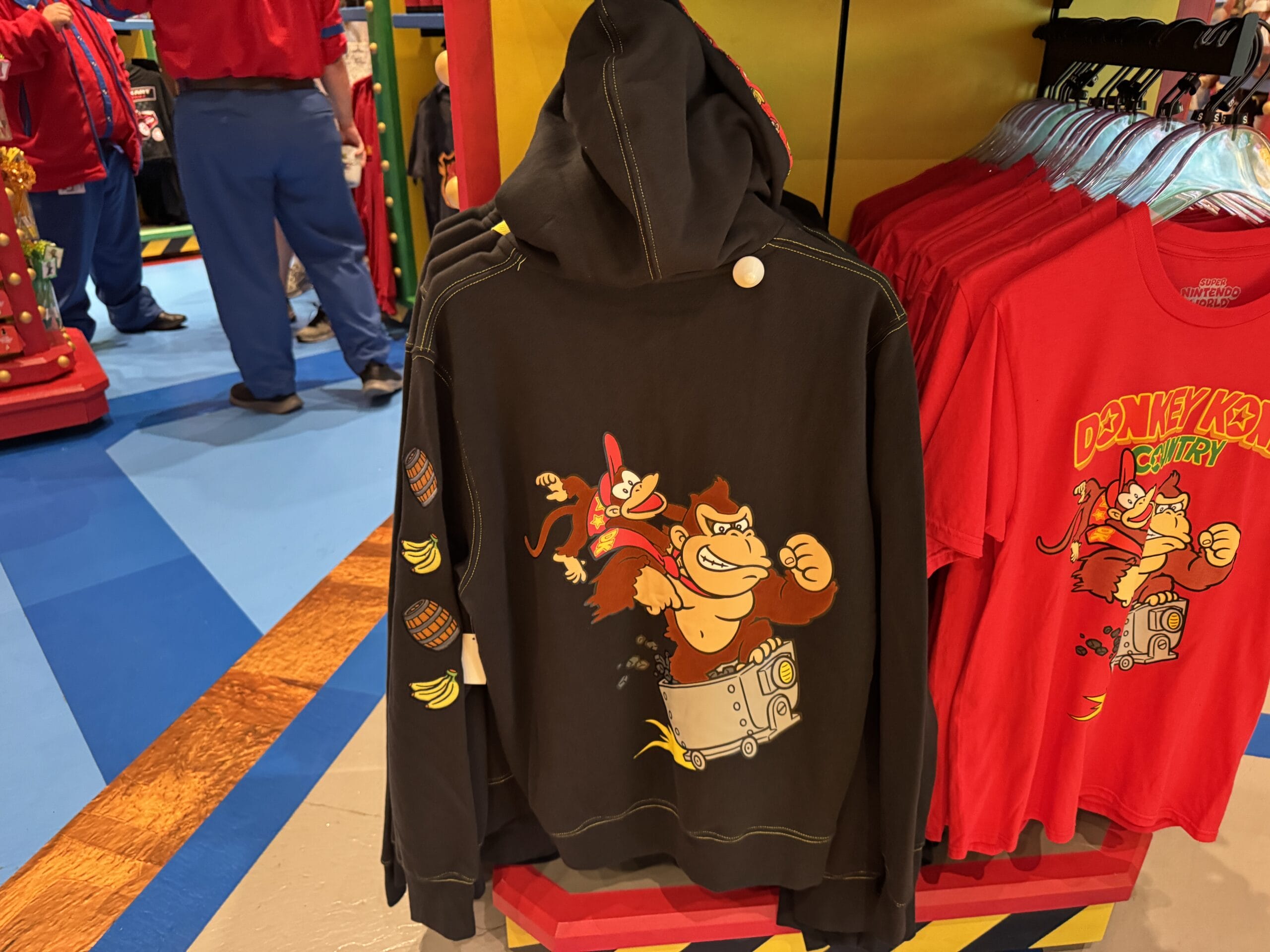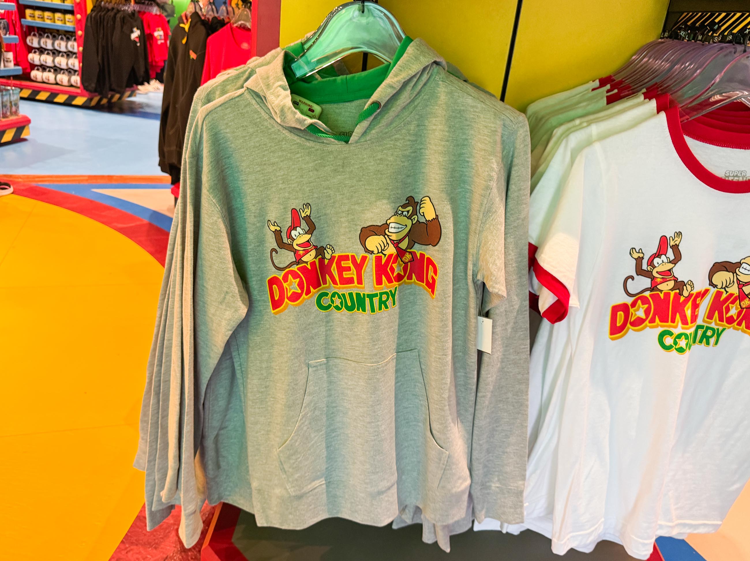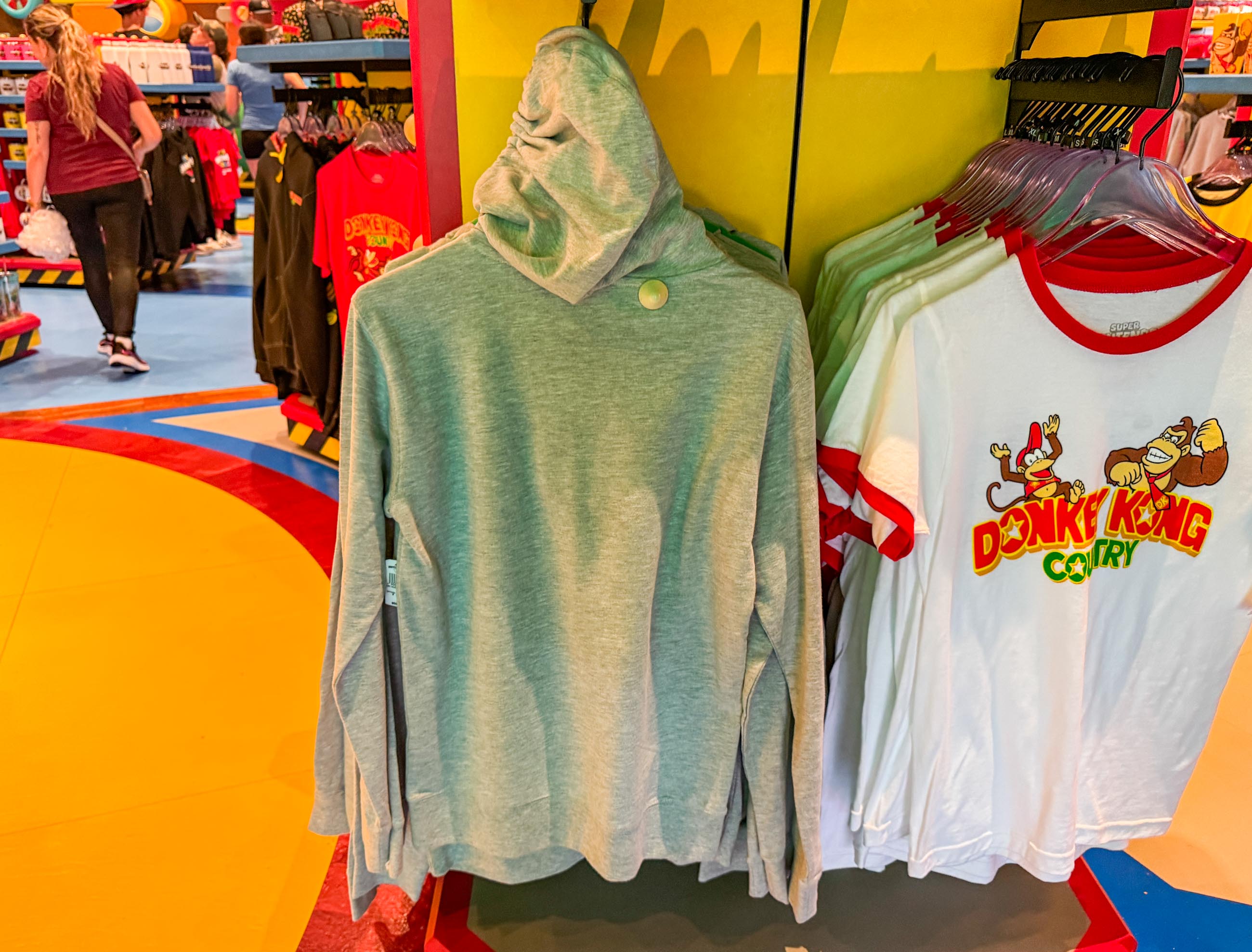 This pullover hoodie is red with black hood lining and a black drawstring. It has a kangaroo pocket below the Super Nintendo World logo and “Universal Orlando Resort.”