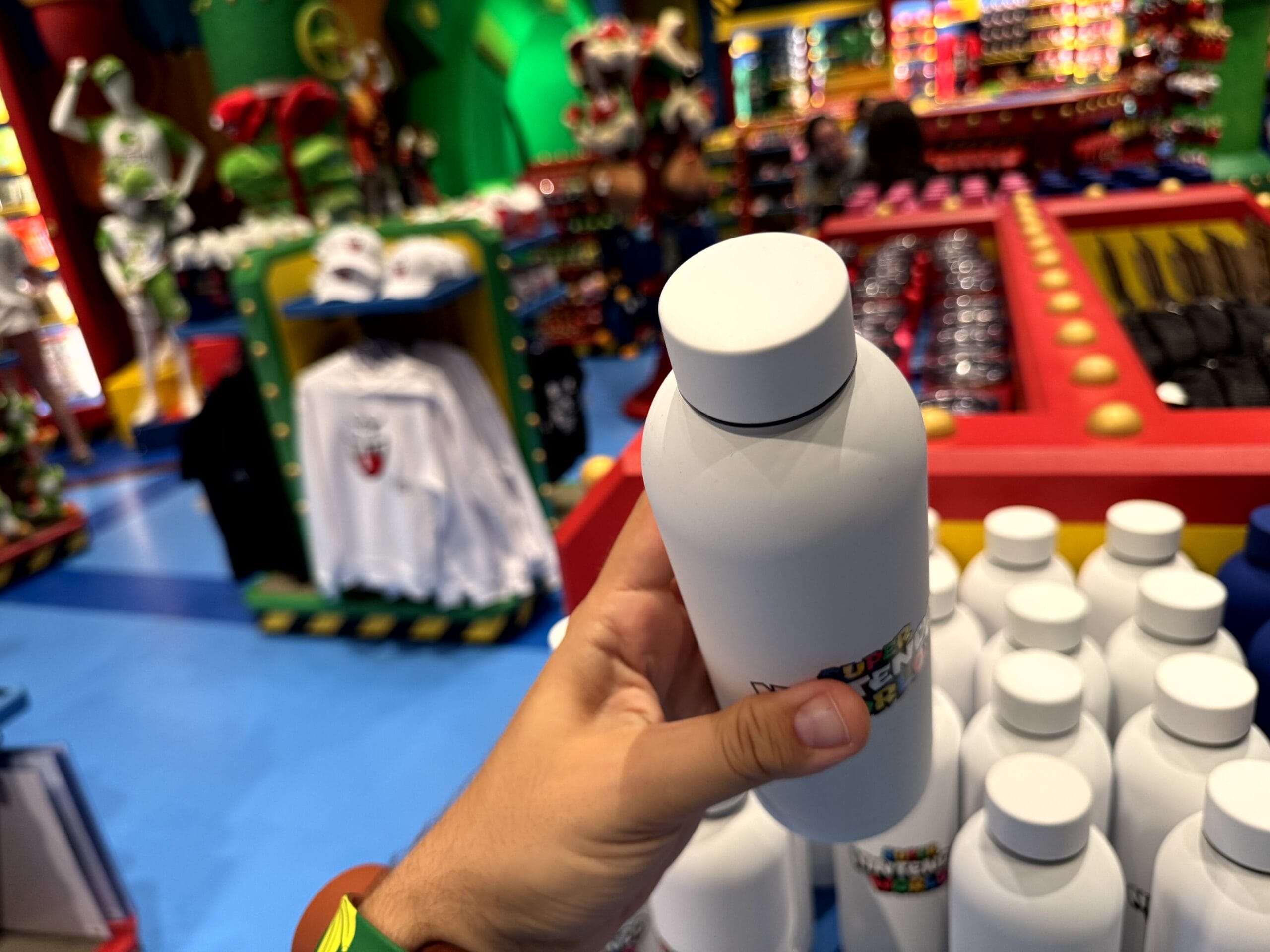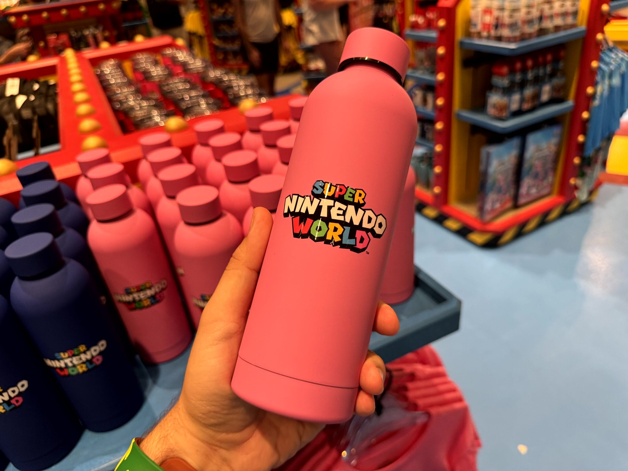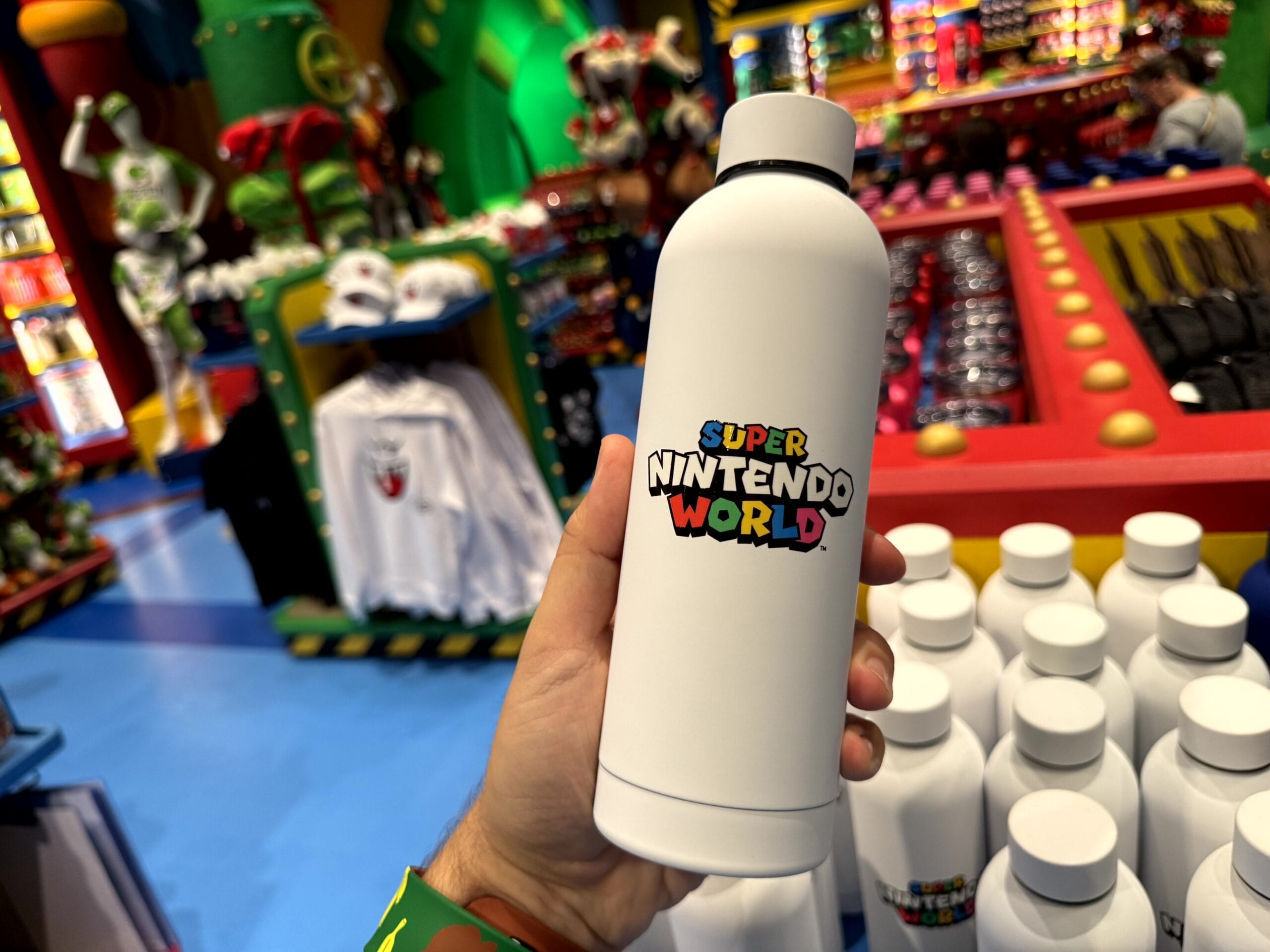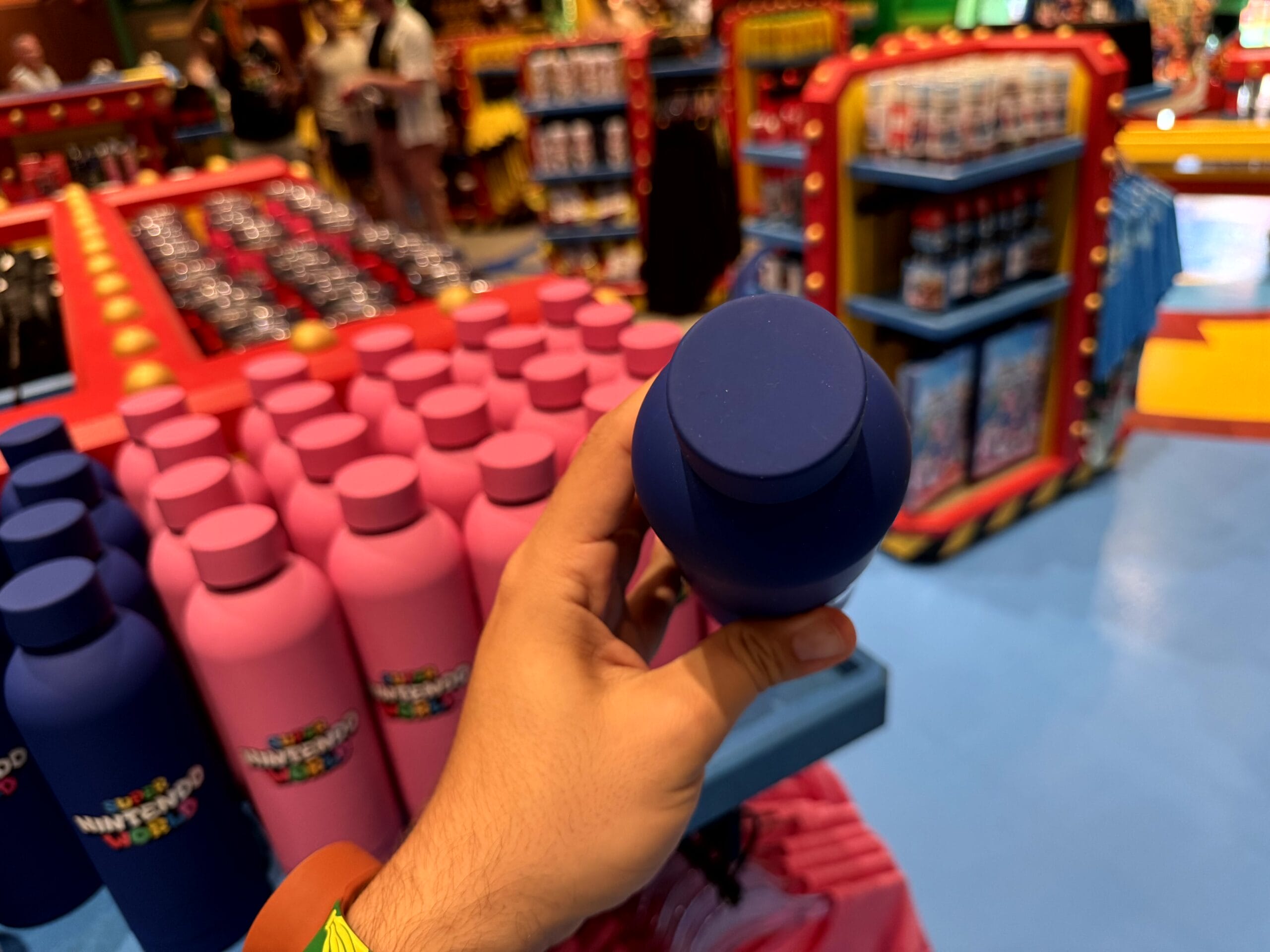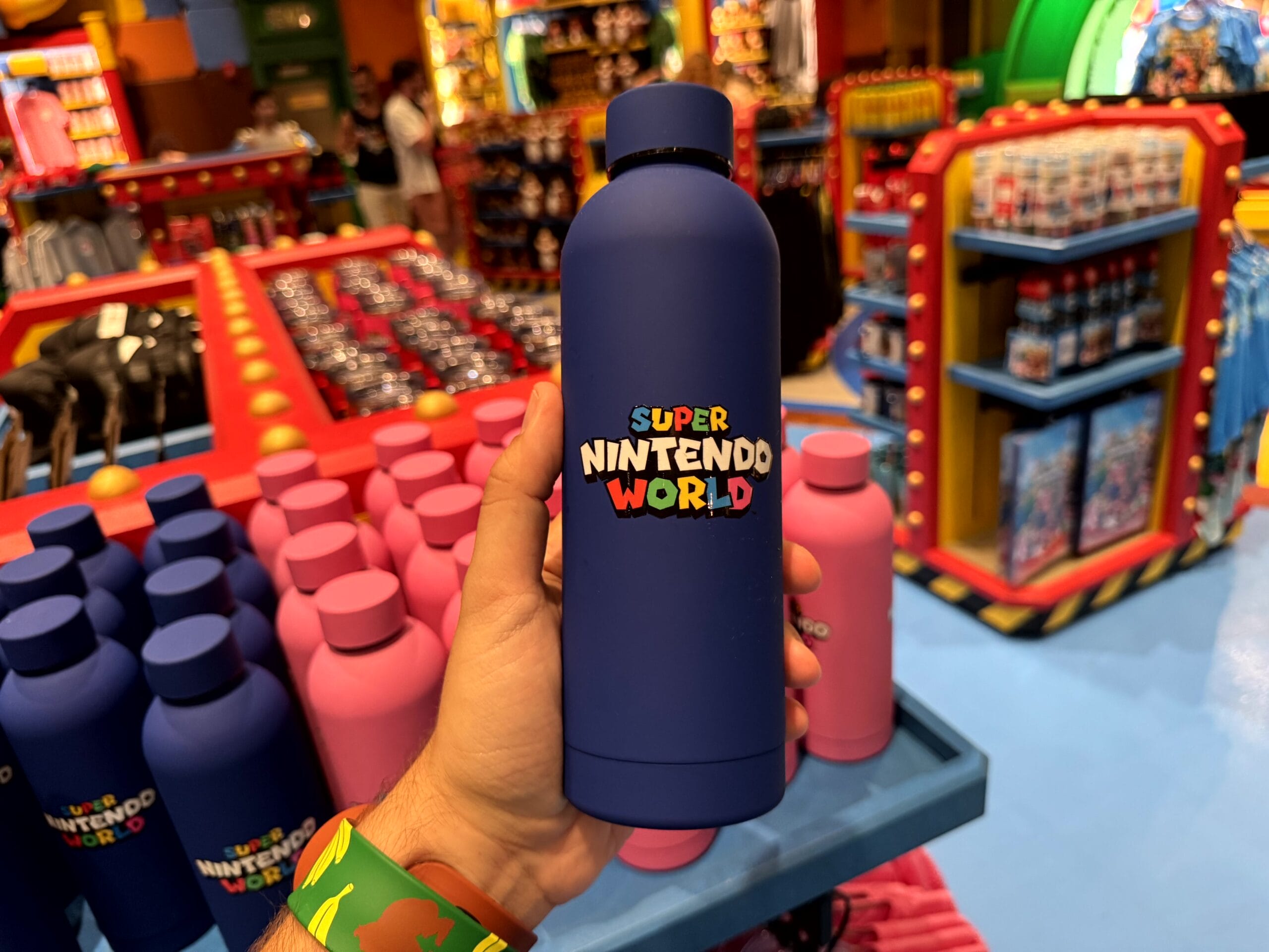The bottle is matte blue with a twist-off lid. The Super Nintendo World logo is on one side.