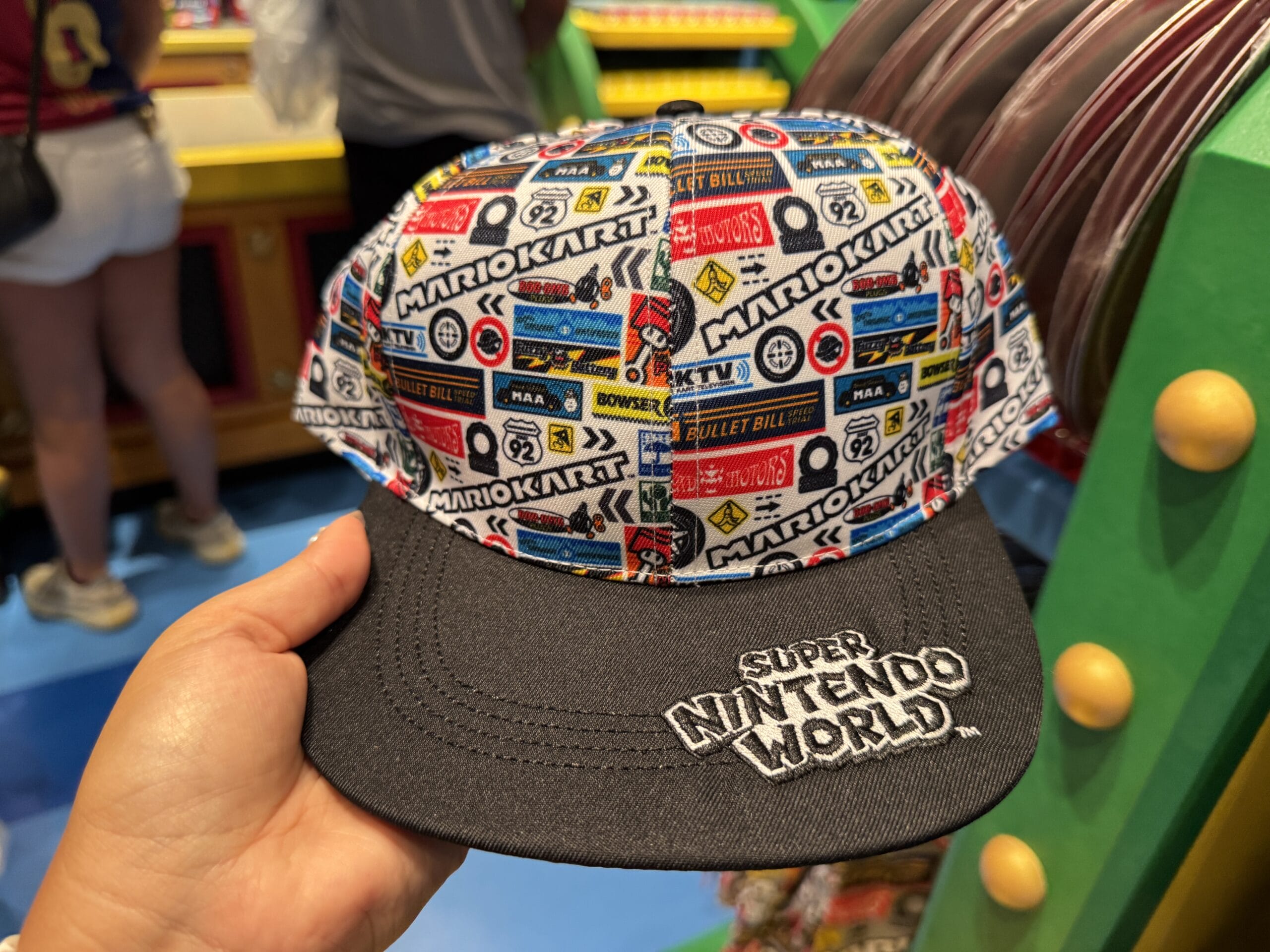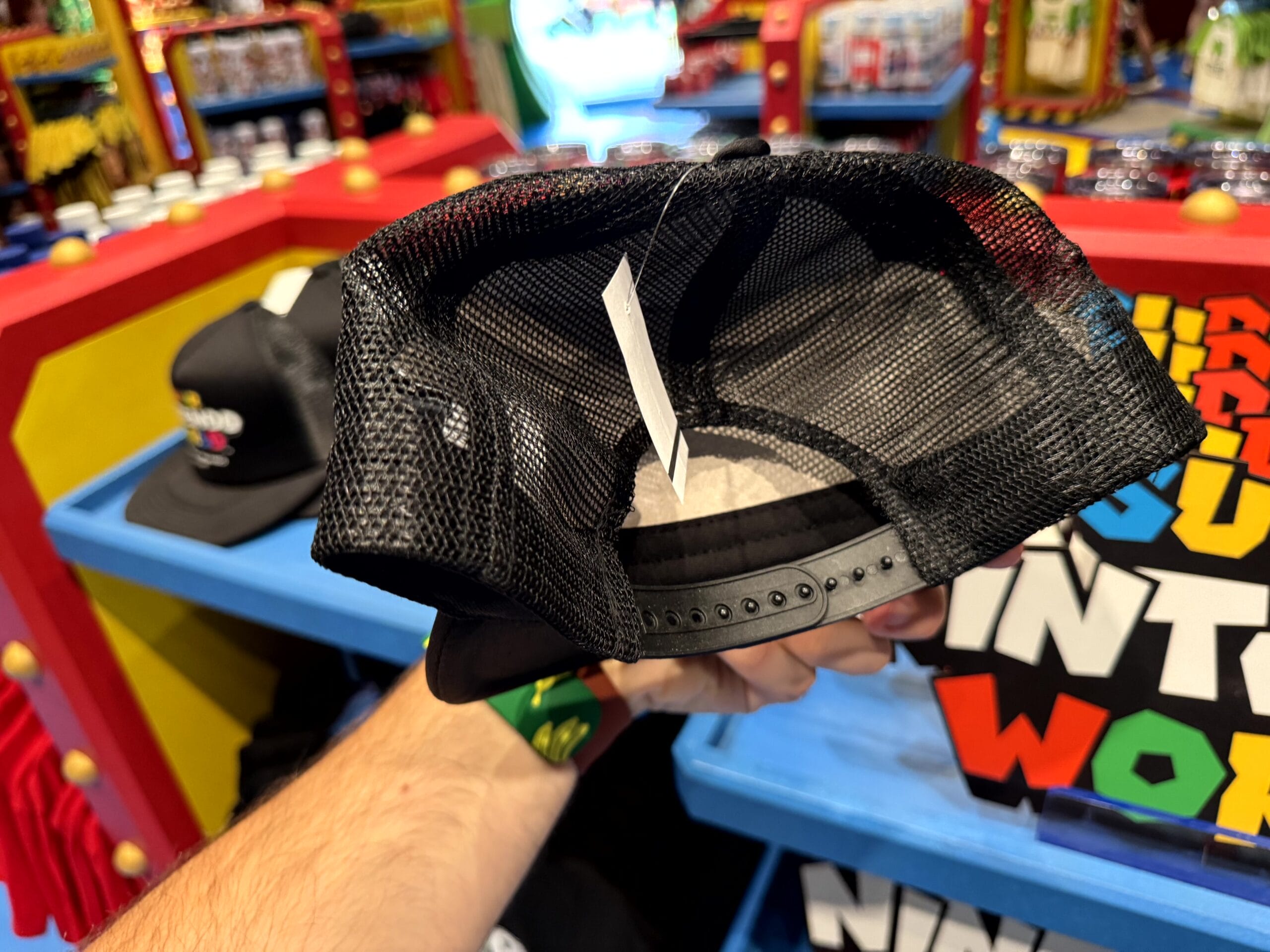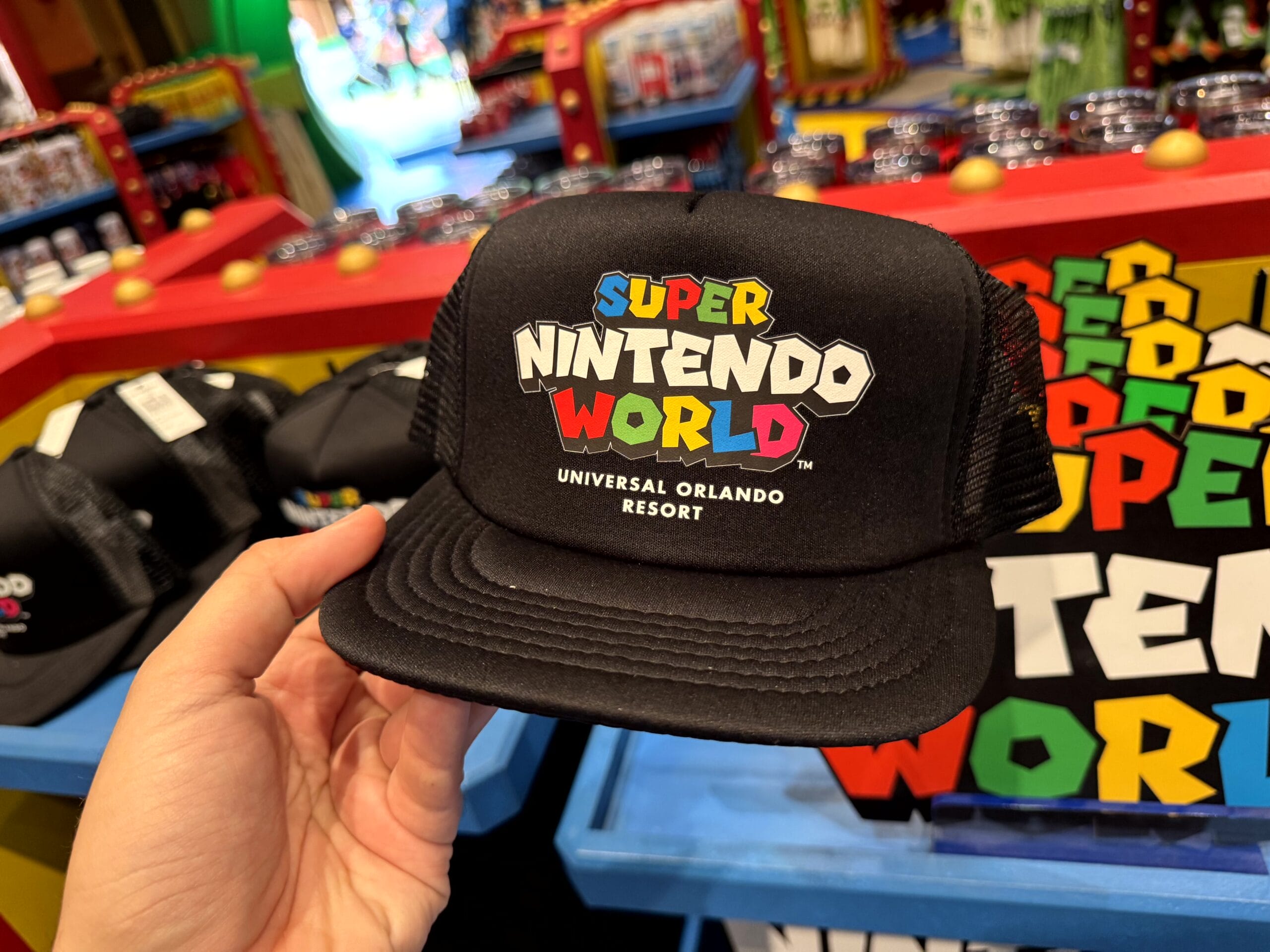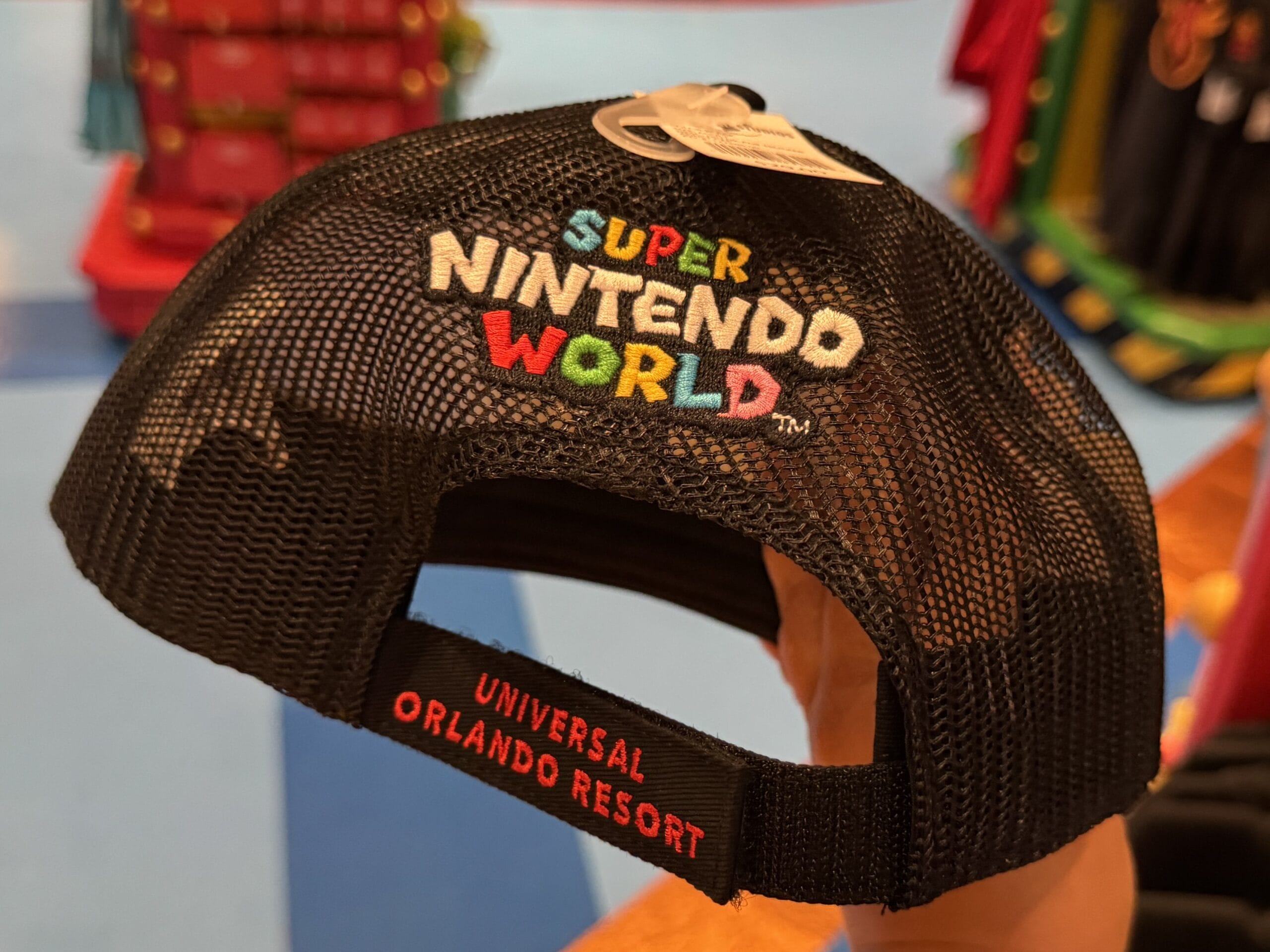 This cap is black with a flat brim. The front half is fabric while the back half is plastic mesh. The Super Nintendo World logo is a patch on the front.