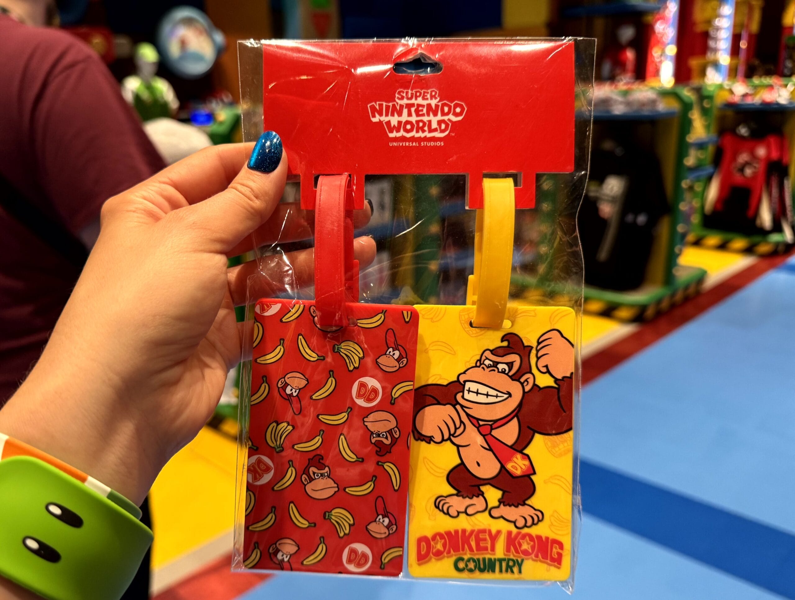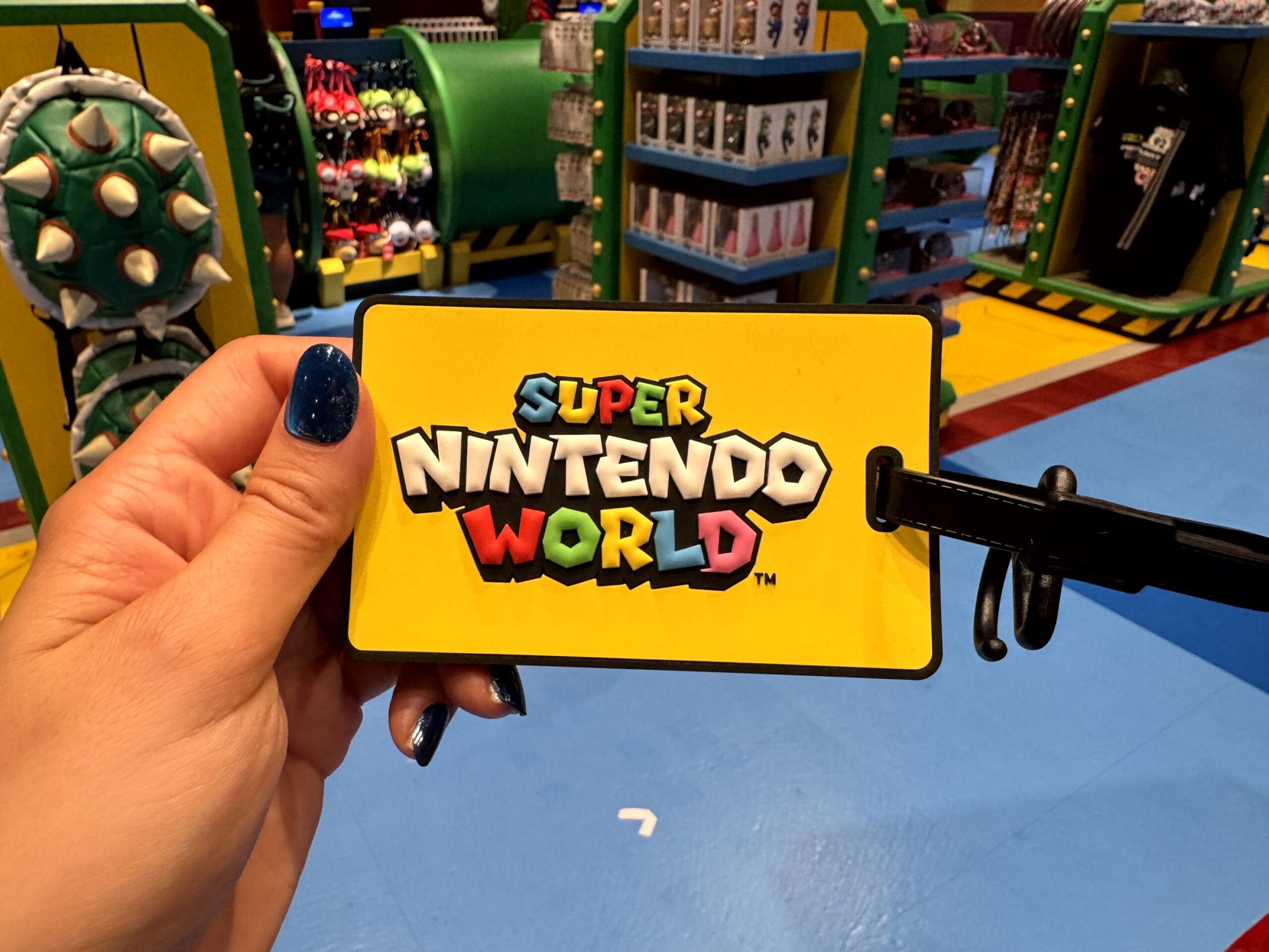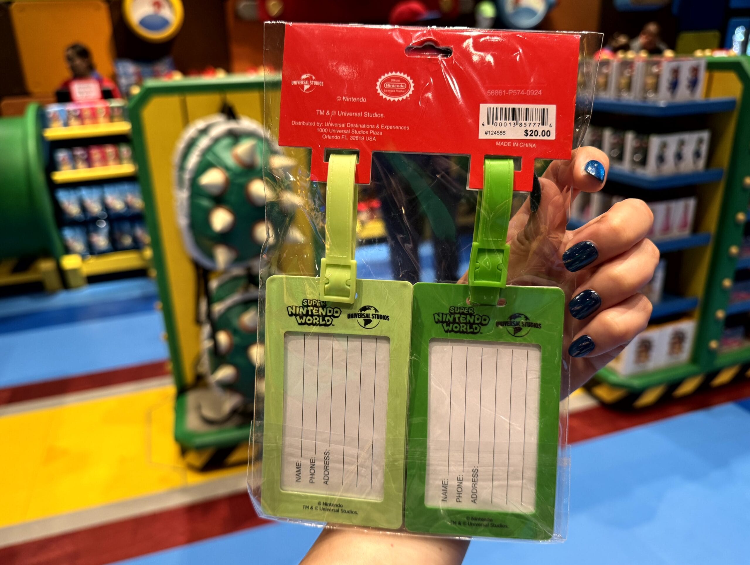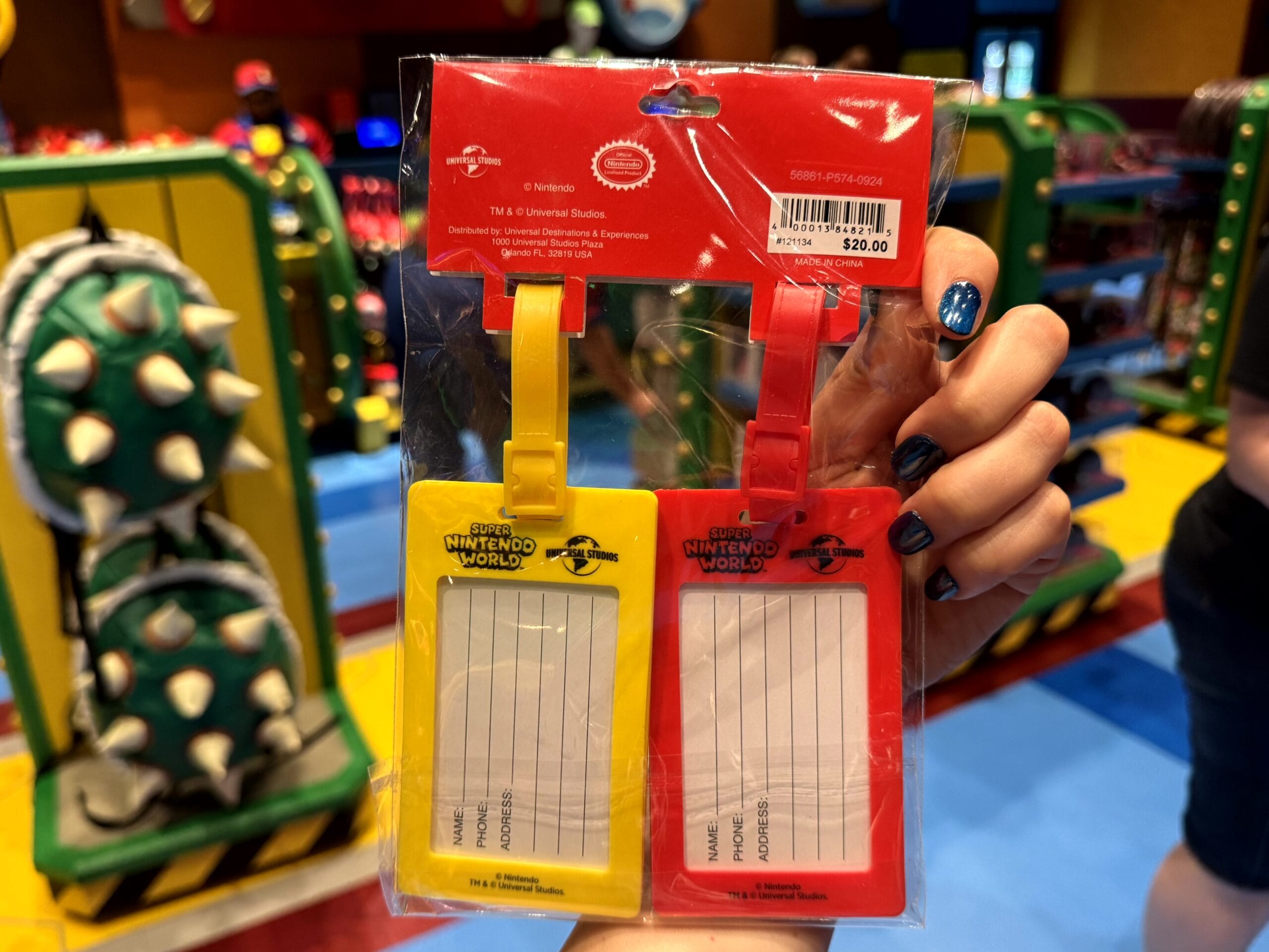 Another luggage tag is identical but the Super Nintendo World logo is against a red background instead of blue.