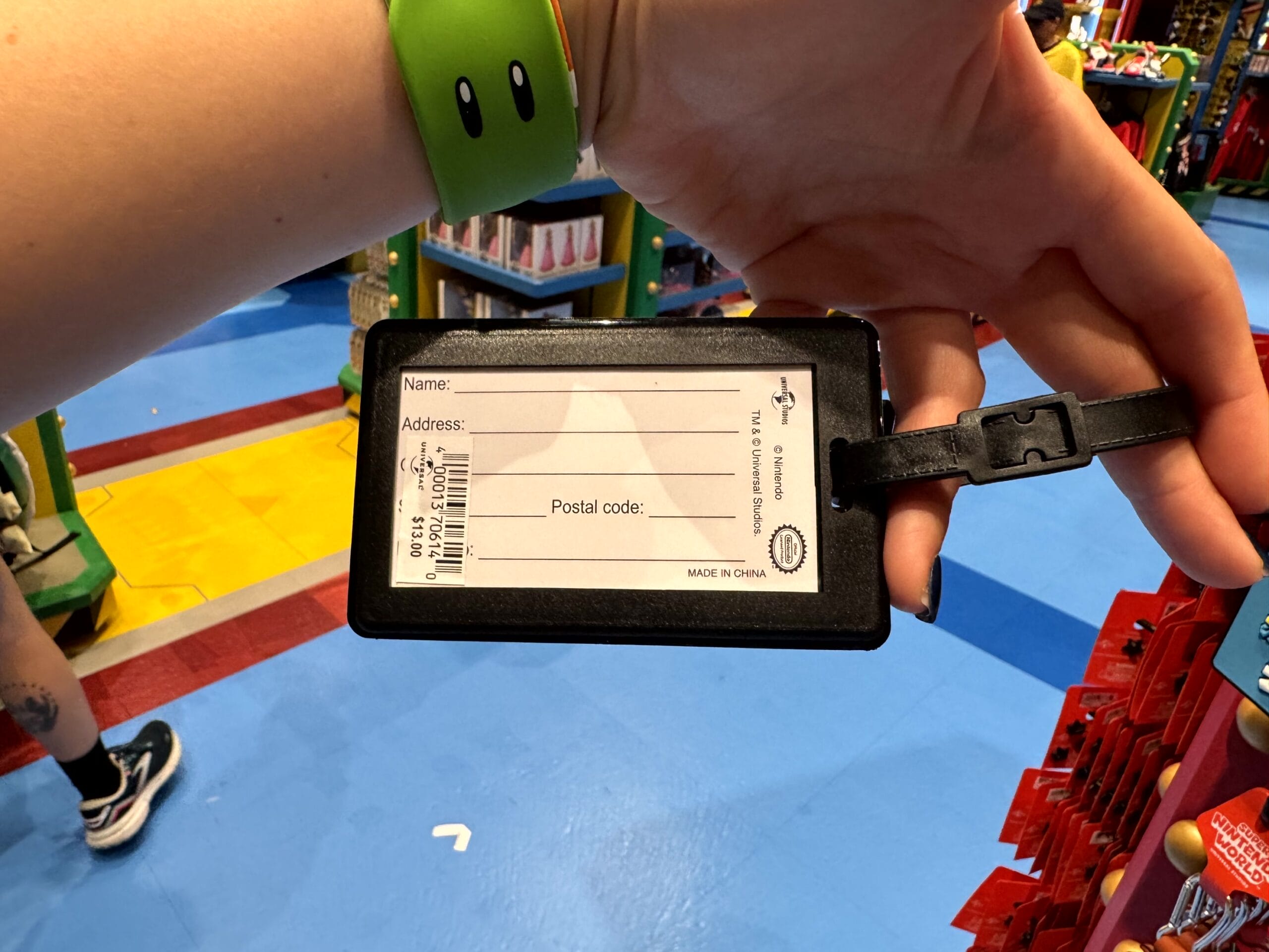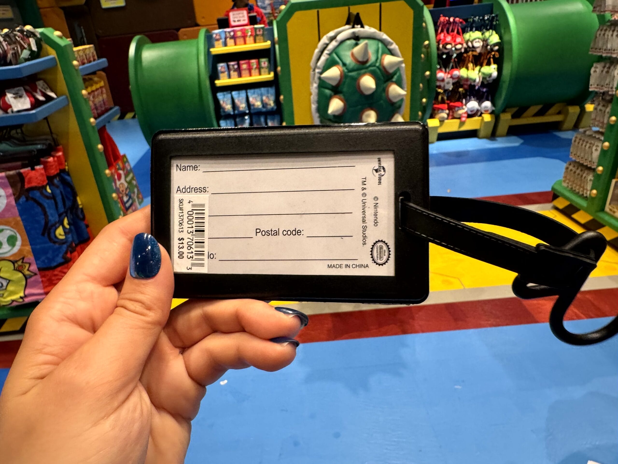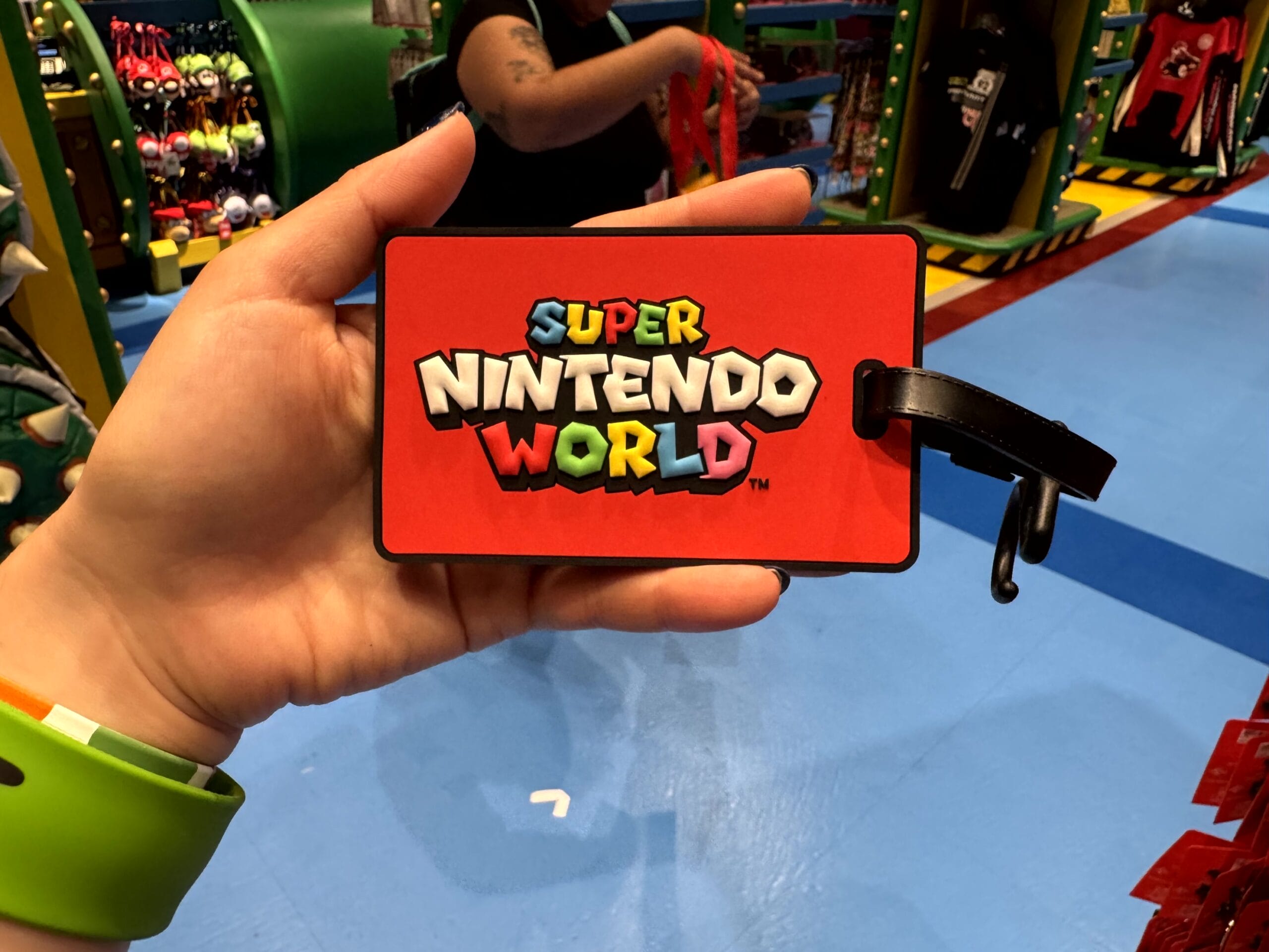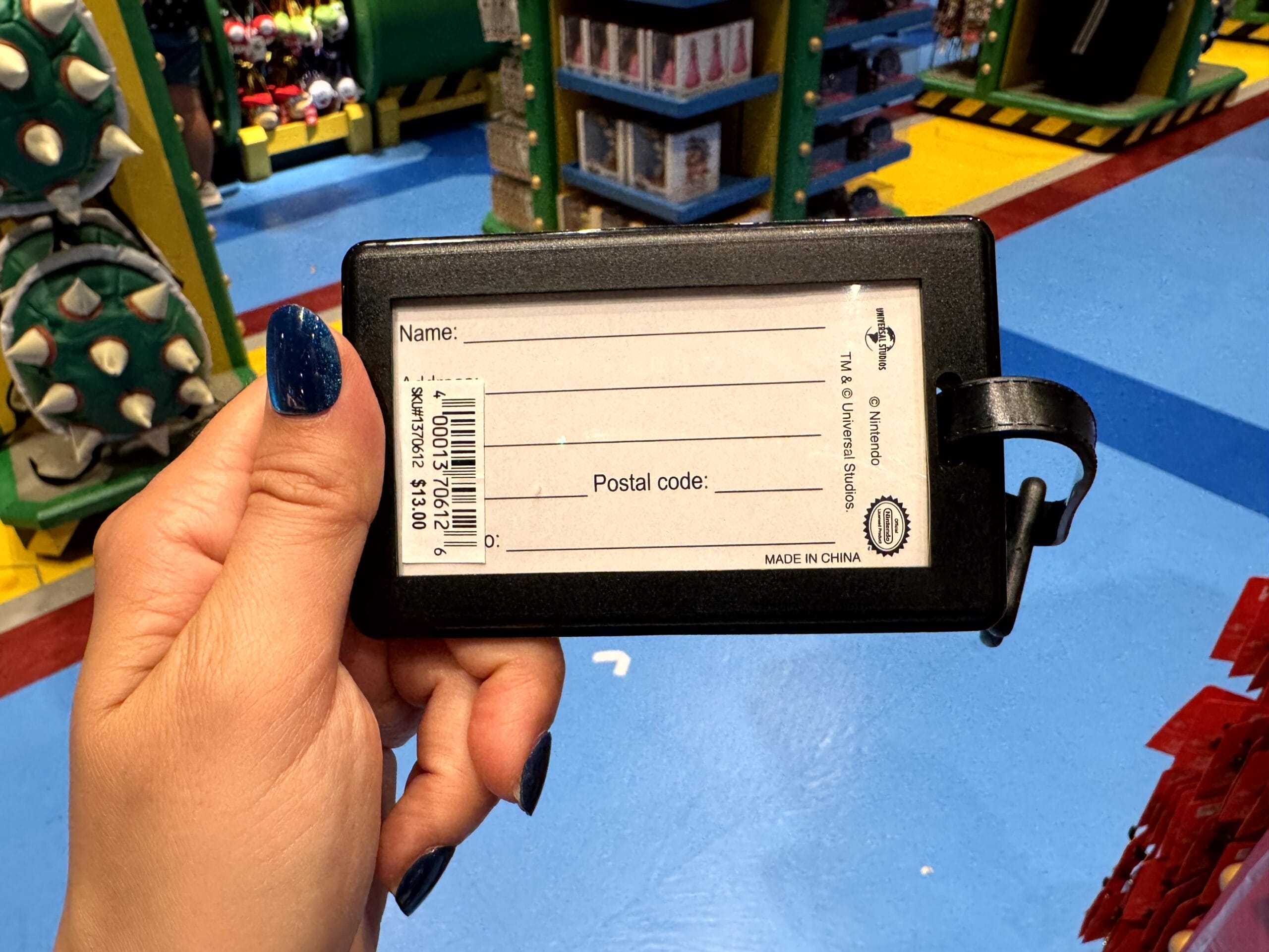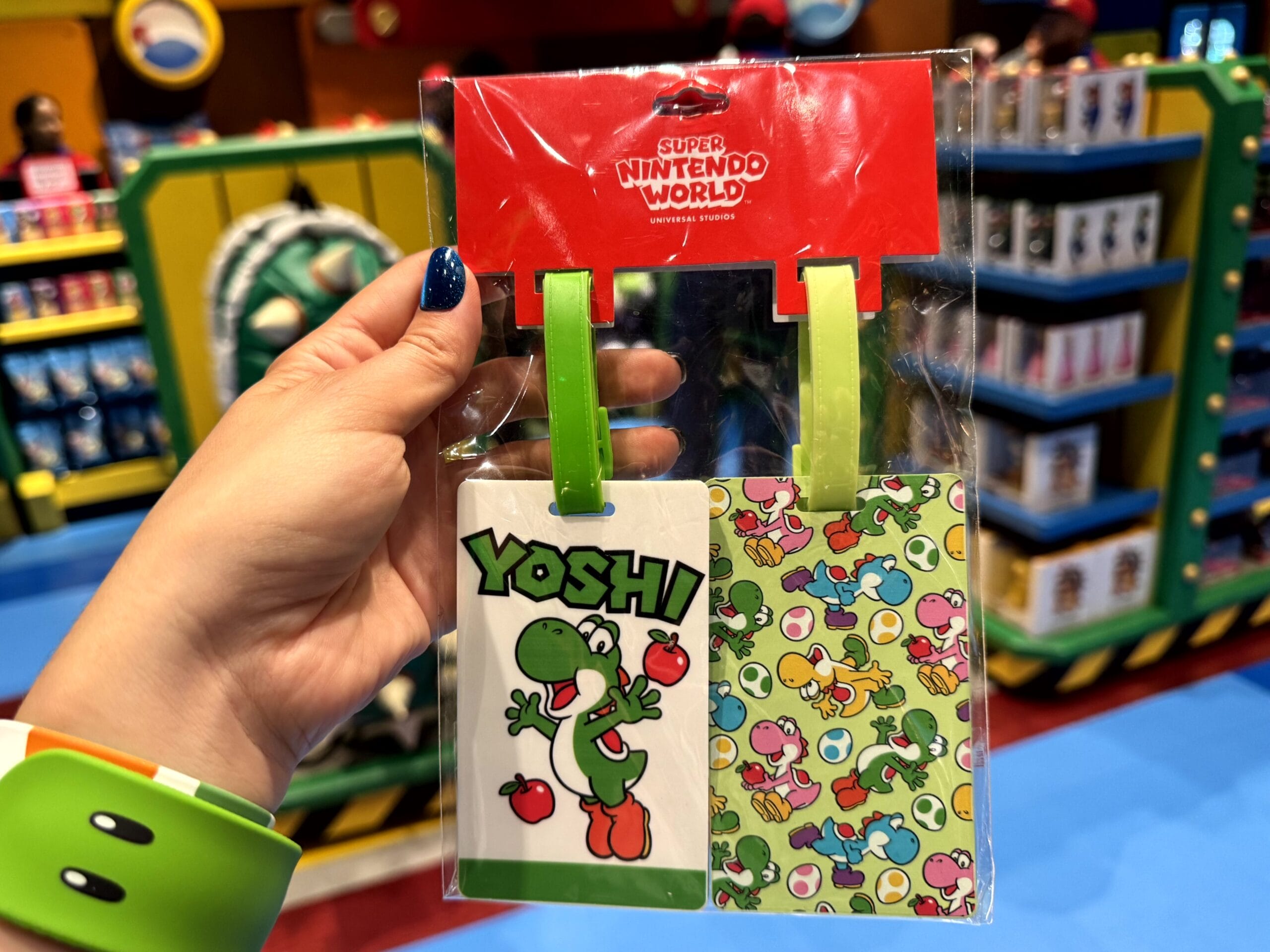 Another luggage tag is identical but the Super Nintendo World logo is against a red background instead of blue.