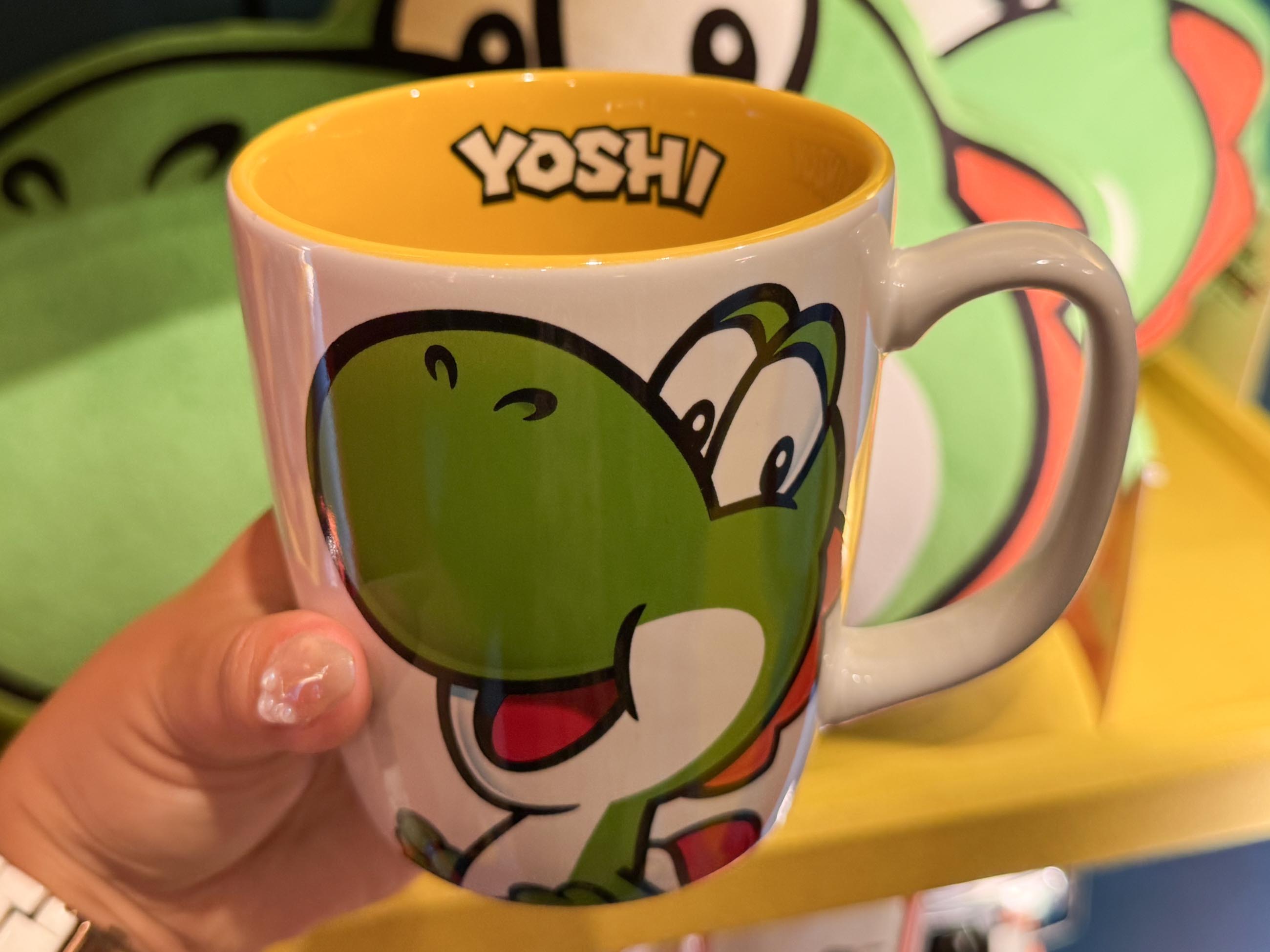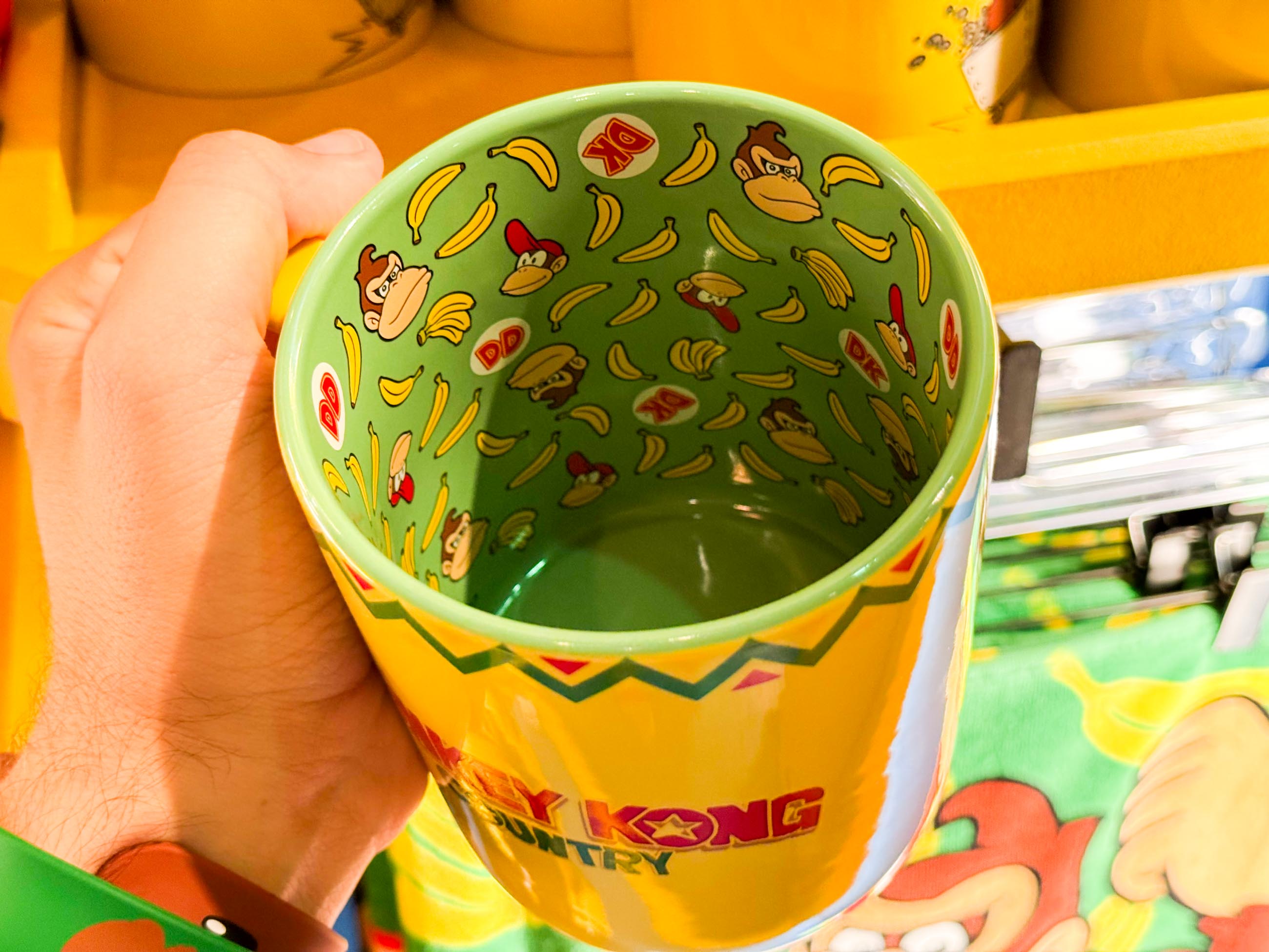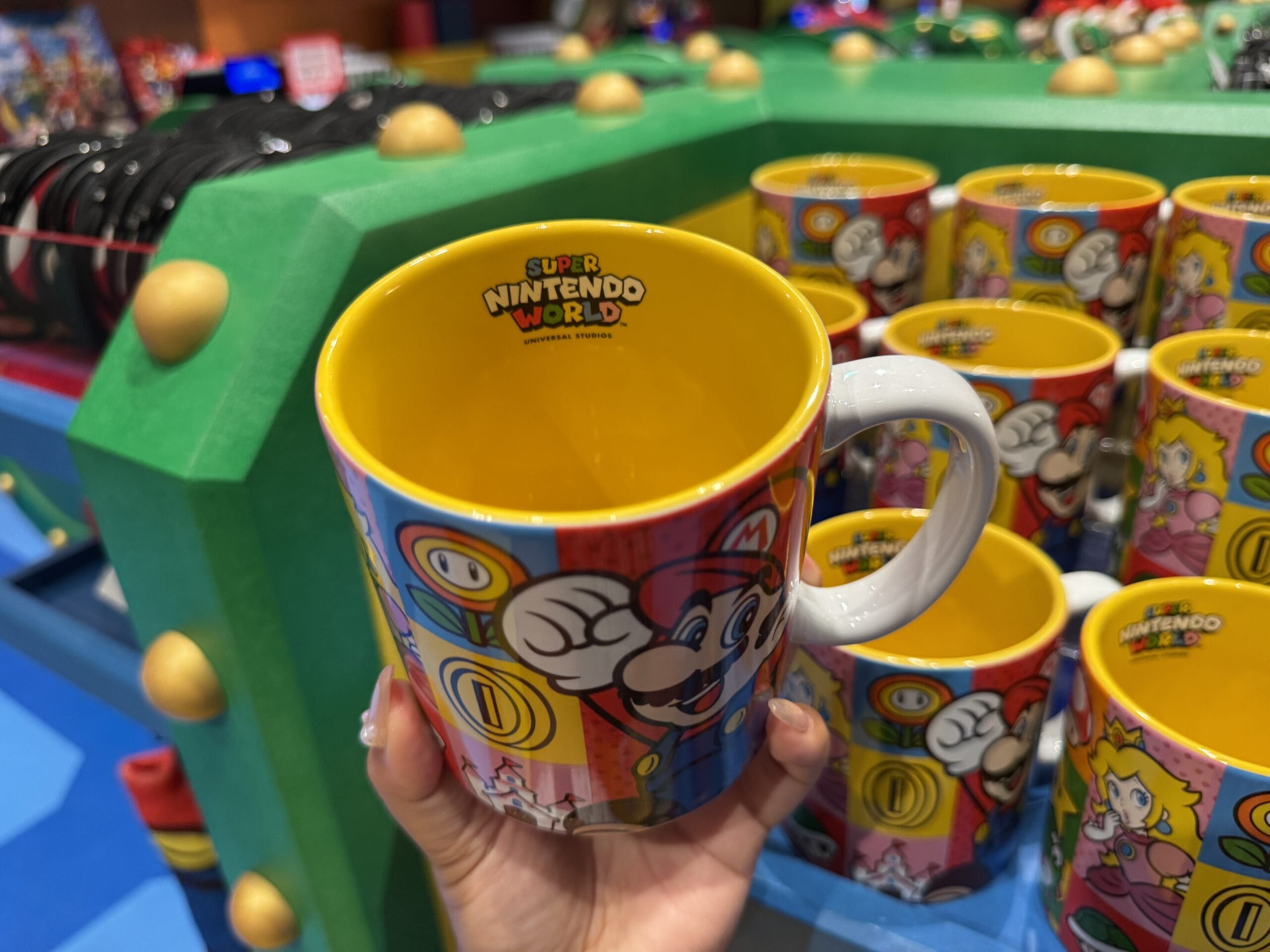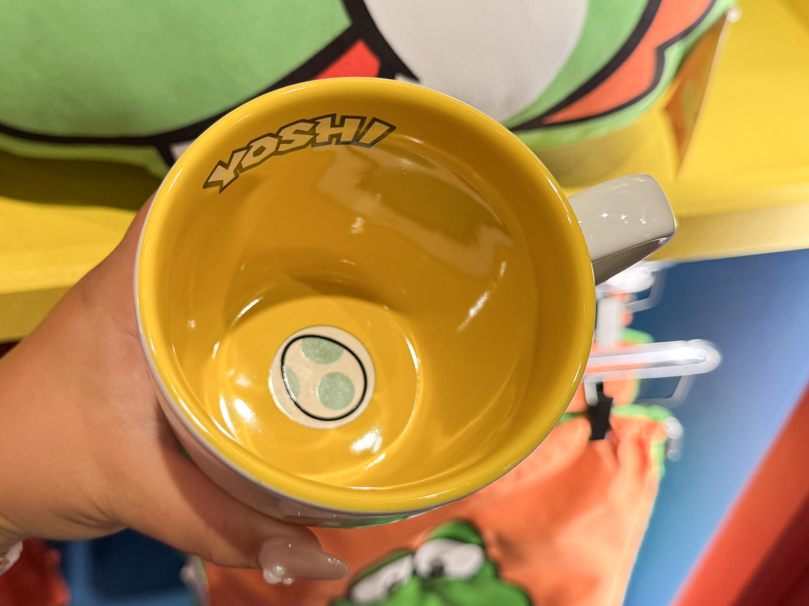 This mug has a color-block exterior featuring Super Nintendo World characters and icons. The handle is white. The interior is yellow with the Super Nintendo World logo on the rim.