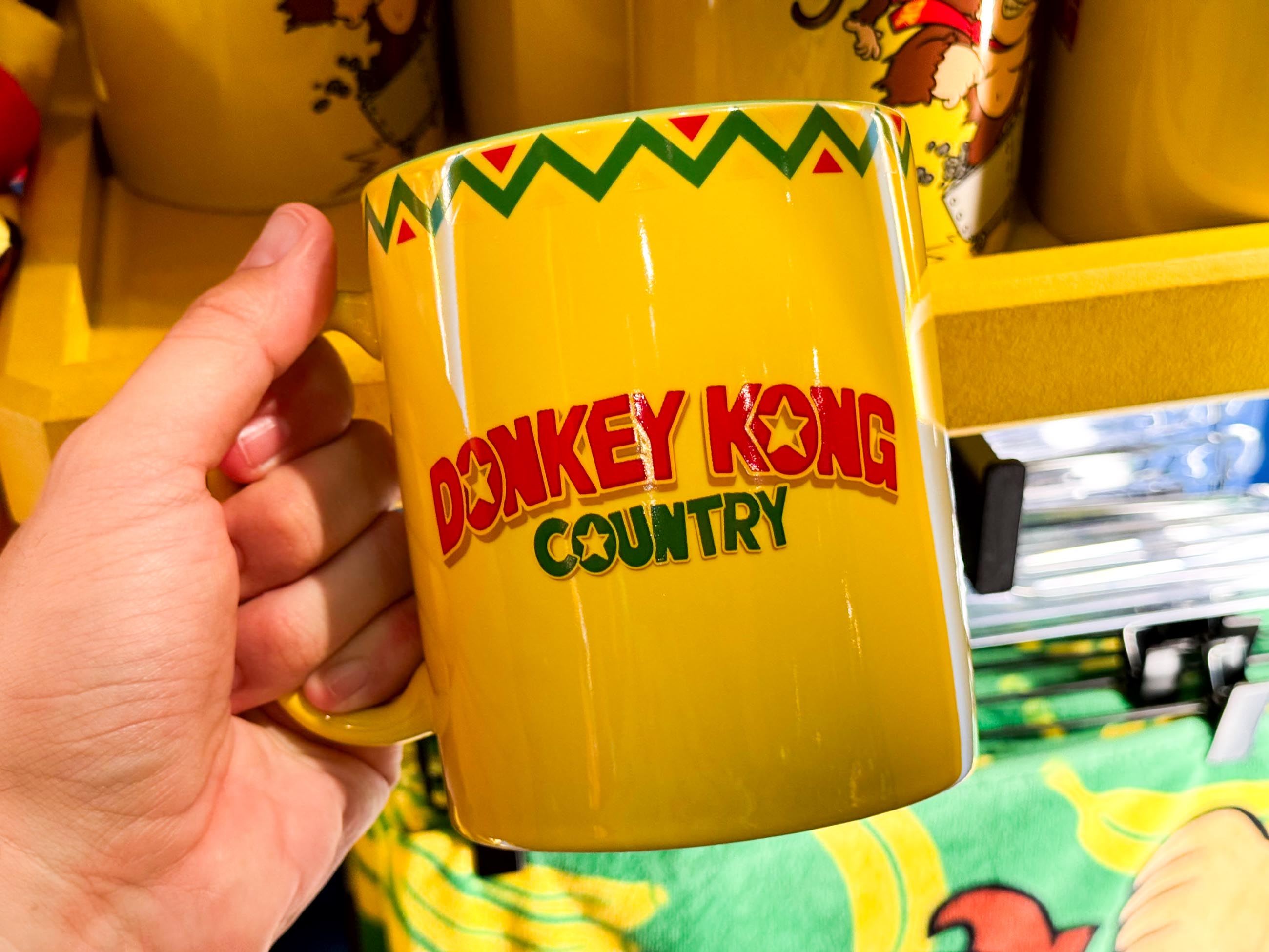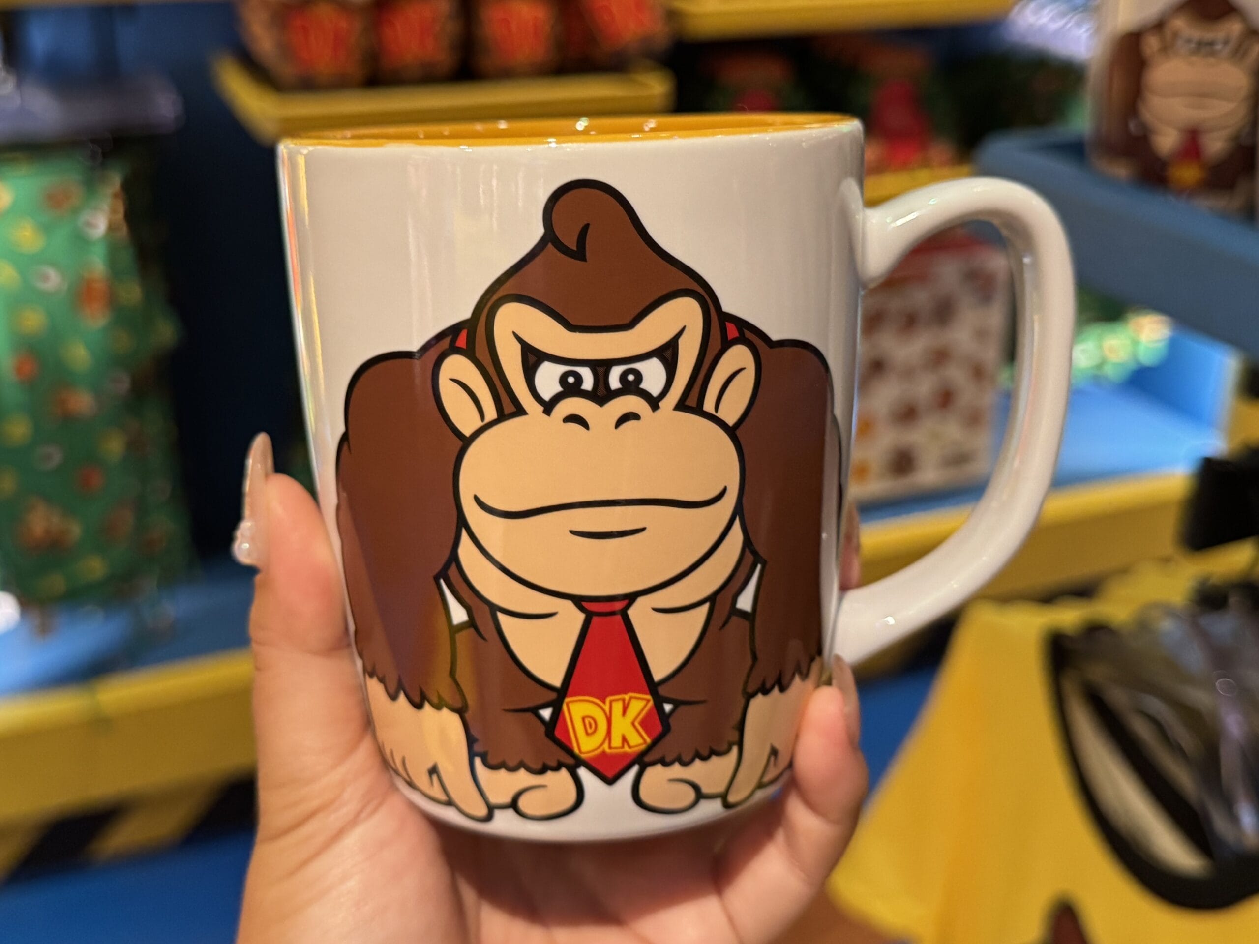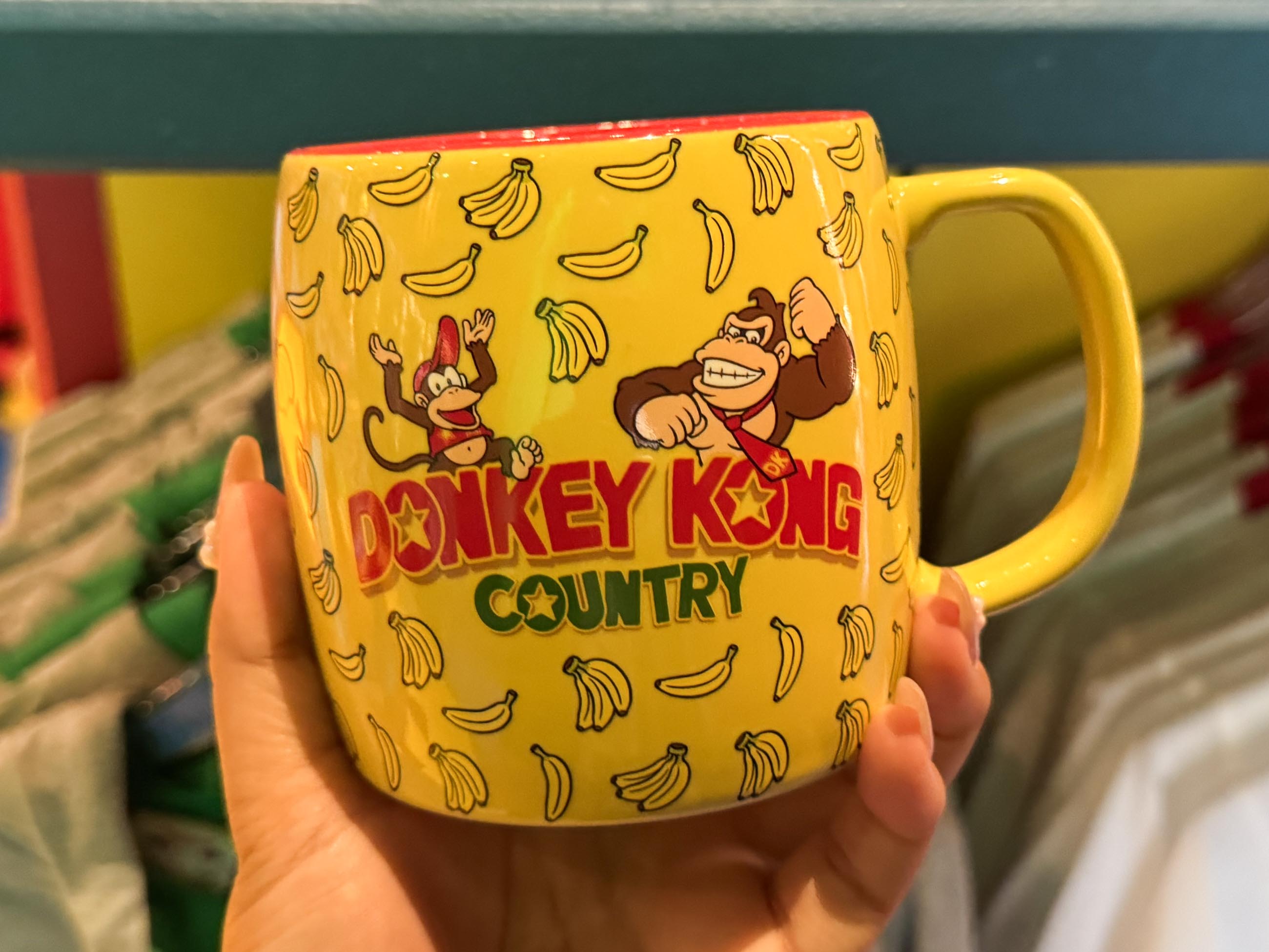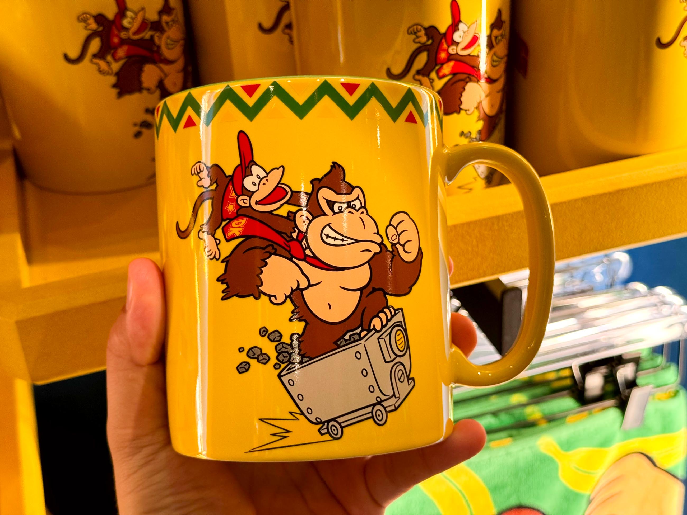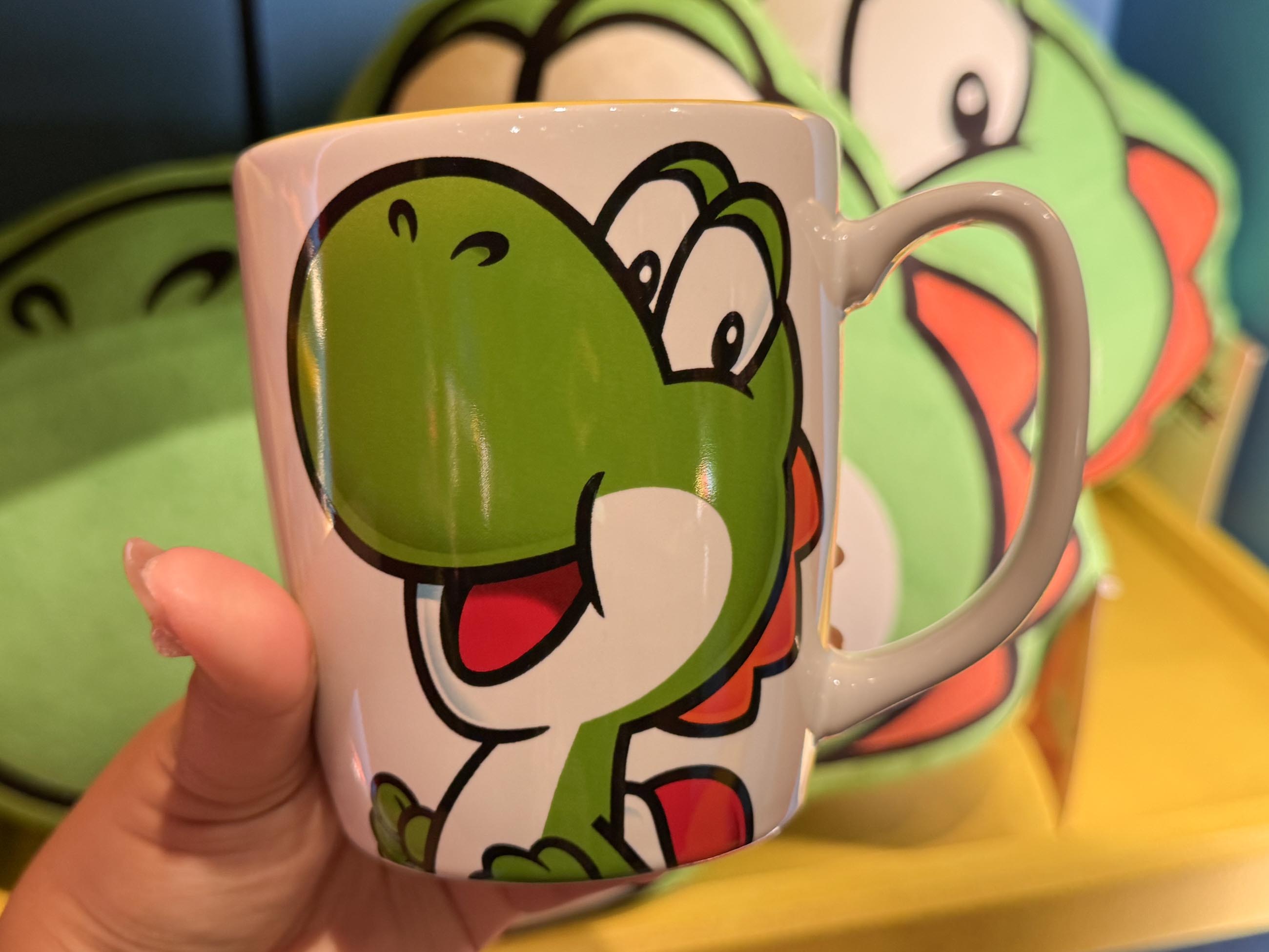 This mug has a color-block exterior featuring Super Nintendo World characters and icons. The handle is white. The interior is yellow with the Super Nintendo World logo on the rim.