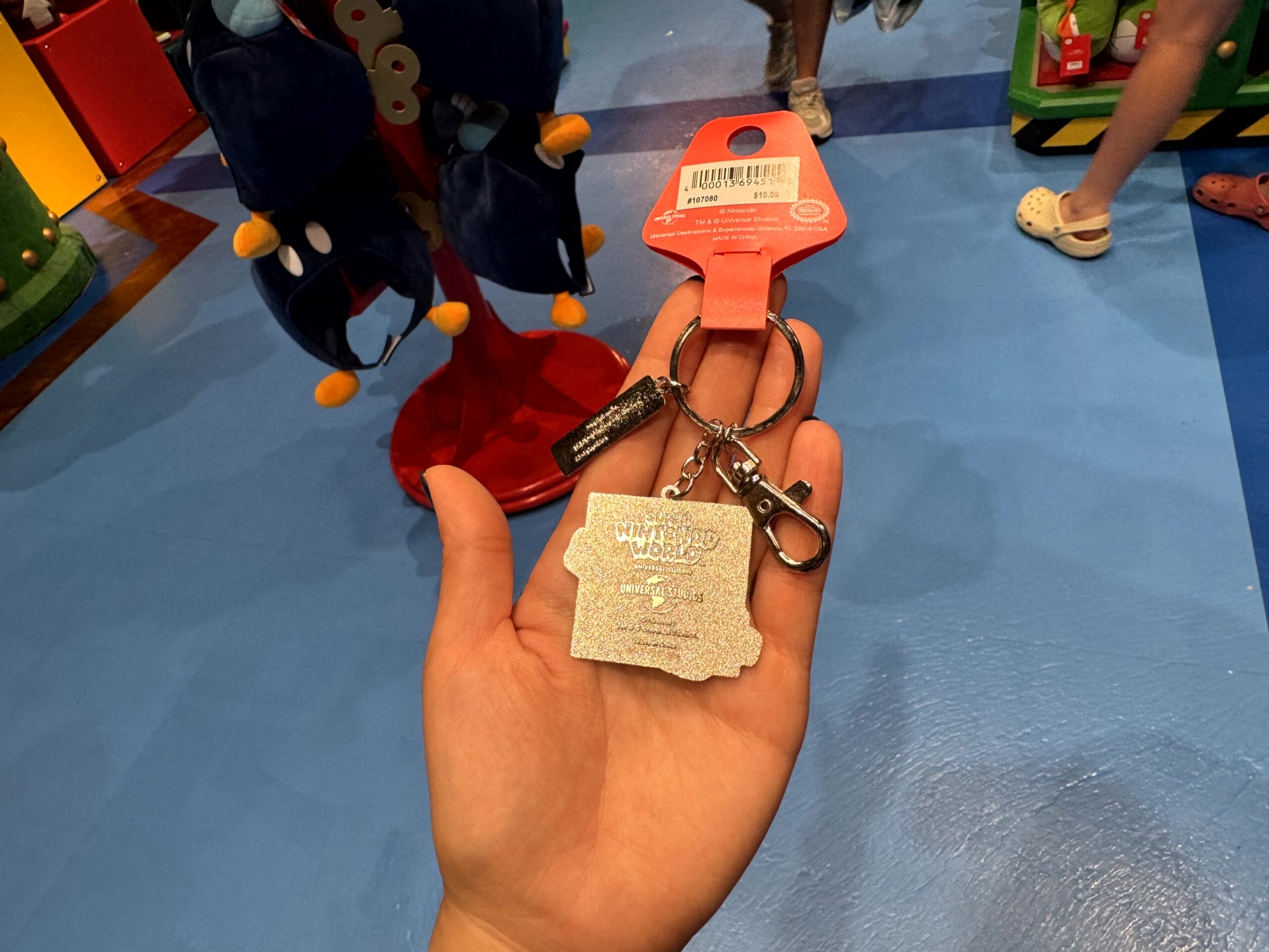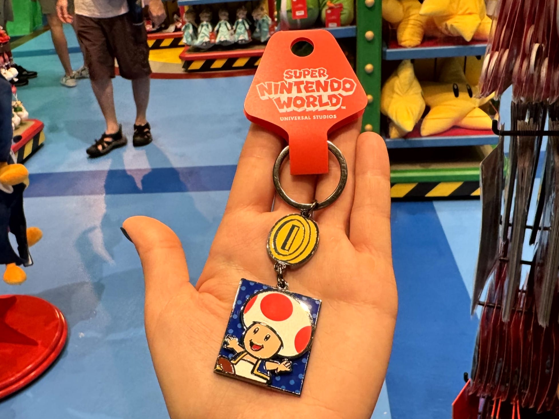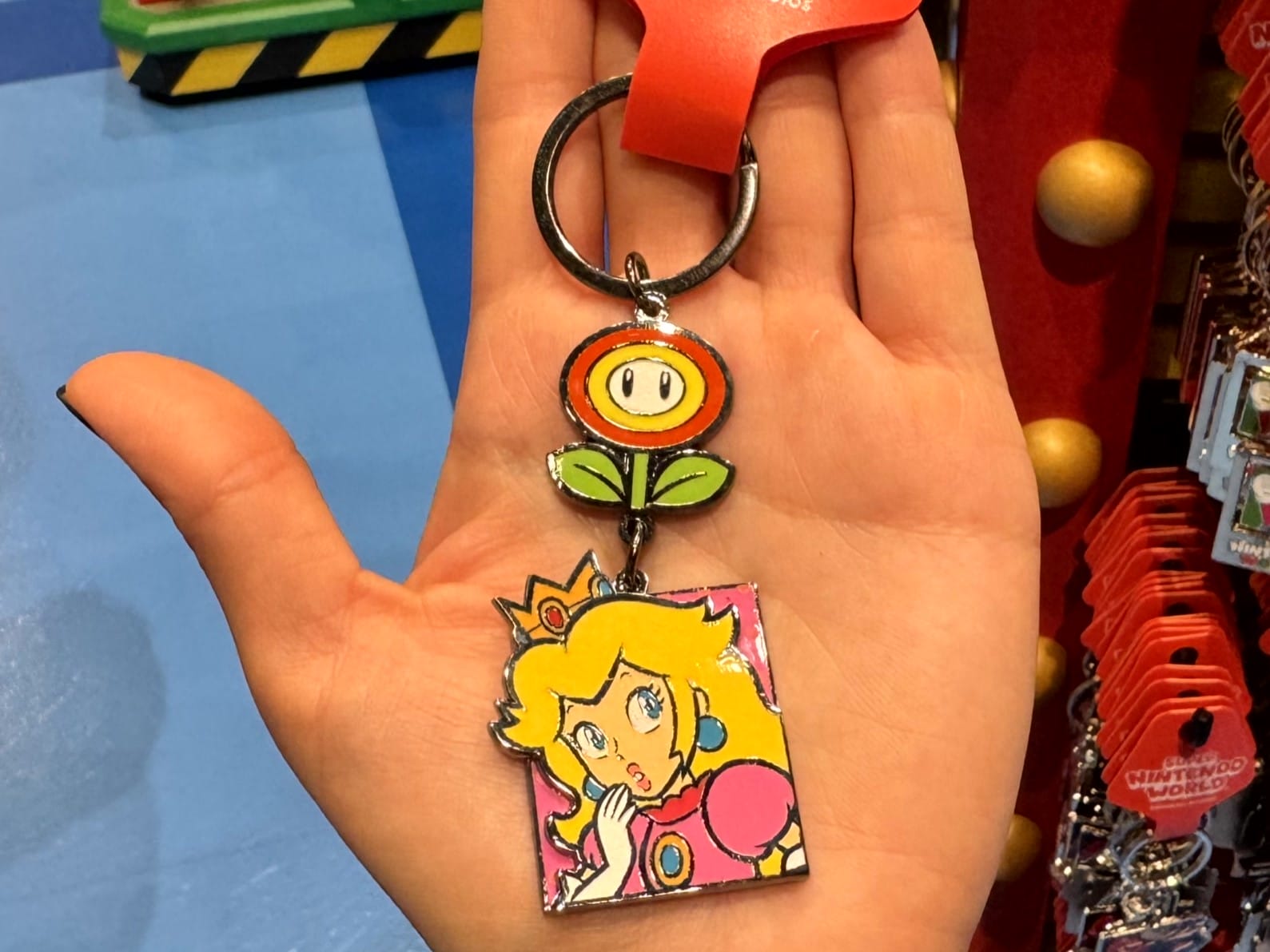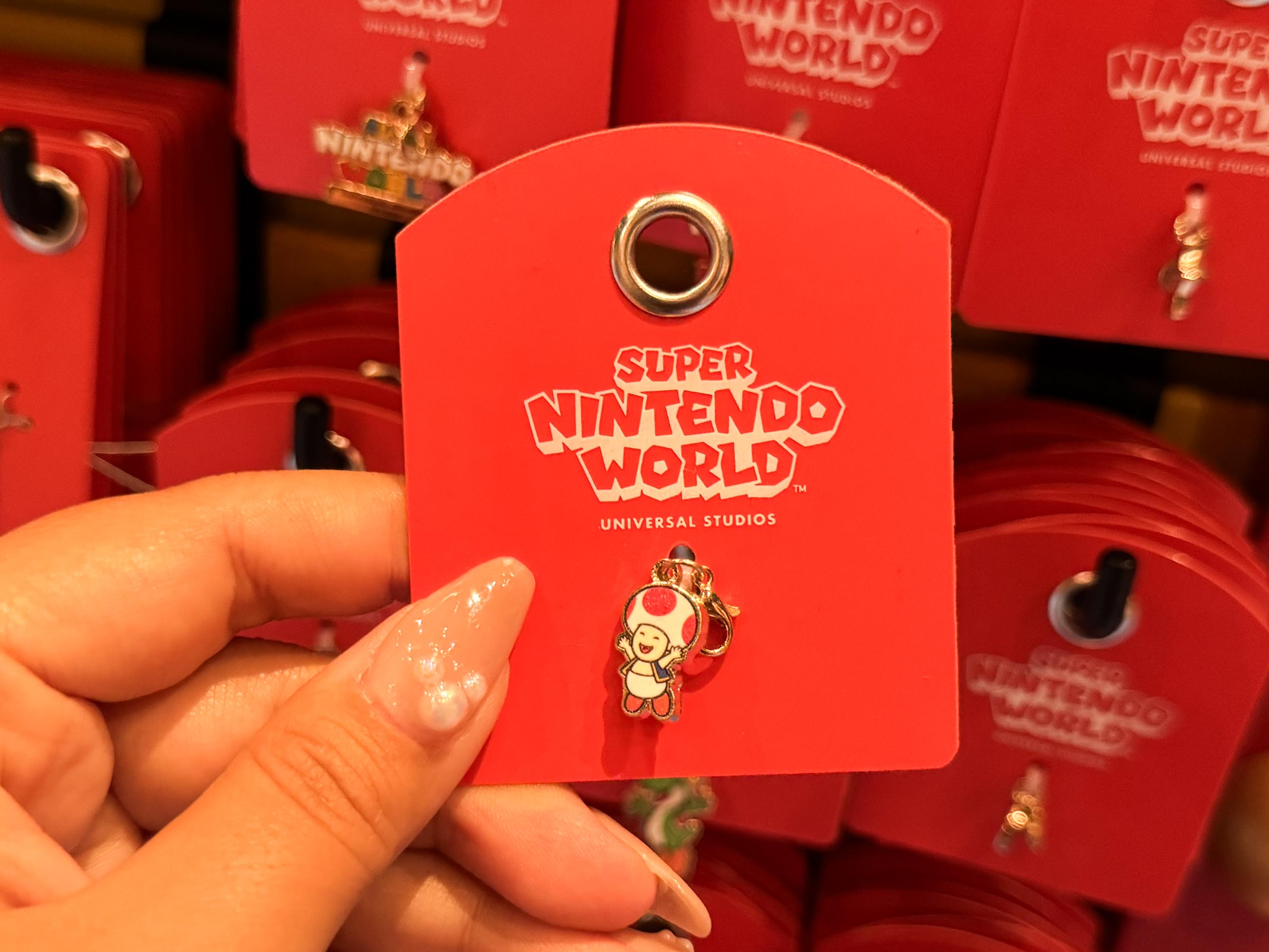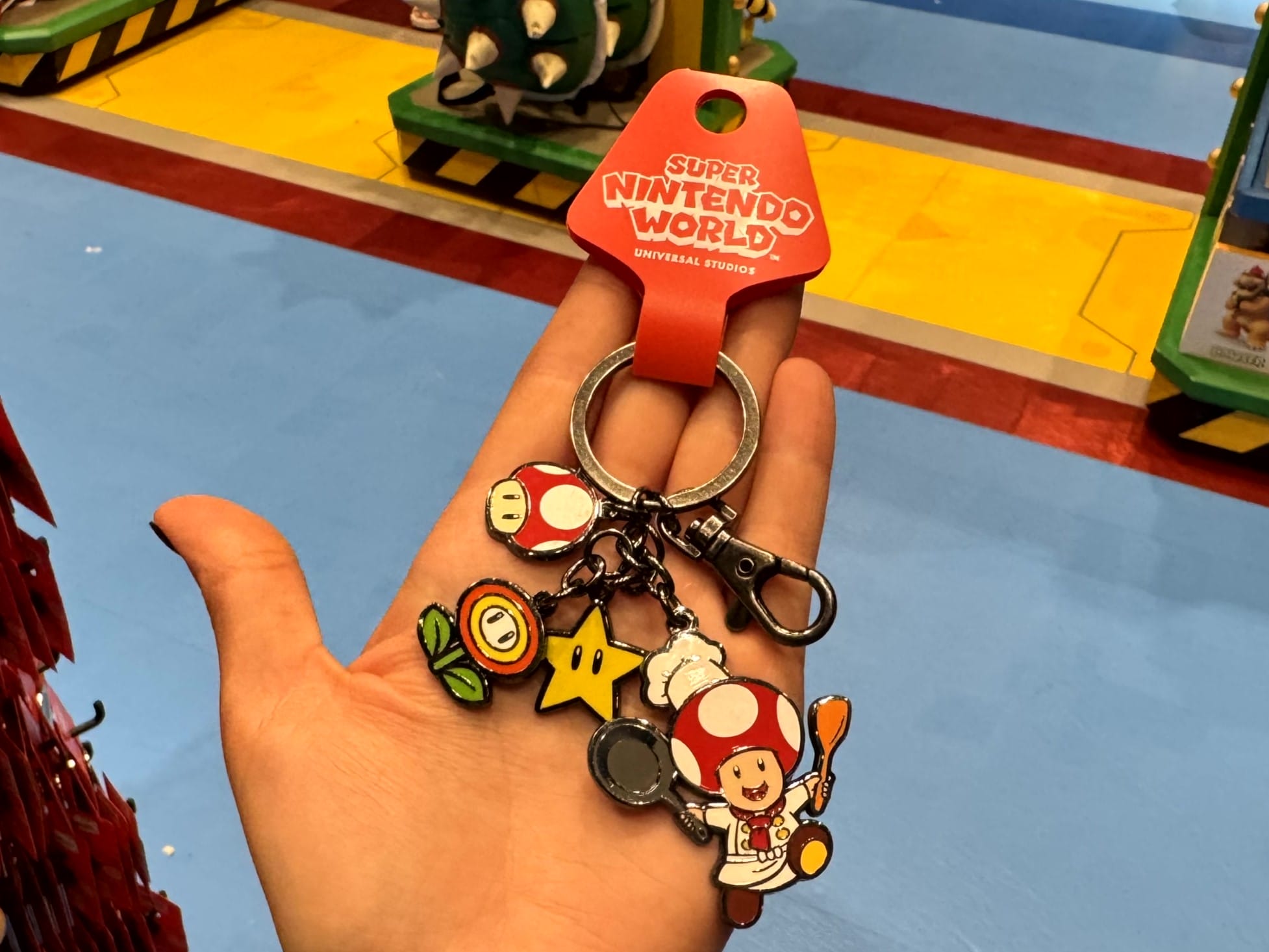 Another keychain has a Chef Toad charm, mushroom charm, Fire Flower charm, and Super Star charm.