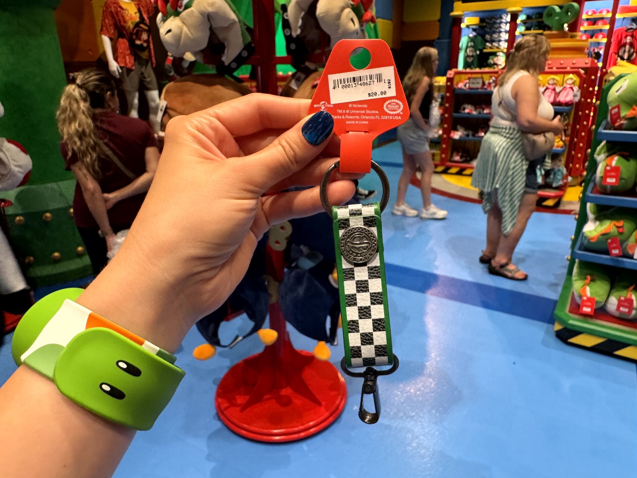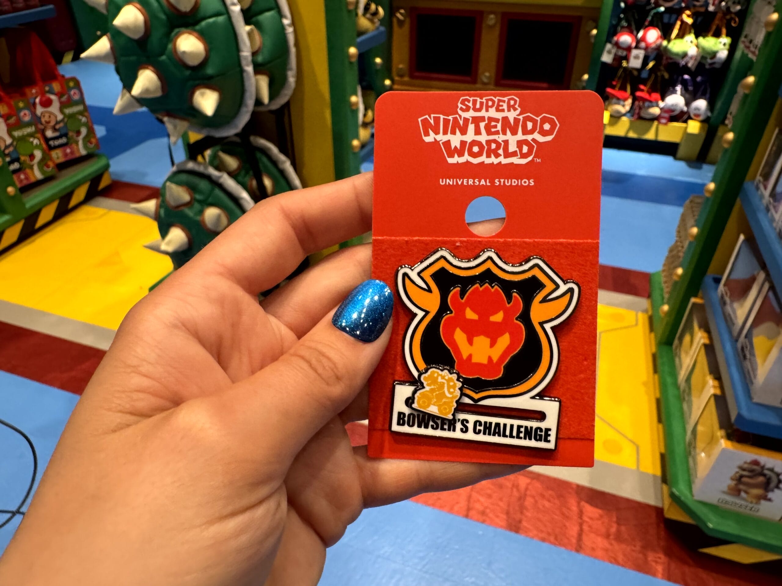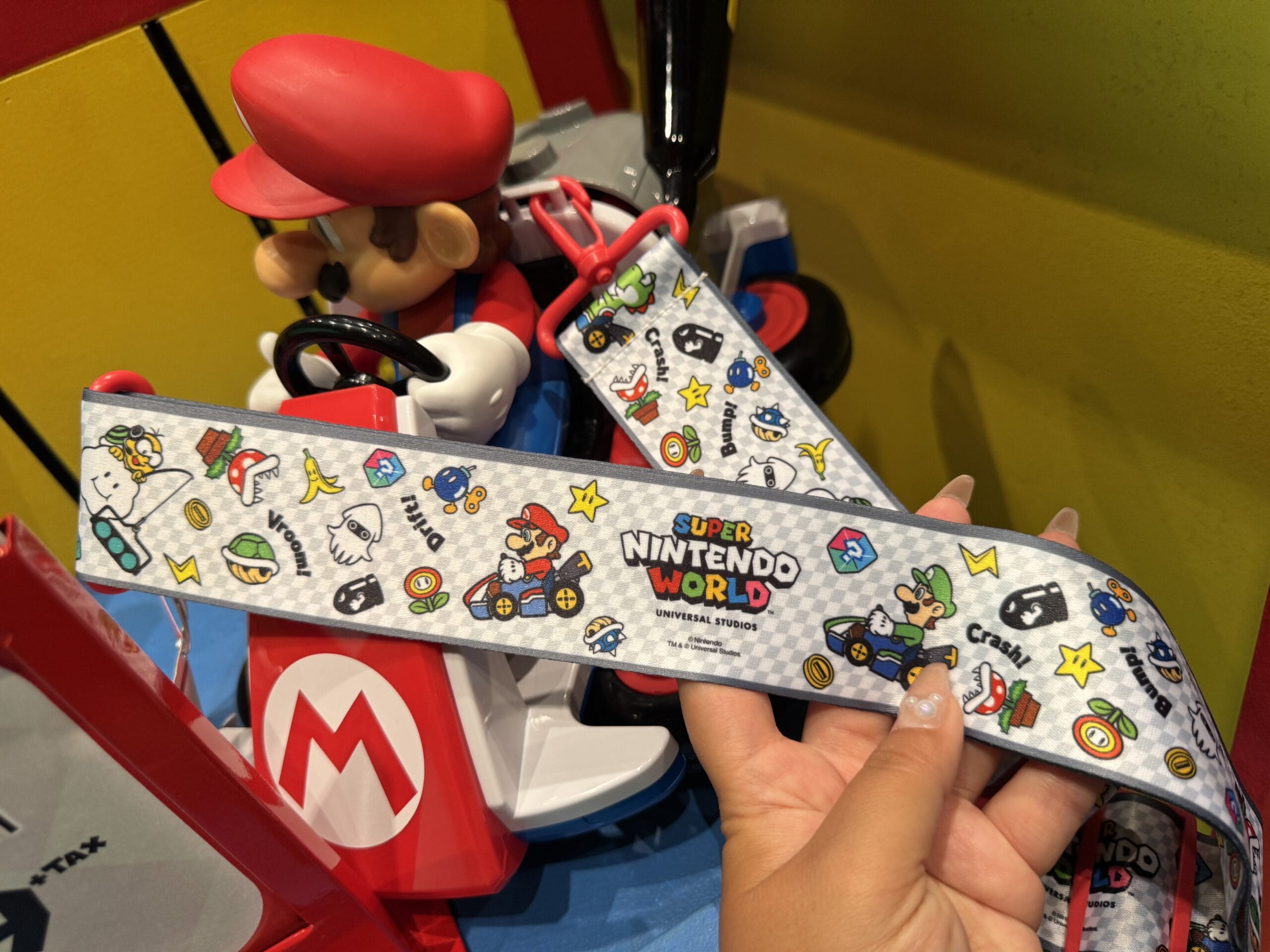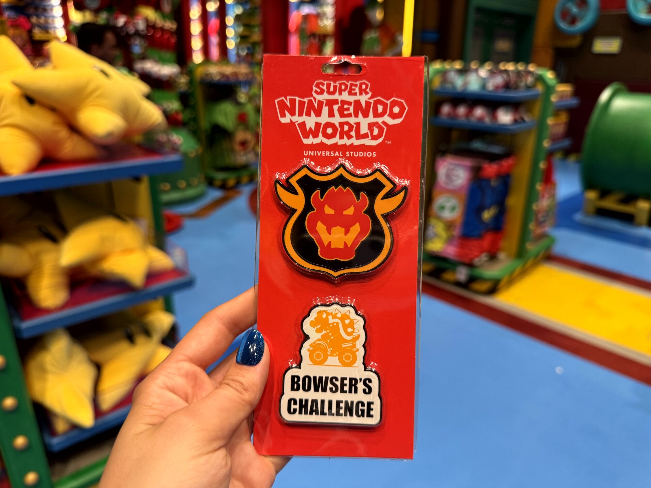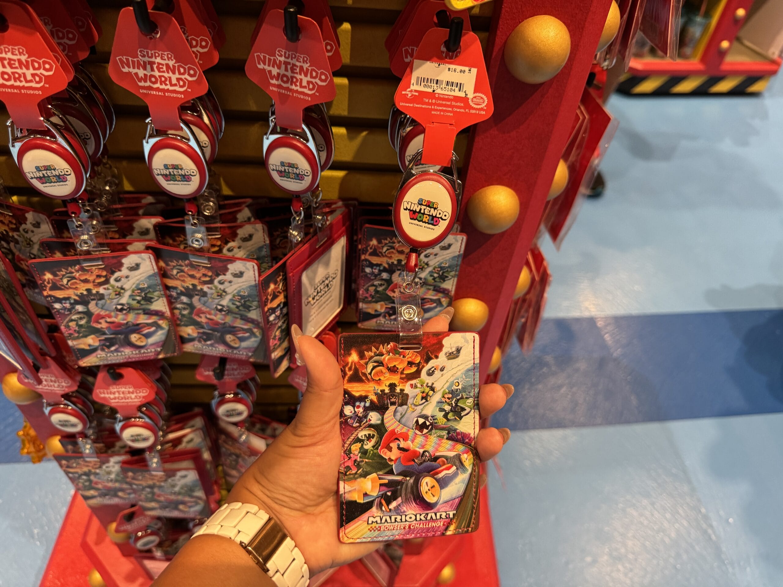The badge holder has artwork of Mario and his friends racing on Rainbow Road. Bowser is in the background with his castle. “Mario Kart: Bowser’s Challenge” is at the bottom of the art. The Super Nintendo World logo is on the retractable clip.