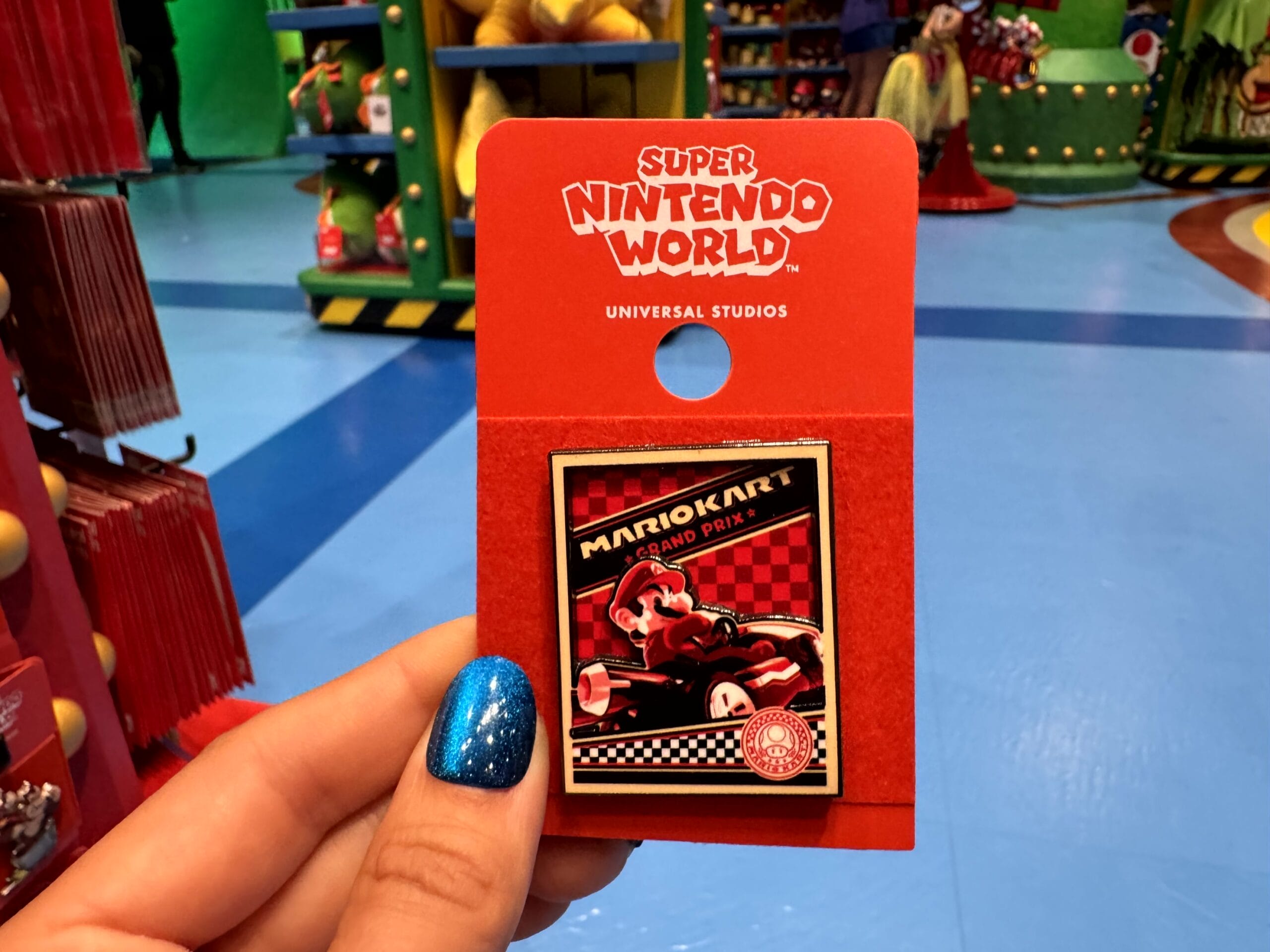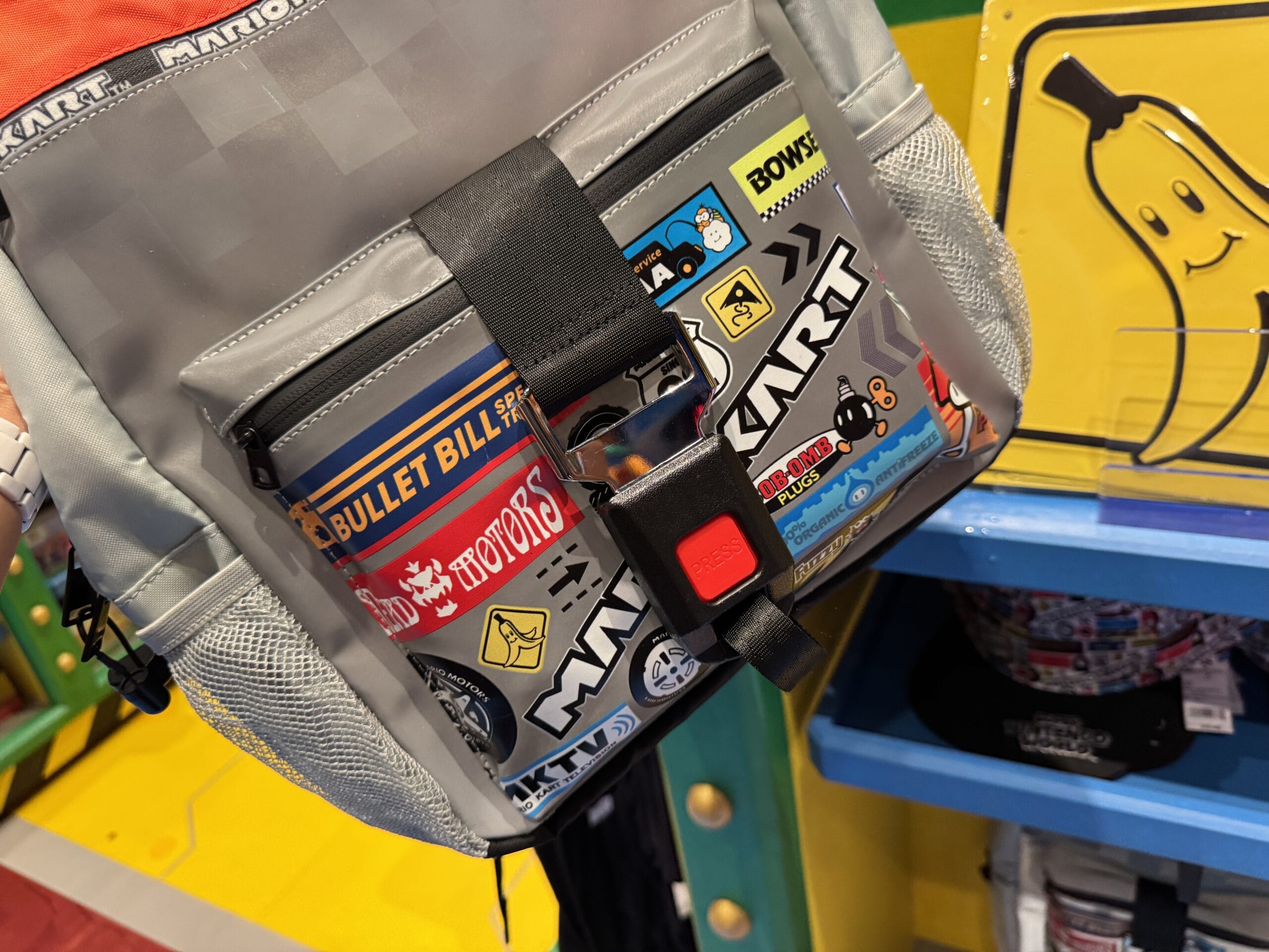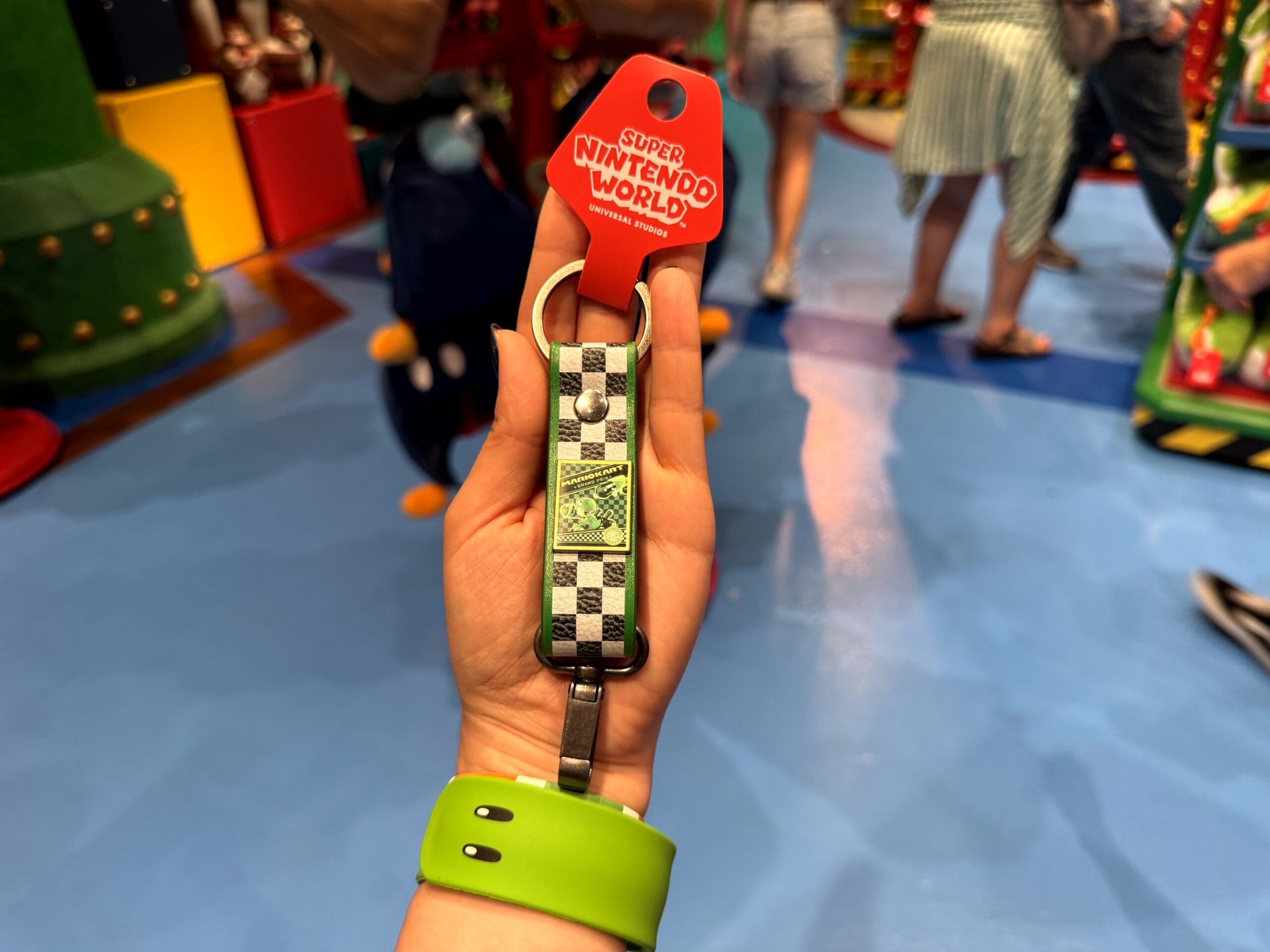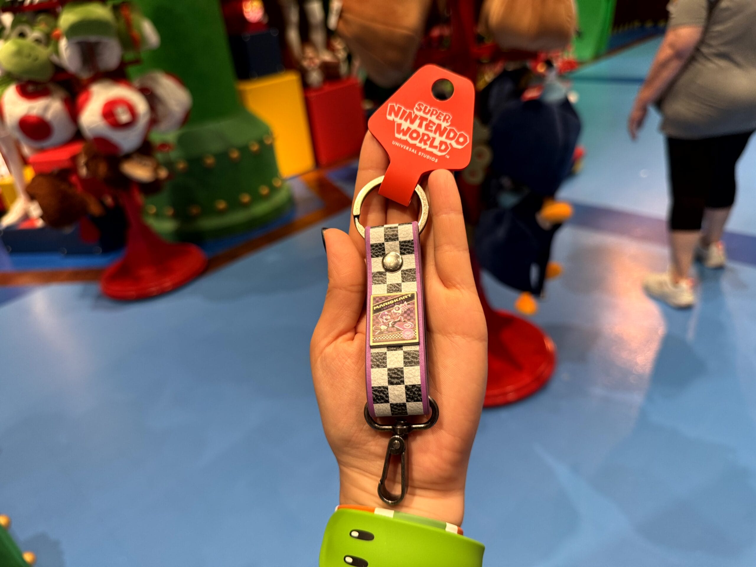 The badge holder has artwork of Mario and his friends racing on Rainbow Road. Bowser is in the background with his castle. “Mario Kart: Bowser’s Challenge” is at the bottom of the art. The Super Nintendo World logo is on the retractable clip.