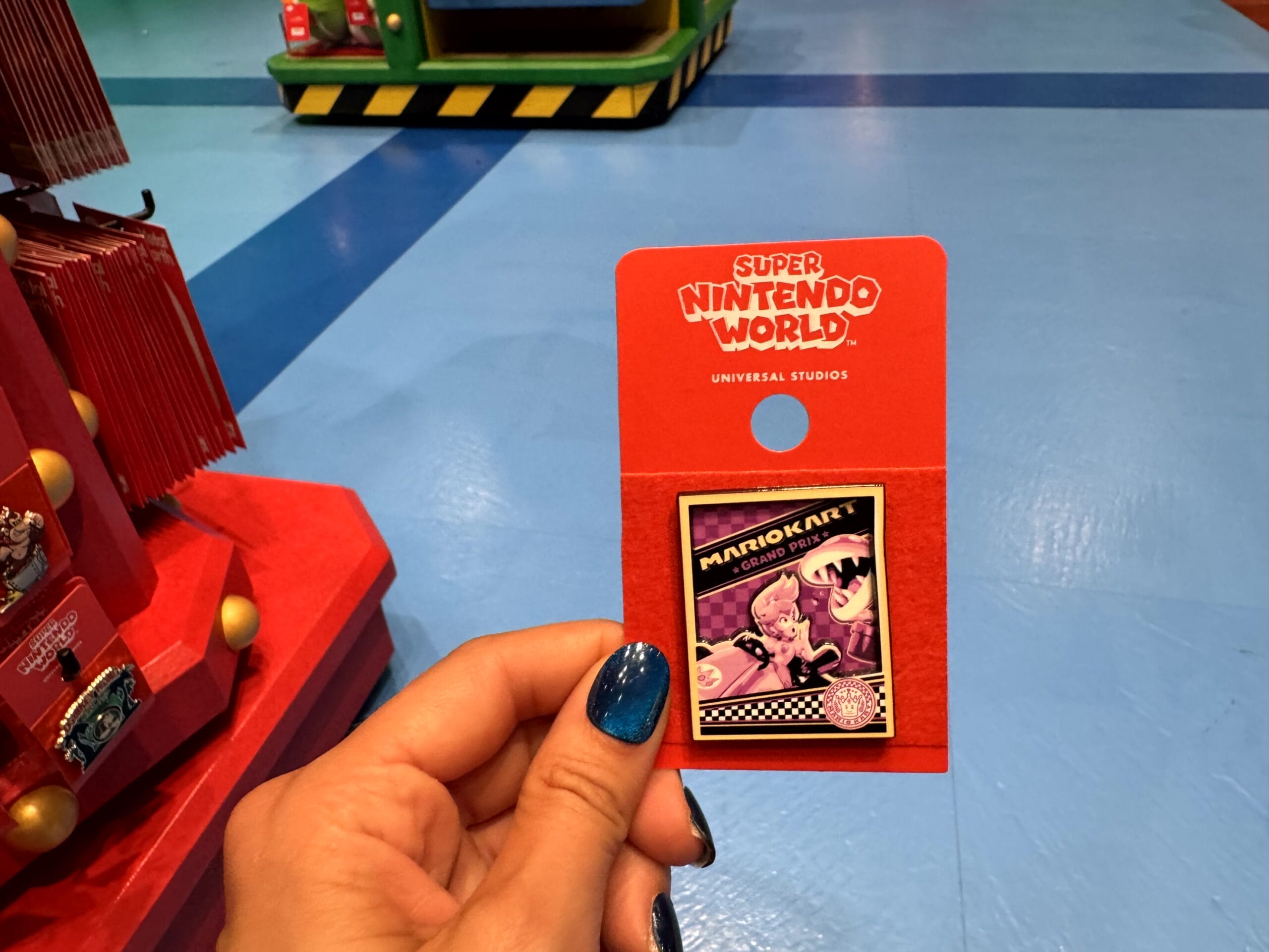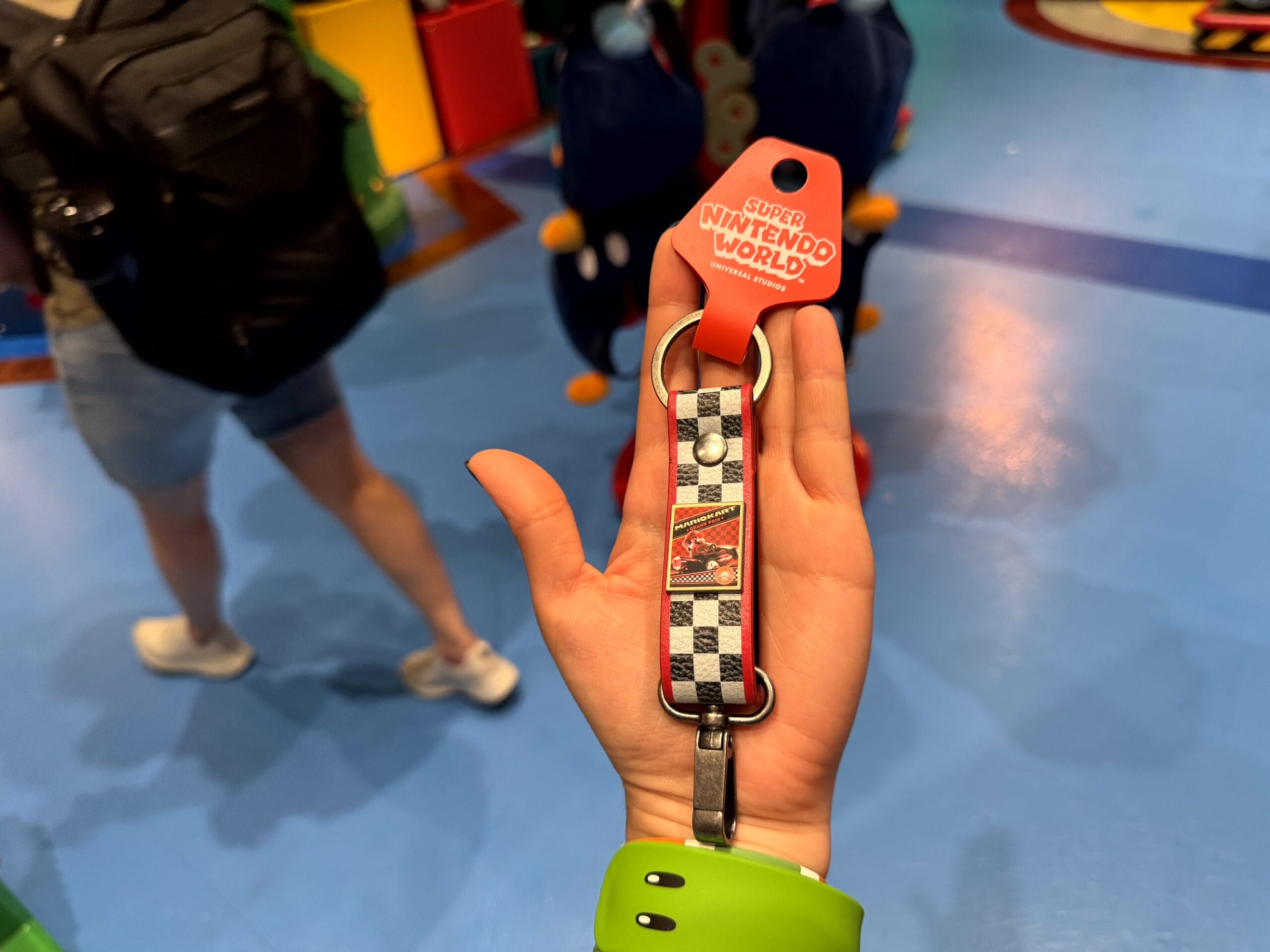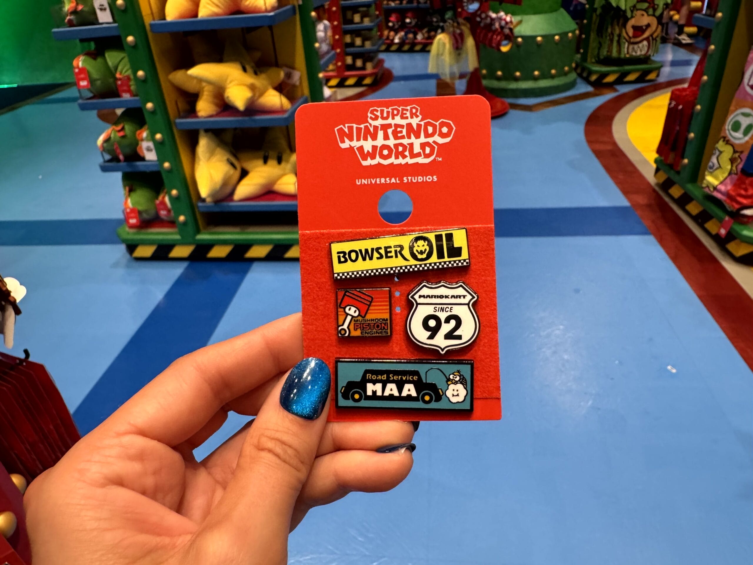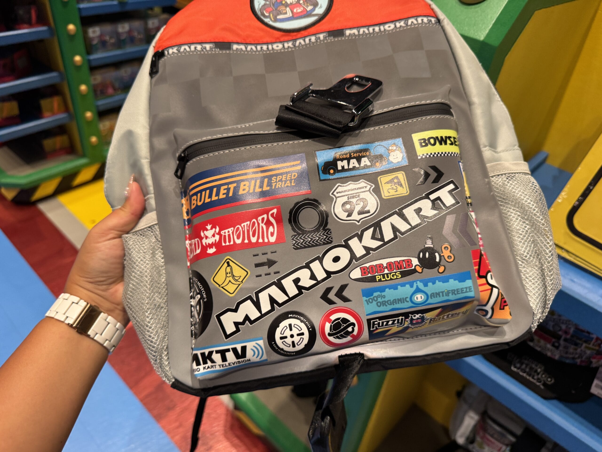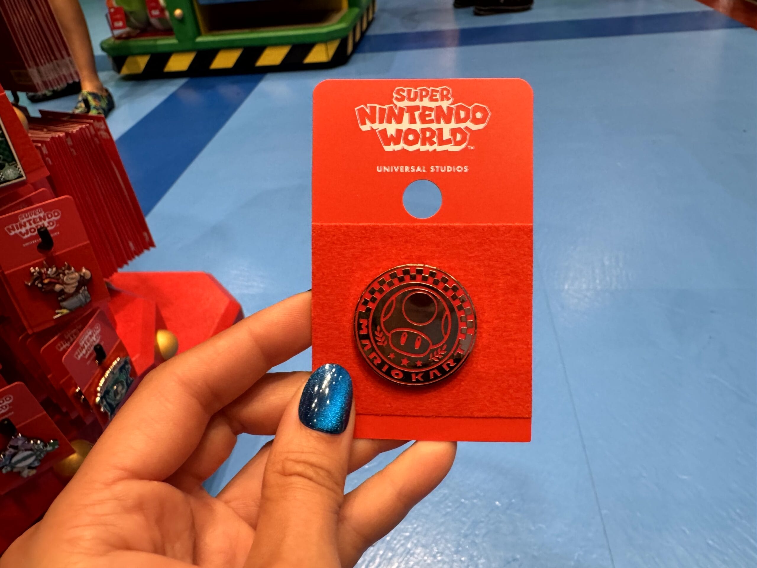 The badge holder has artwork of Mario and his friends racing on Rainbow Road. Bowser is in the background with his castle. “Mario Kart: Bowser’s Challenge” is at the bottom of the art. The Super Nintendo World logo is on the retractable clip.