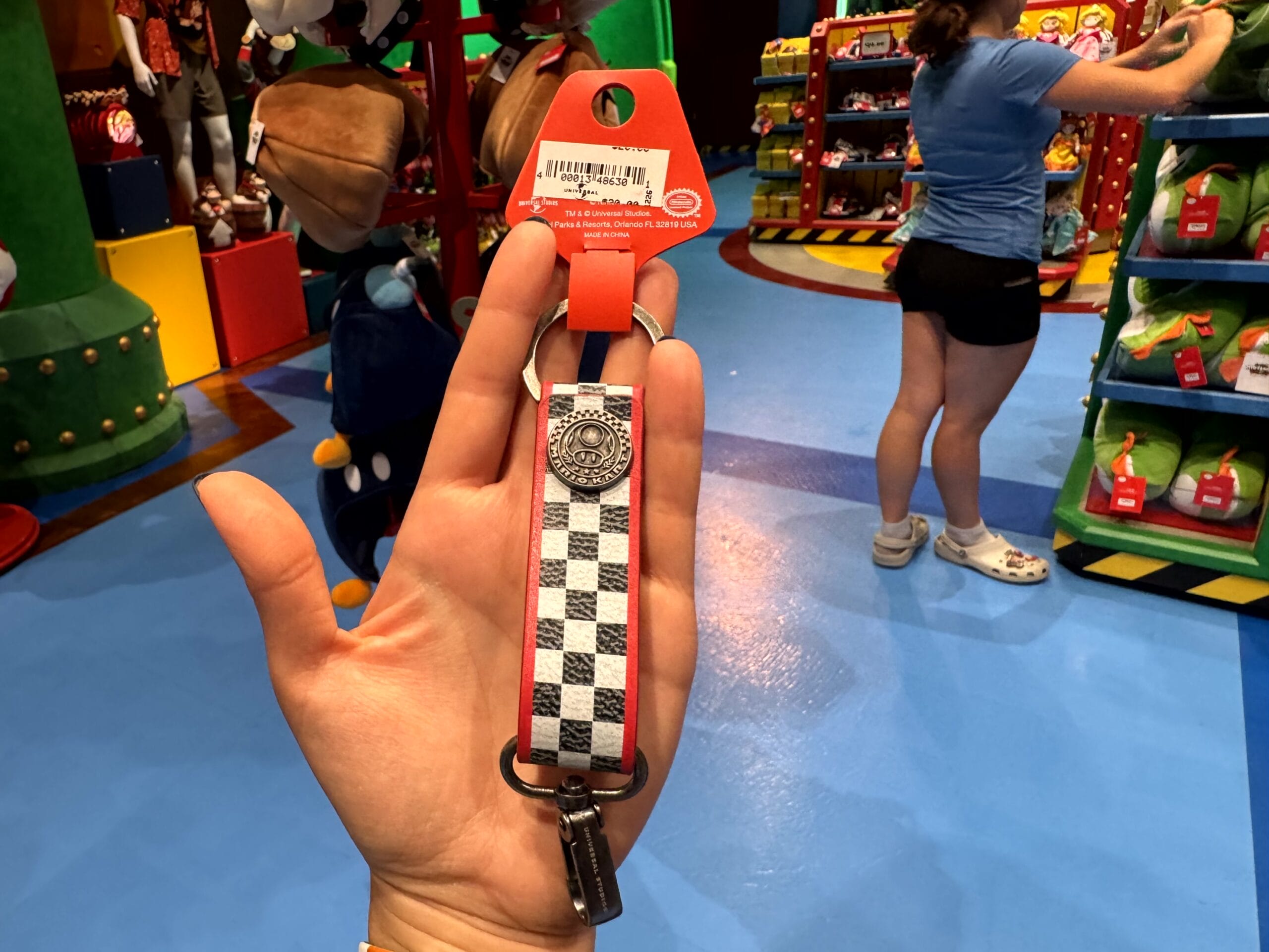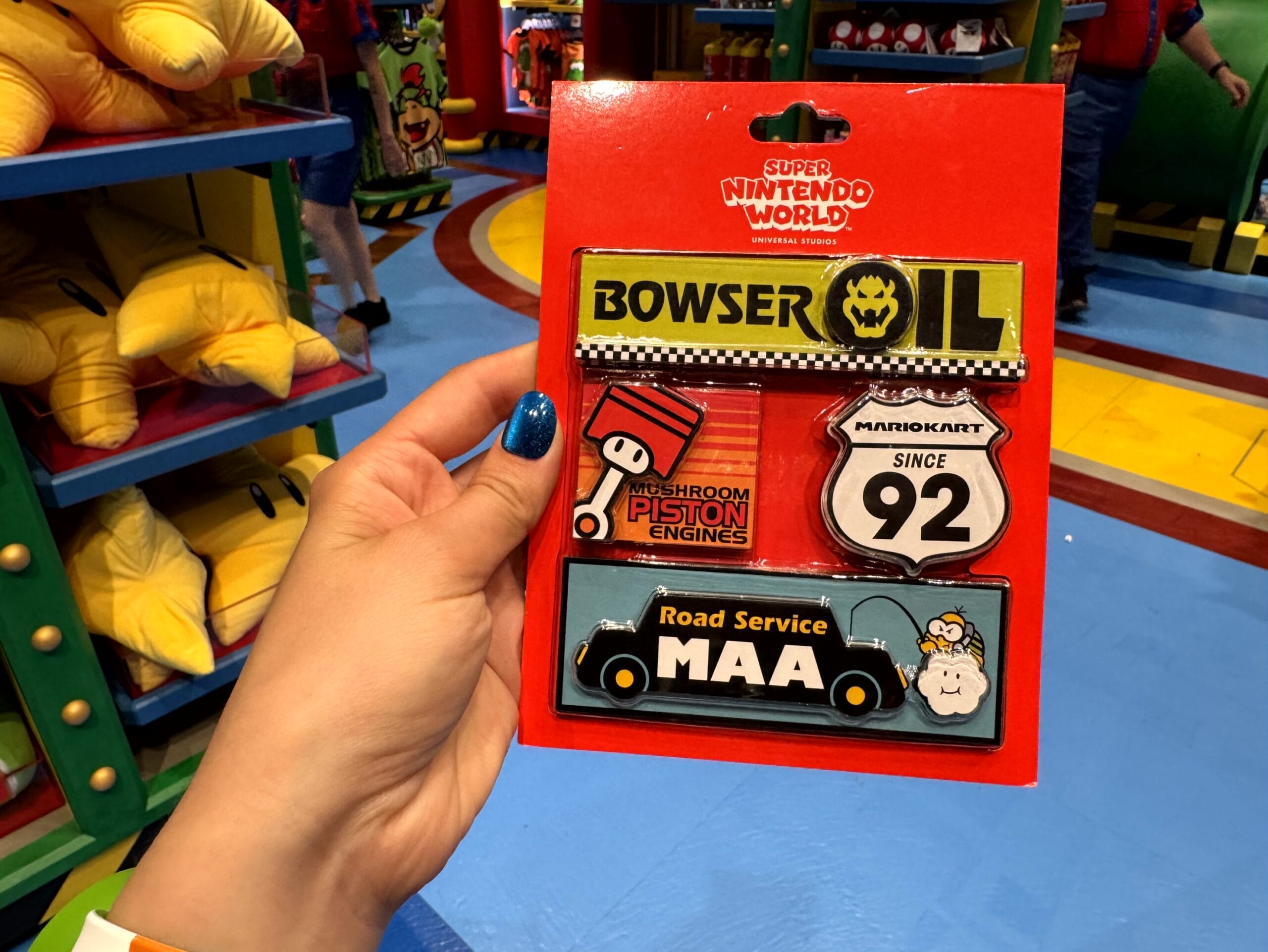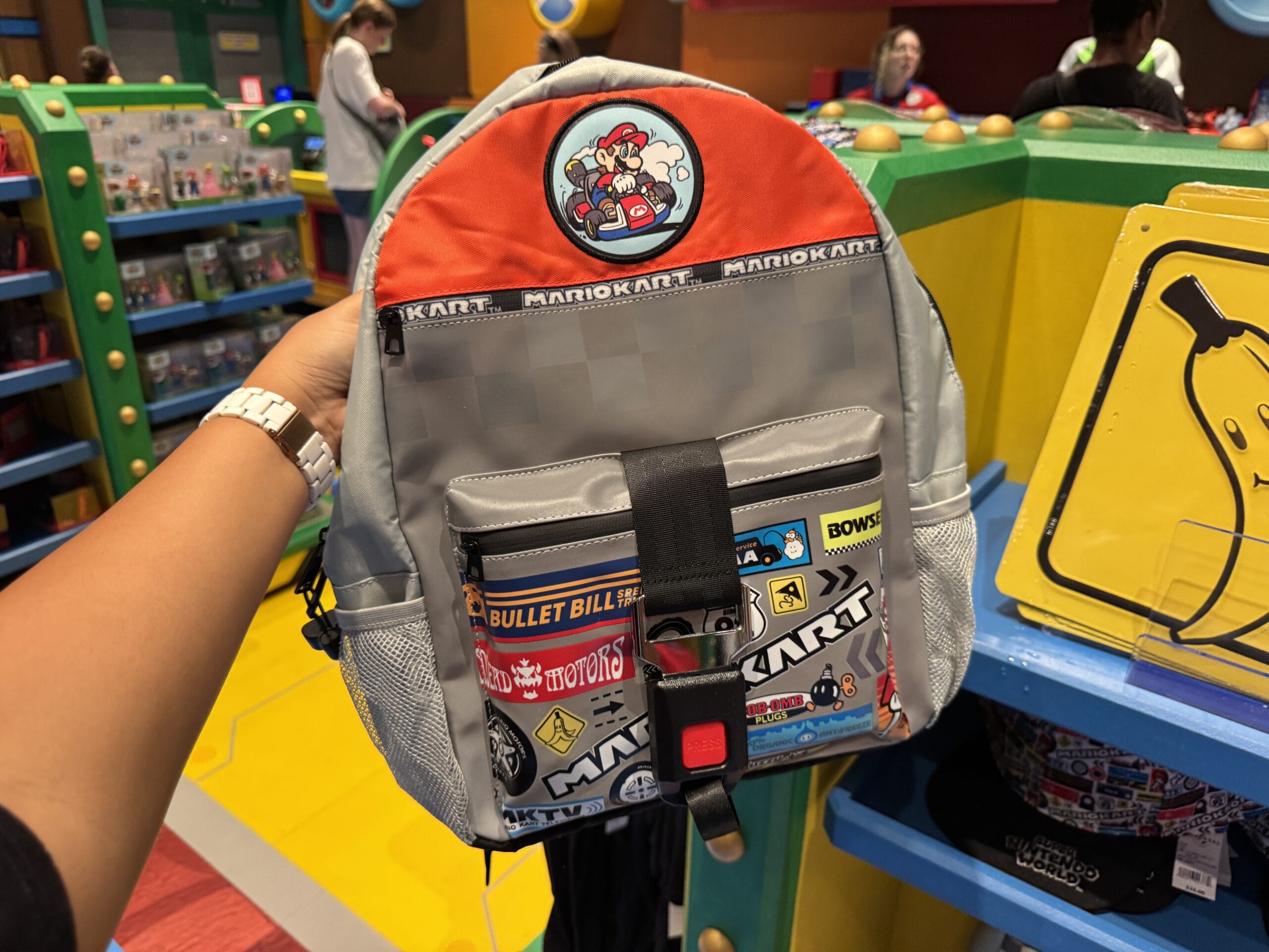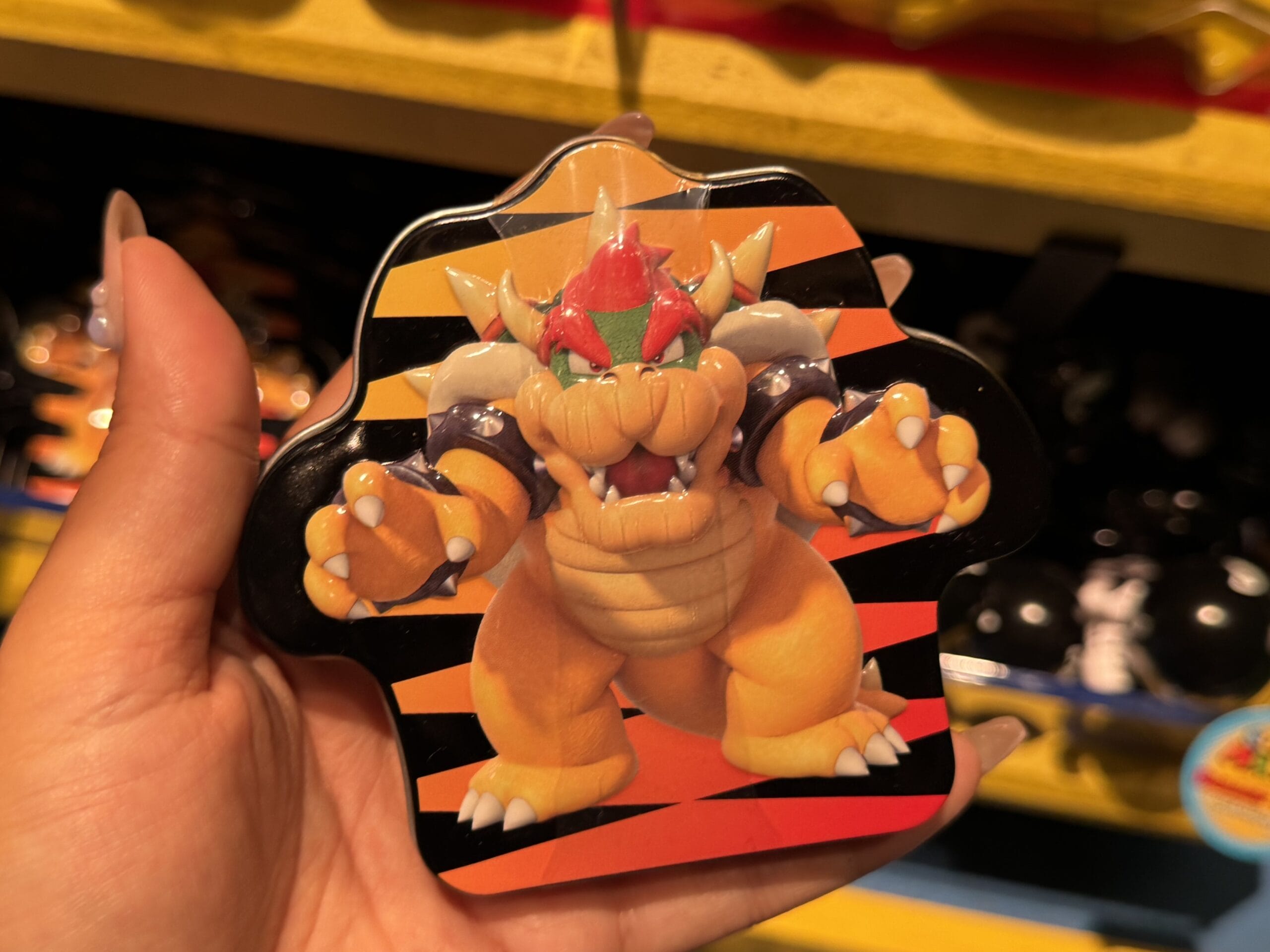 The badge holder has artwork of Mario and his friends racing on Rainbow Road. Bowser is in the background with his castle. “Mario Kart: Bowser’s Challenge” is at the bottom of the art. The Super Nintendo World logo is on the retractable clip.