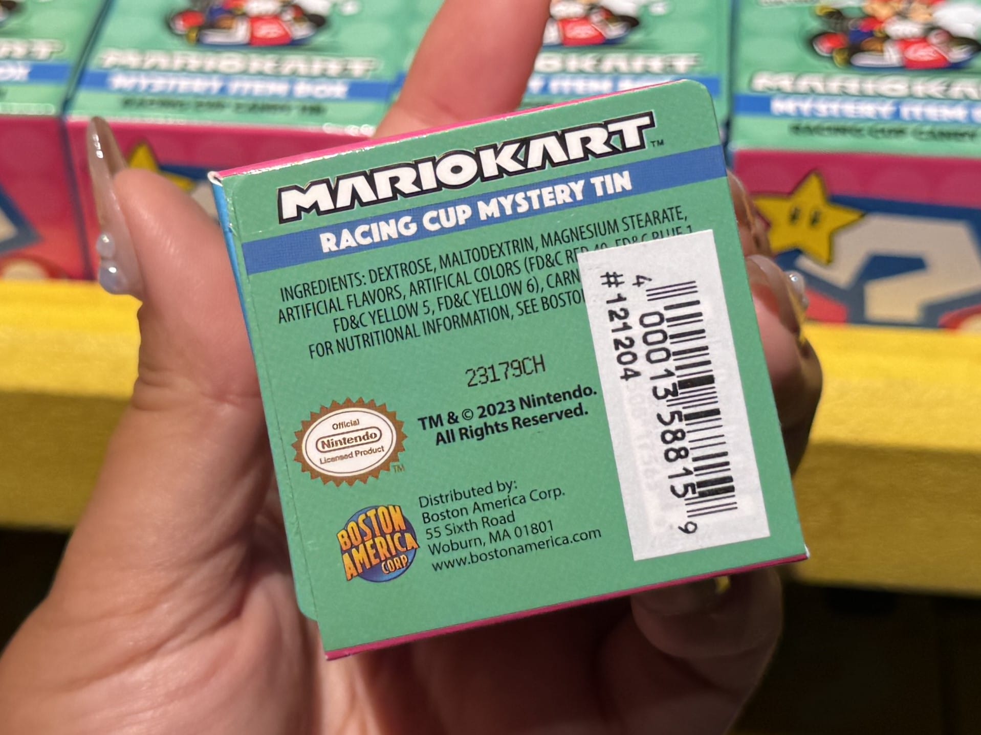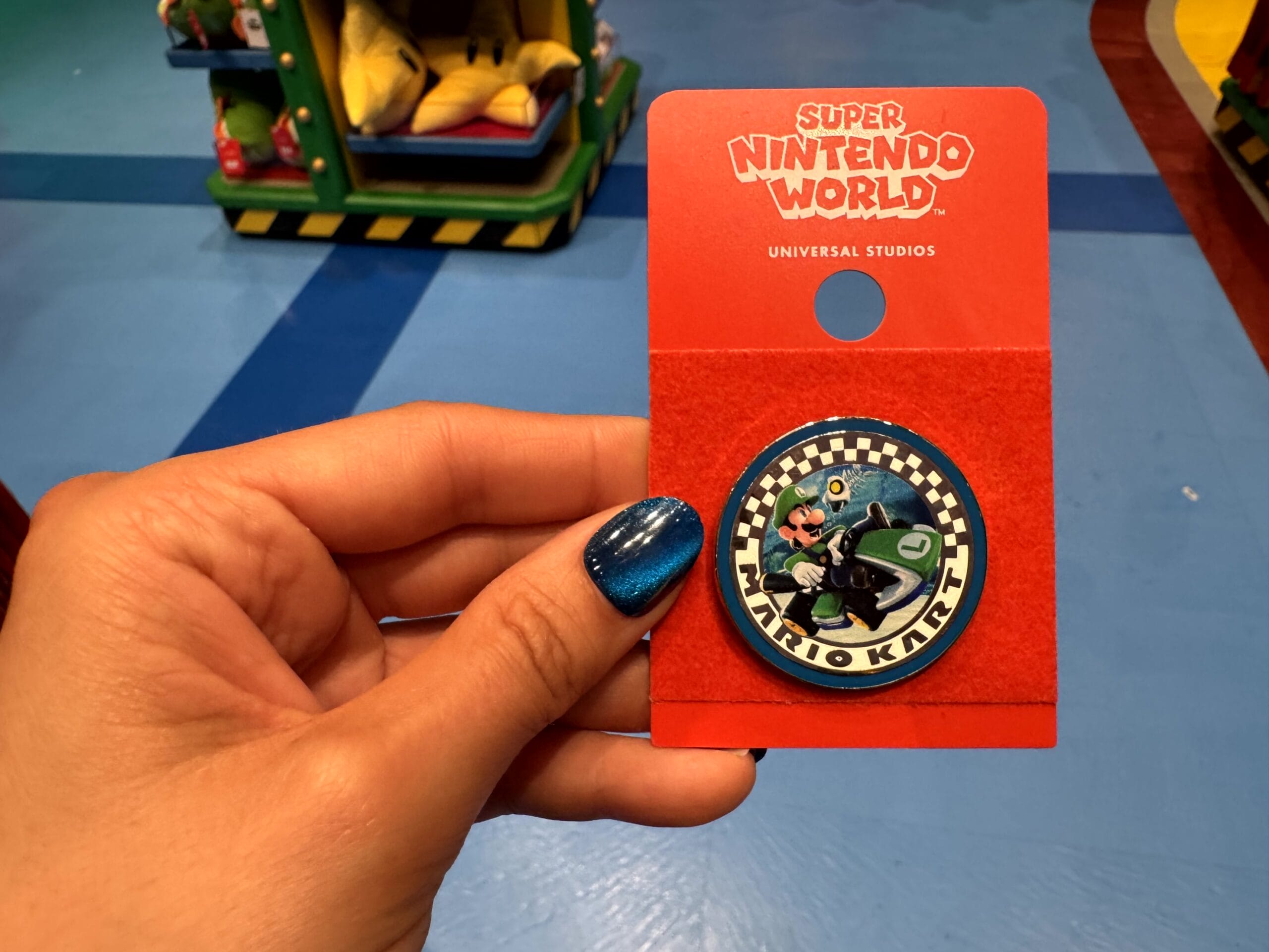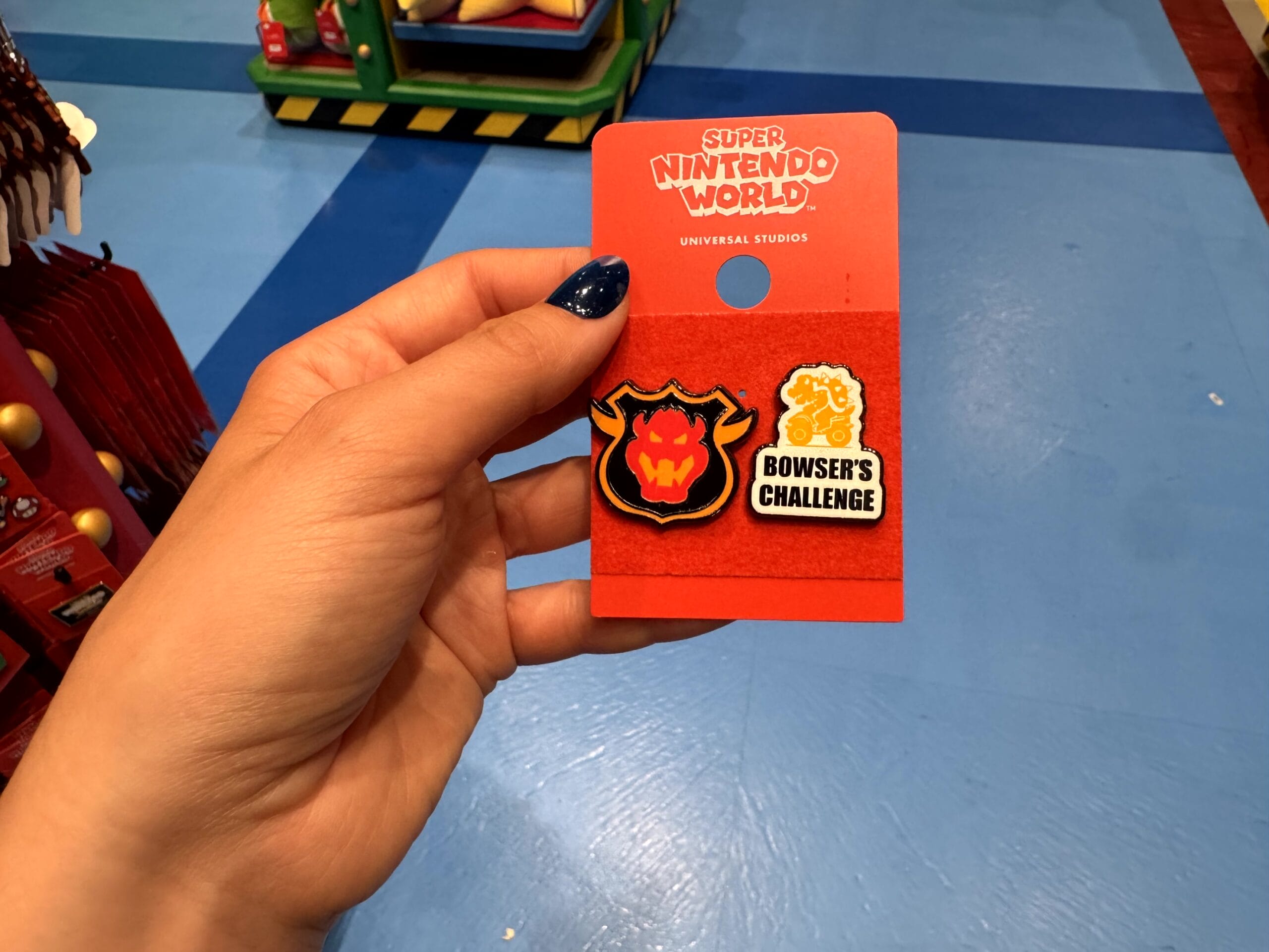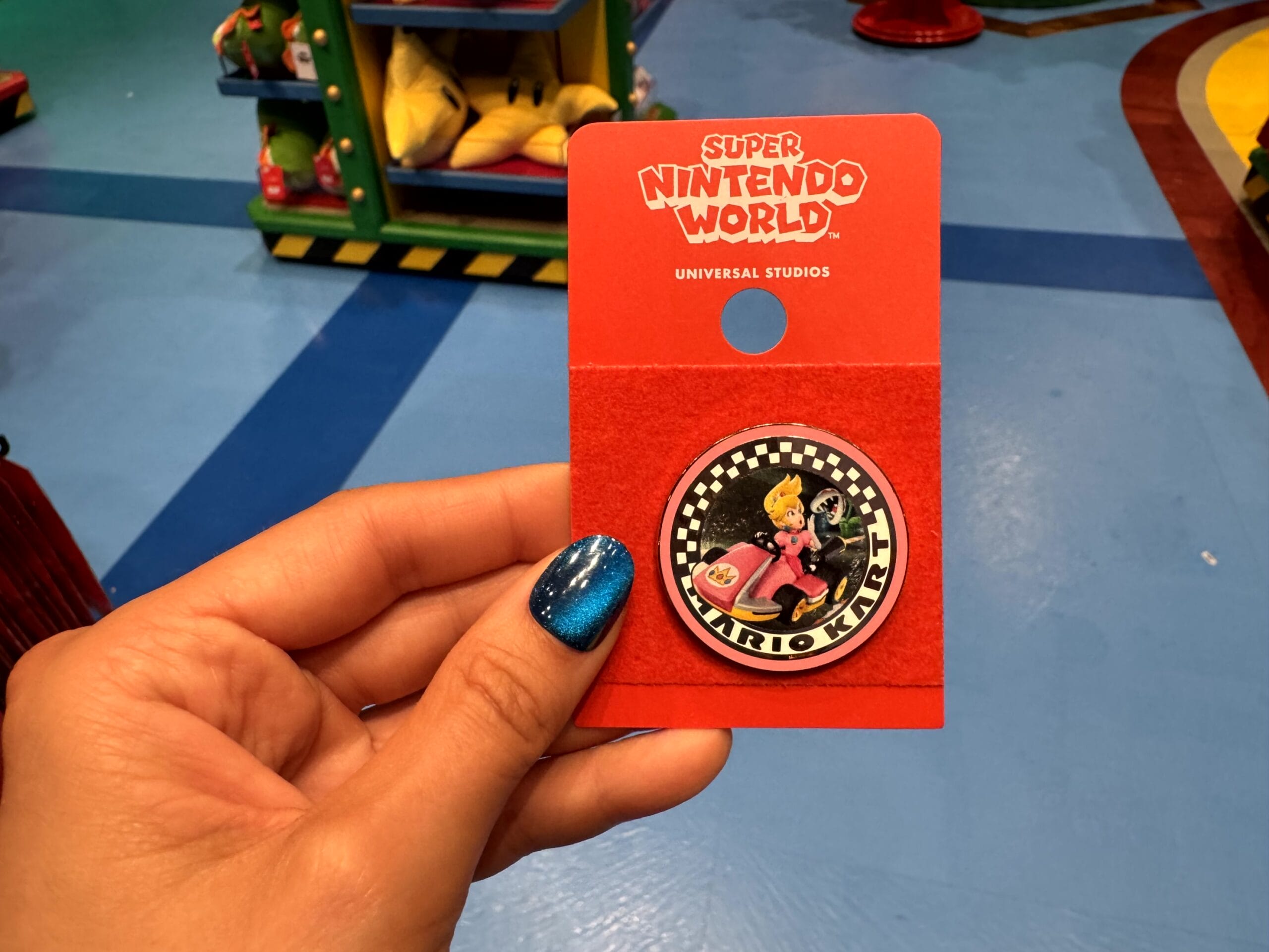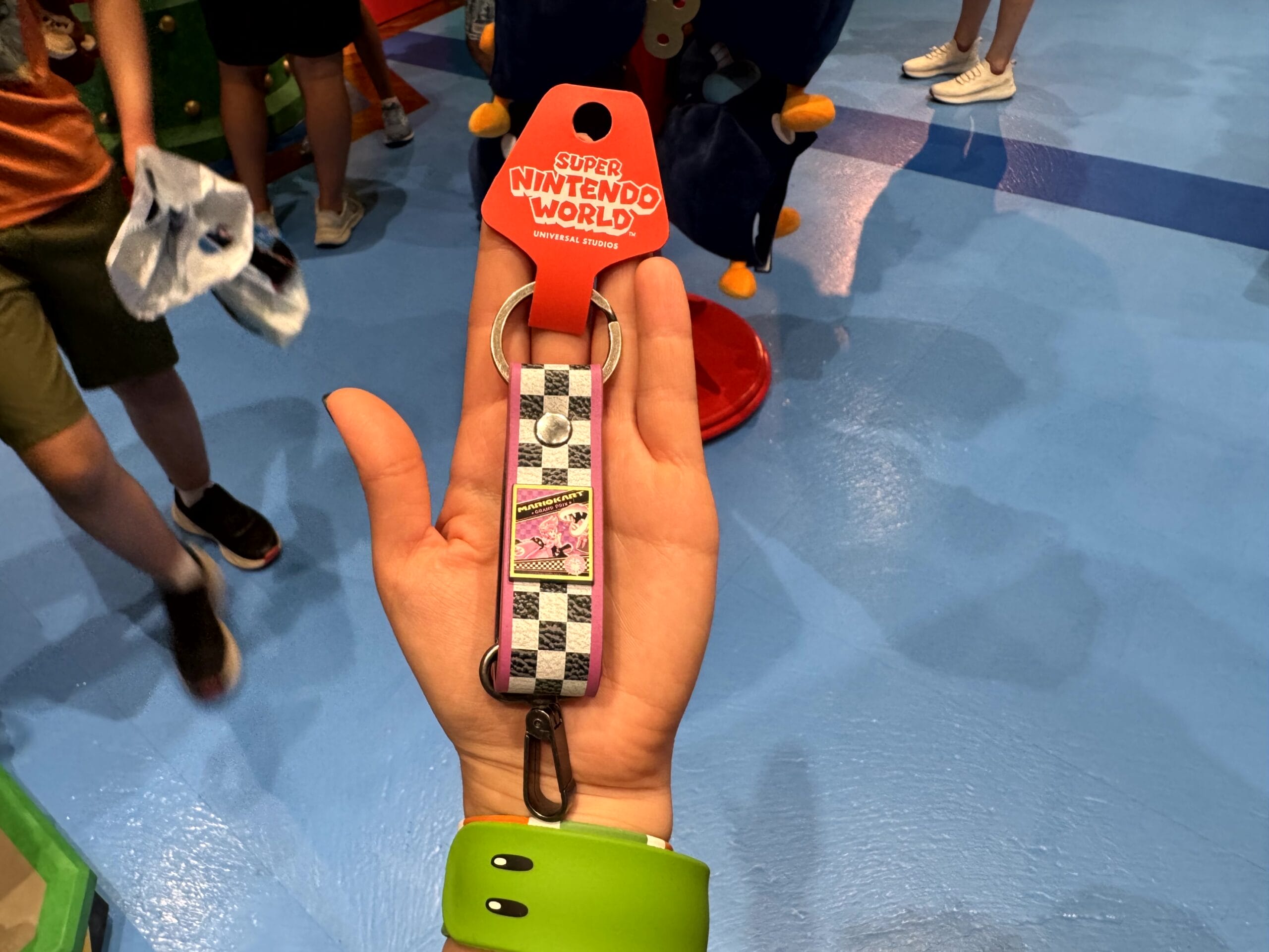 The badge holder has artwork of Mario and his friends racing on Rainbow Road. Bowser is in the background with his castle. “Mario Kart: Bowser’s Challenge” is at the bottom of the art. The Super Nintendo World logo is on the retractable clip.