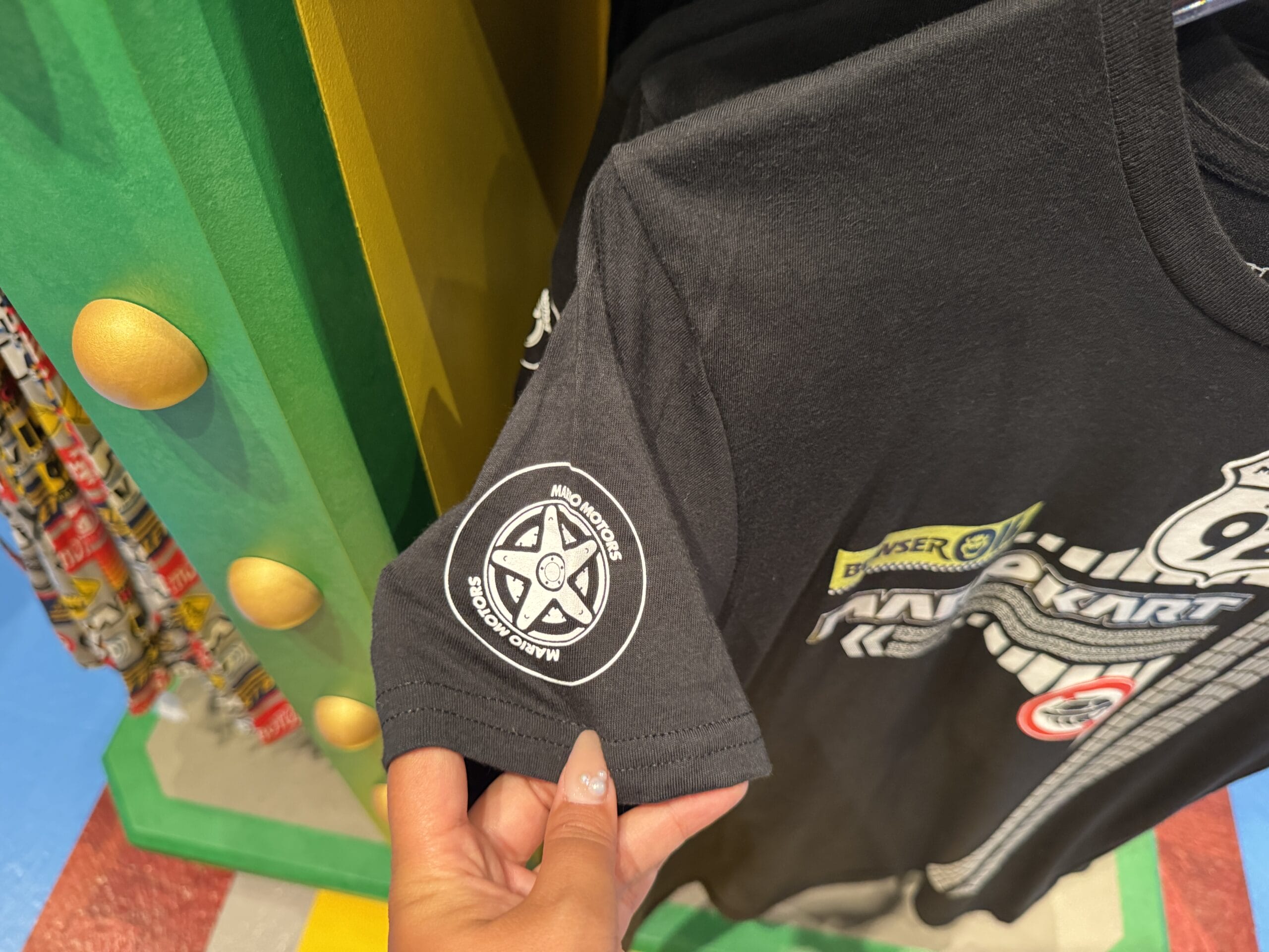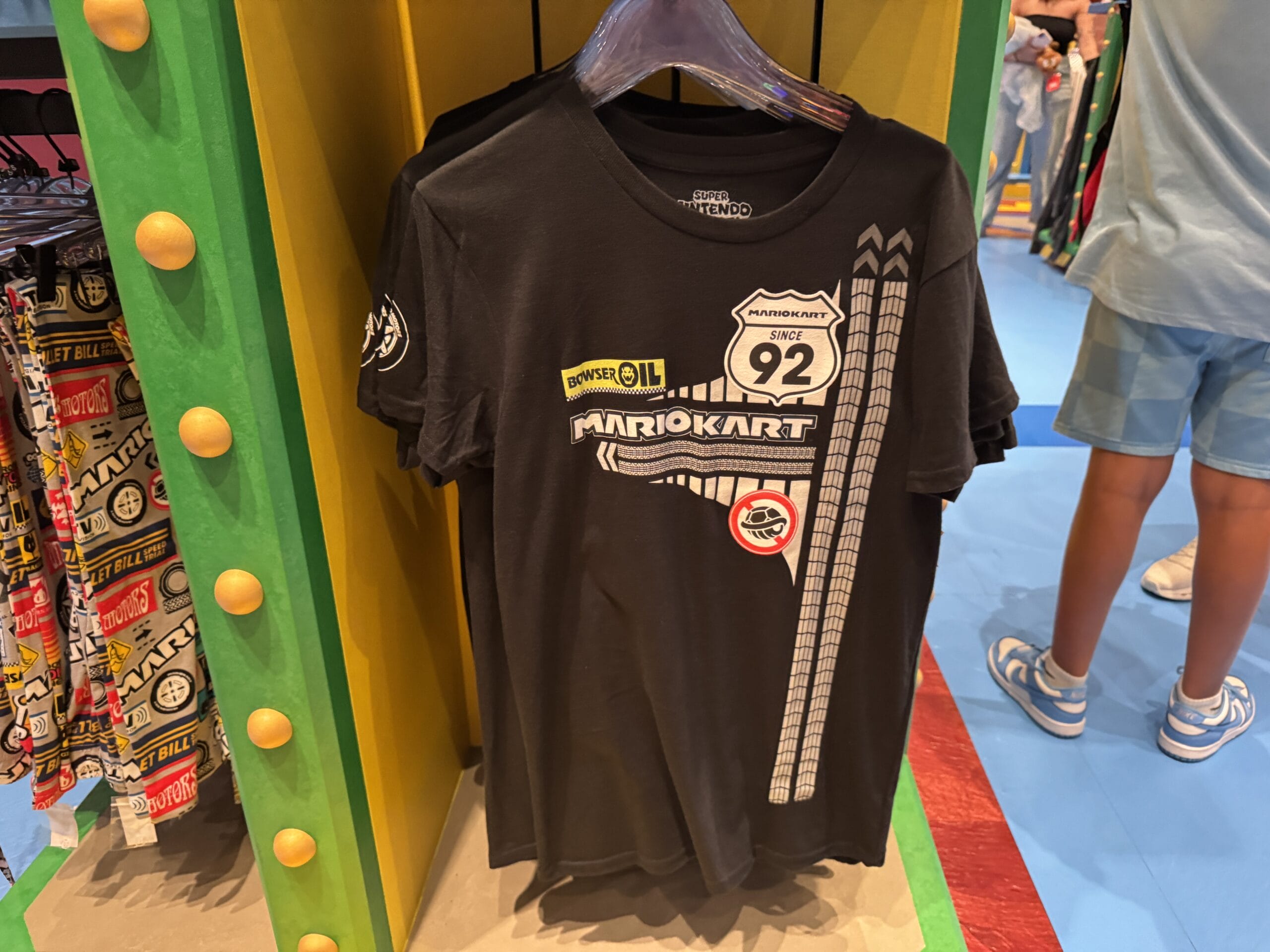 This shirt has tire tread stripes vertically down the left chest and horizontally across the chest. “Mario Kart” is printed in the center of the design, surrounded by a Bowser Oil ad, “Mario Kart Since 92” road sign, and no turtle shells sign. A Mario Motors logo is on the right sleeve.