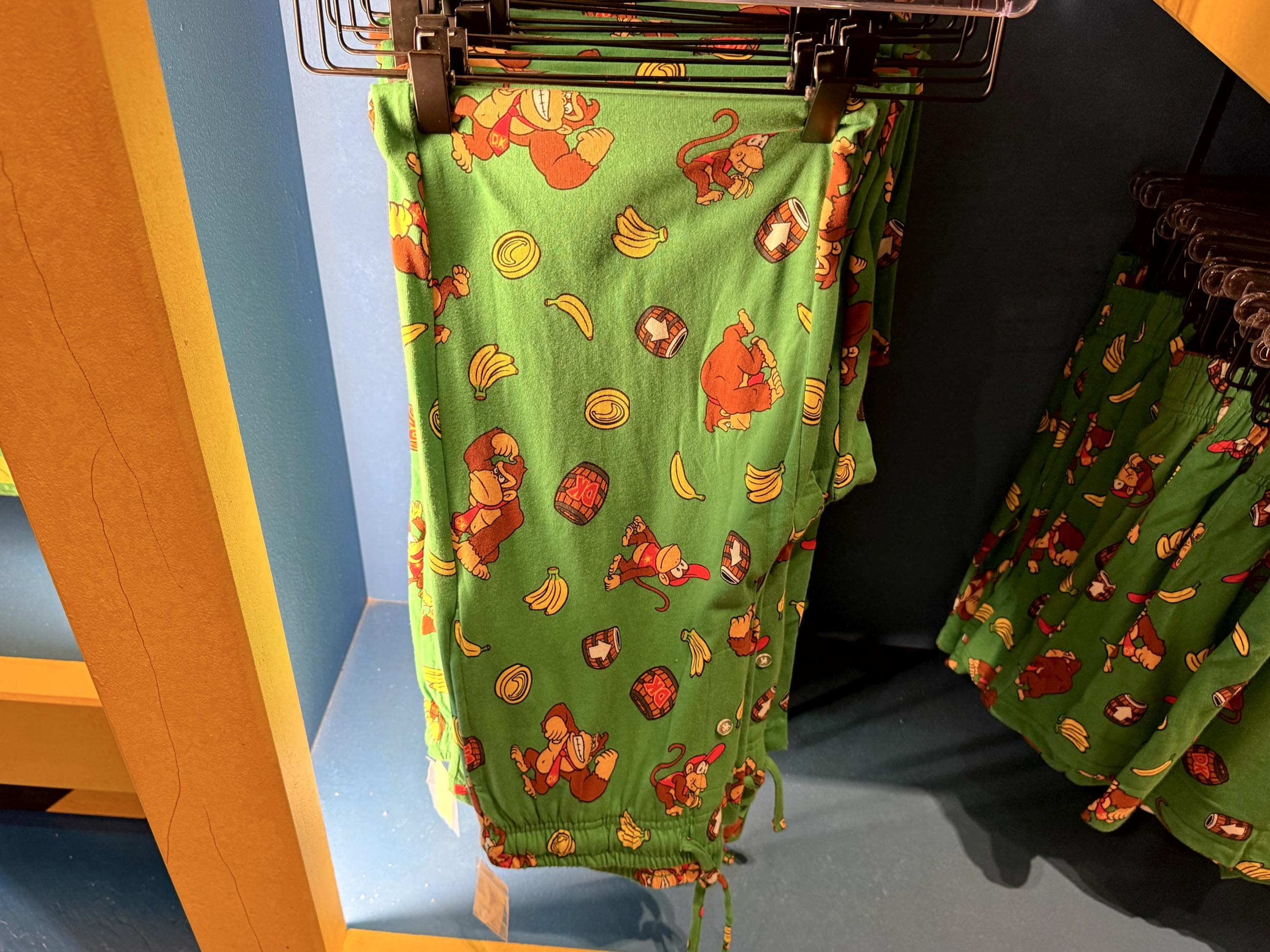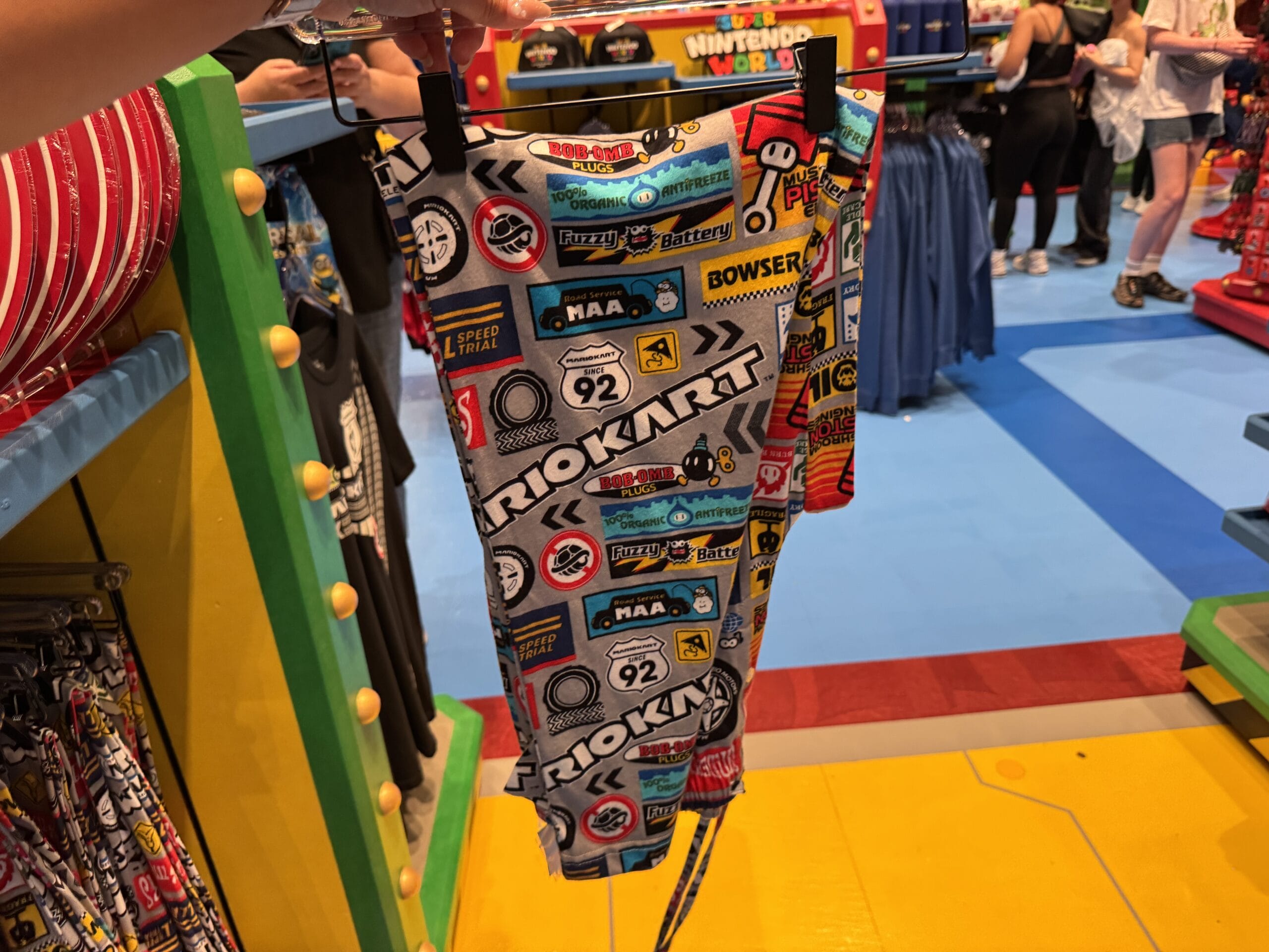 These pants are gray with an all-over pattern of Mario Kart iconography including road signs and fake ads.