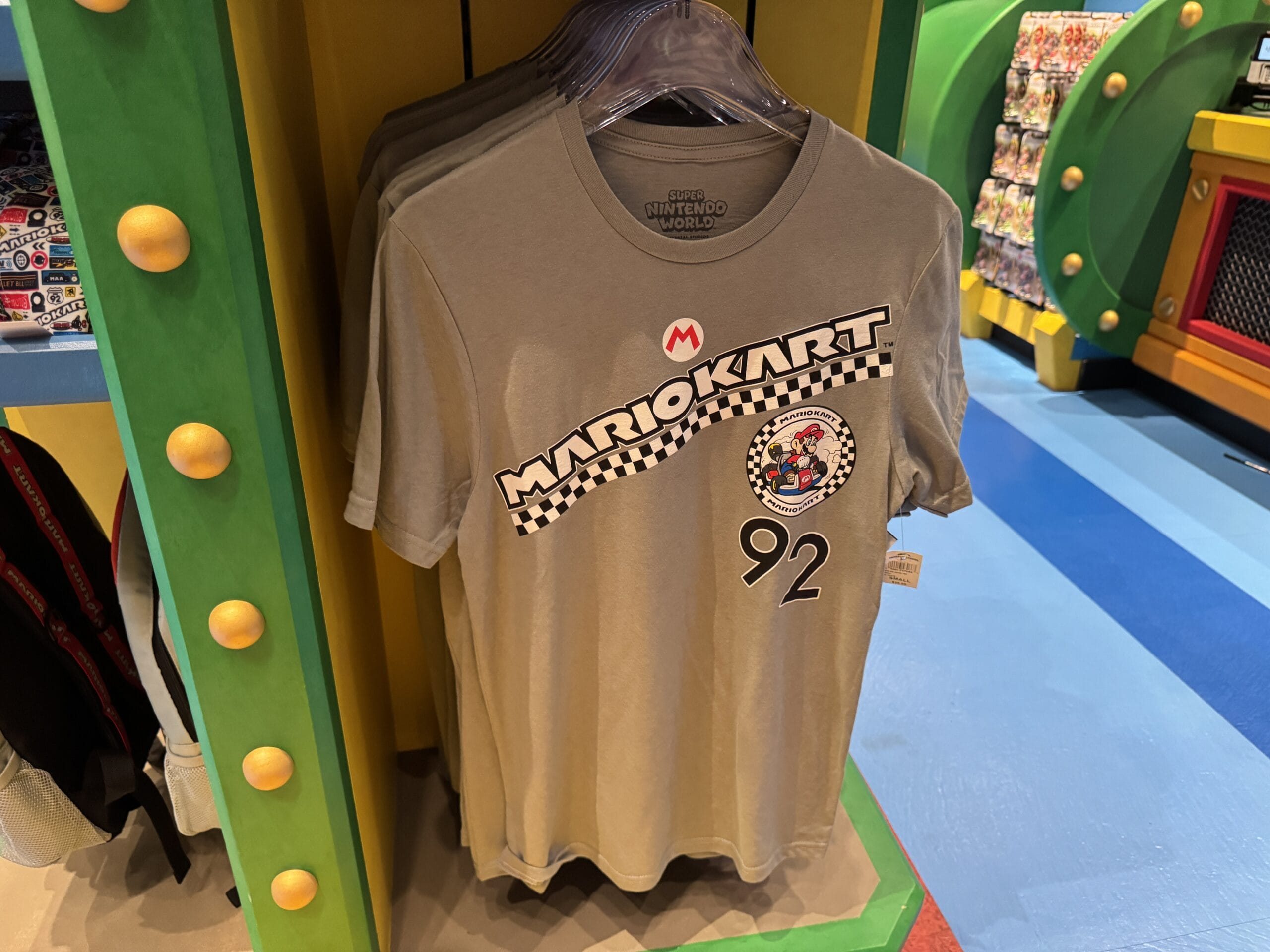 The gray tee has “Mario Kart” emblazoned across the chest with a checkered stripe and Mario “M” icon. Below the words is a Mario Kart emblem featuring Mario and the number 92.