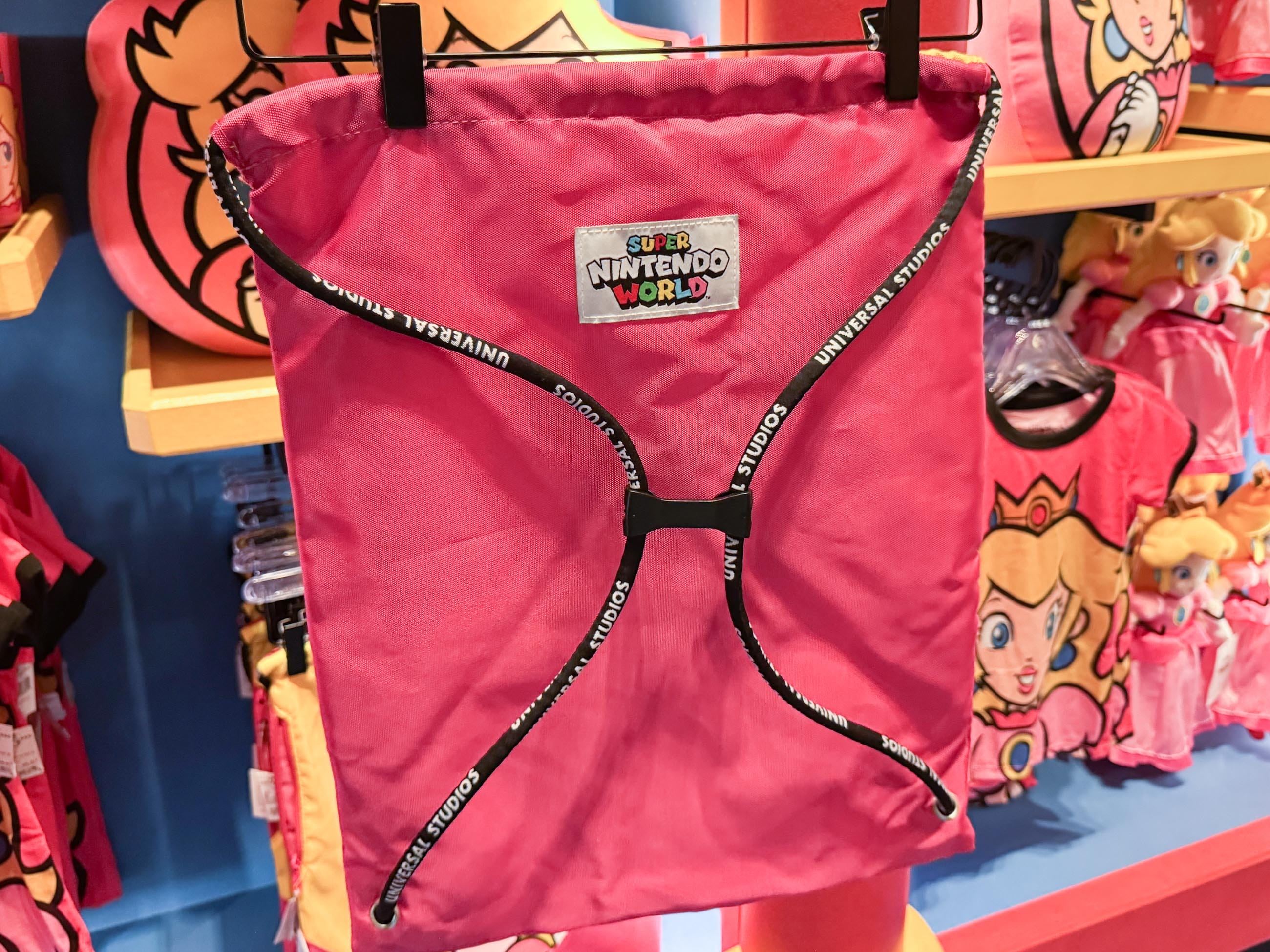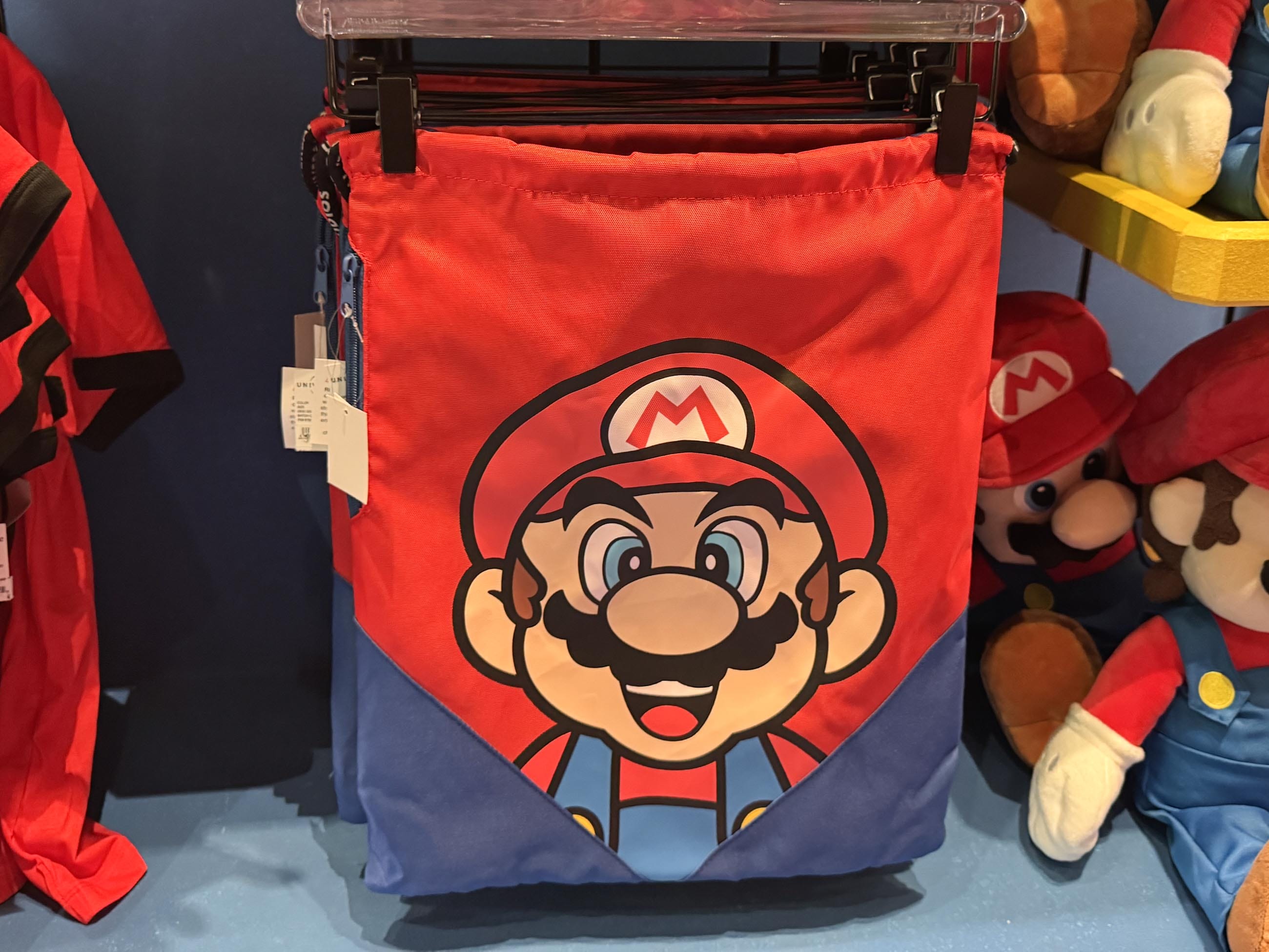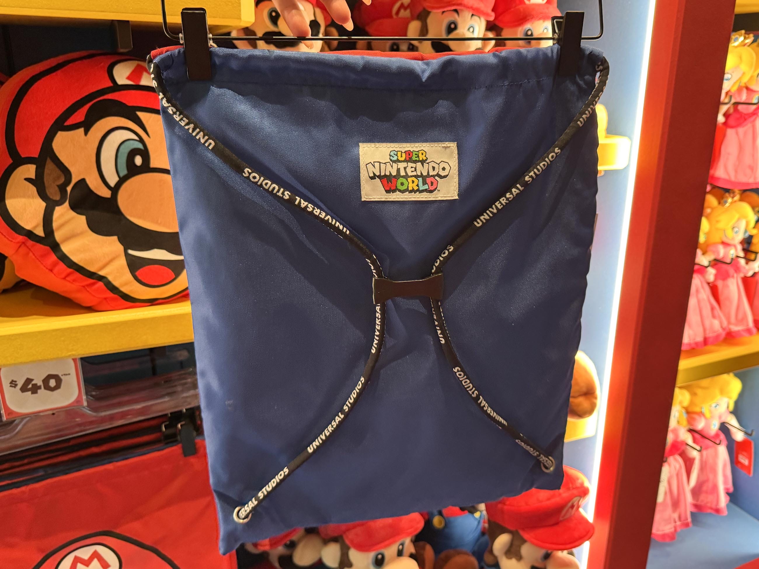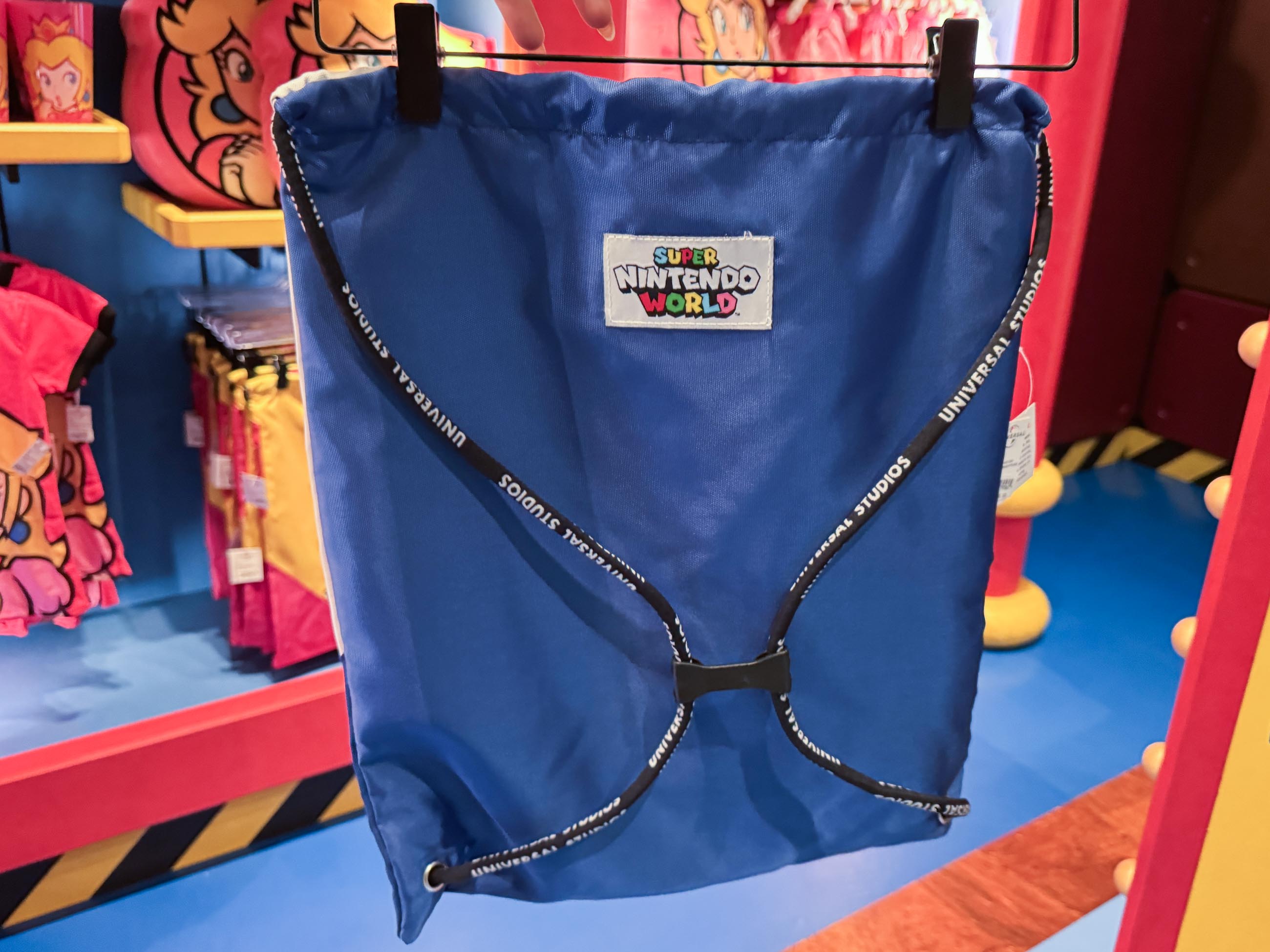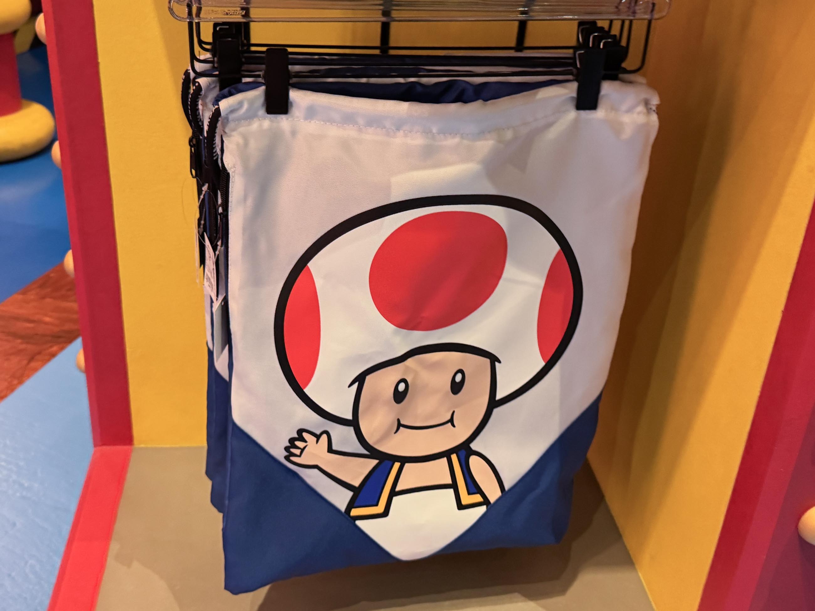 The bag is blue and white. The image of Toad waving is on the front. A Super Nintendo World label is on the back.