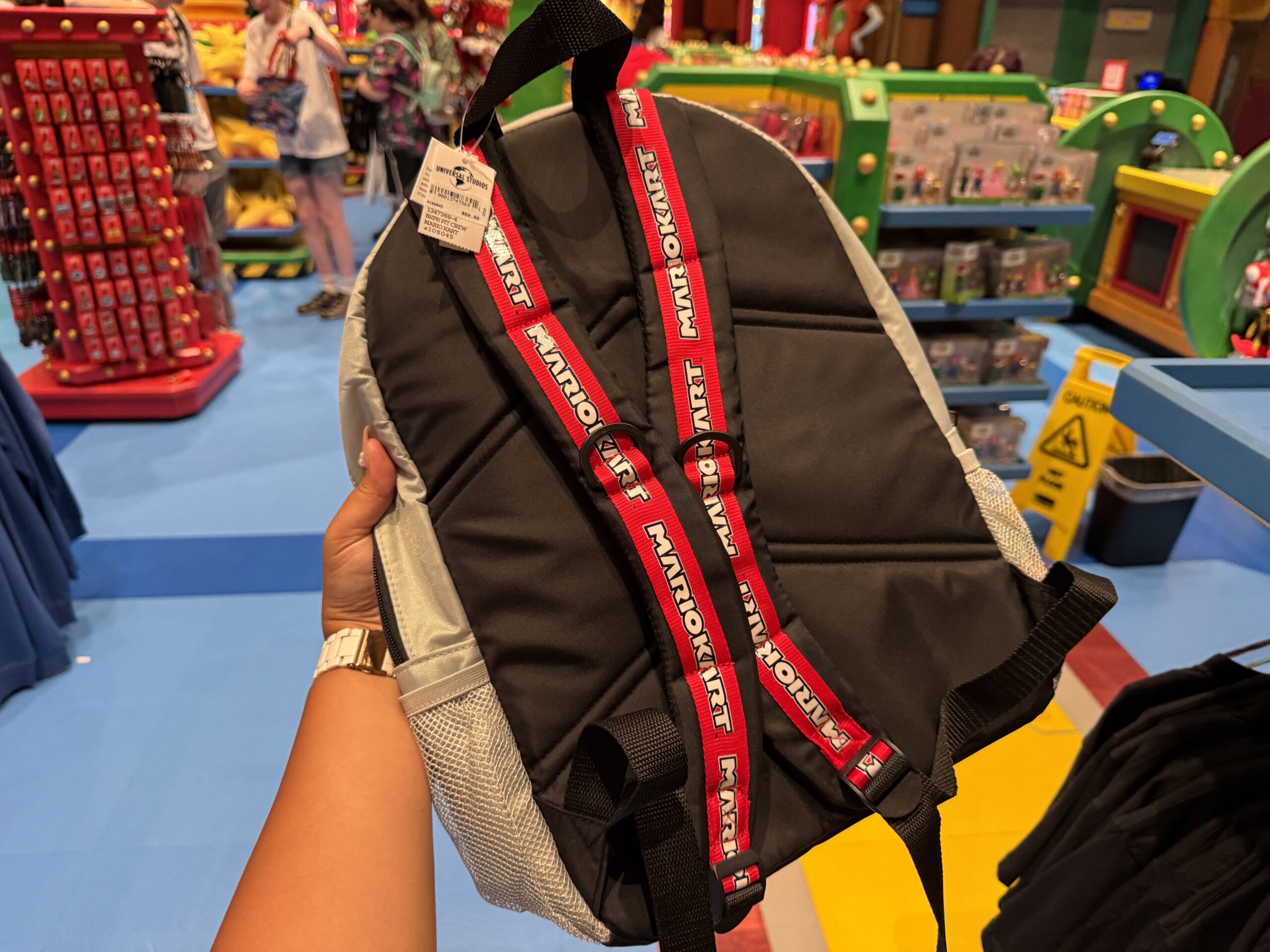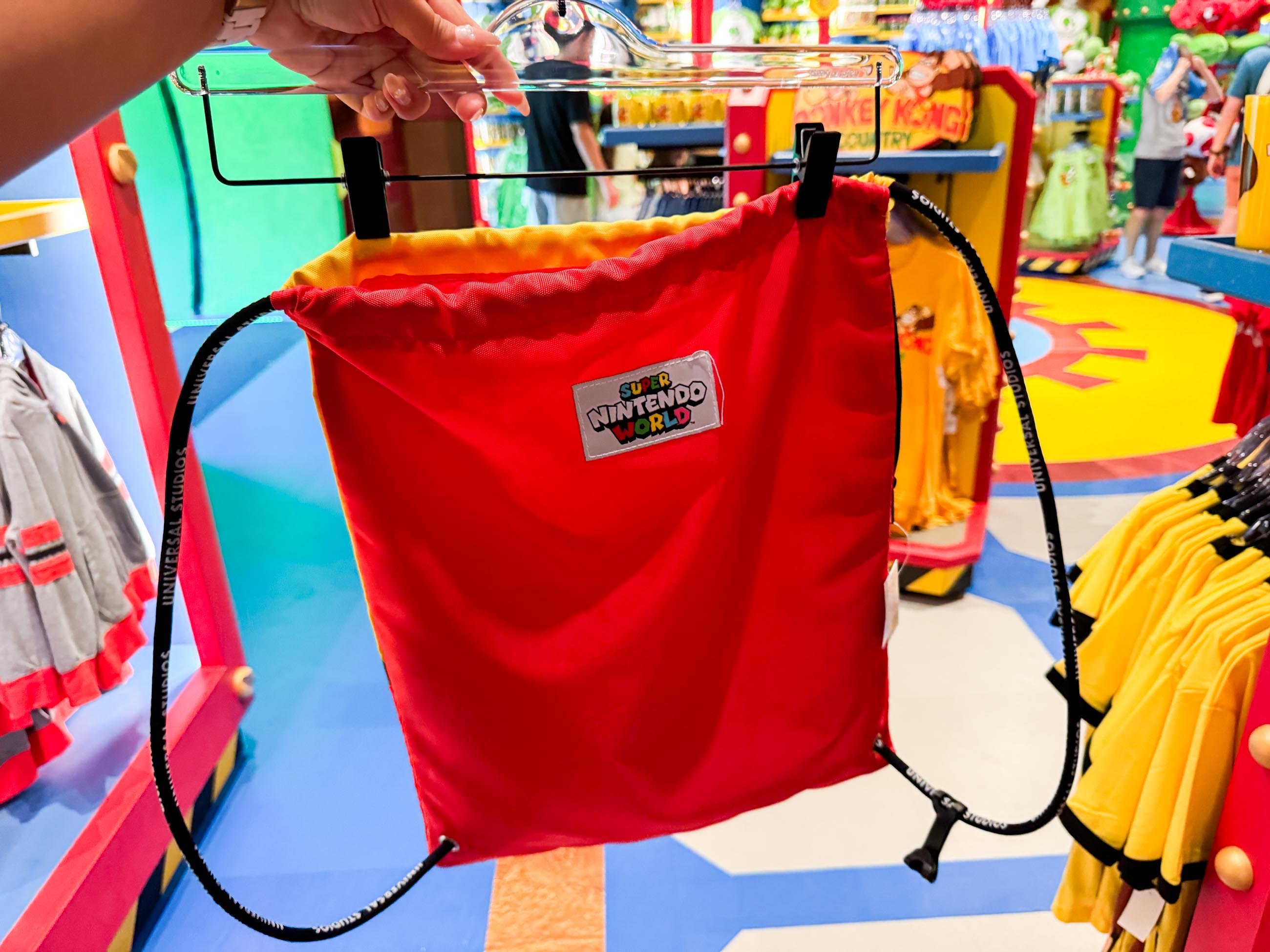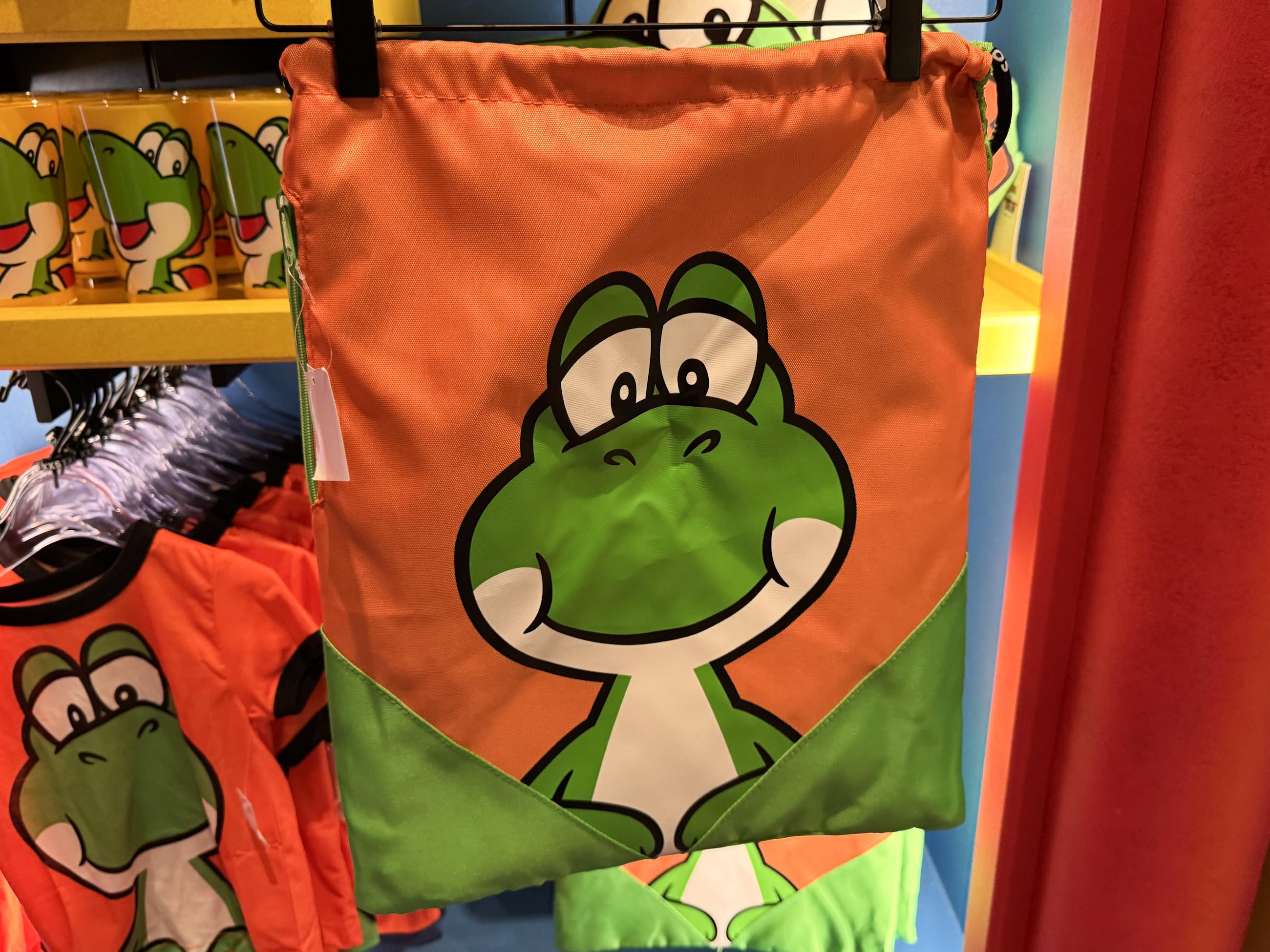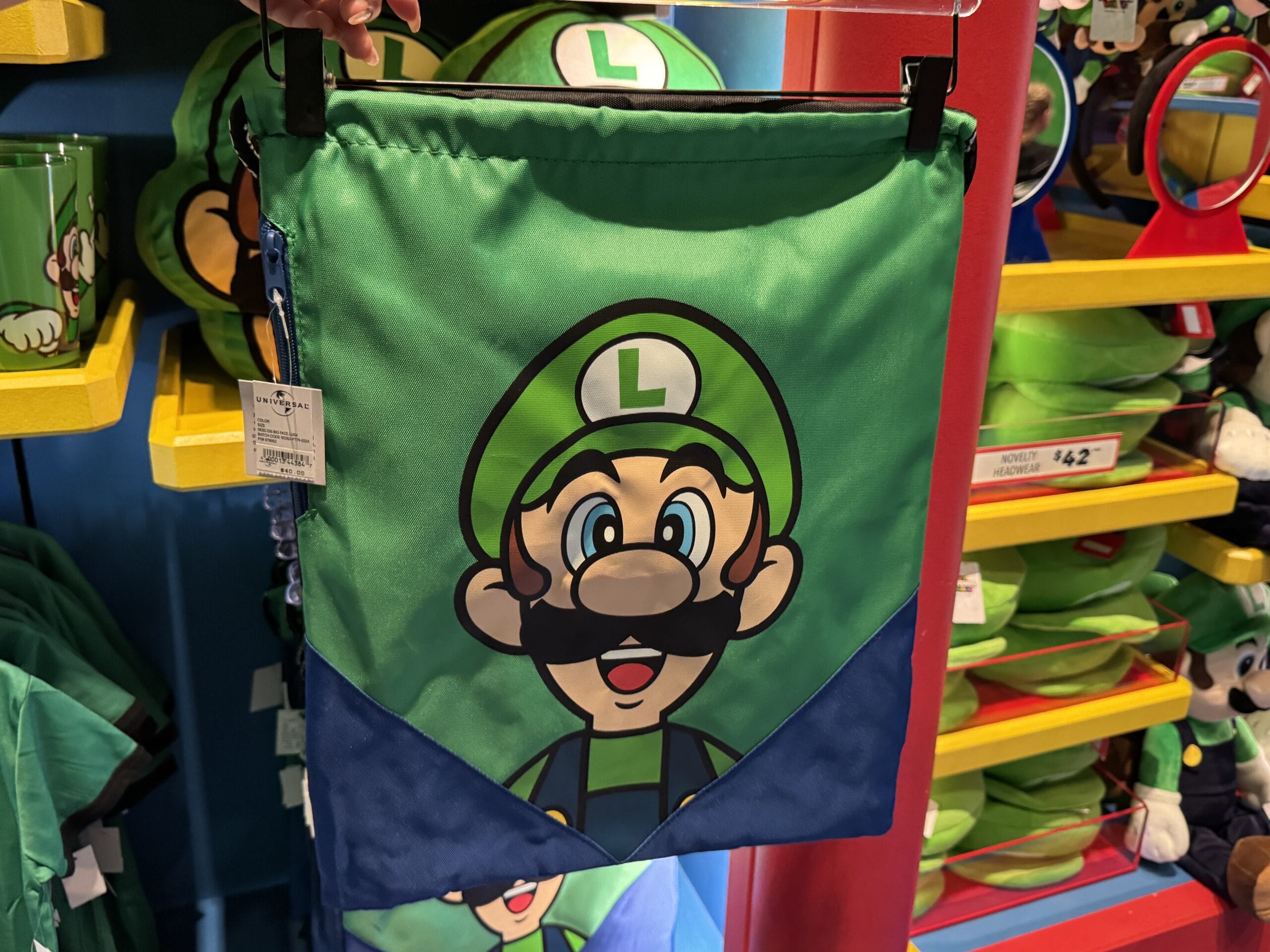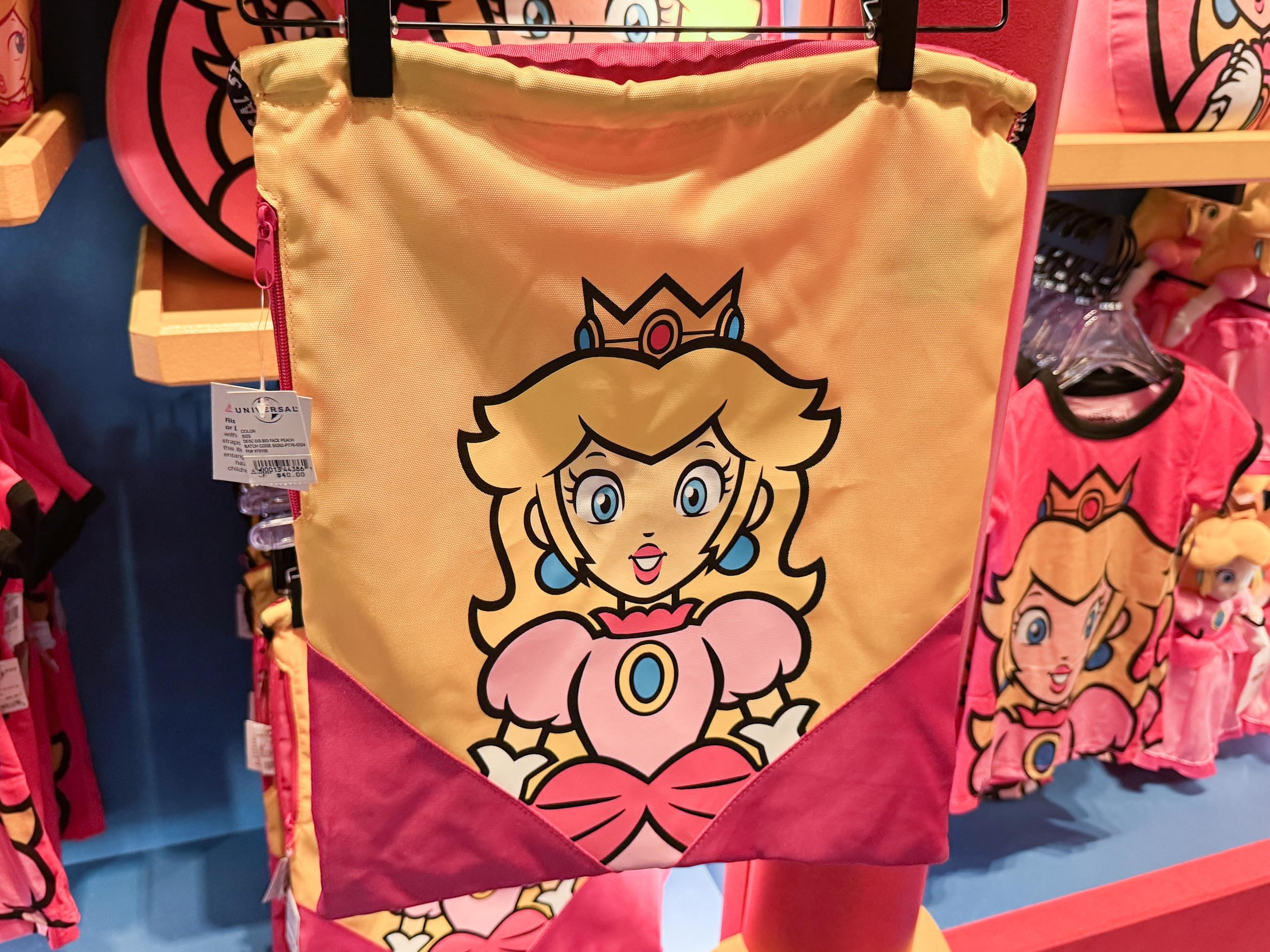 The bag is blue and white. The image of Toad waving is on the front. A Super Nintendo World label is on the back.