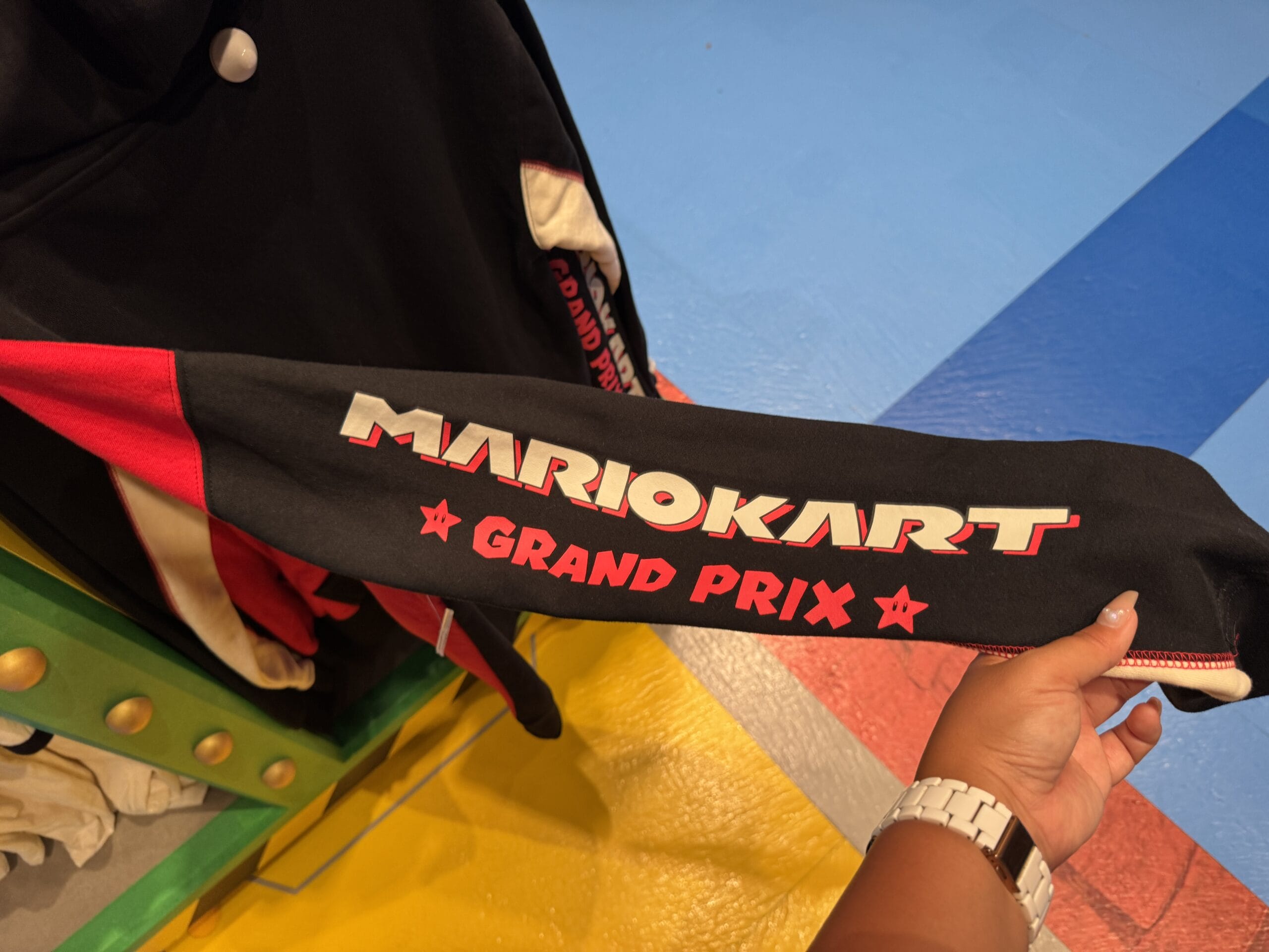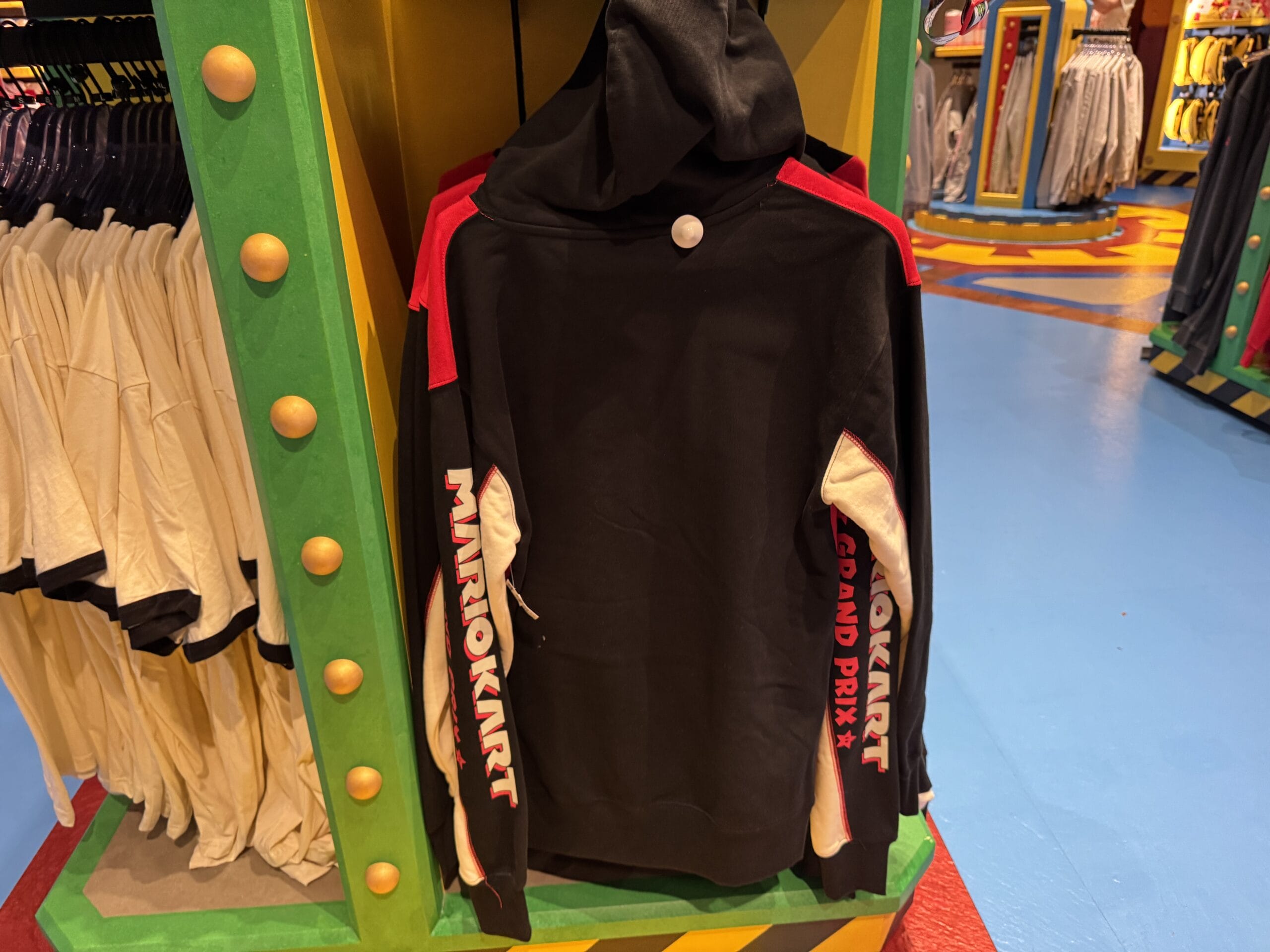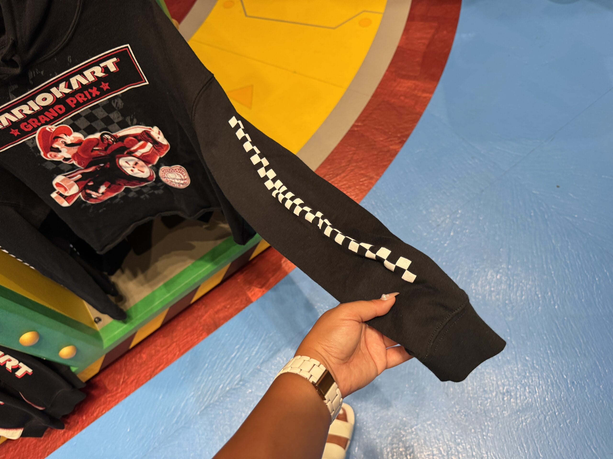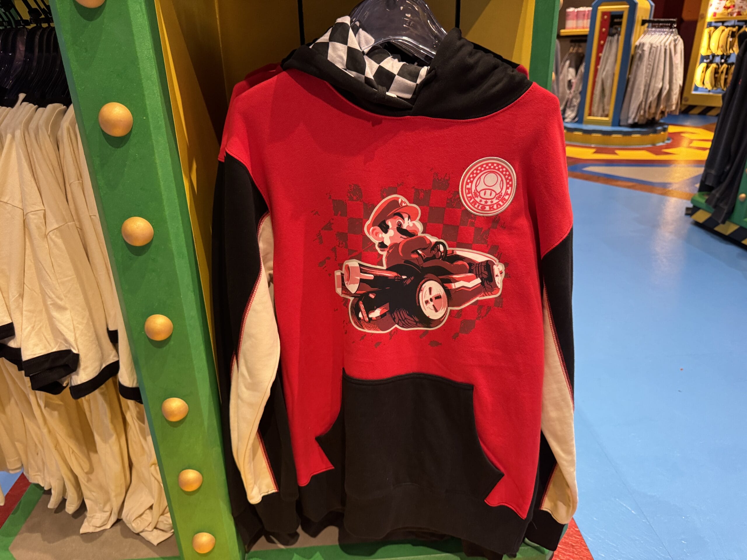The hoodie has a red front, black kangaroo pocket, and black back. On the chest is artwork of Mario in his kart. The sleeves are black and white striped with red highlights and “Mario Kart Grand Prix” on the left sleeve. The hood is black with checkered lining.