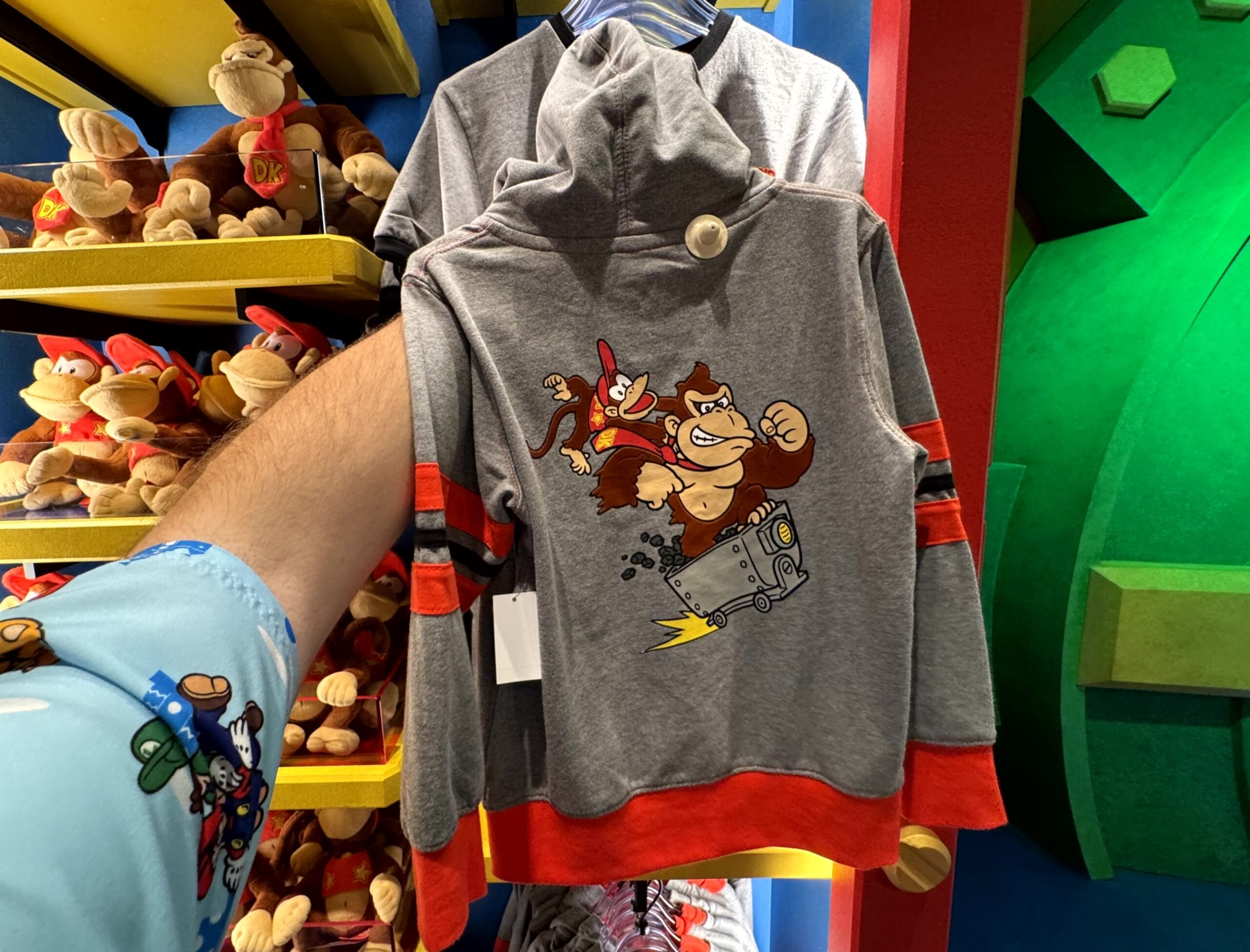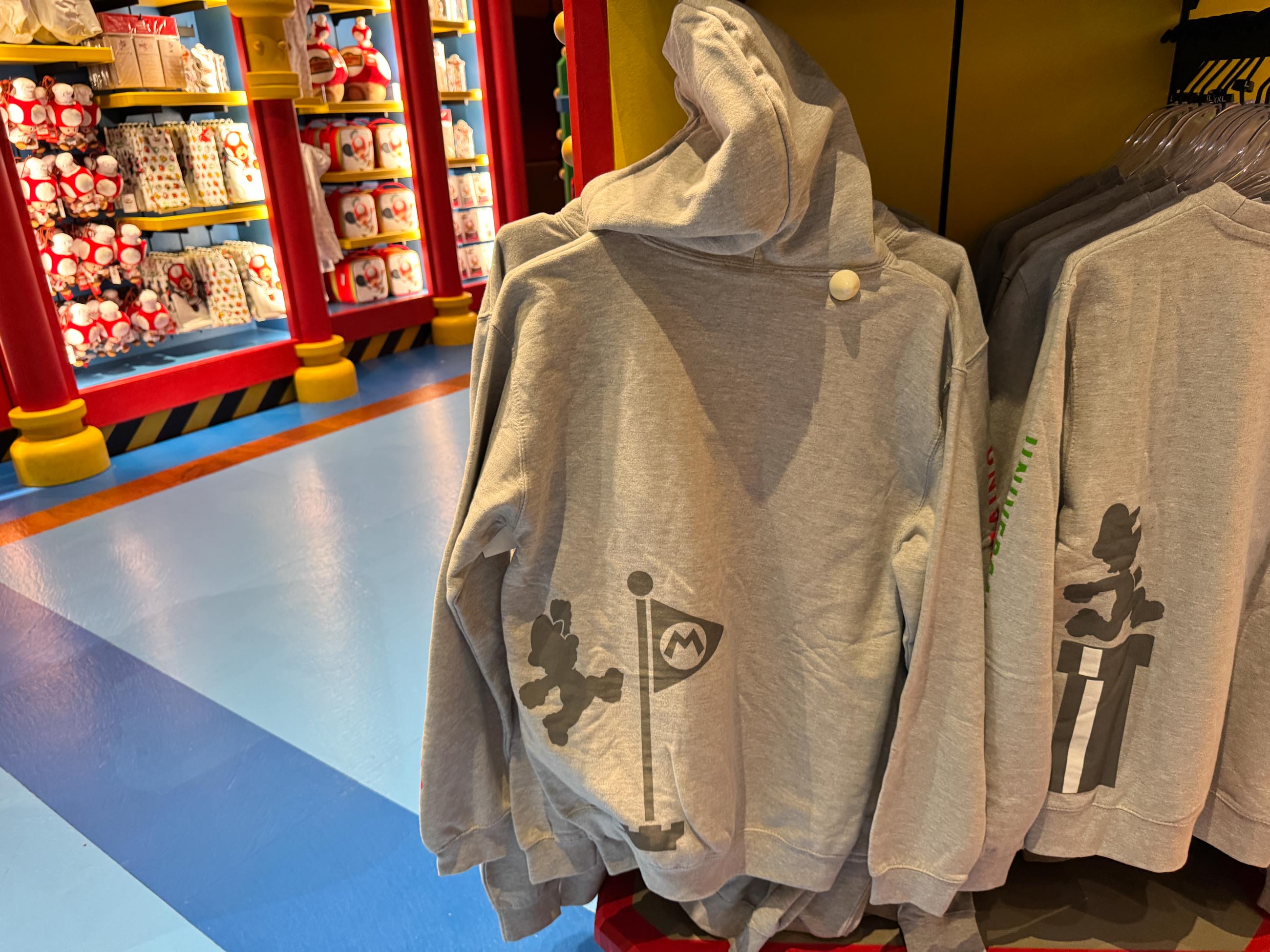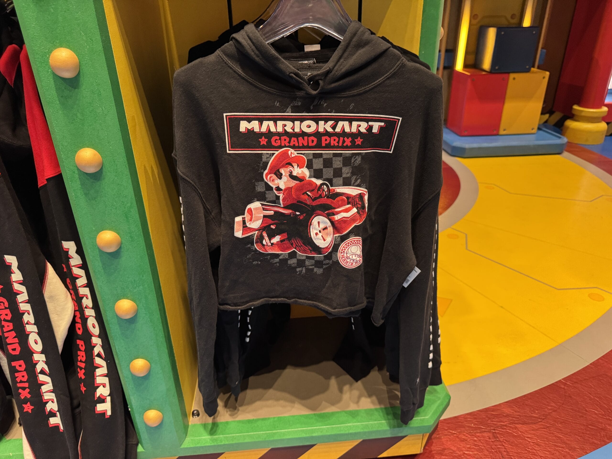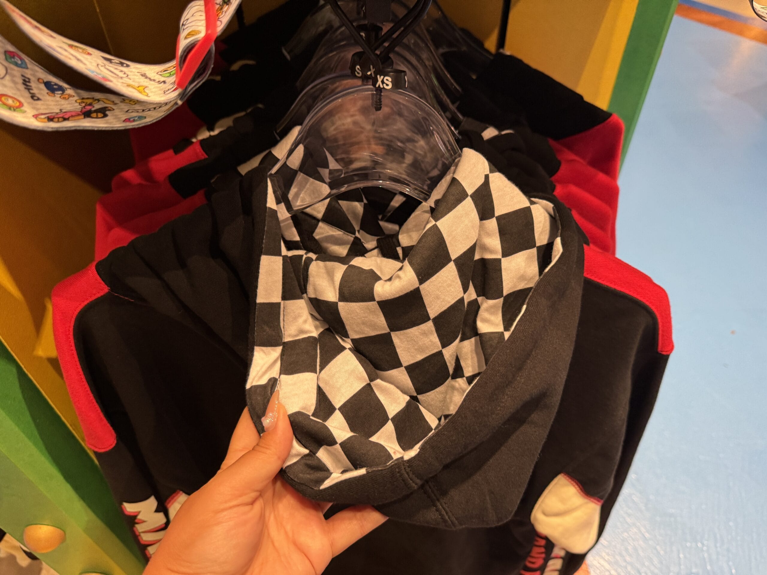 The hoodie has a red front, black kangaroo pocket, and black back. On the chest is artwork of Mario in his kart. The sleeves are black and white striped with red highlights and “Mario Kart Grand Prix” on the left sleeve. The hood is black with checkered lining.