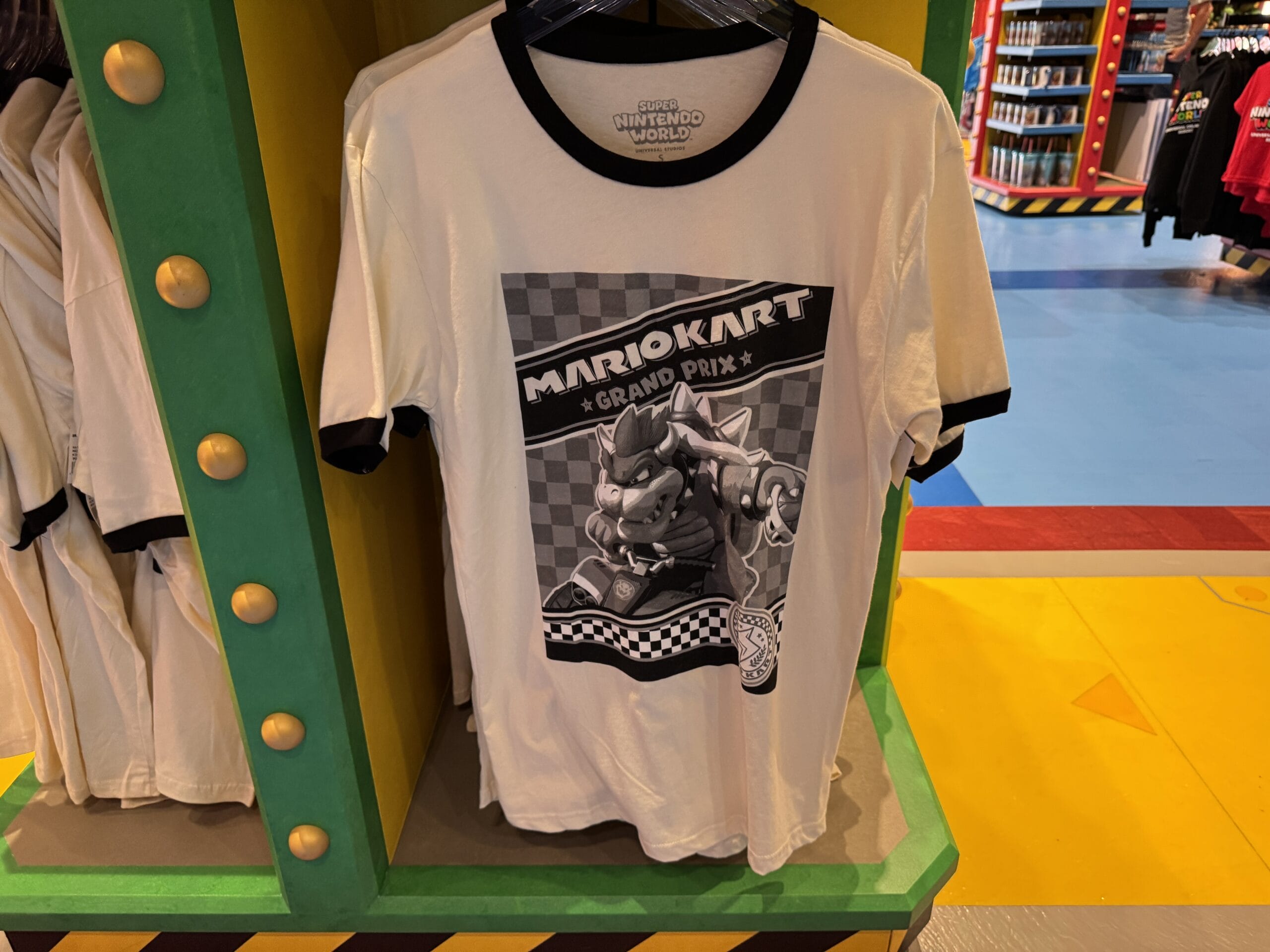 This shirt is white with black trim. Black and white artwork of Bowser in his kart is on the chest with a checkered background and “Mario Kart Grand Prix.”