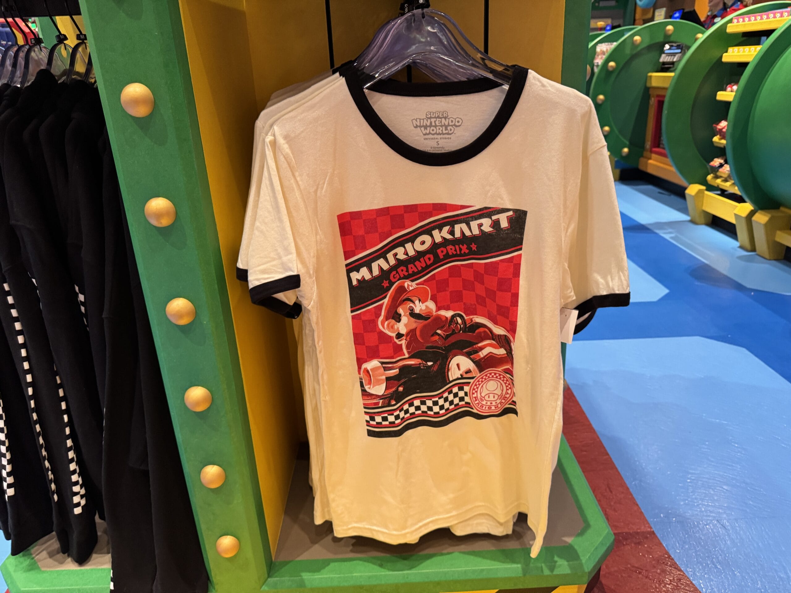 This T-shirt has similar artwork of Mario driving his kart but the checkered background is shades of red. A black and white checkered stripe across the bottom is accented by the Mario Kart logo. “Mario Kart Grand Prix” is above Mario. The shirt is white with black trim.