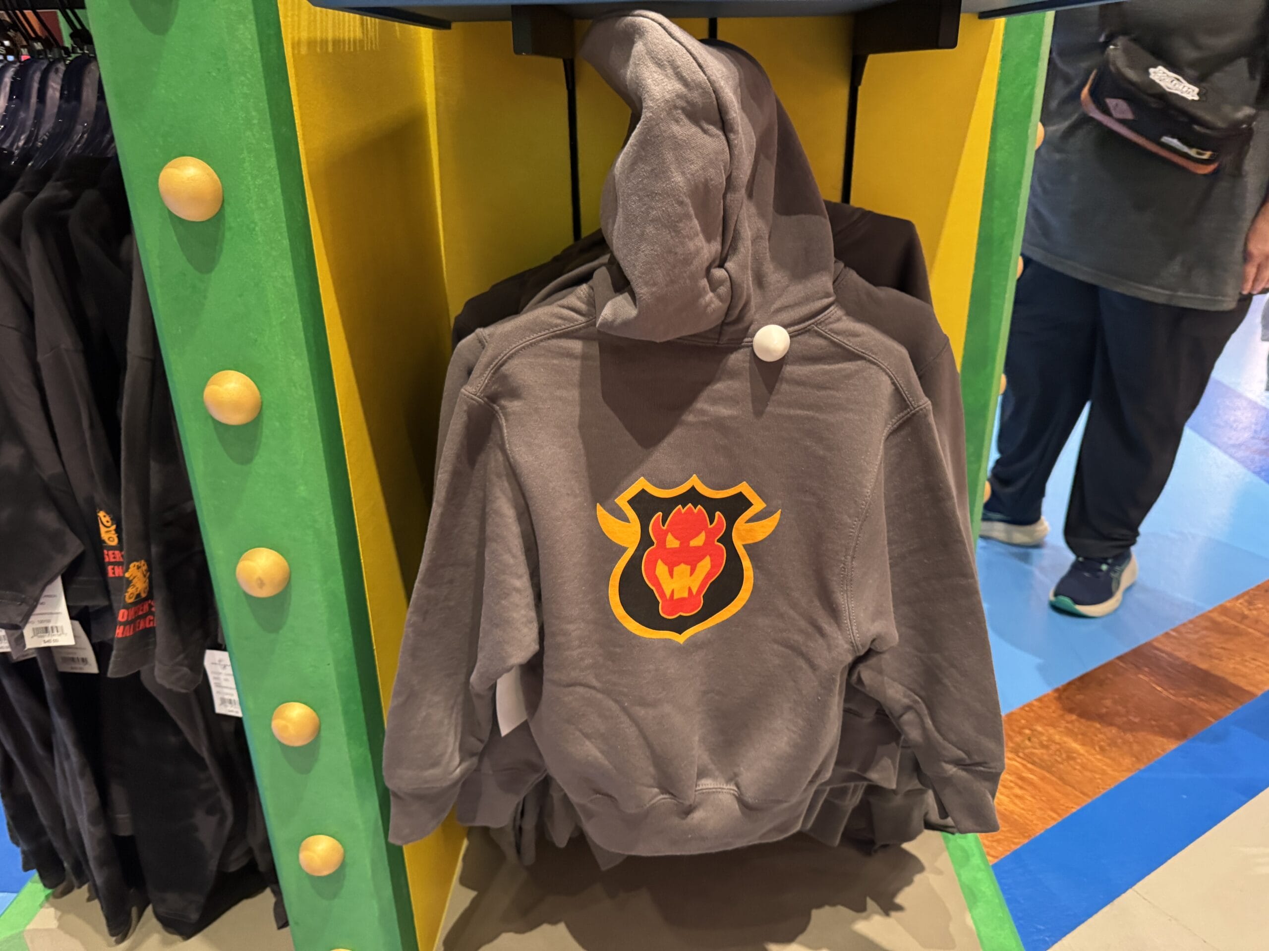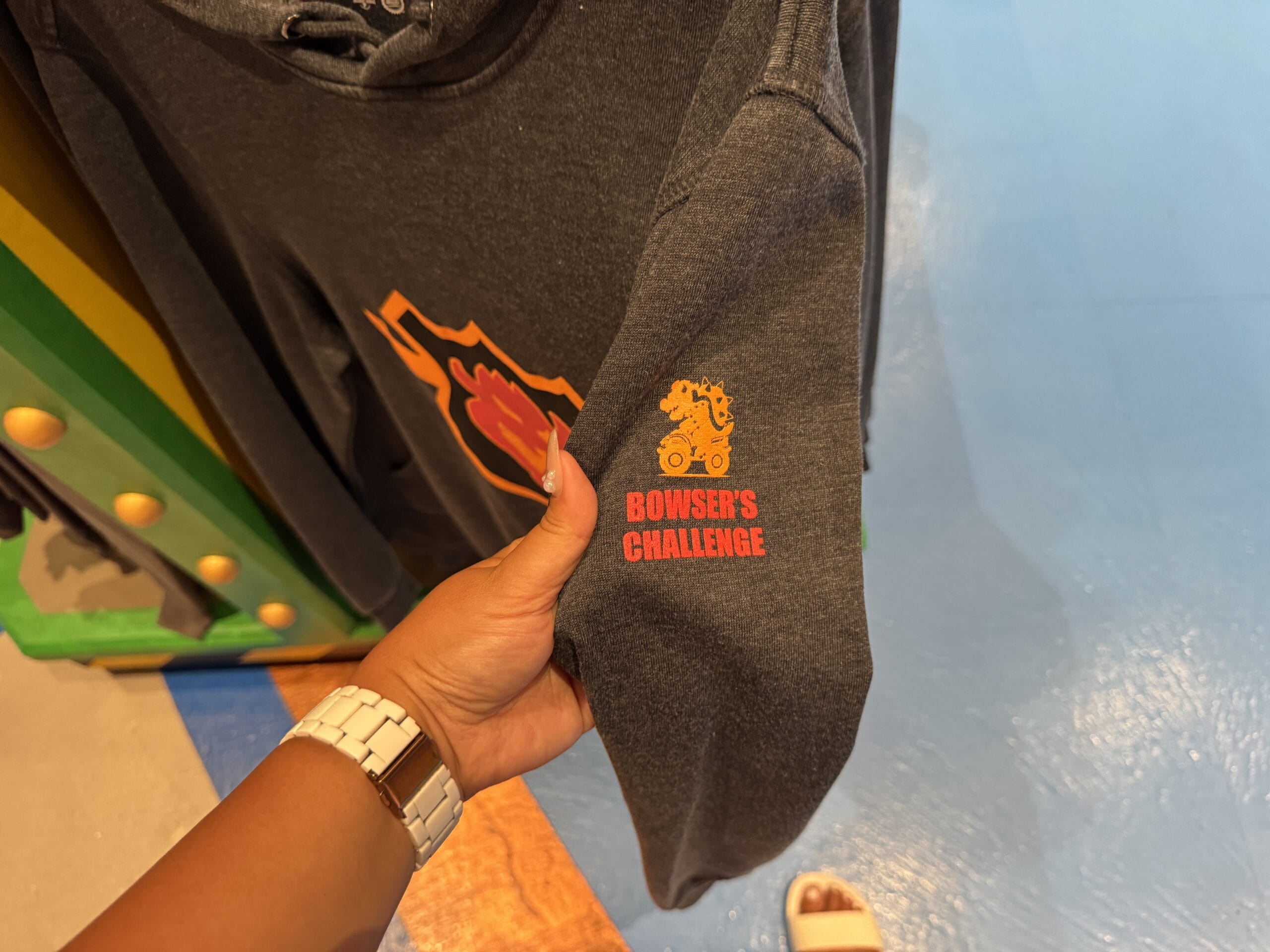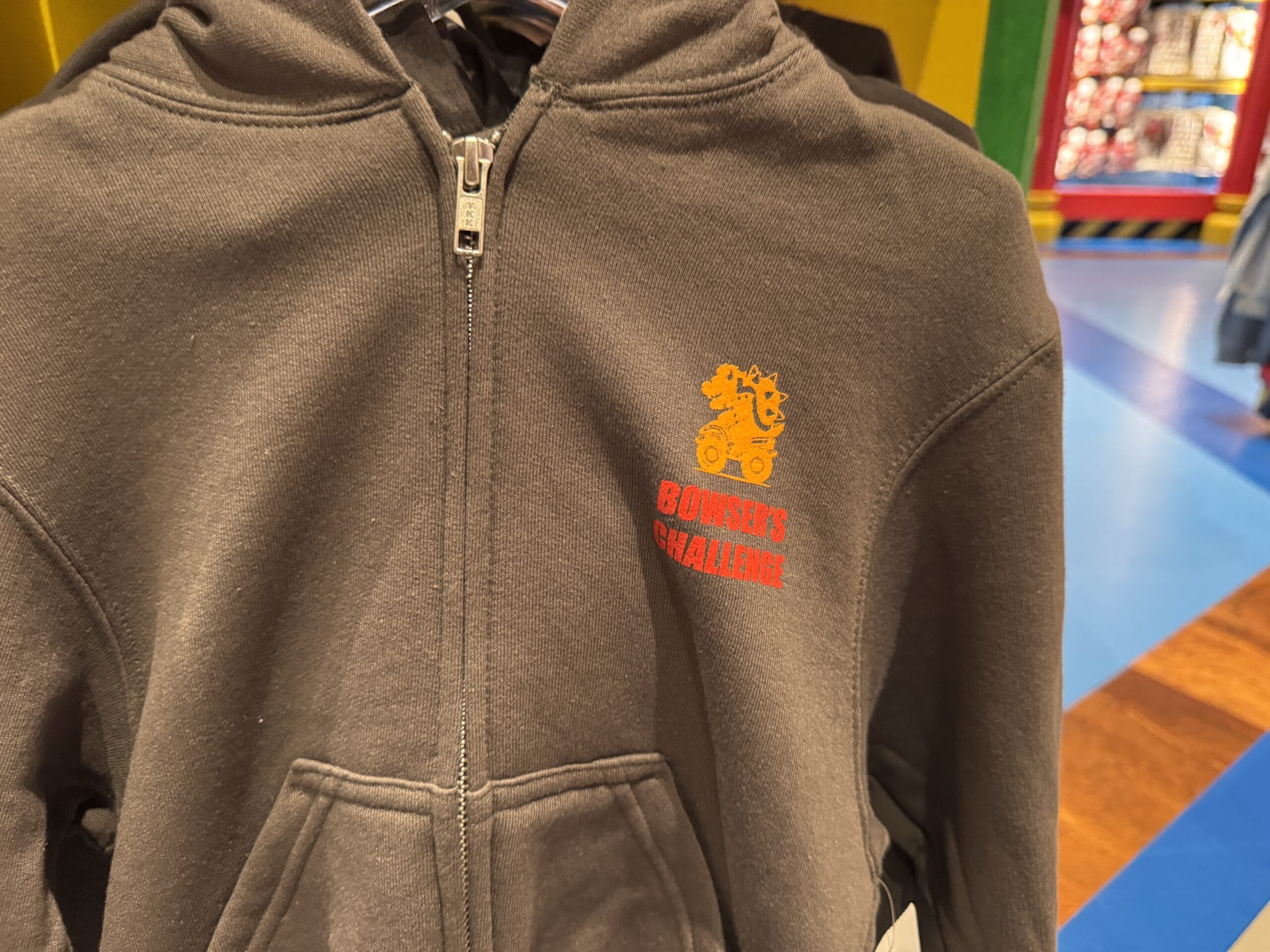 An orange image of Bowser is above red “Bowser’s Challenge” text on the left chest of this hoodie. It zips up and has two front pockets. The Bowser’s Challenge emblem, with his red face in the center of a shield icon, is on the back.