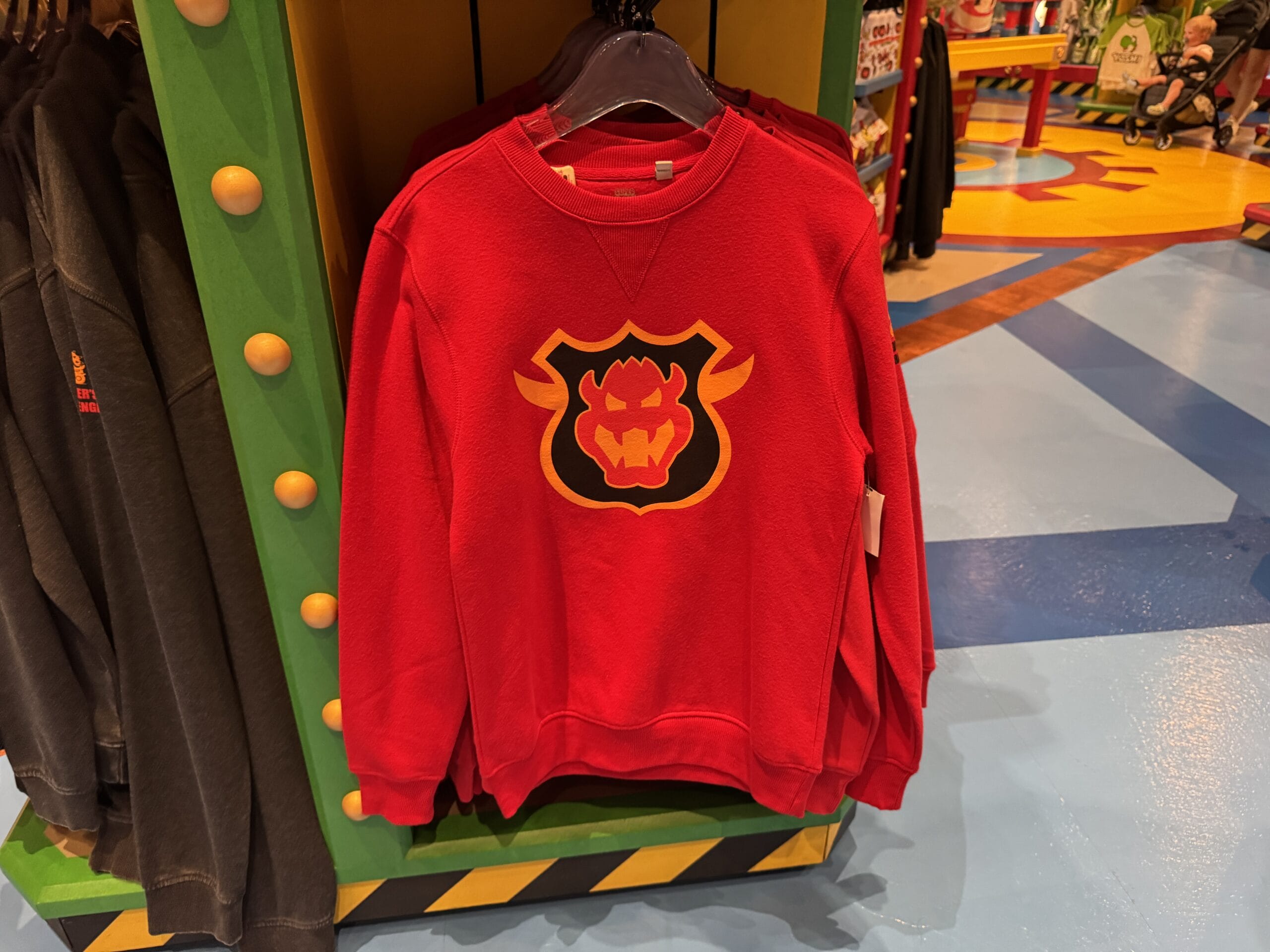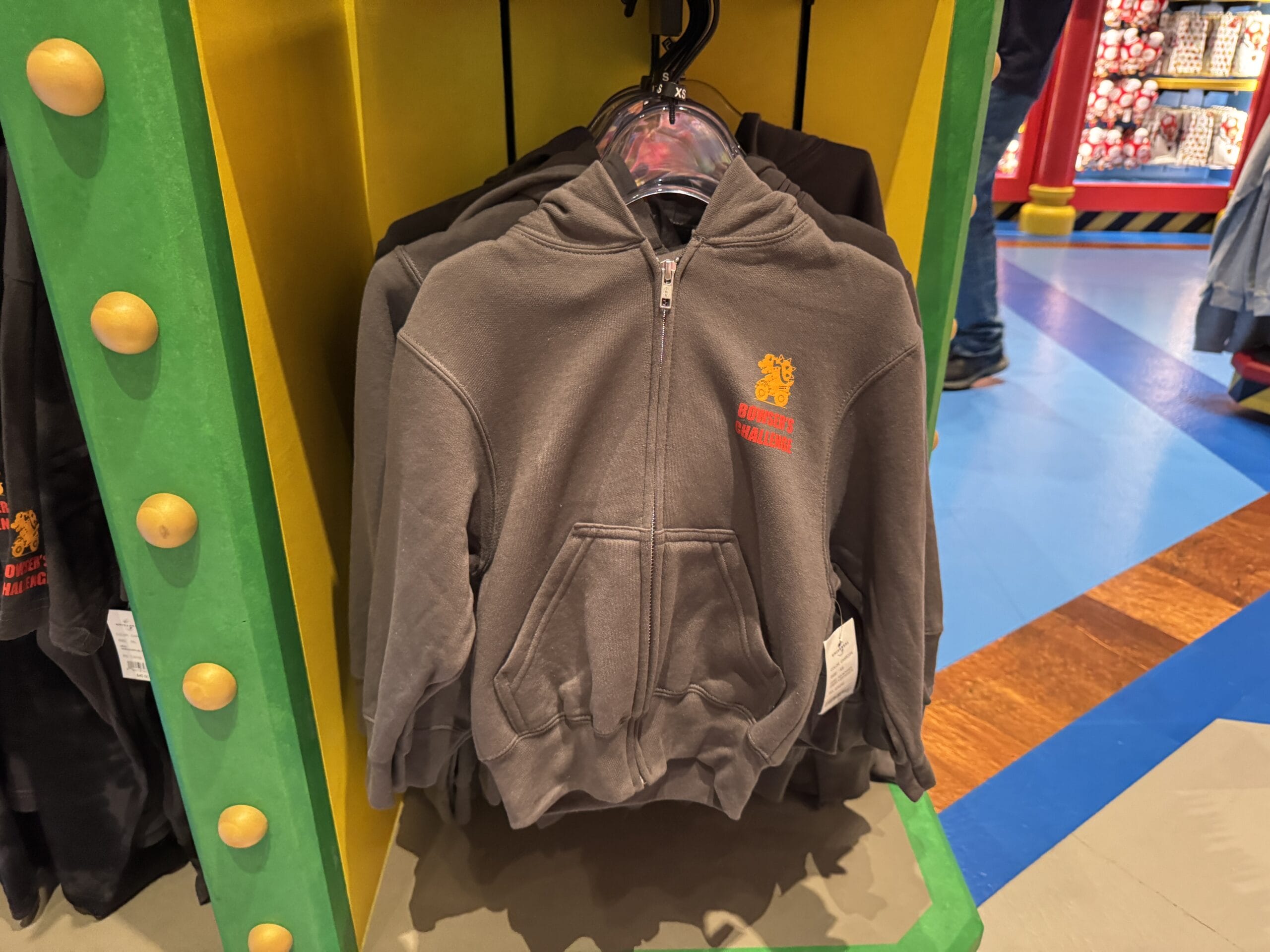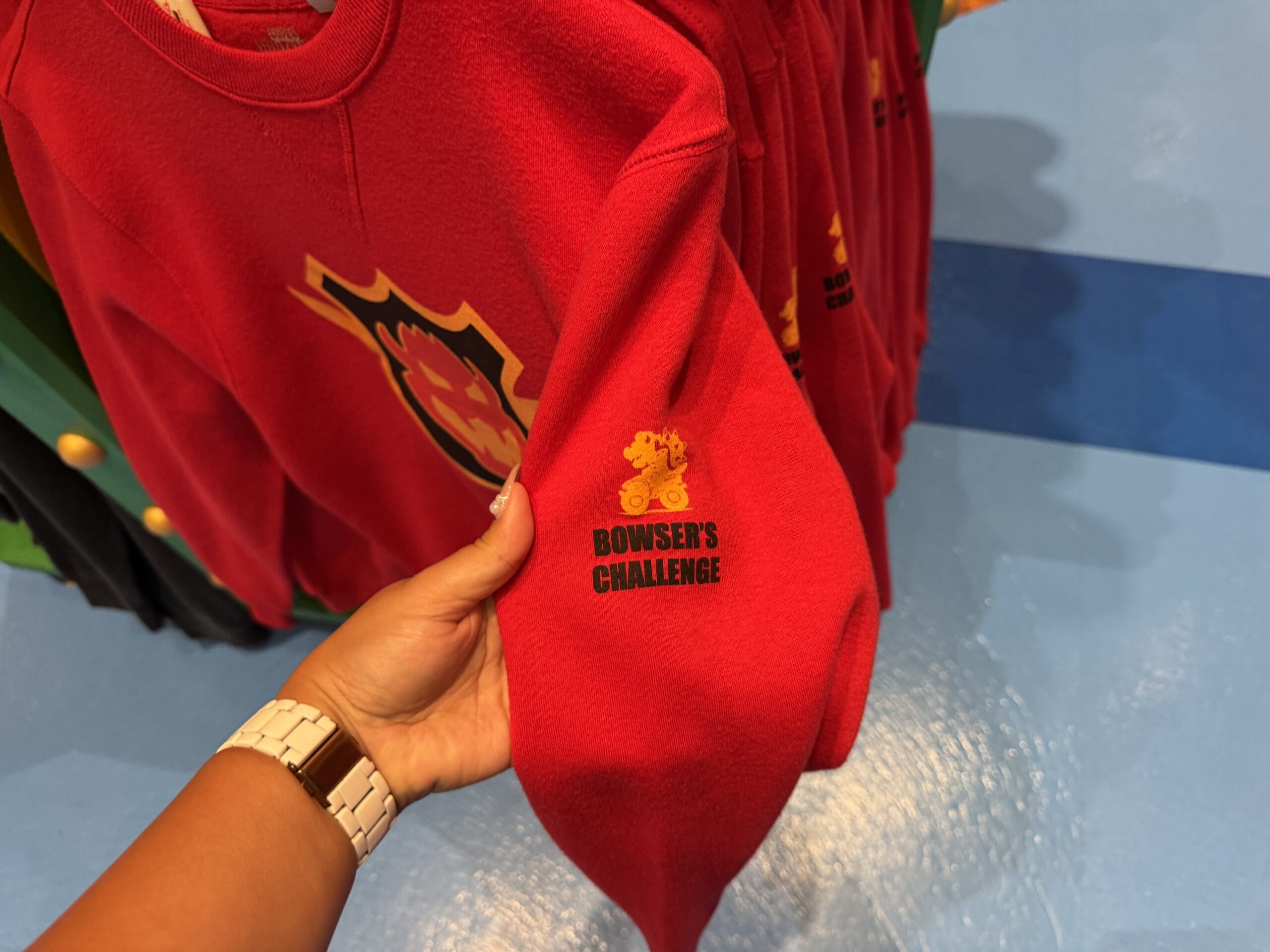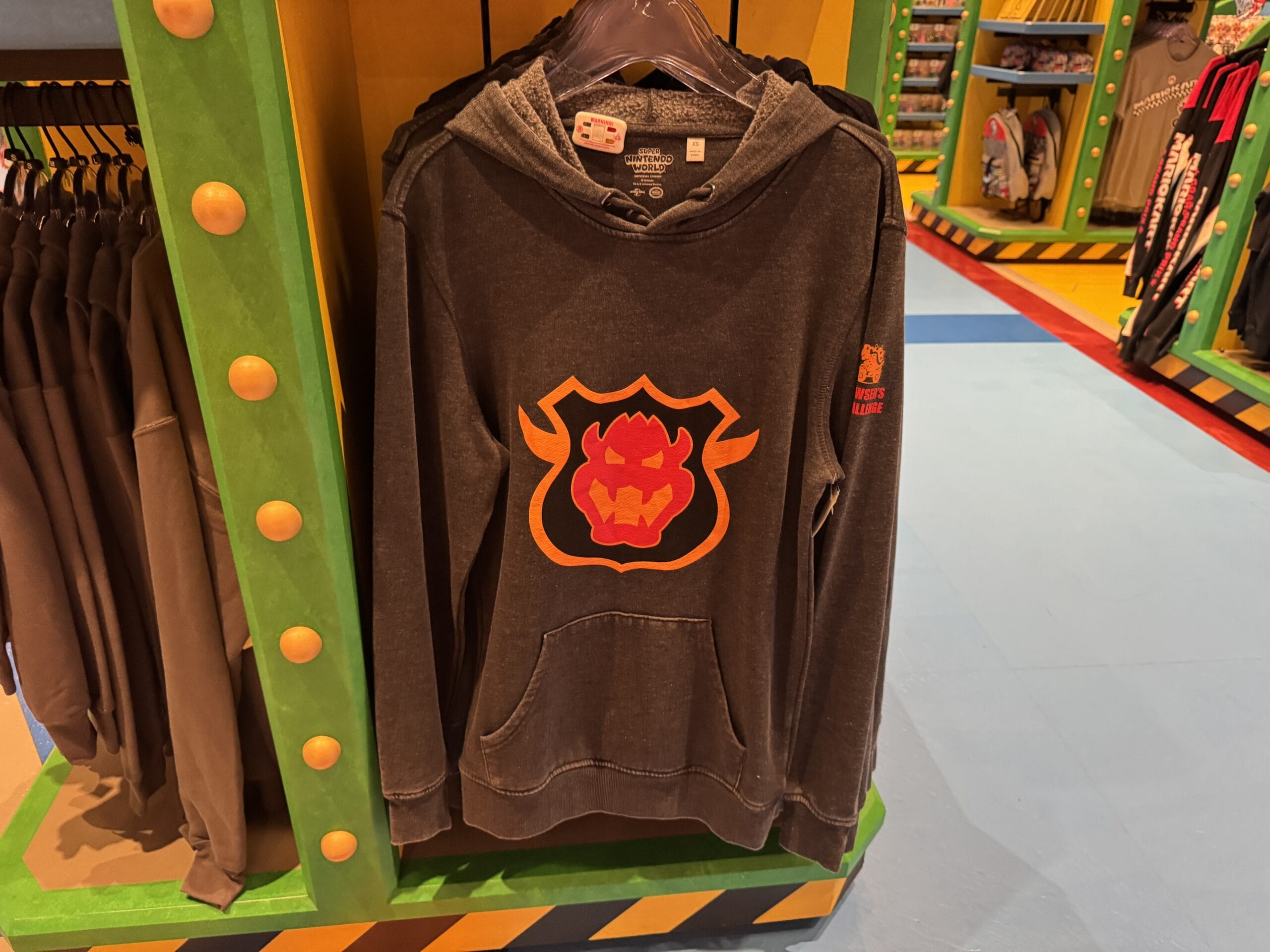An orange image of Bowser is above red “Bowser’s Challenge” text on the left chest of this hoodie. It zips up and has two front pockets. The Bowser’s Challenge emblem, with his red face in the center of a shield icon, is on the back.