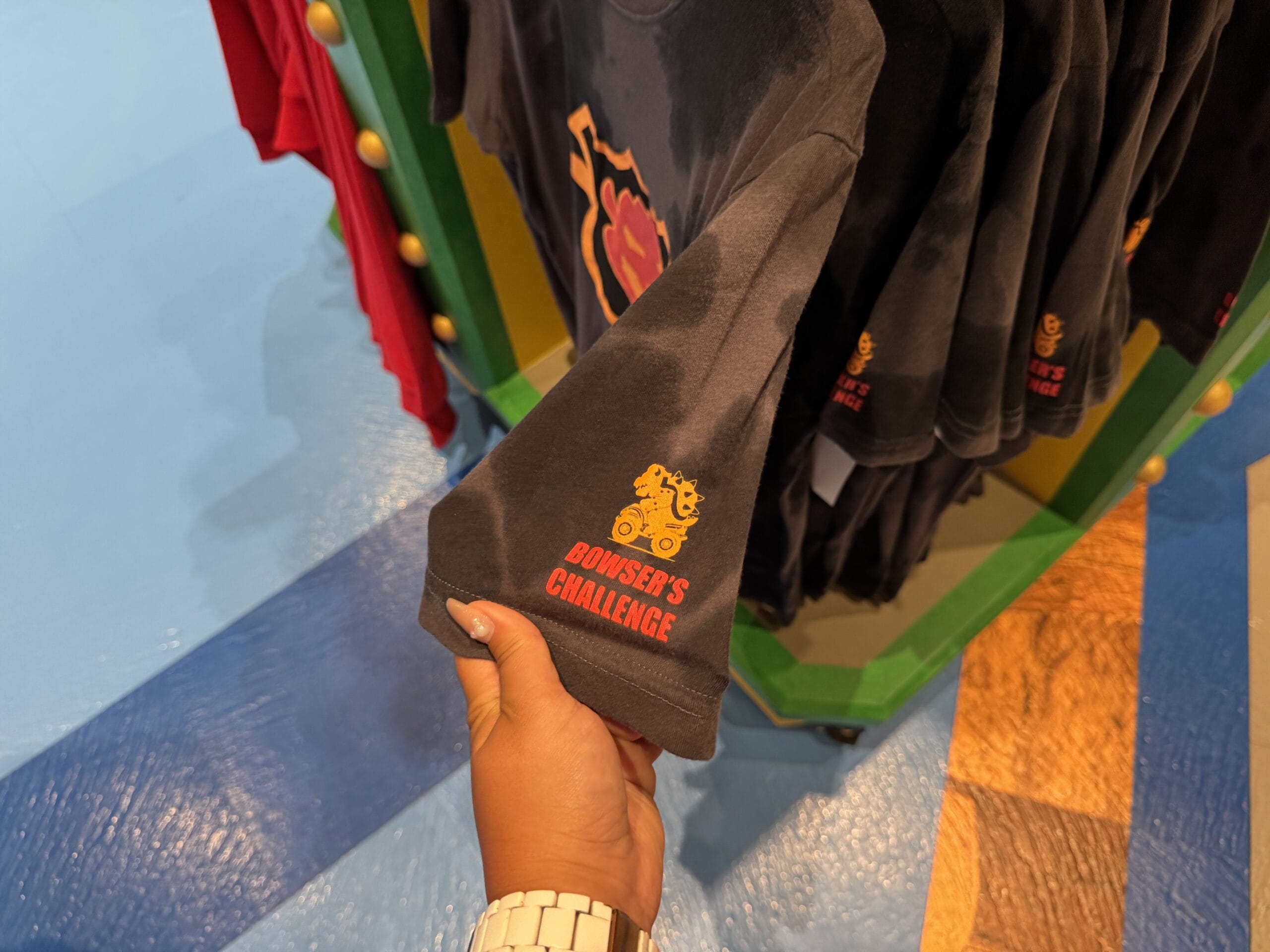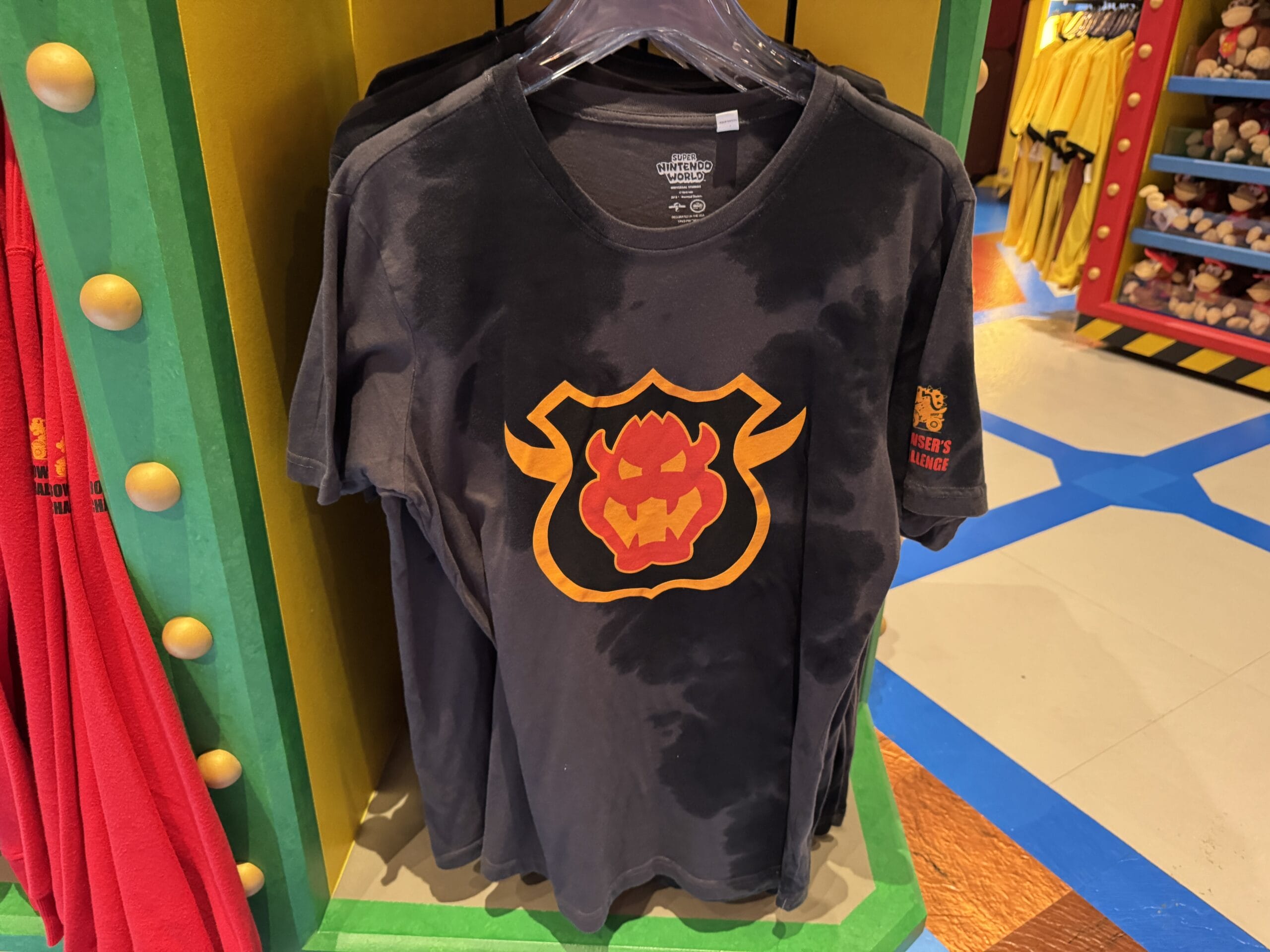 This tee has a black and gray tie dye pattern. Bowser’s gold and red shield emblem is on the chest. “Bowser’s Challenge” is on the left sleeve with an image of Bowser on his kart.