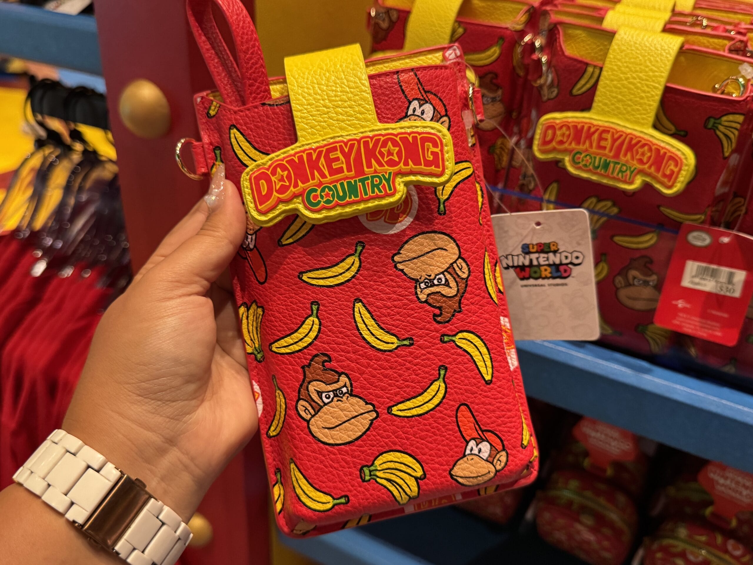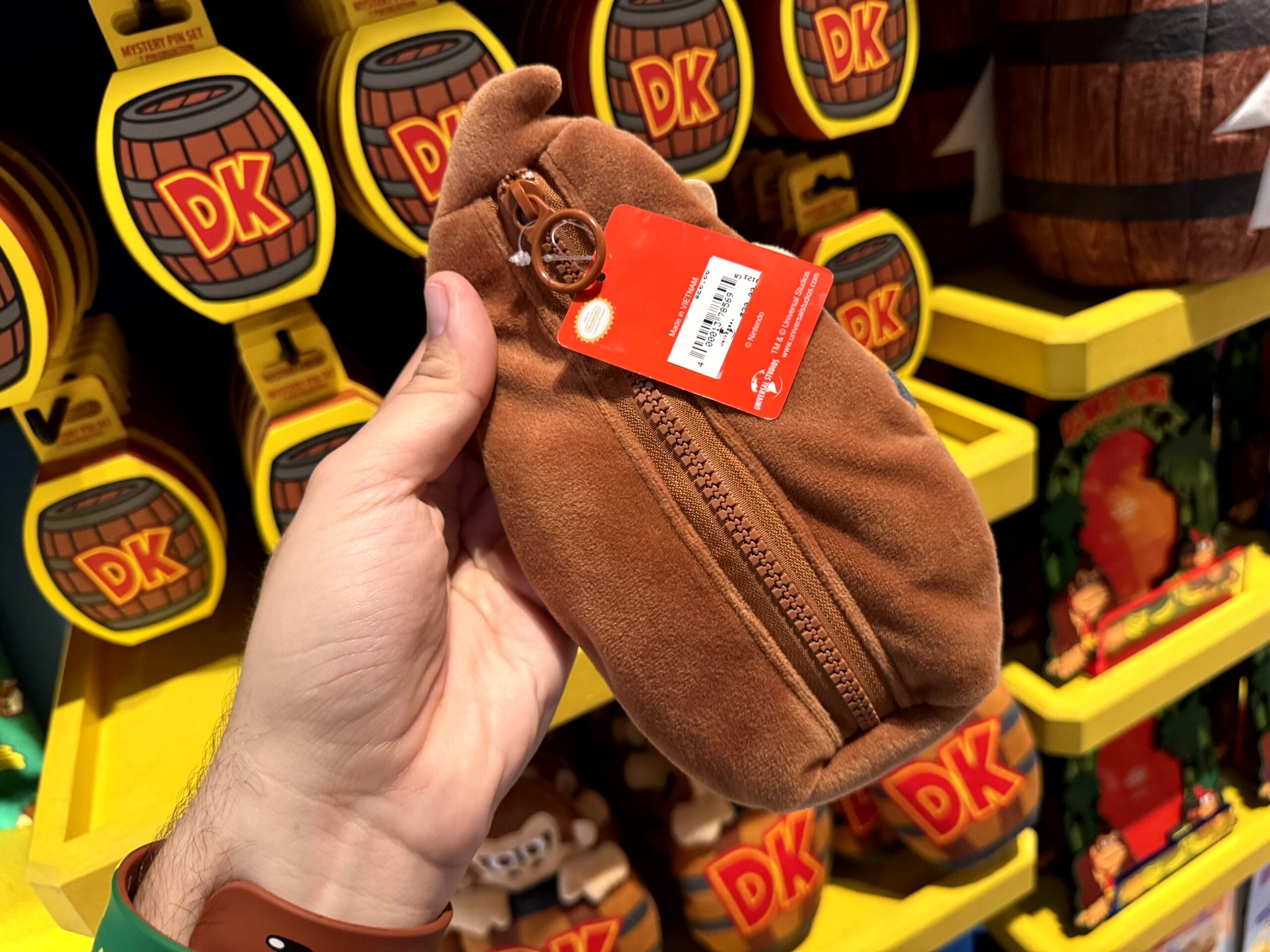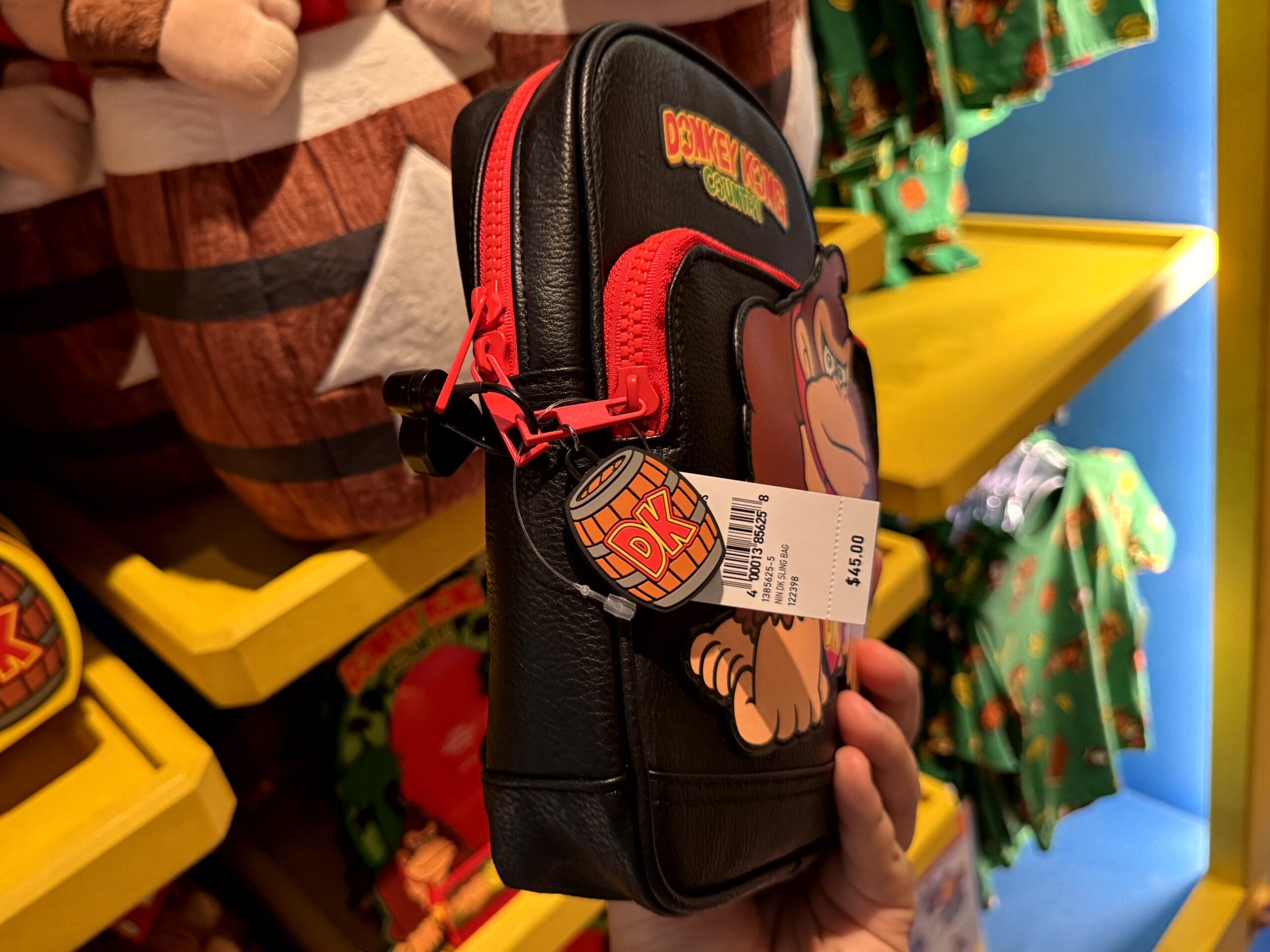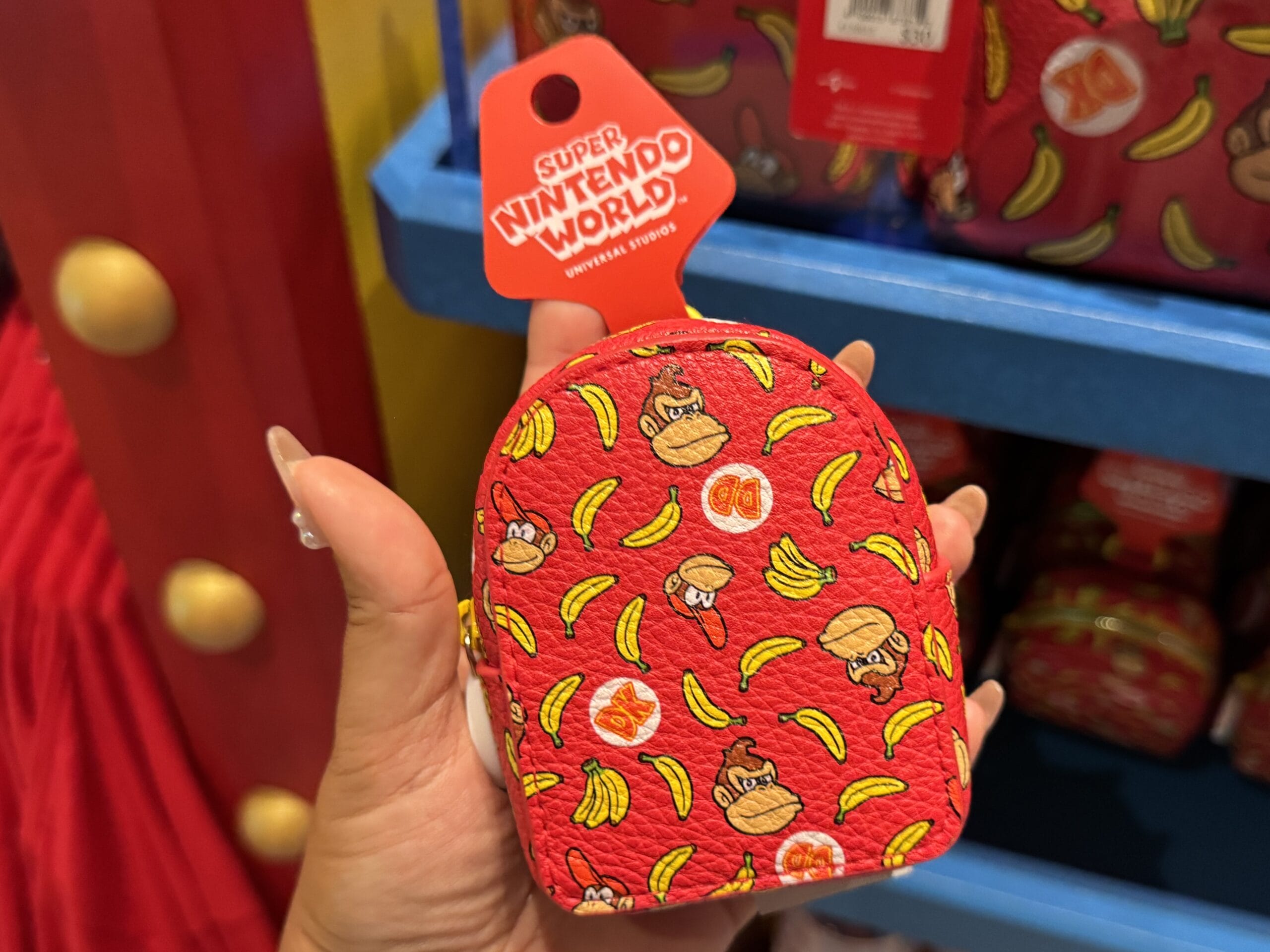 This is a red zip pouch patterned all over with bananas, “DK,” “DD,” Donkey Kong’s face, and Diddy Kong’s face.