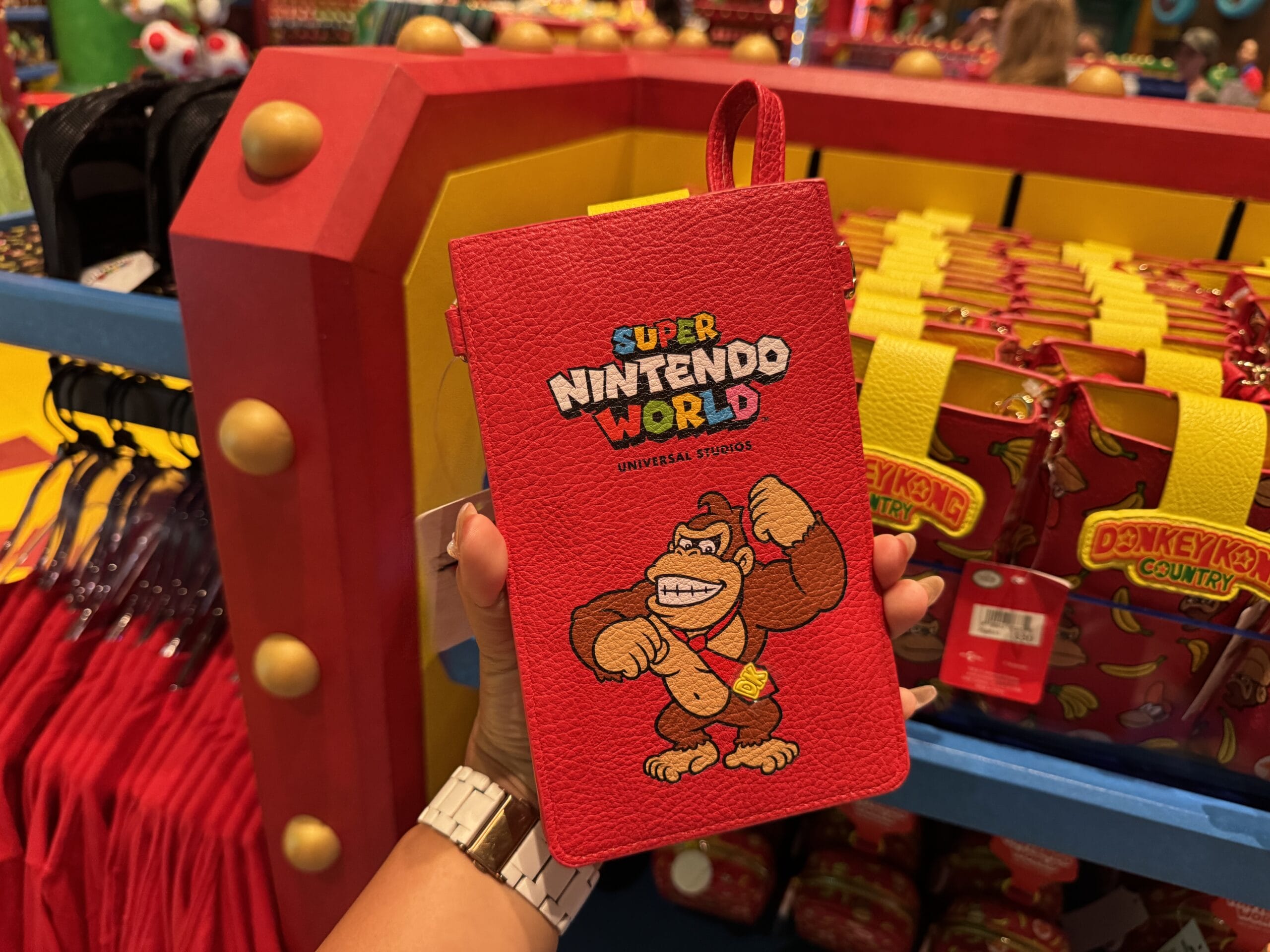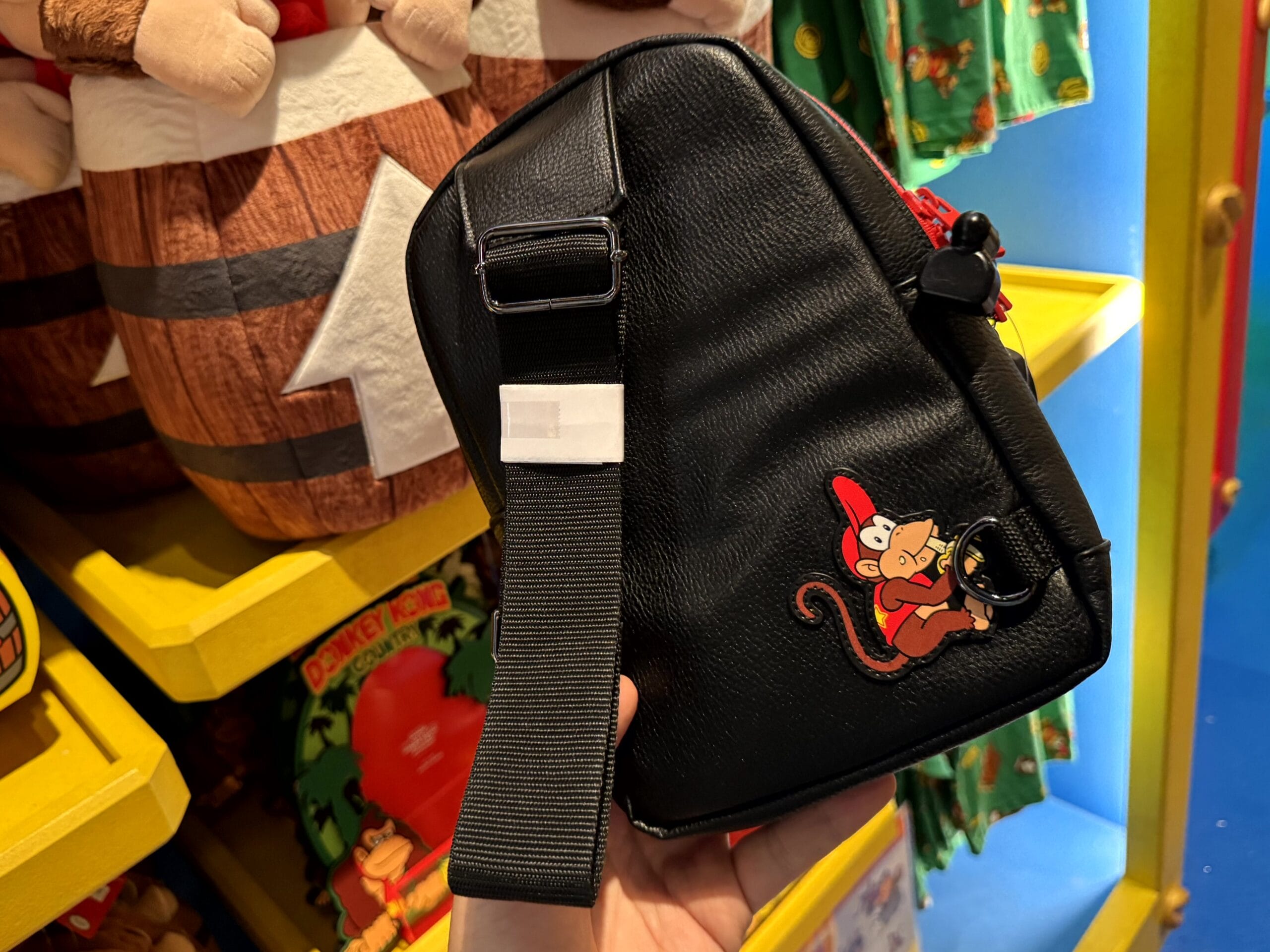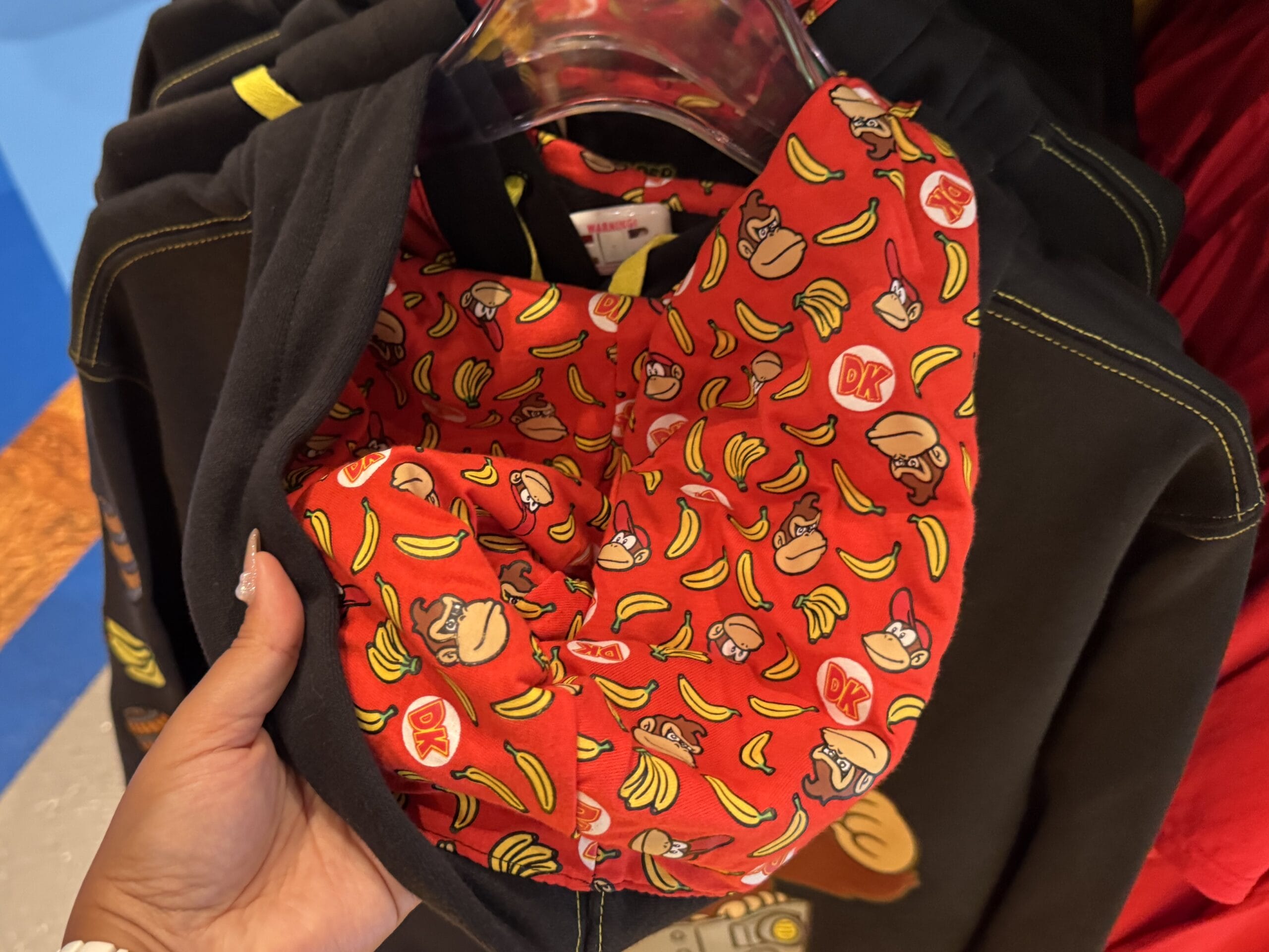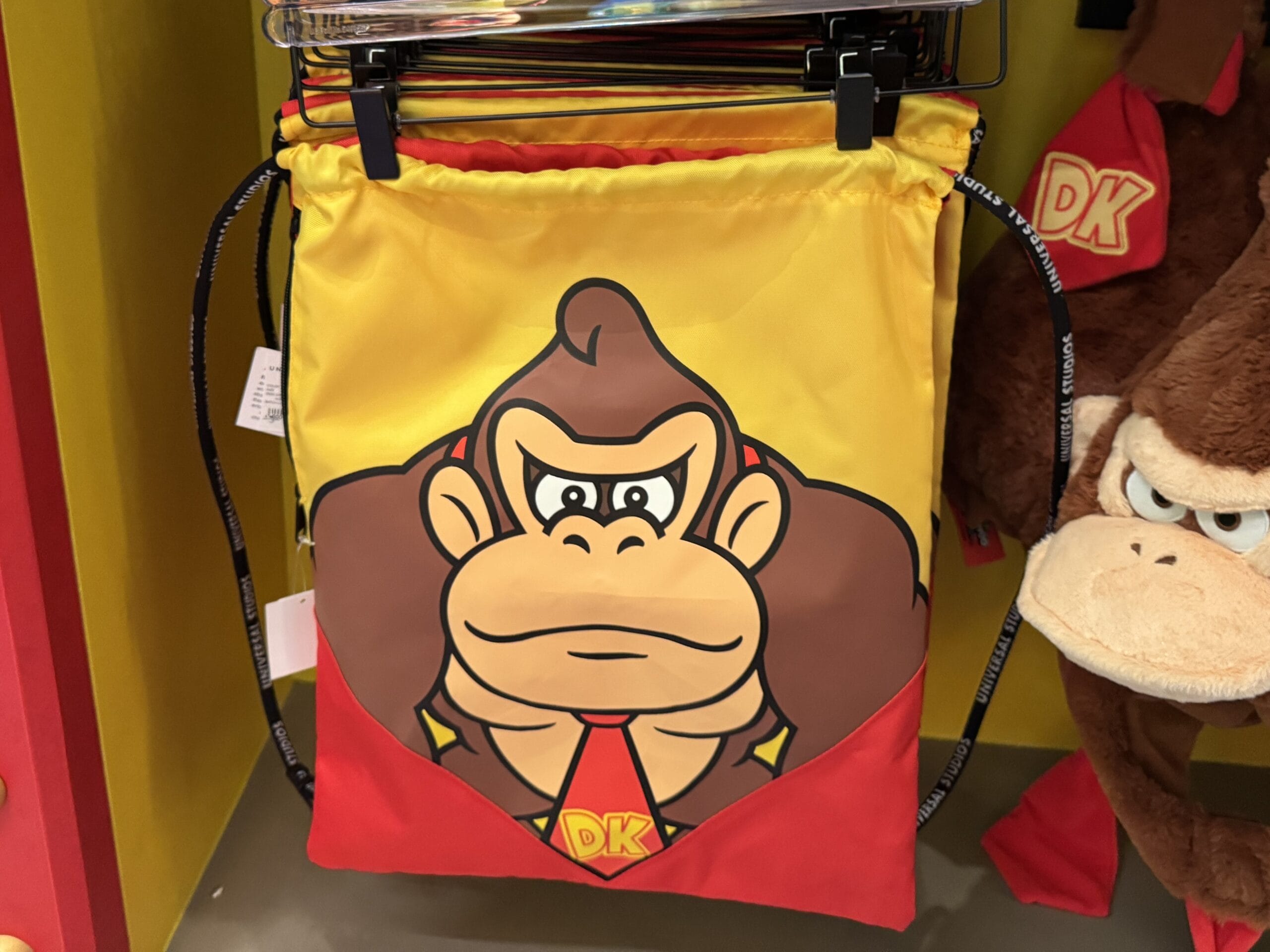 This is a red zip pouch patterned all over with bananas, “DK,” “DD,” Donkey Kong’s face, and Diddy Kong’s face.