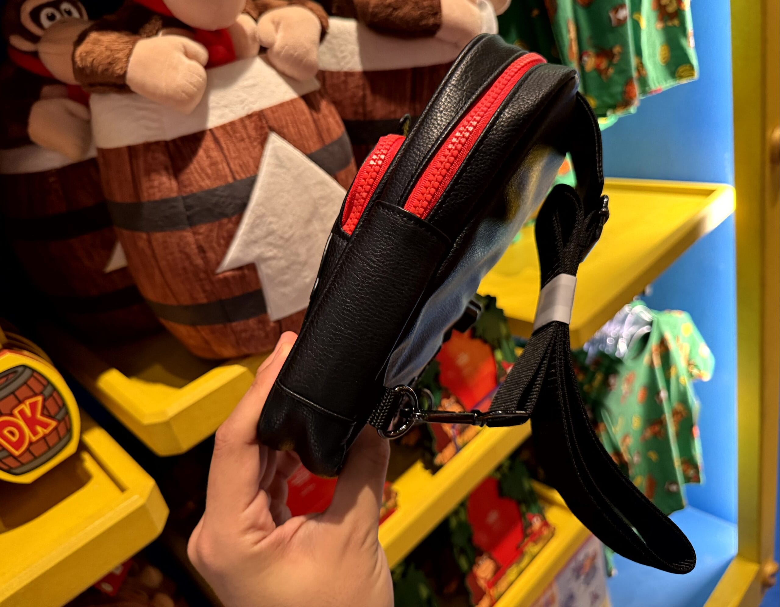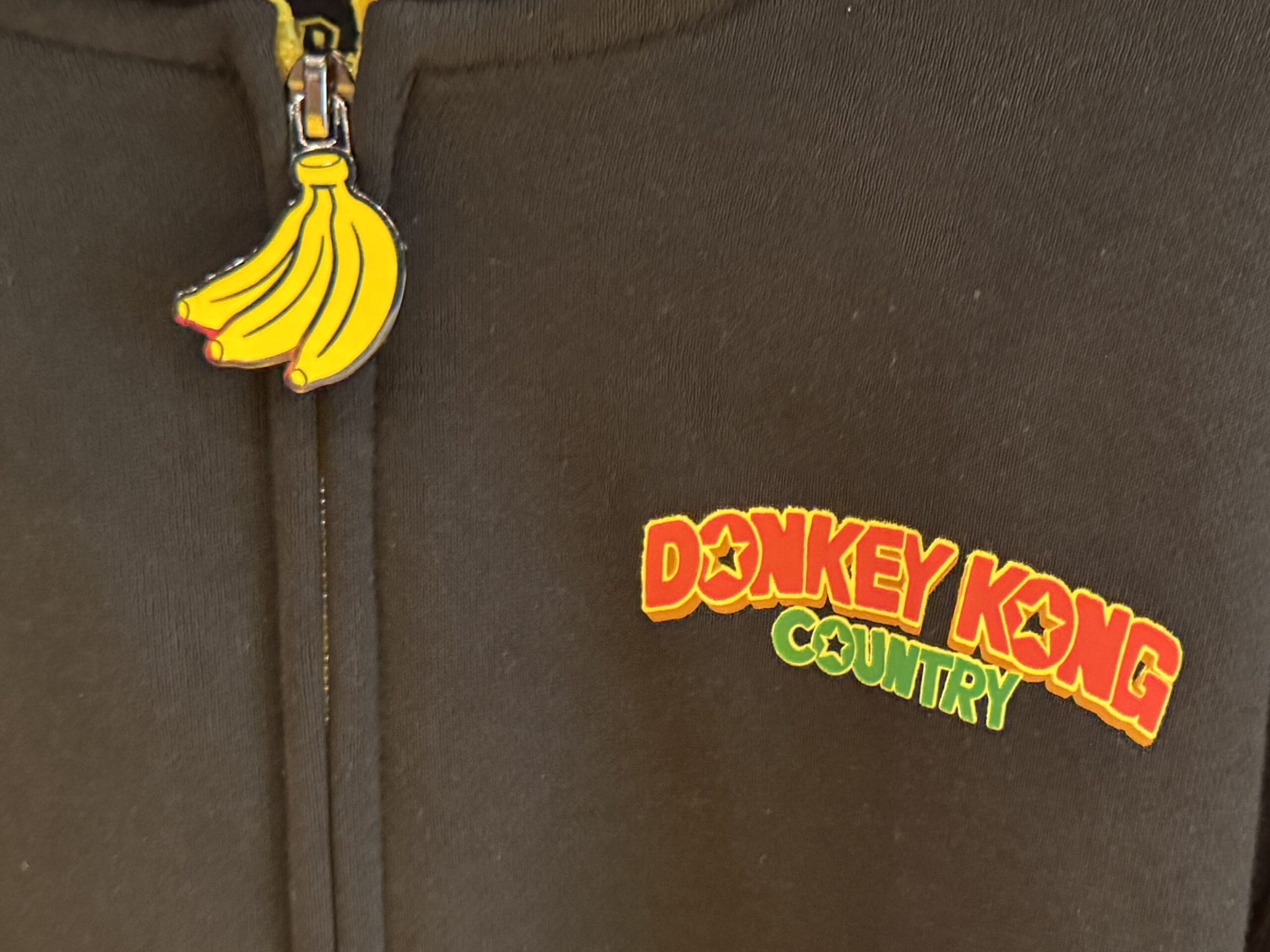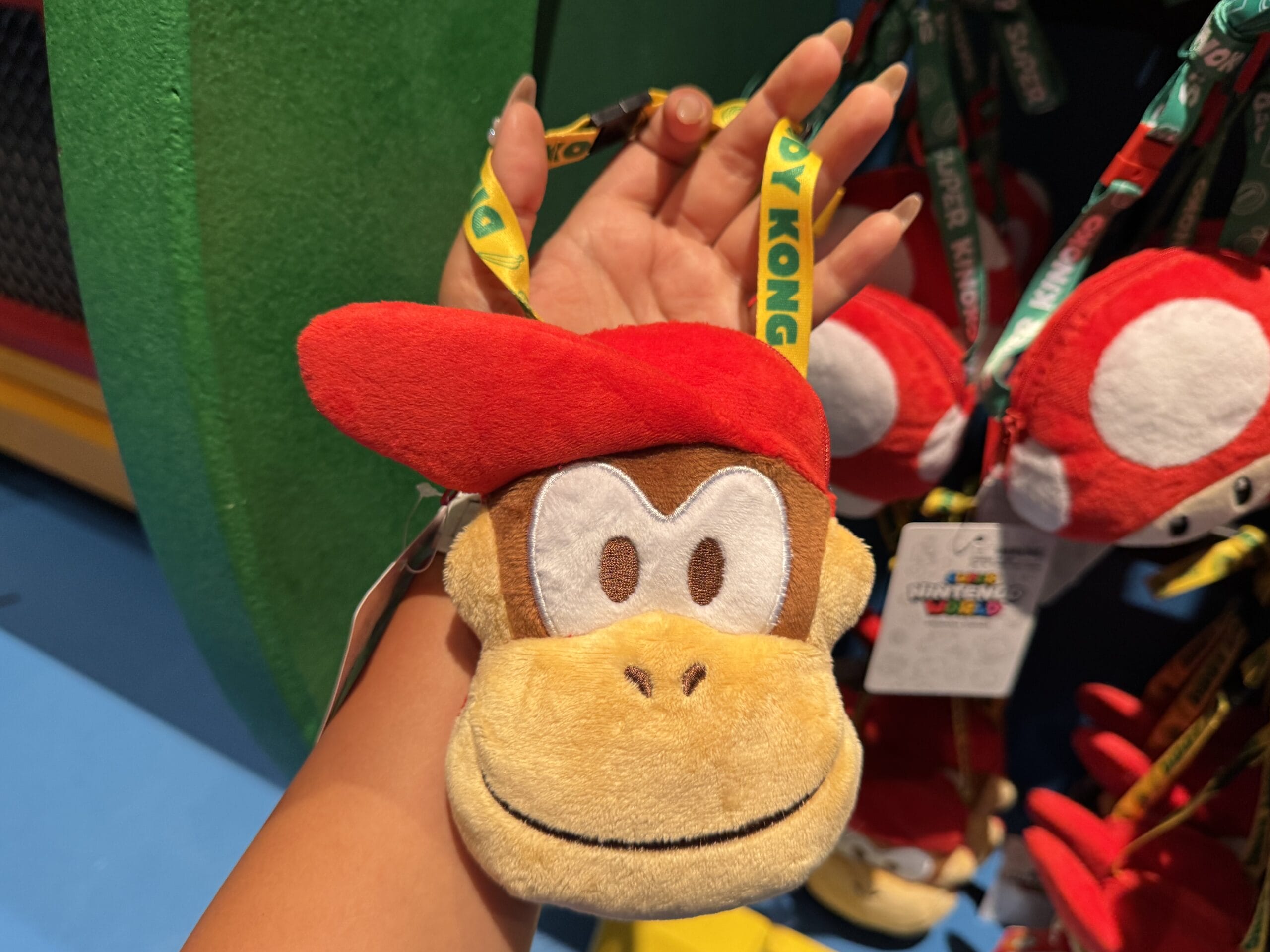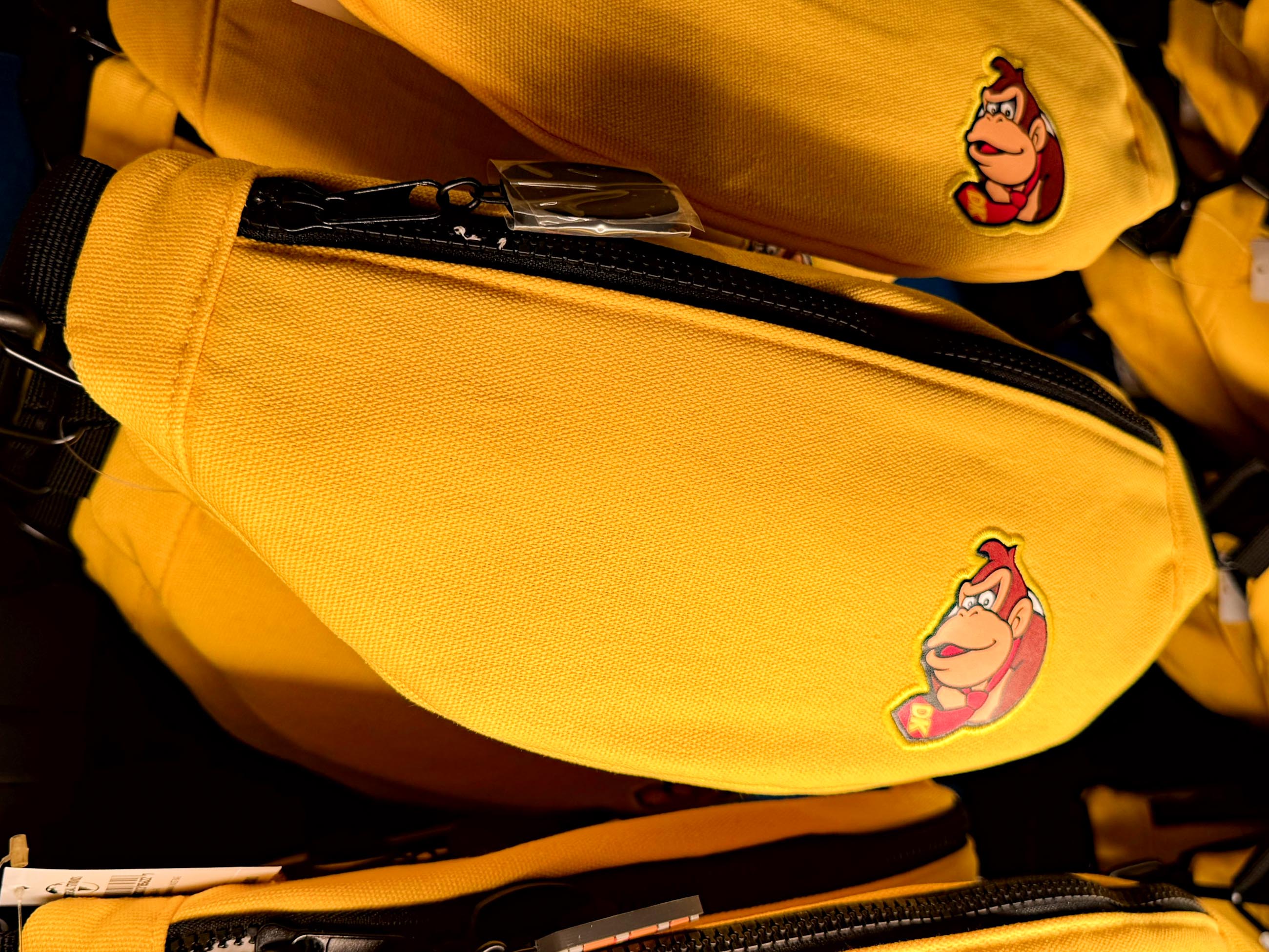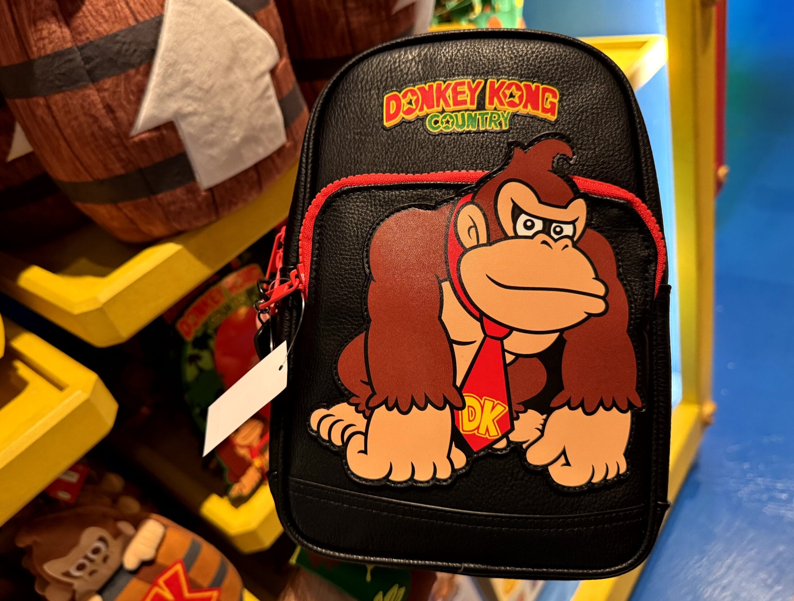 This is a red zip pouch patterned all over with bananas, “DK,” “DD,” Donkey Kong’s face, and Diddy Kong’s face.