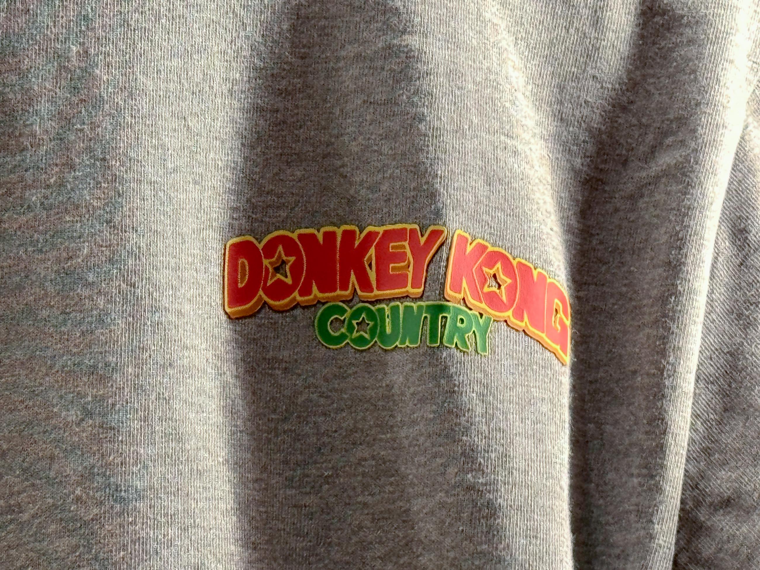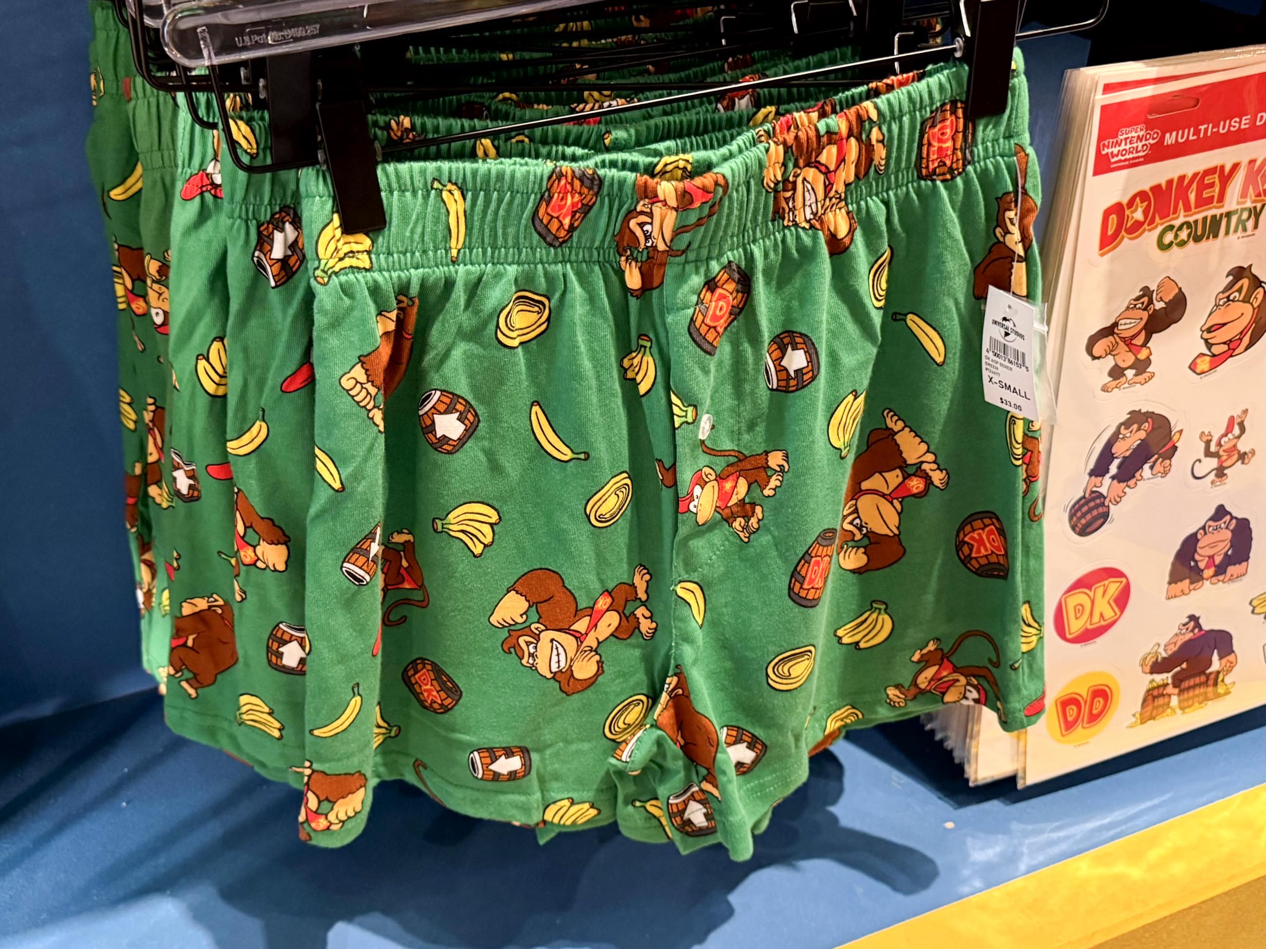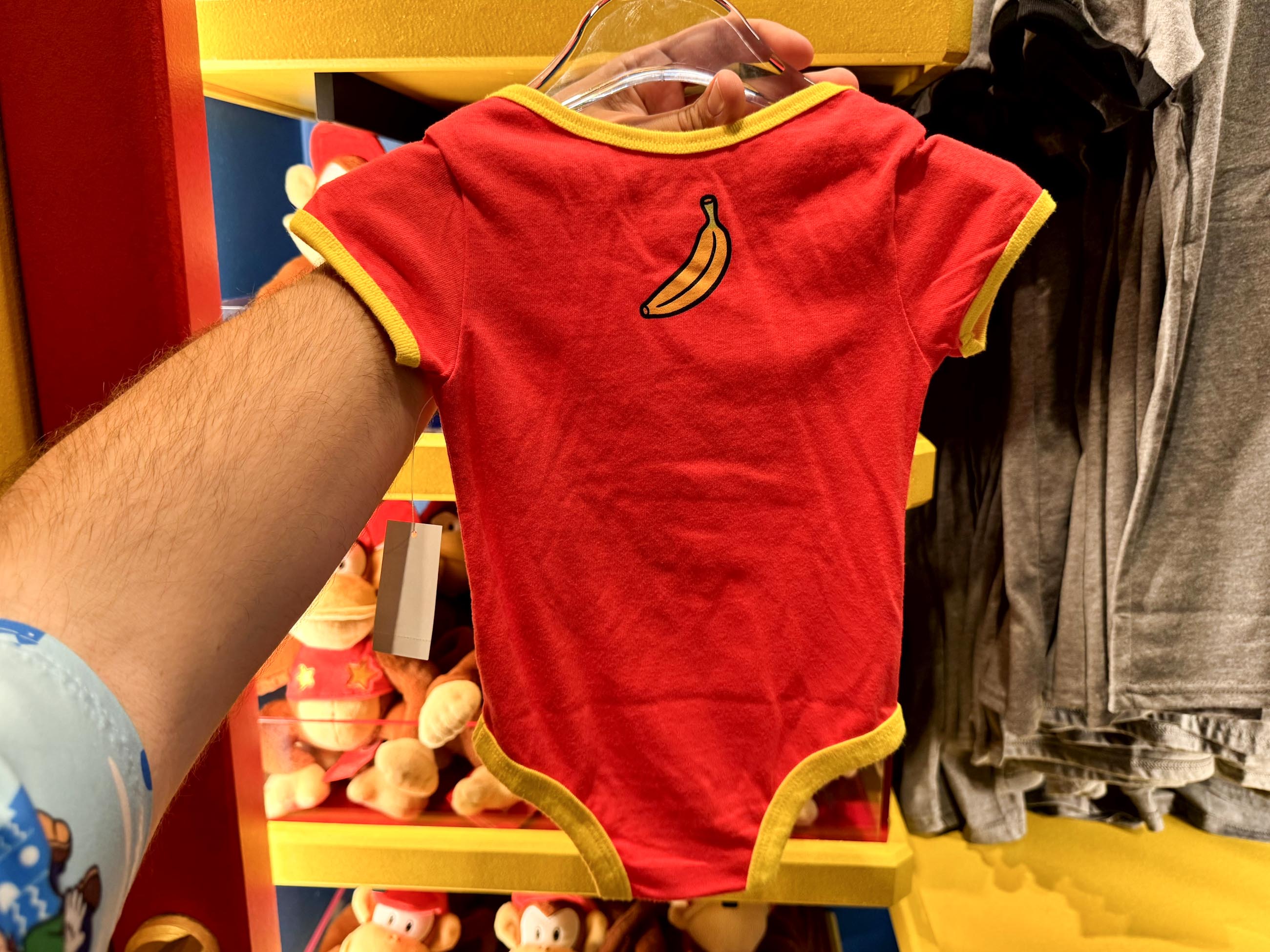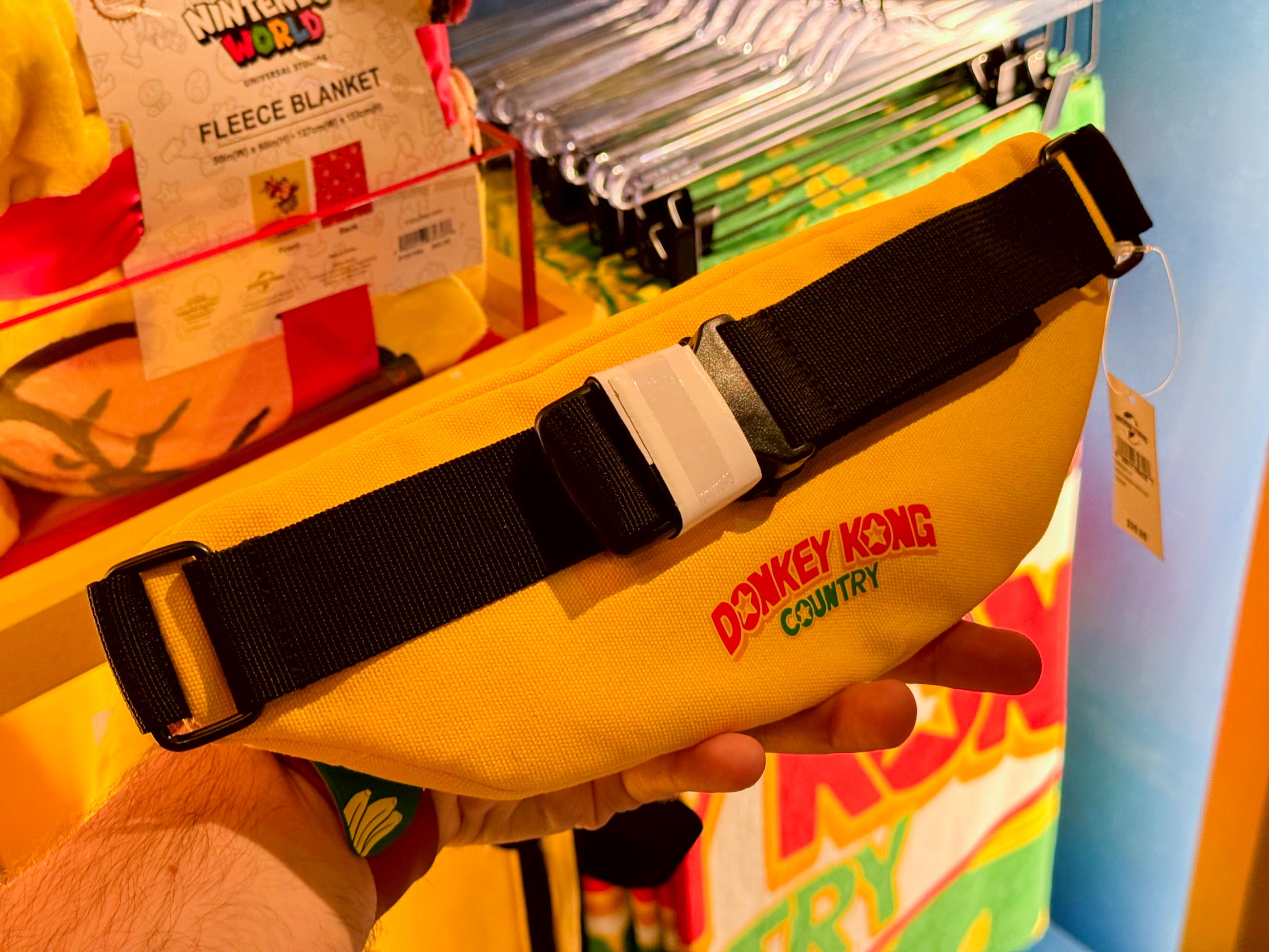 This is a red zip pouch patterned all over with bananas, “DK,” “DD,” Donkey Kong’s face, and Diddy Kong’s face.