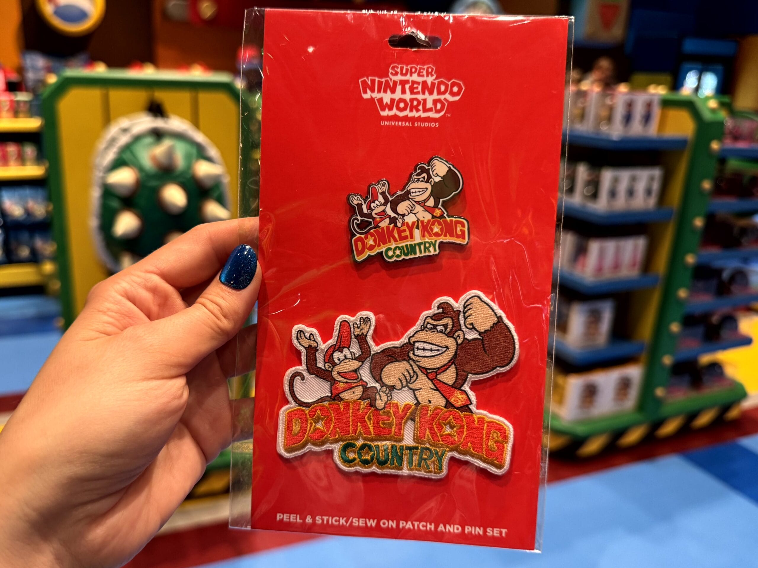 This set includes one enamel pin and one patch, which is peel and stick or sew-on. They have the same design: Diddy Kong and Donkey Kong above the Donkey Kong Country logo.