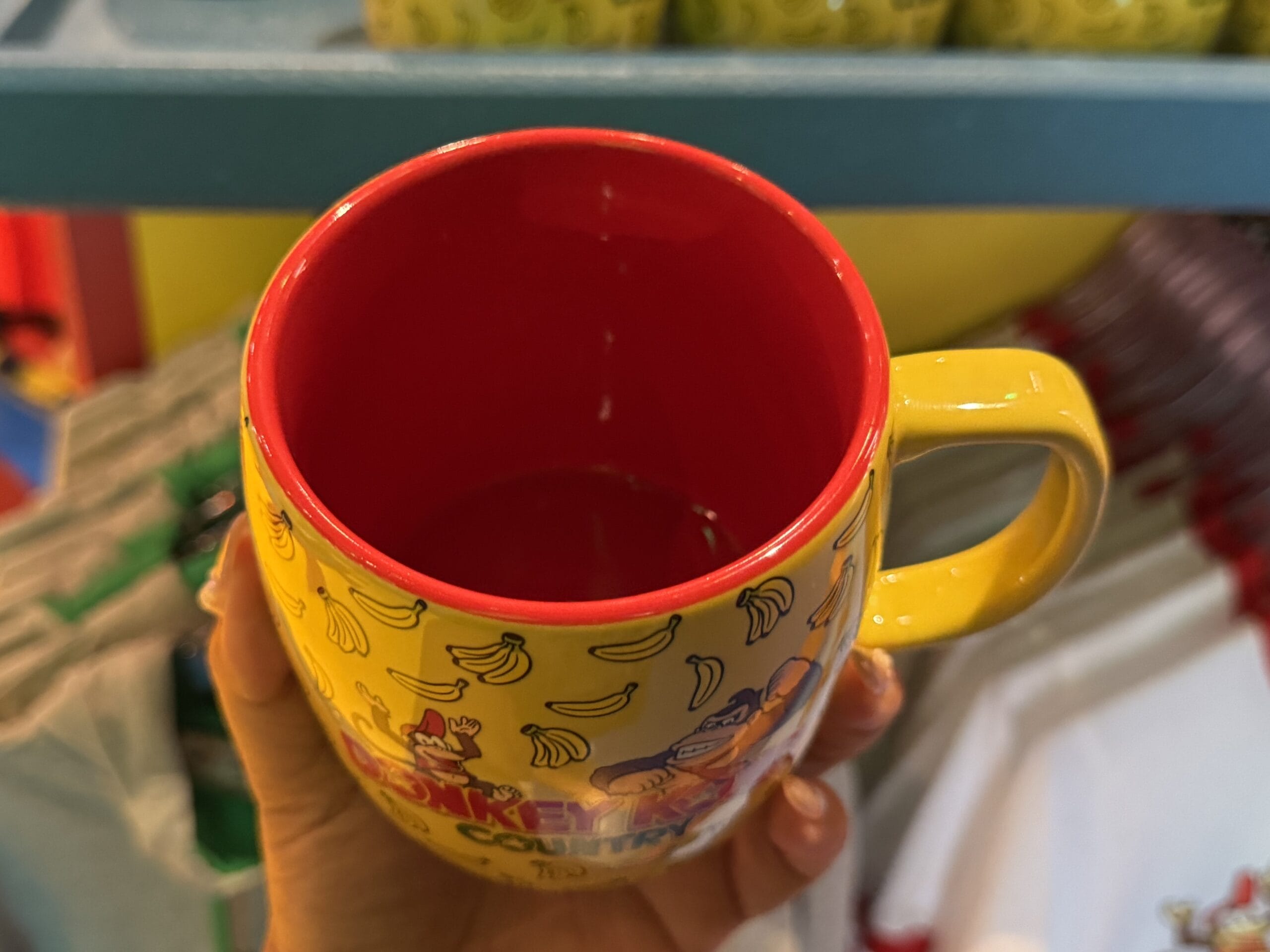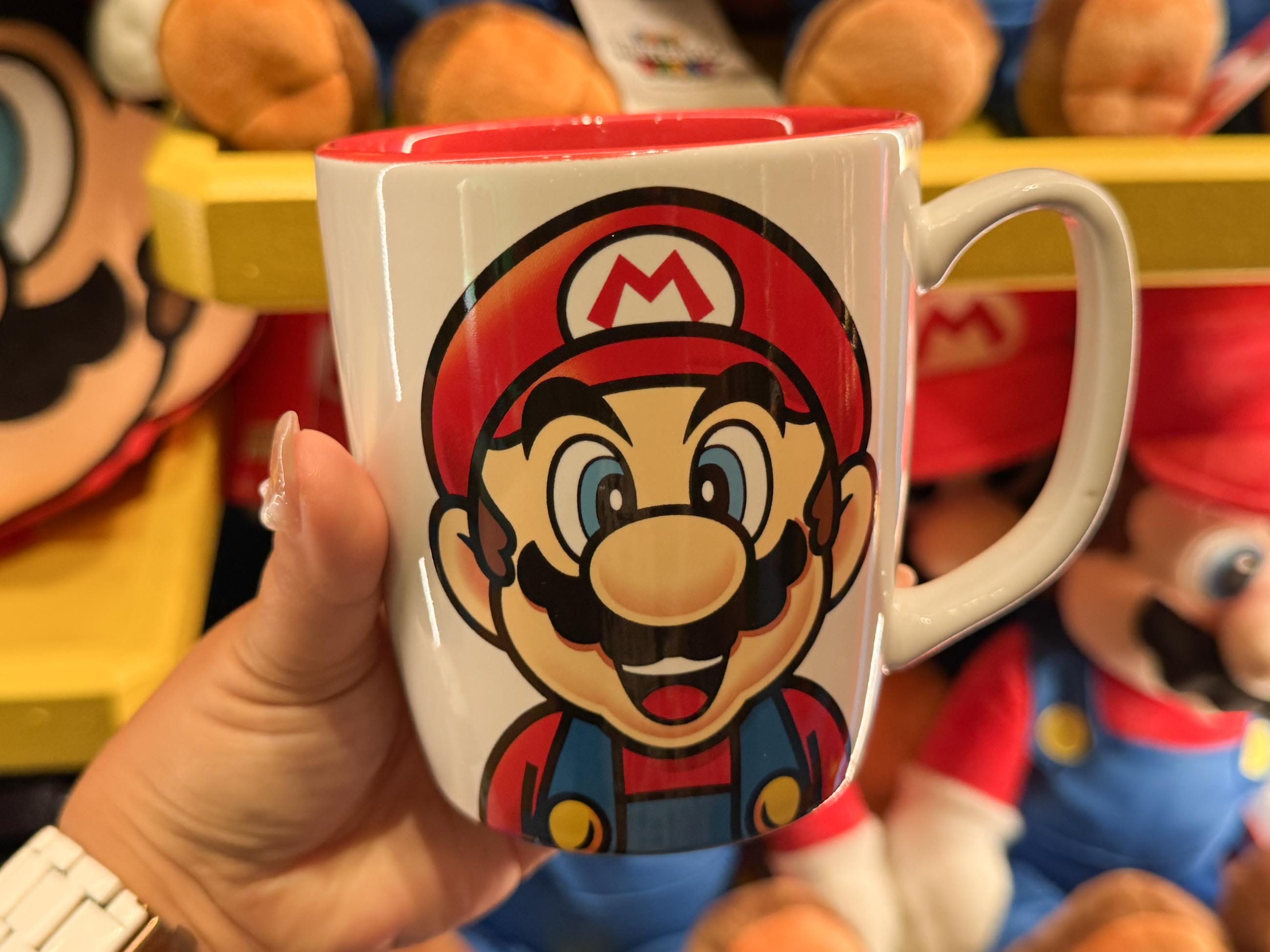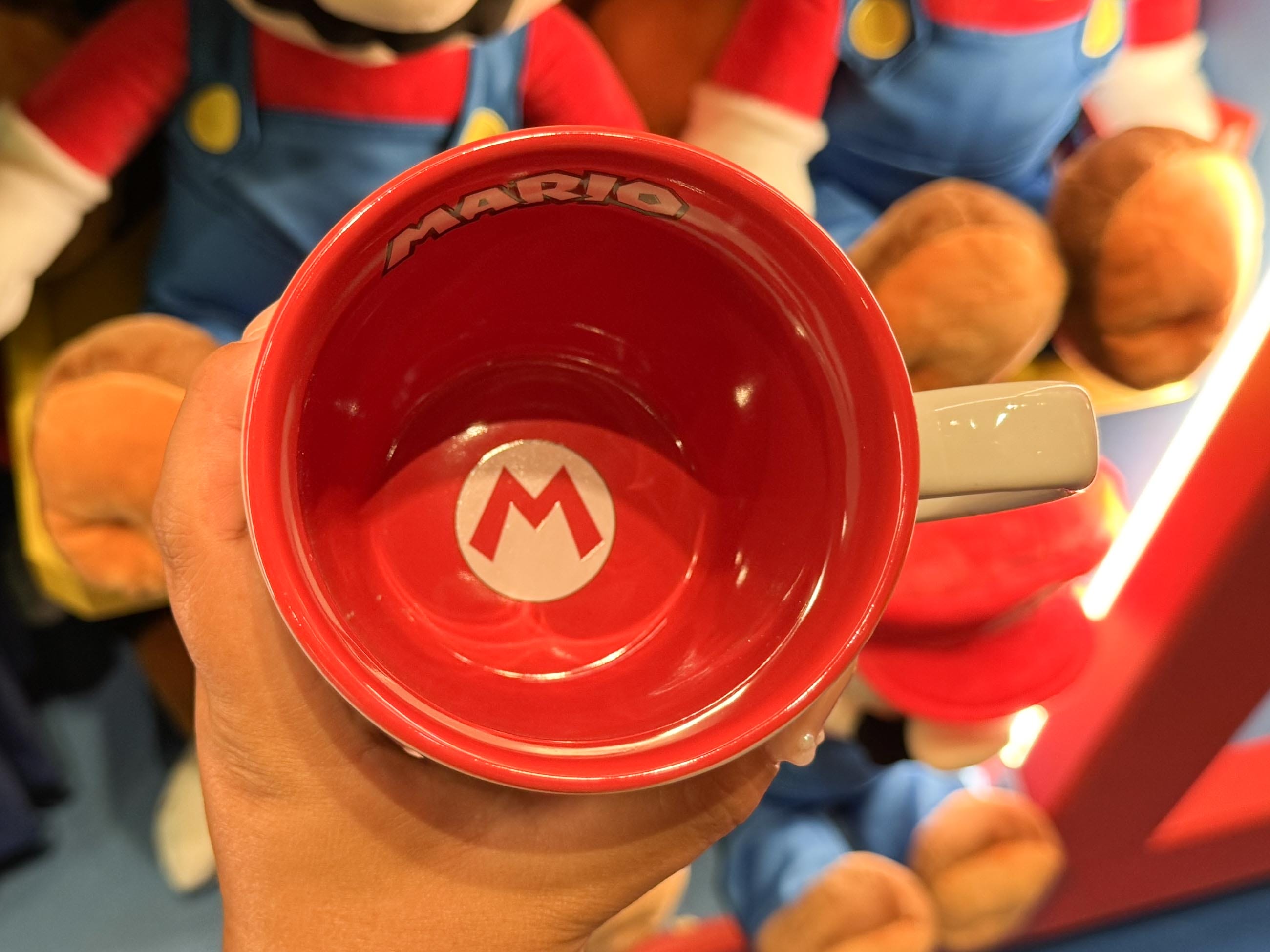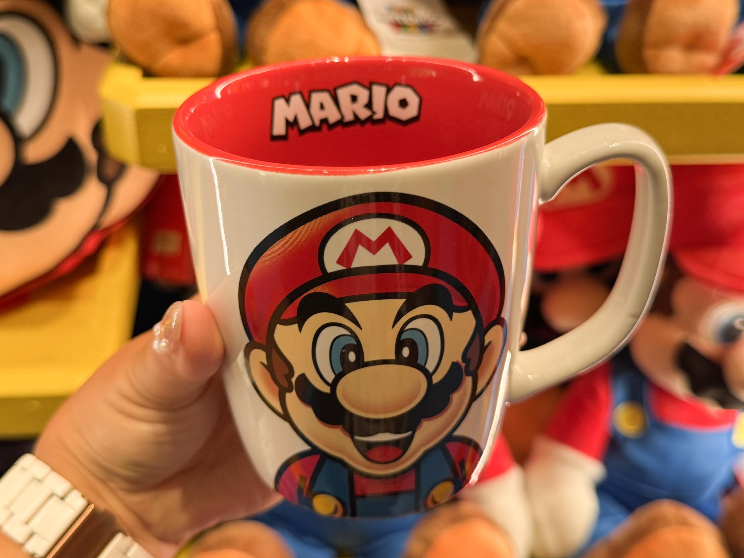 This mug is white. The Super Nintendo World is on both sides. The interior is red.