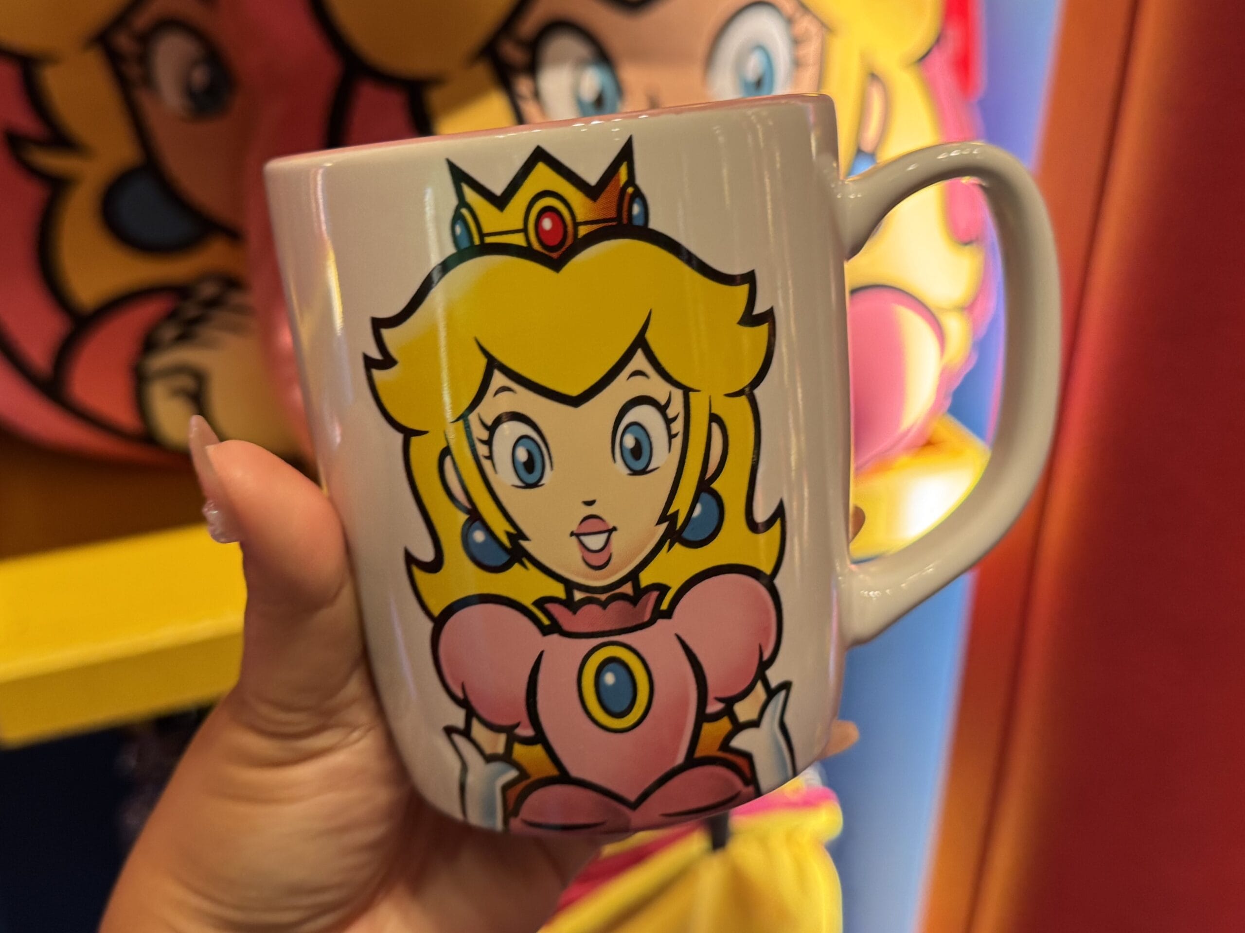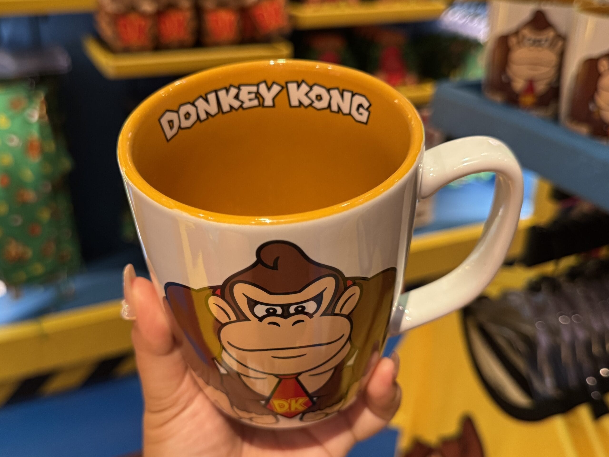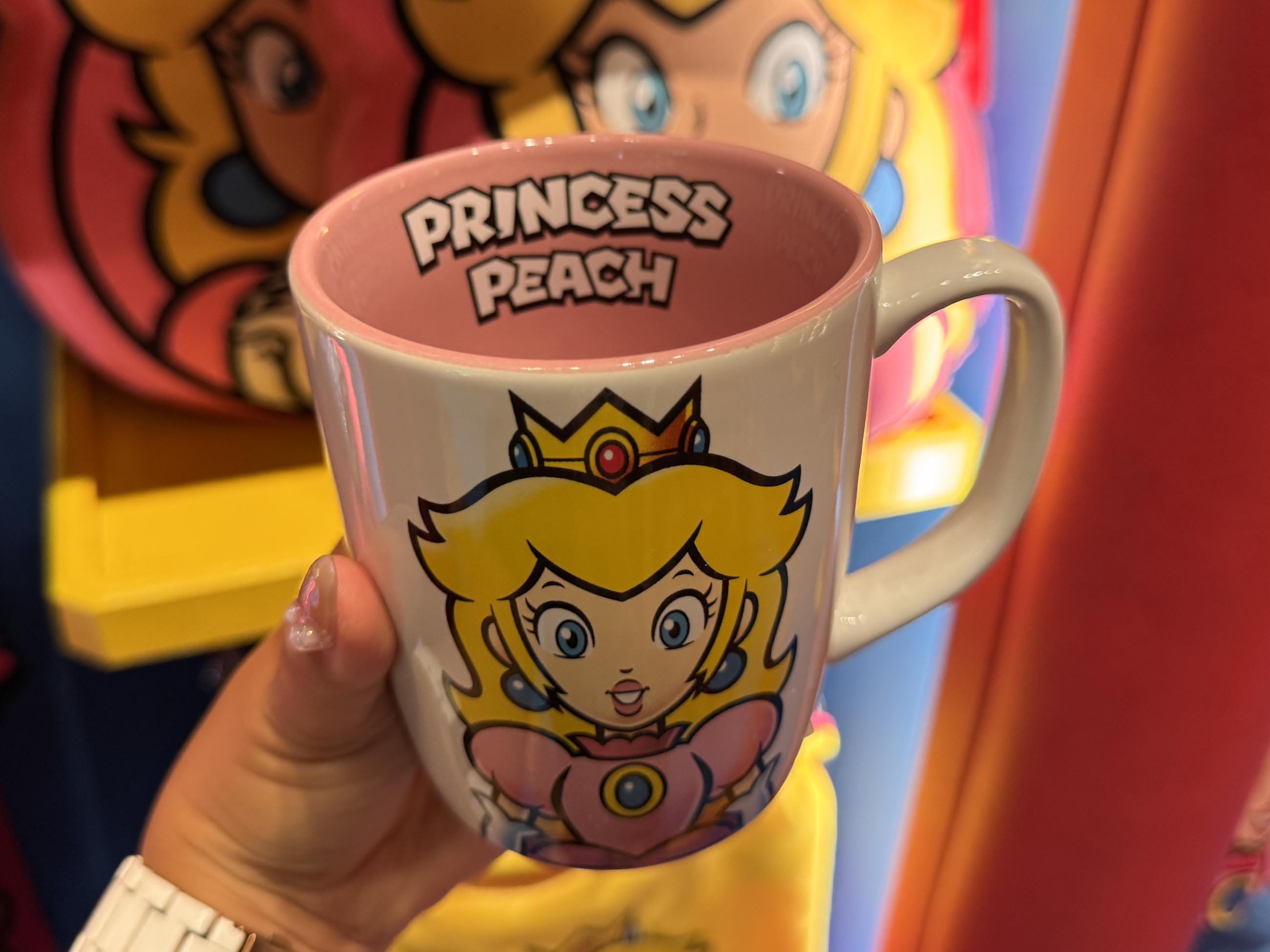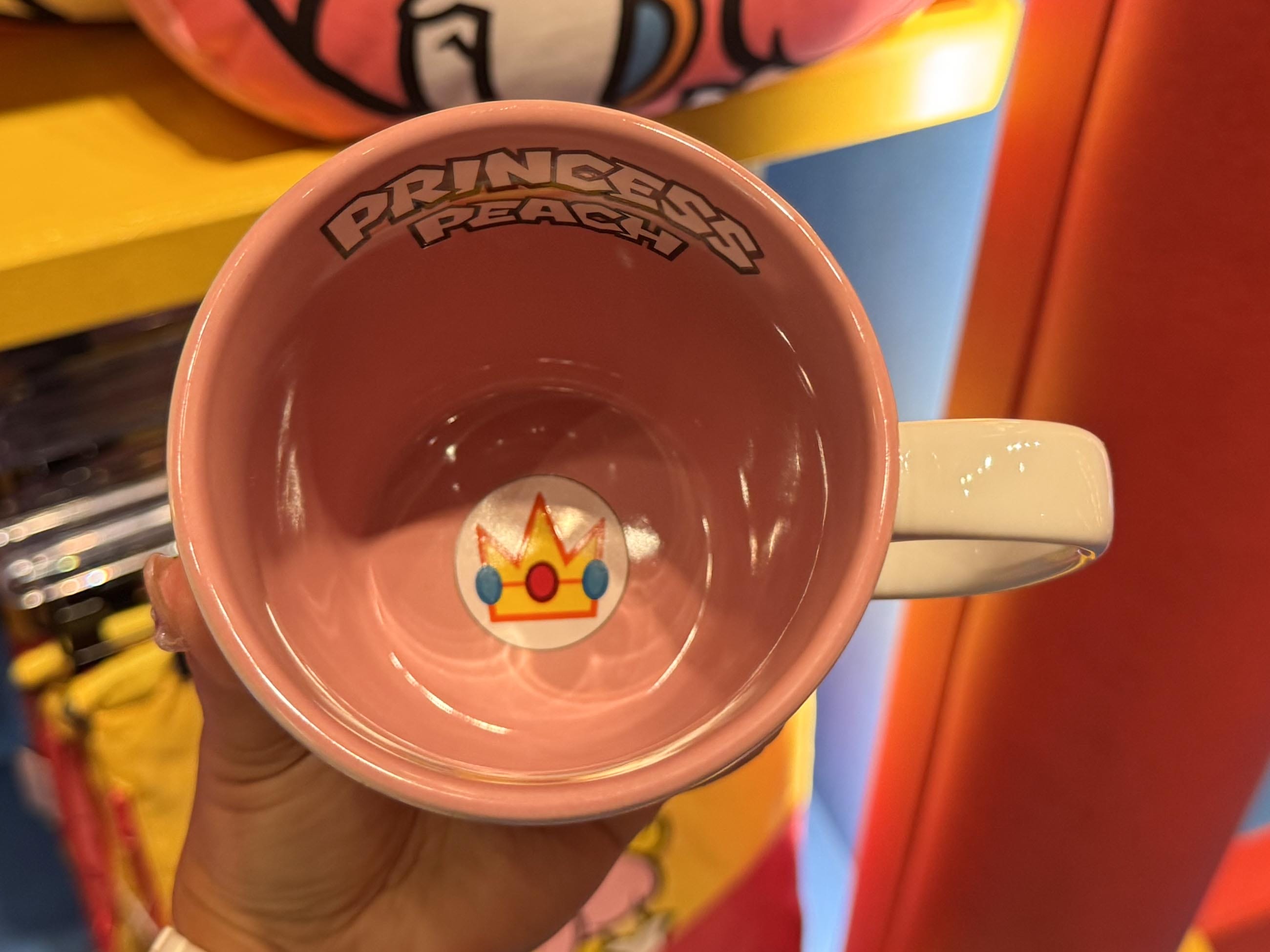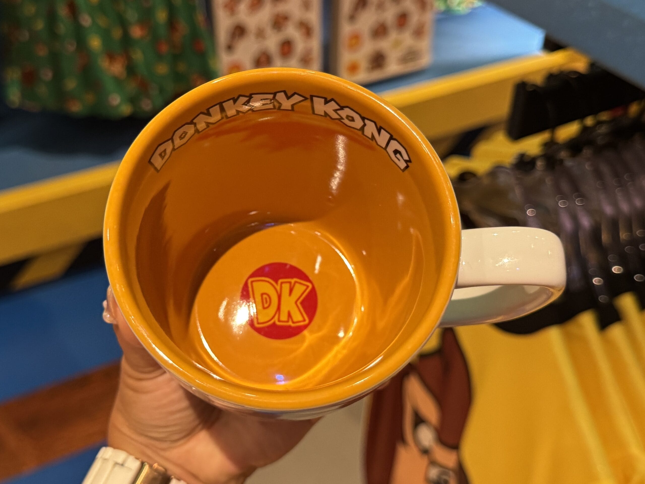 This mug is white. The Super Nintendo World is on both sides. The interior is red.