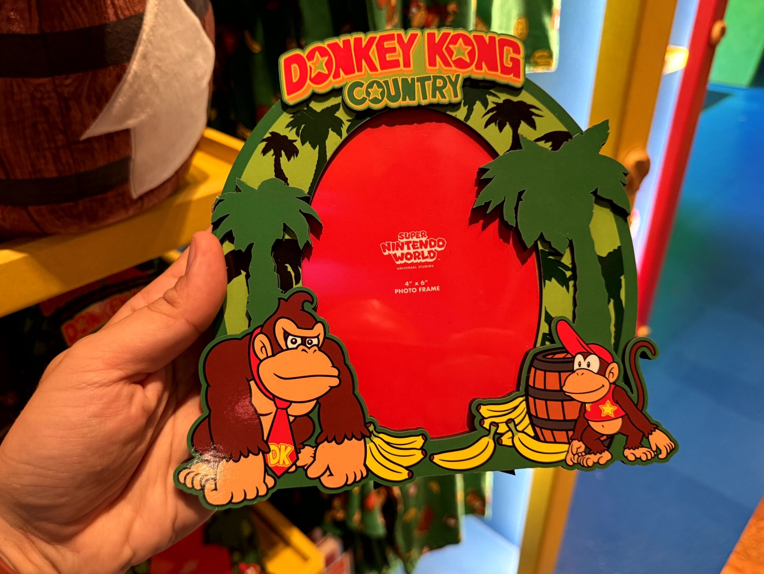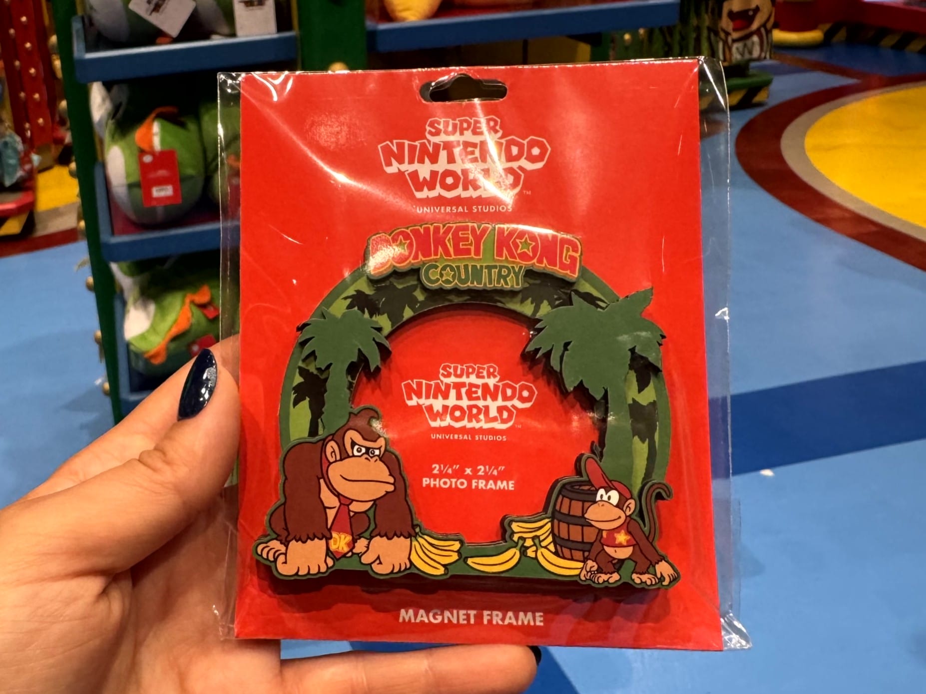 This is a circular magnetic frame featuring palm trees, Donkey Kong, Diddy Kong, a barrel, bananas, and the Donkey Kong Country sign. It holds a 2 1/4″ x 2 1/4″ photo.