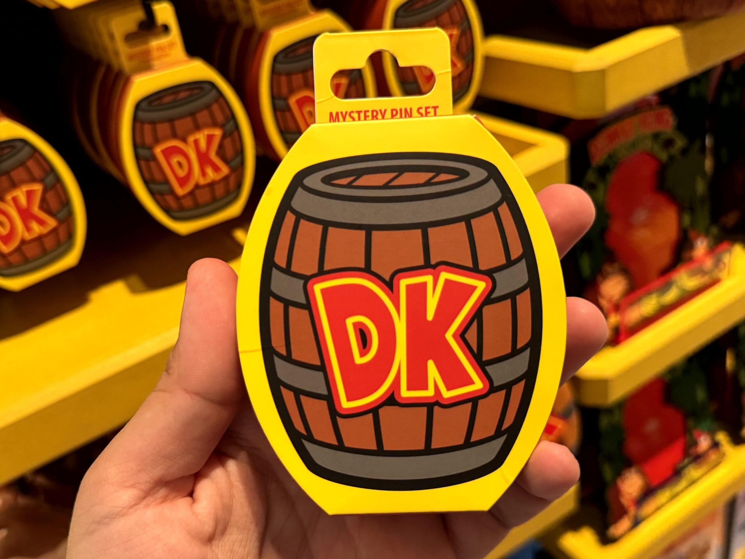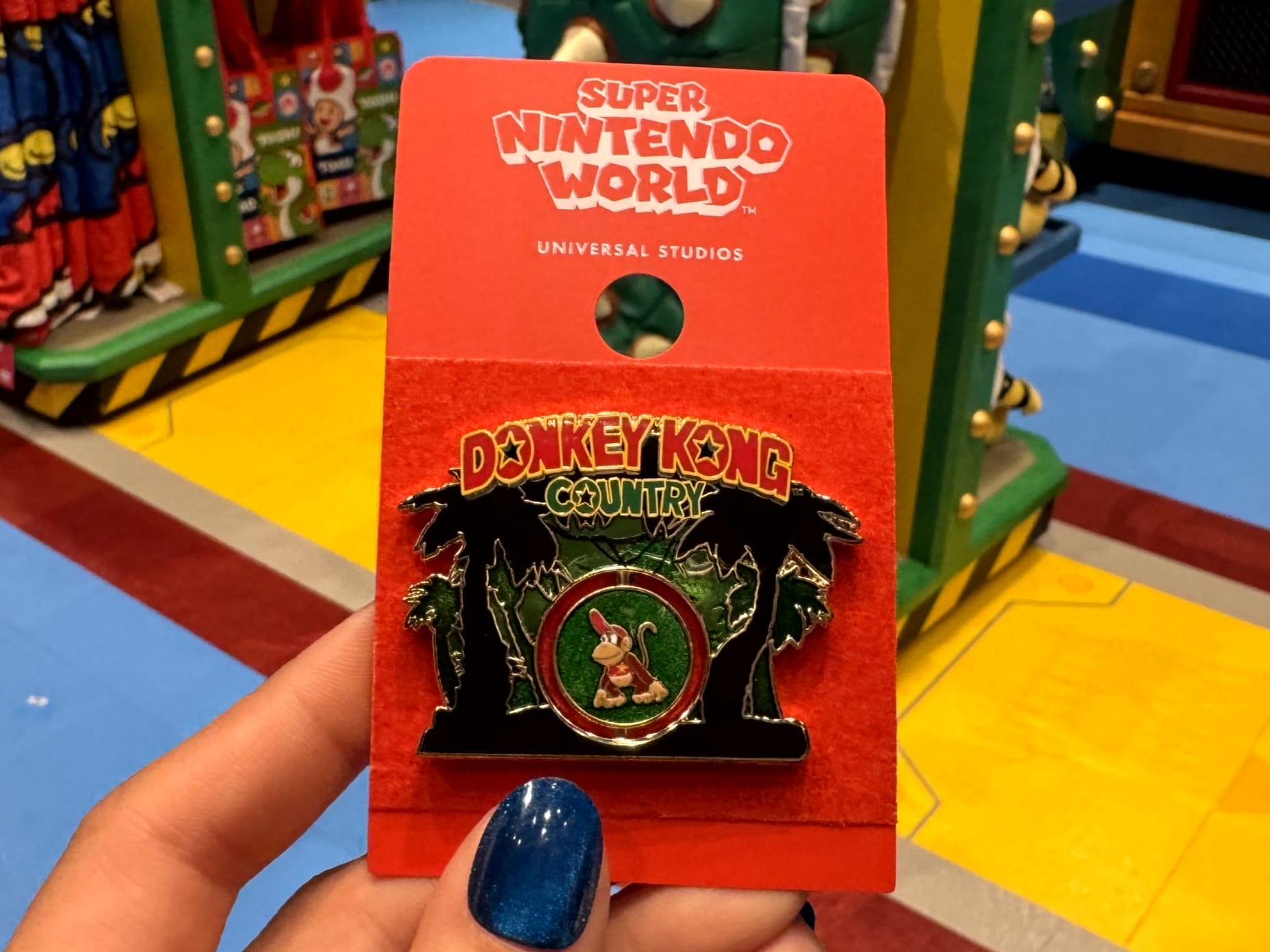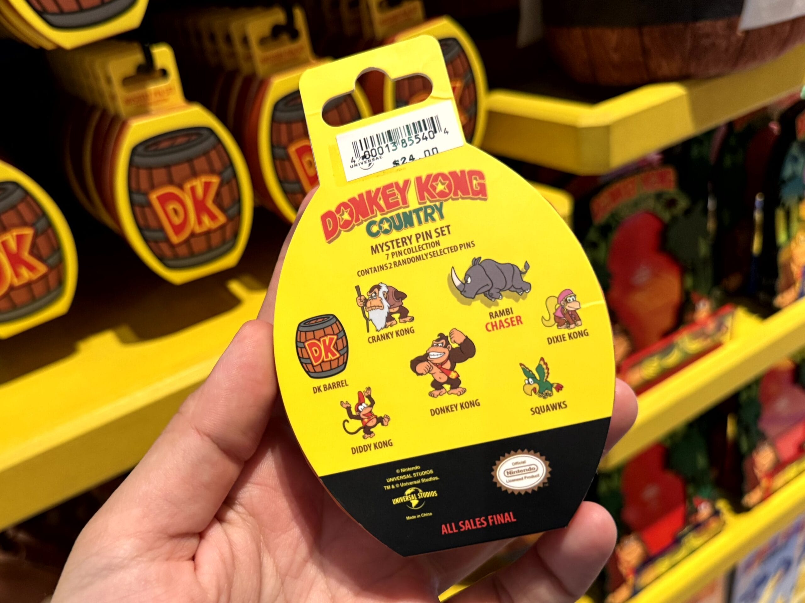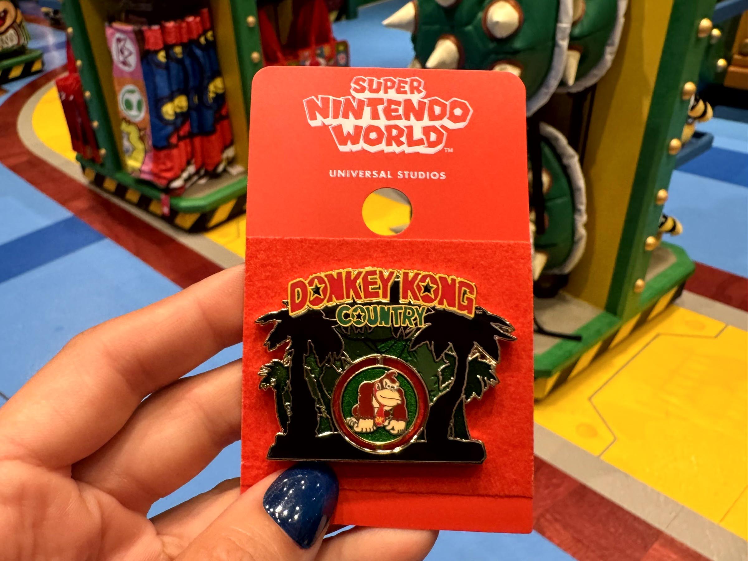 The Donkey Kong Country sign is a pin-on-pin against a palm tree background. In the center is a spinner with Donkey Kong on one side and Diddy Kong on the other side.