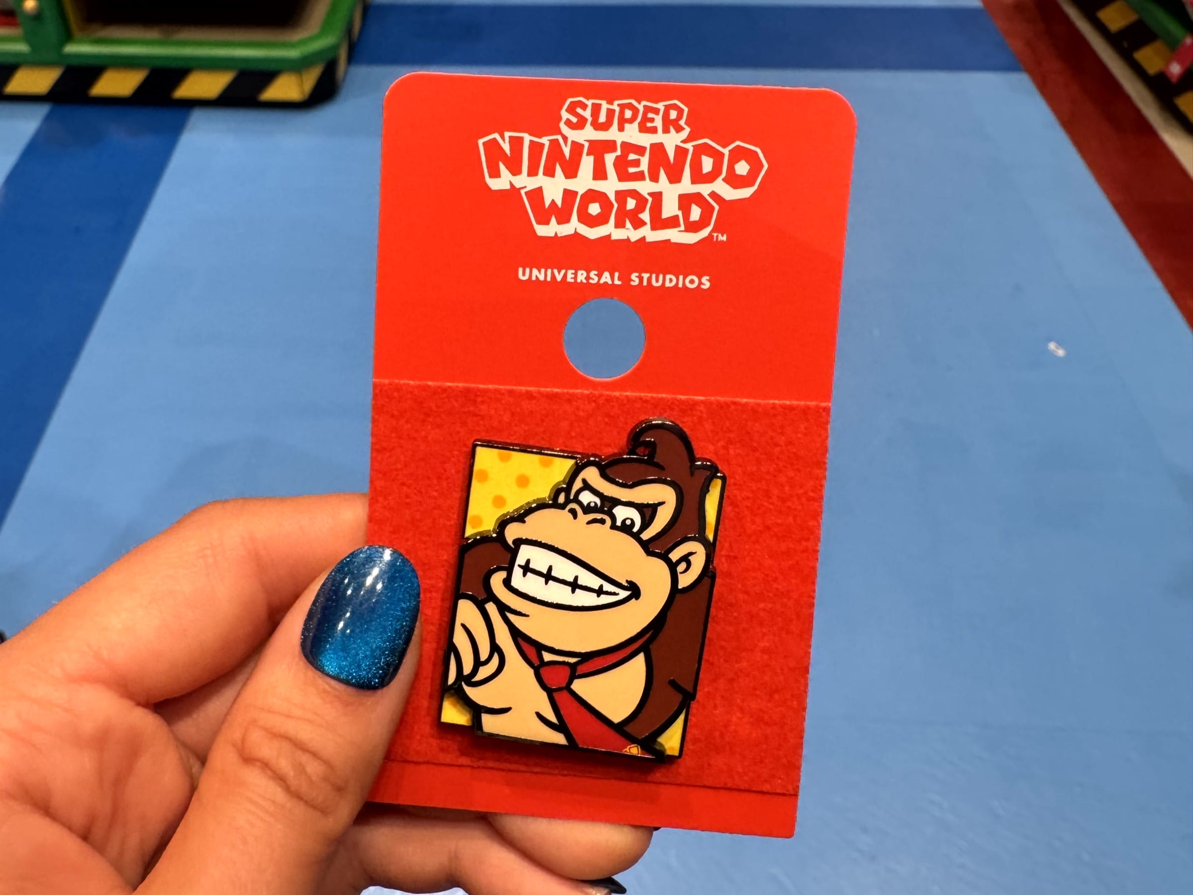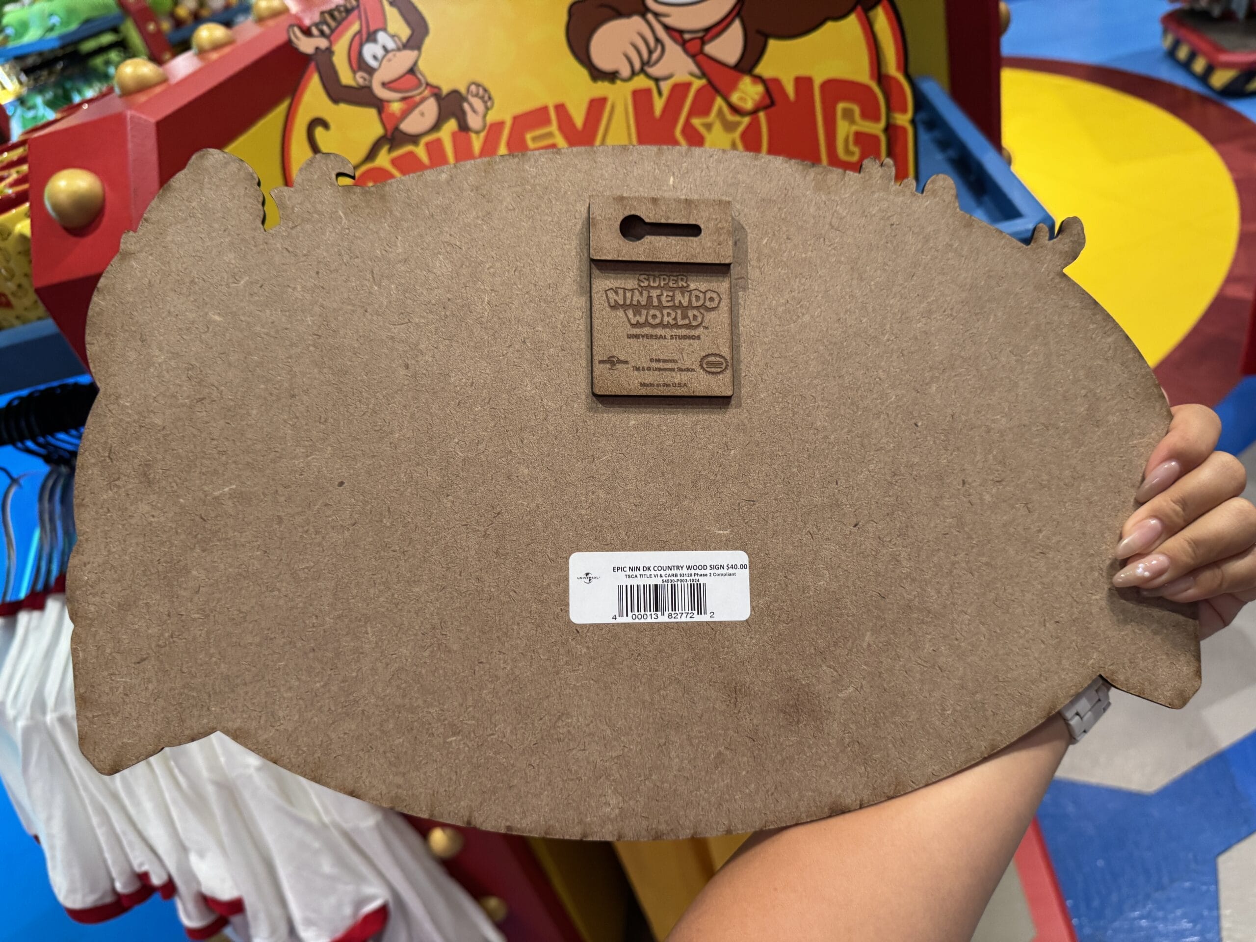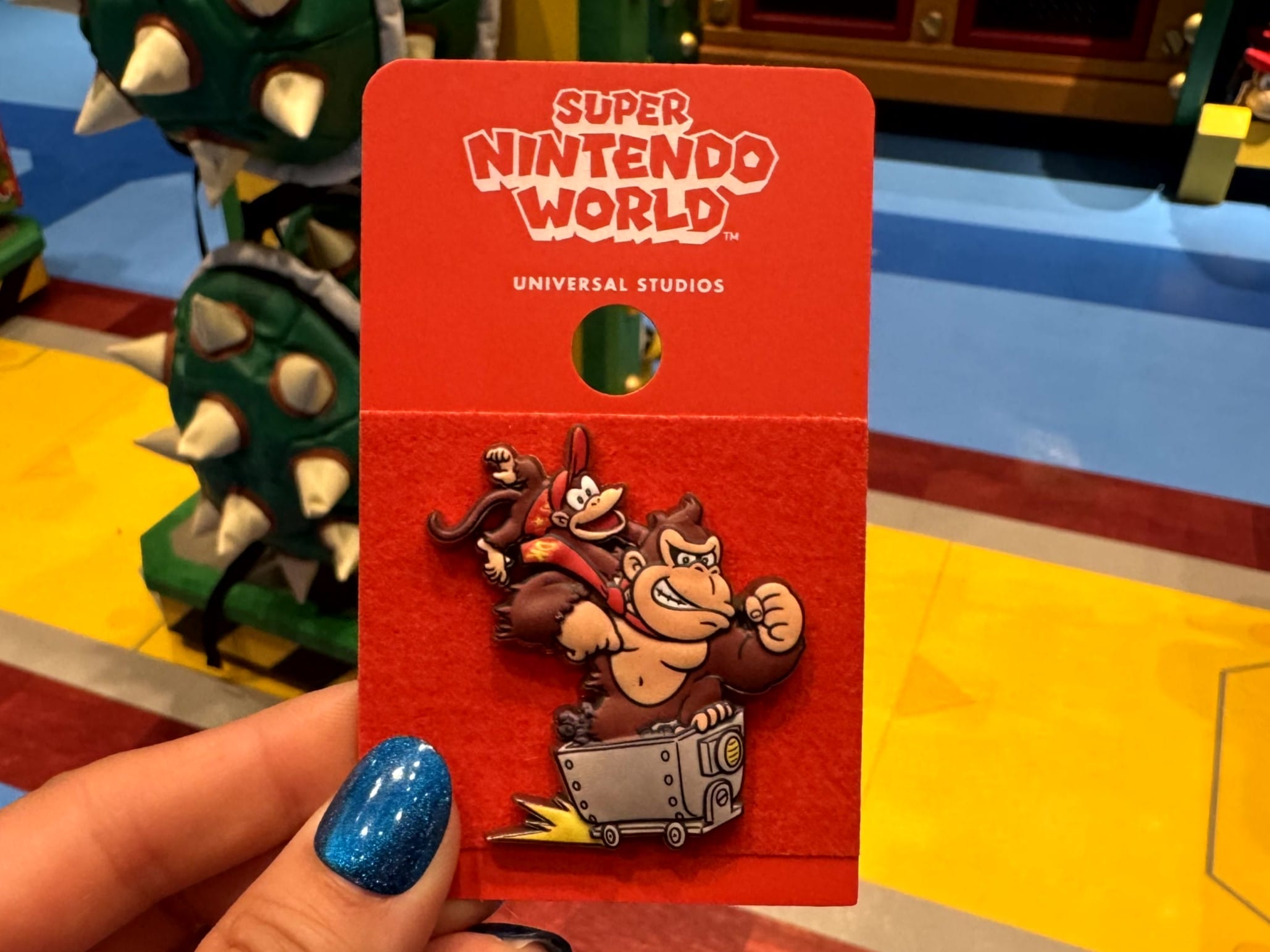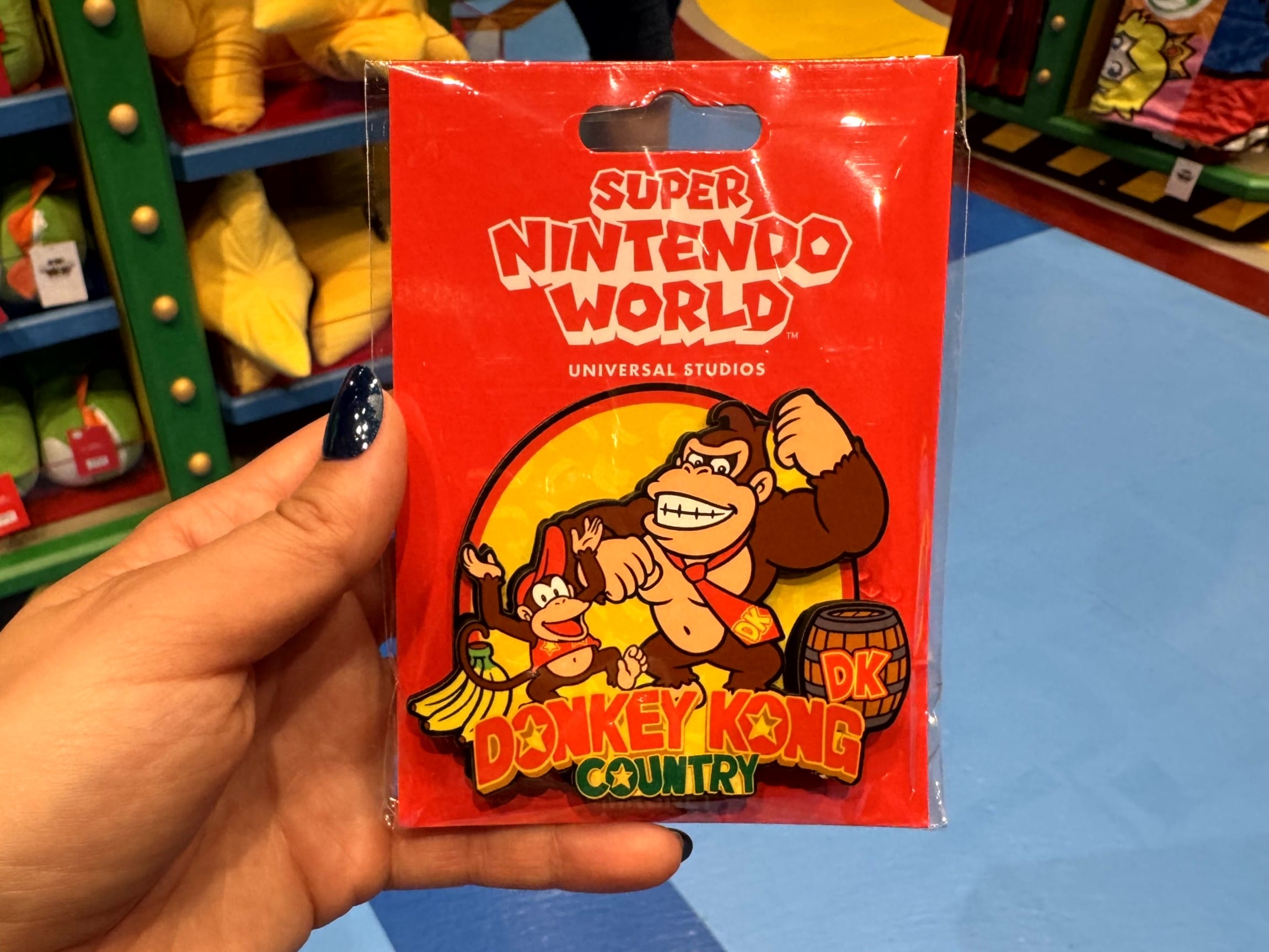 The Donkey Kong Country sign is a pin-on-pin against a palm tree background. In the center is a spinner with Donkey Kong on one side and Diddy Kong on the other side.