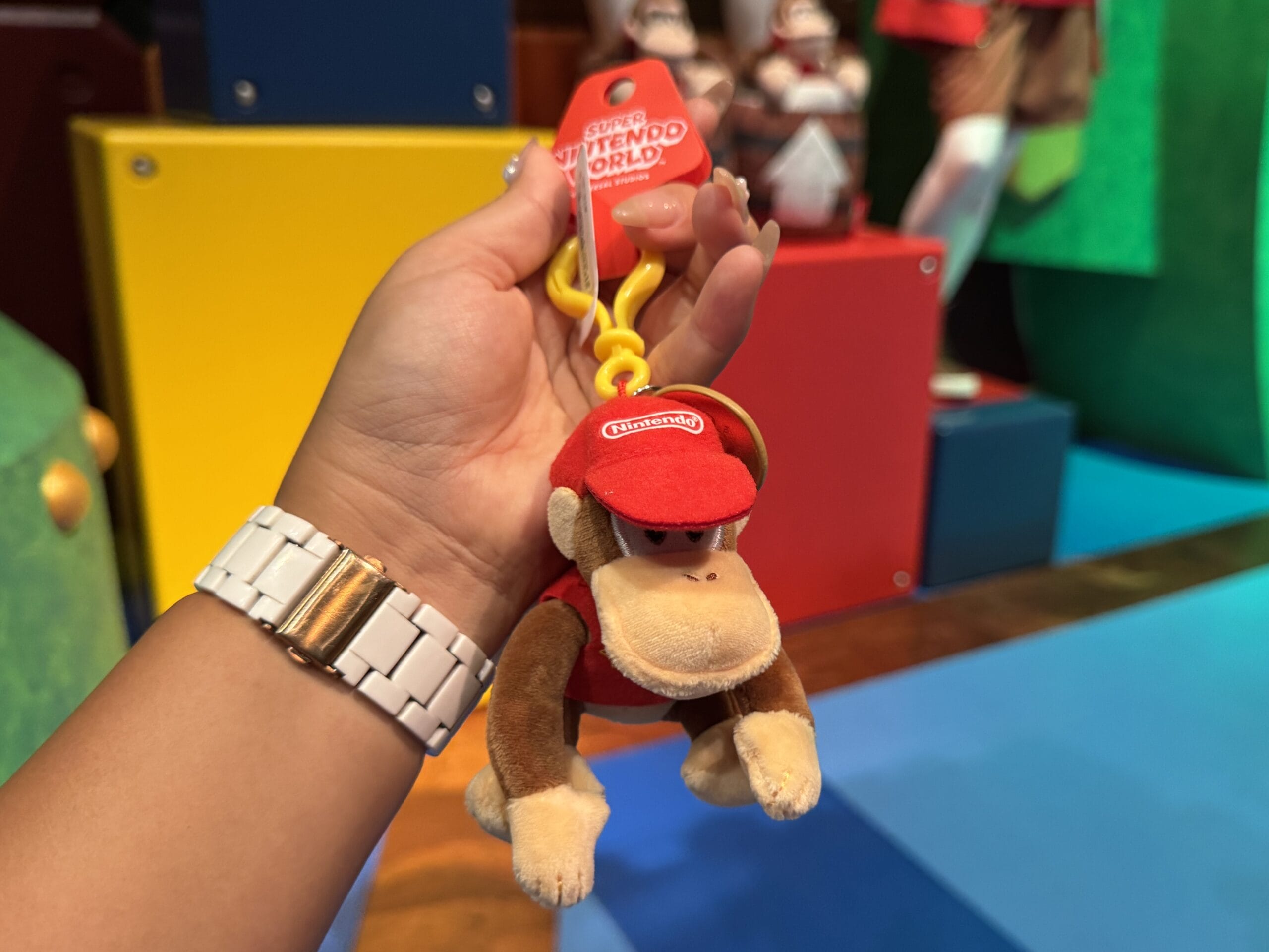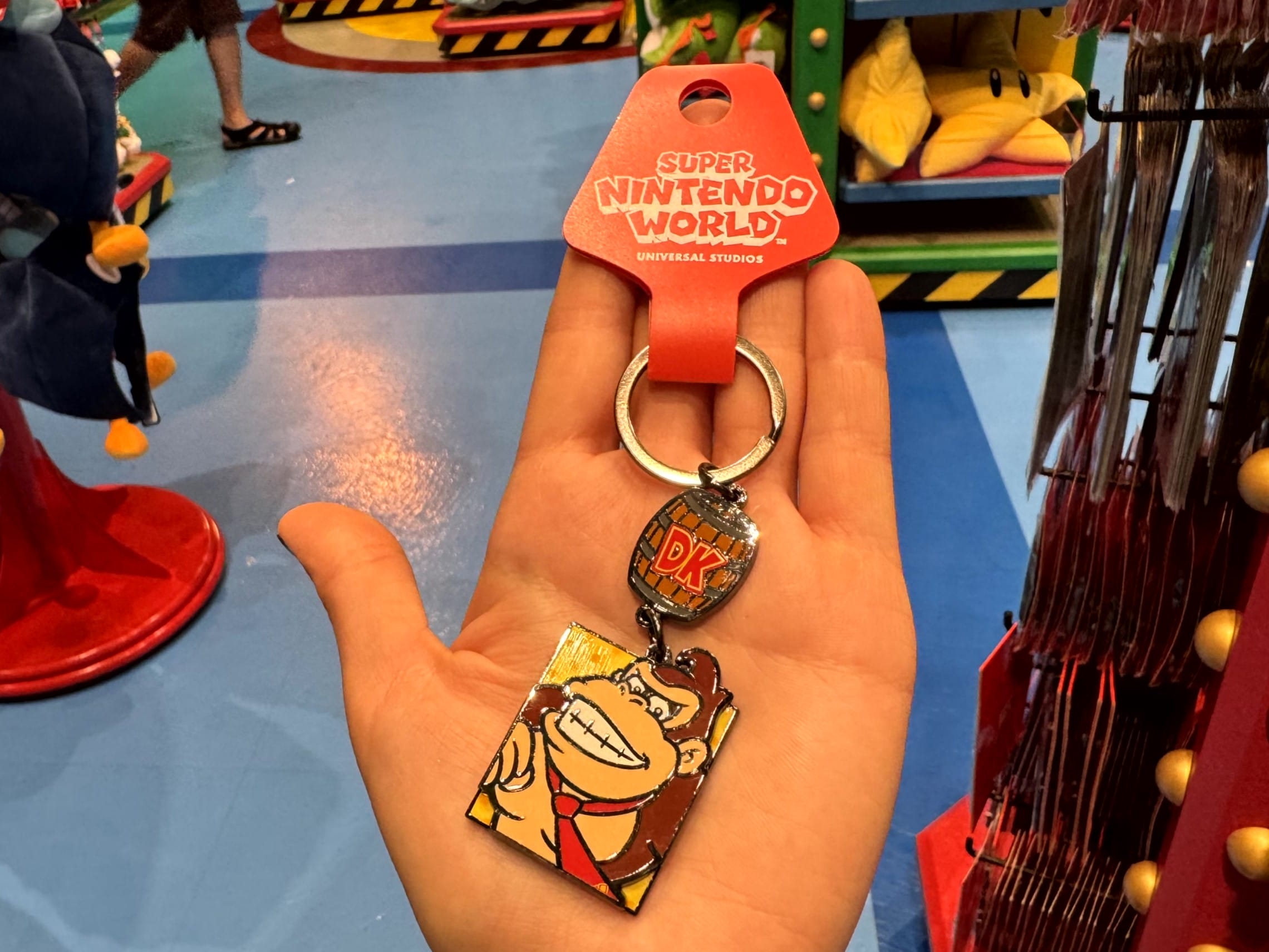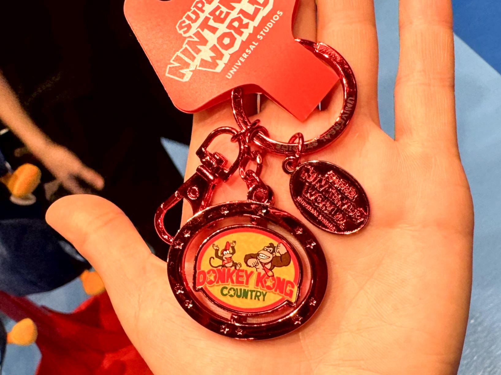 This keychain has a spinner charm in a metal frame with stars. Donkey Kong and Diddy Kong are pictured with the logo. The Super Nintendo World logo is on a separate charm.