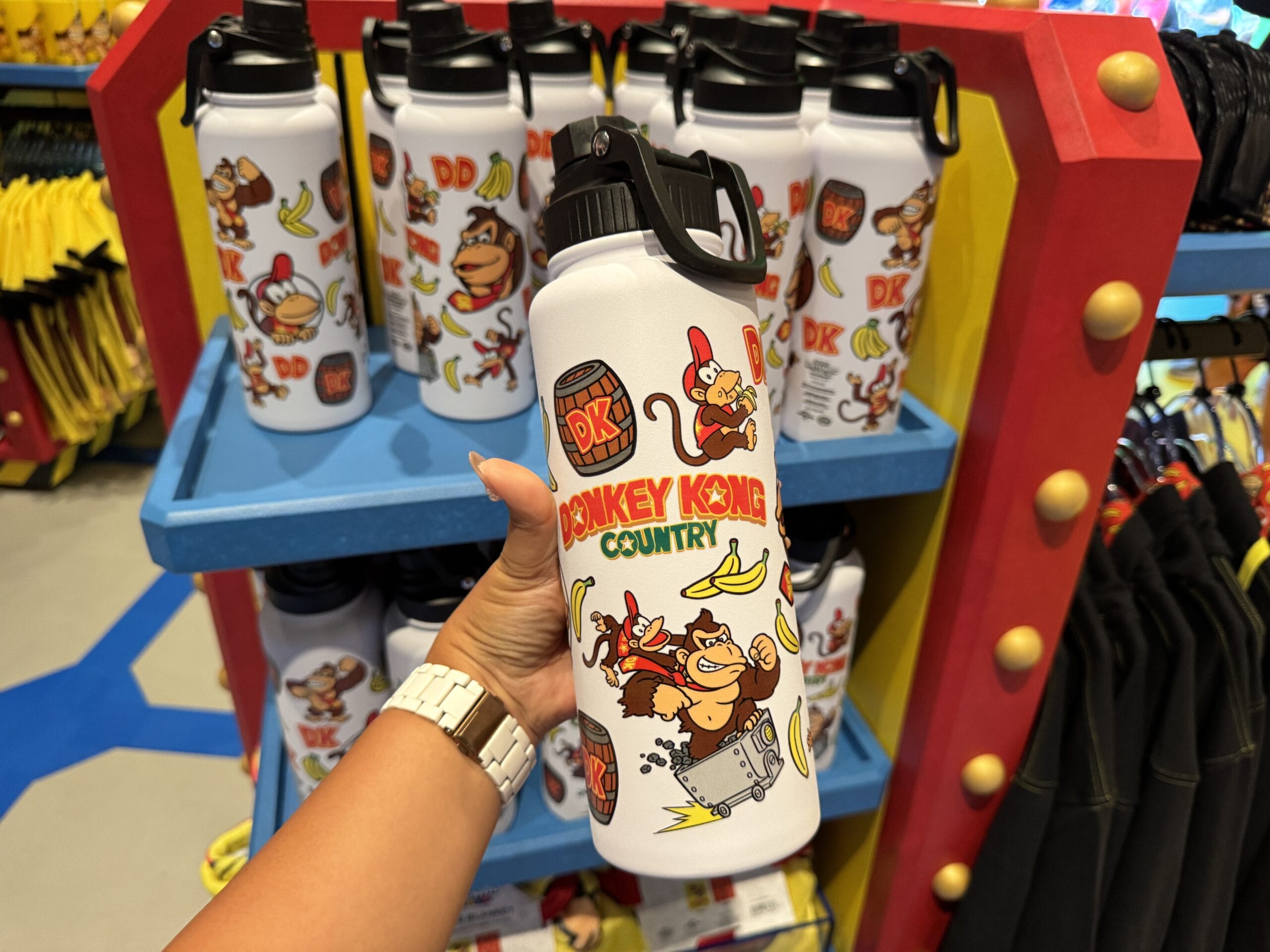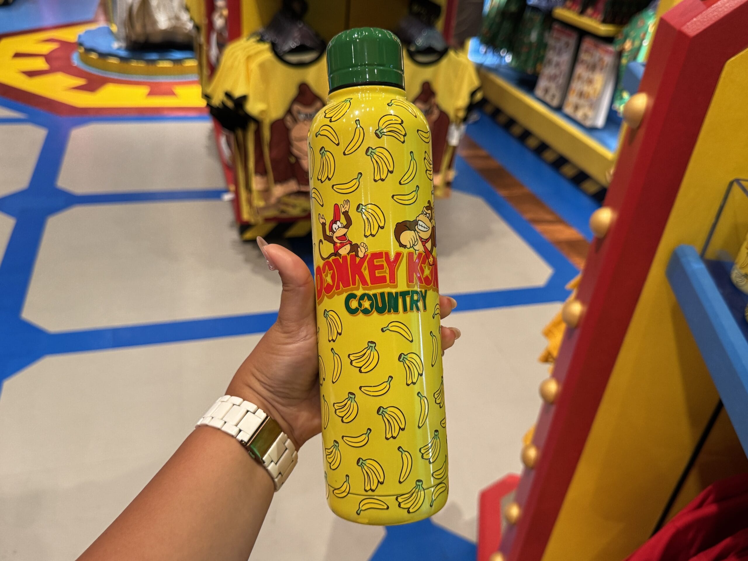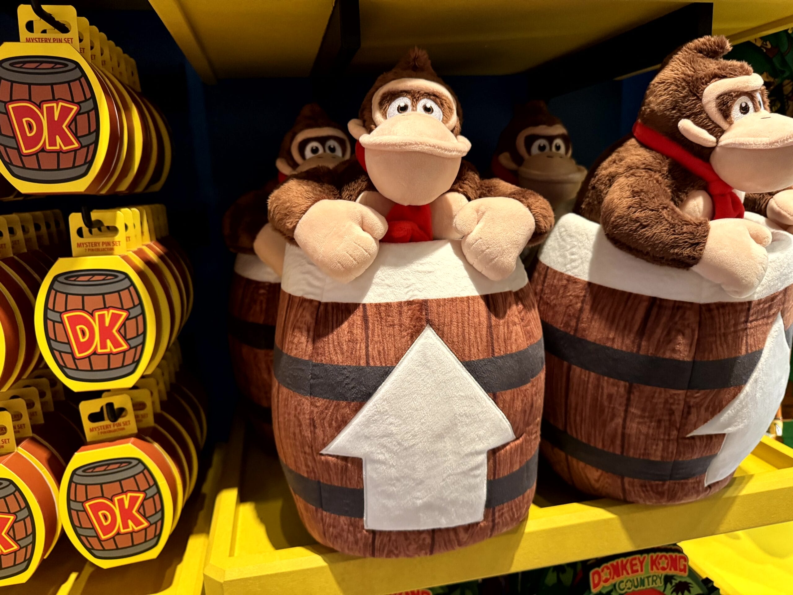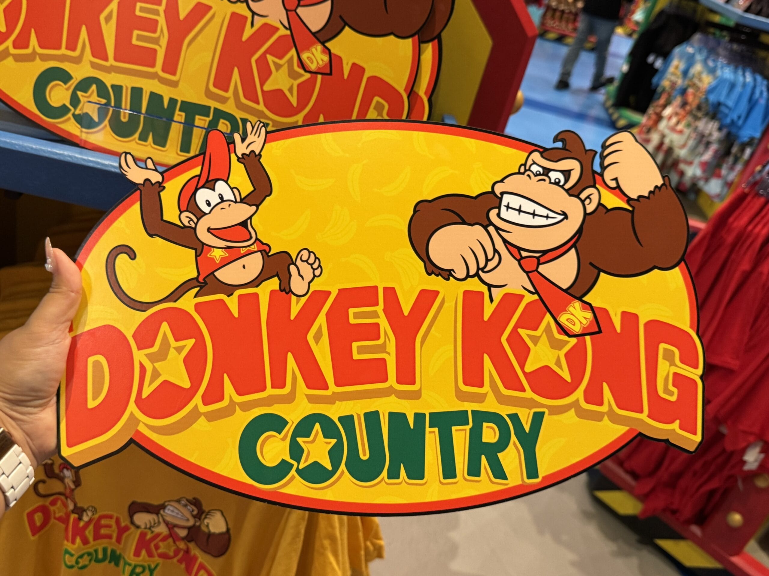 Donkey Kong and Diddy Kong are pictured against a yellow banana-patterned background. A bunch of bananas and a “DK” barrel are at the bottom with the land’s logo.