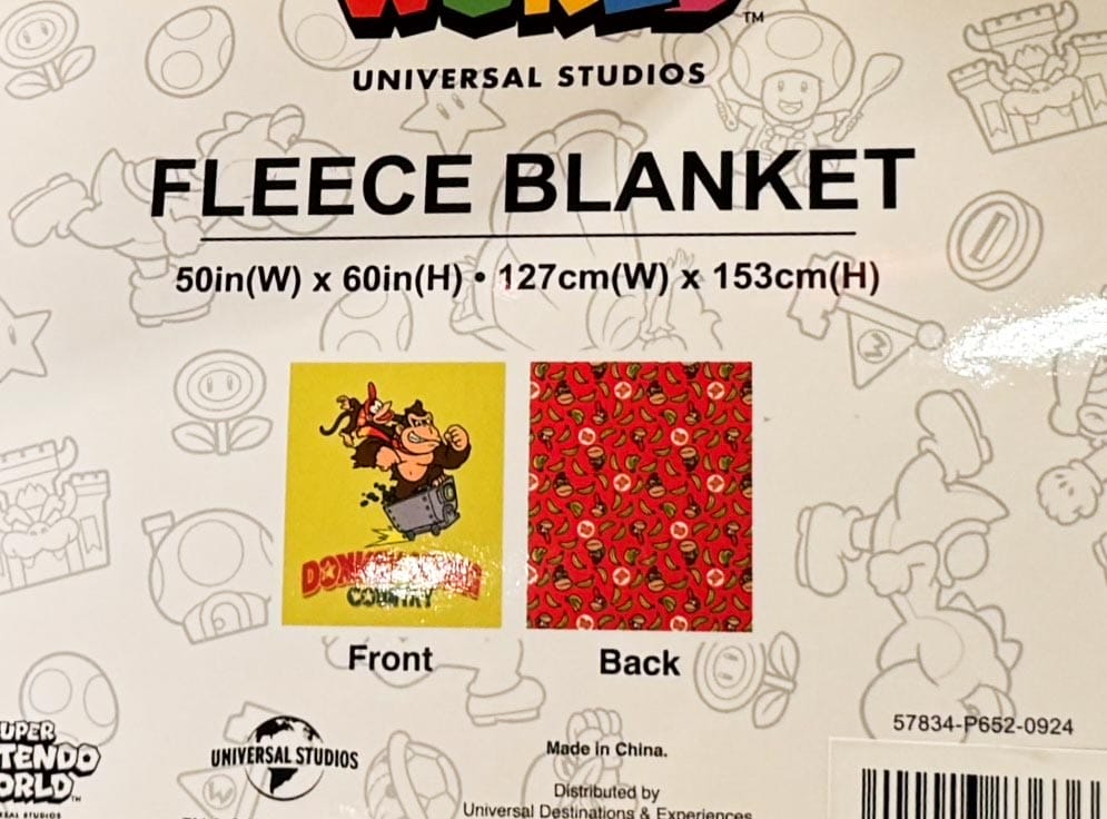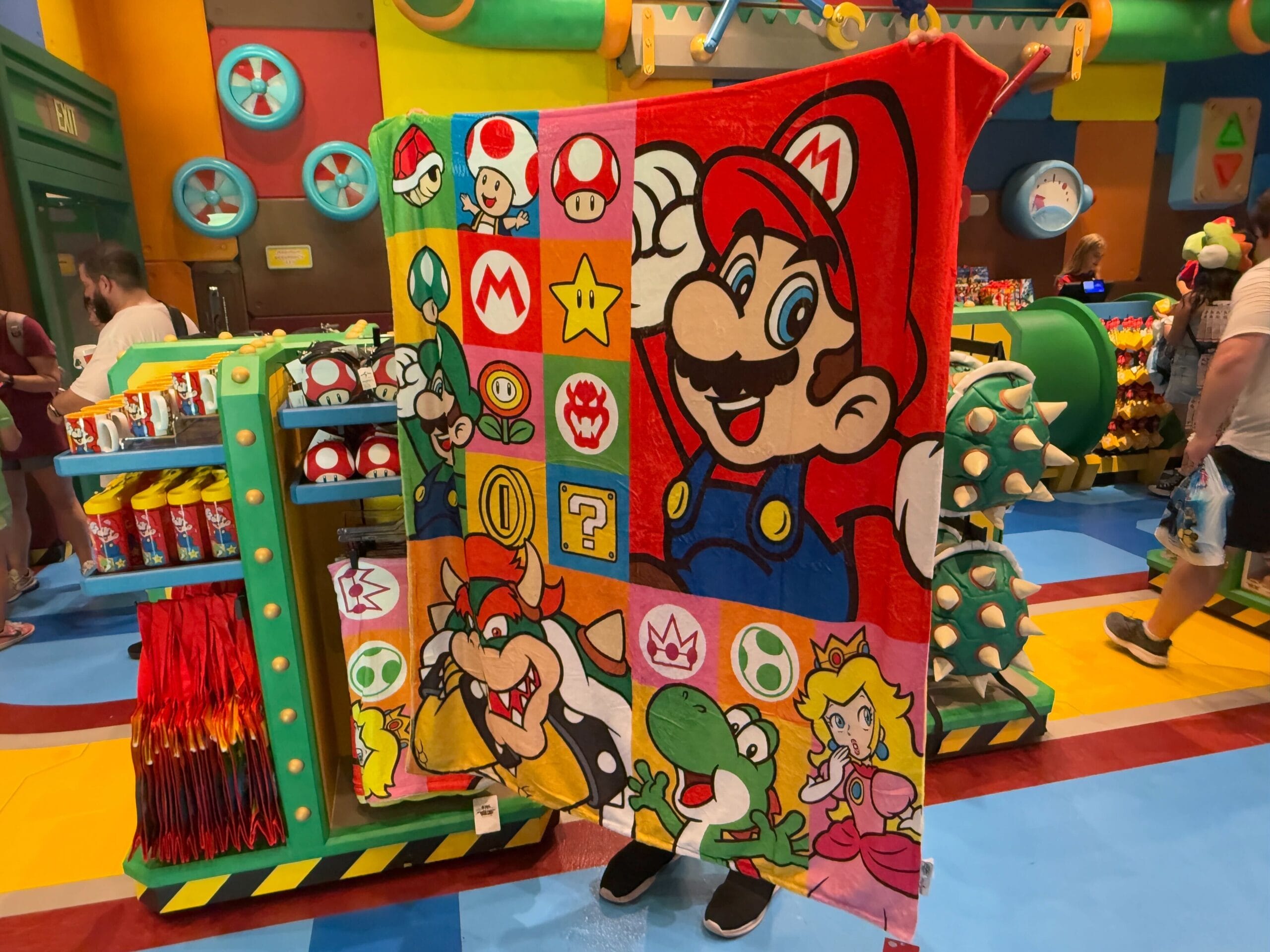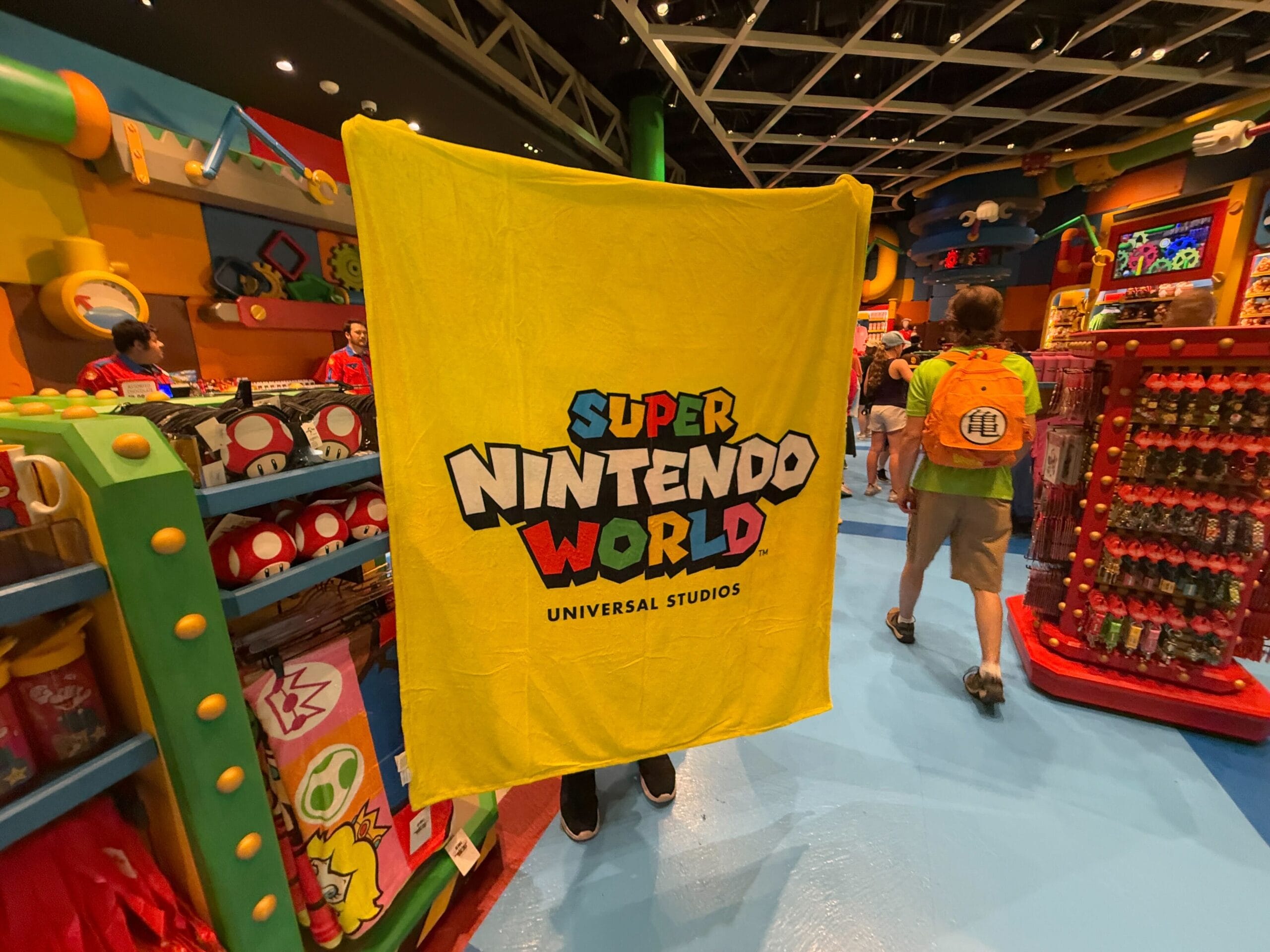 One side of this blanket has a color-blocked design with images of different Super Nintendo World characters and iconography. Mario is the largest image, against a red background. Also featured are Luigi, Bowser, Toad, and Princess Peach. The other side is yellow with the colorful Super Nintendo World logo.