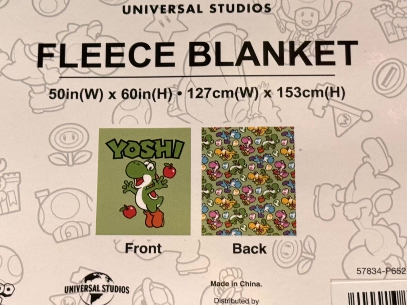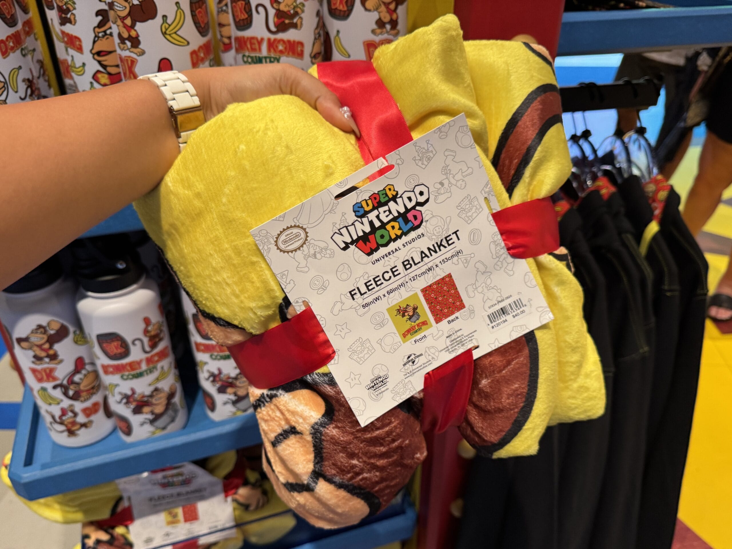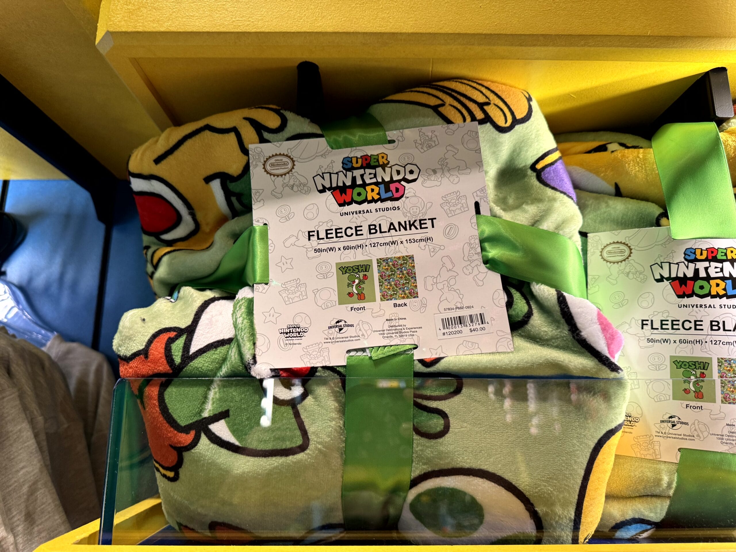 One side of this blanket has a color-blocked design with images of different Super Nintendo World characters and iconography. Mario is the largest image, against a red background. Also featured are Luigi, Bowser, Toad, and Princess Peach. The other side is yellow with the colorful Super Nintendo World logo.